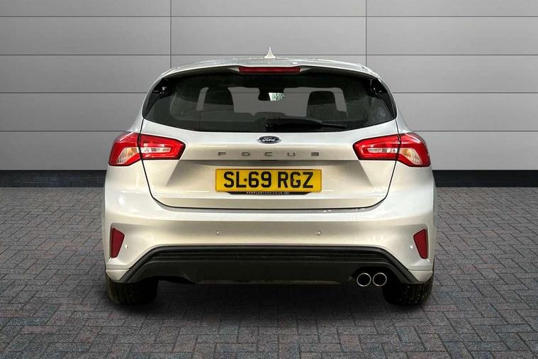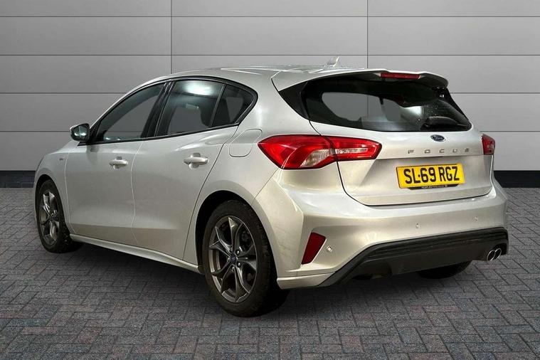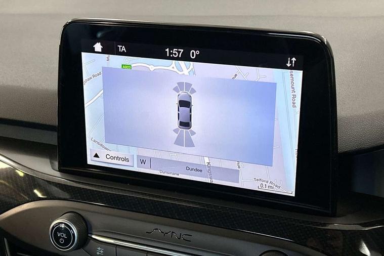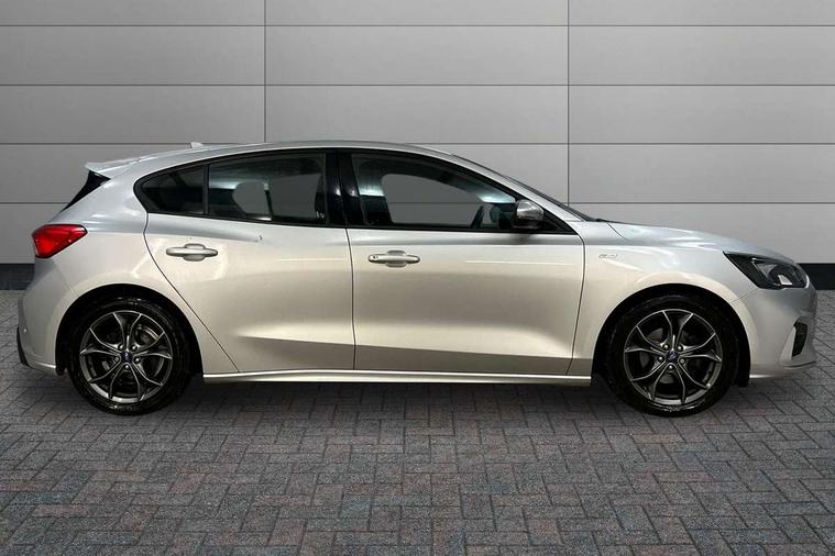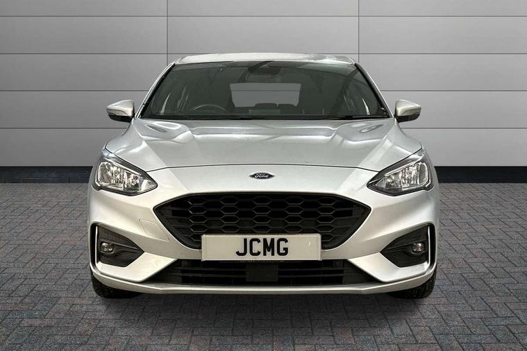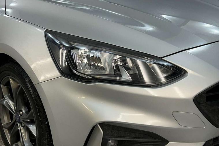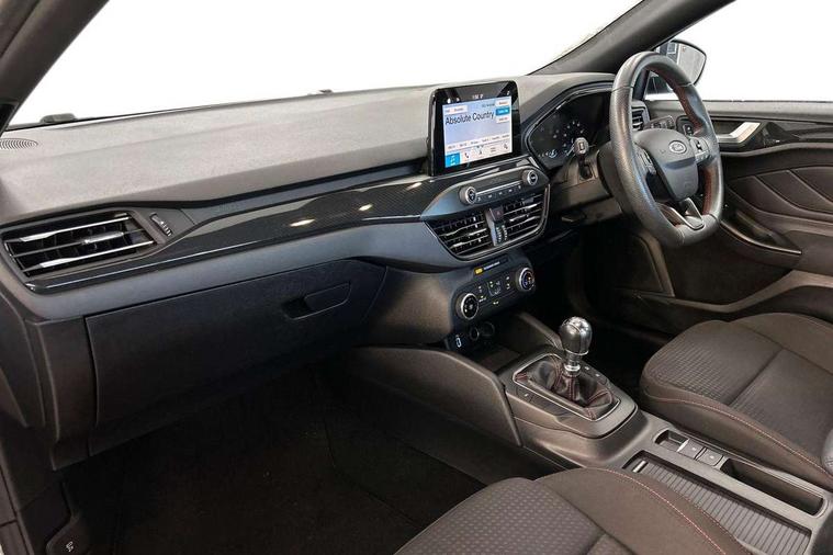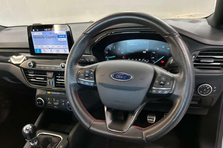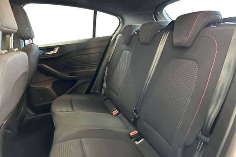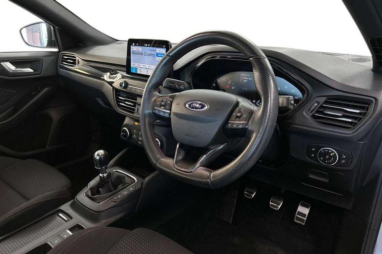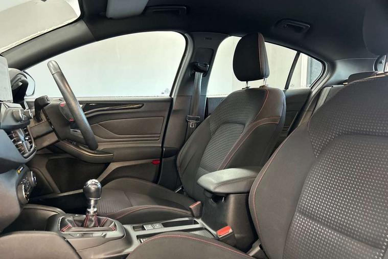 Bluetooth system, Digital clock, Easy fuel capless refuelling system, Eco mode, Ford pass connect, Ford SYNC 3 with 8" TFT touchscreen, and app link Android auto/Apple carplay, Intelligent speed assist, Lane keeping aid with lane departure warning, PAS, Selectable drive mode, Trip computer, Sports tuned suspension, 6 speakers, Aux input, 'Quickclear' heated windscreen/heated washer jets, Auto headlamps (on/off), Body colour large rear spoiler, Body colour side skirt, Body coloured bumpers, Body coloured door handles, Body coloured electrically operated and heated door mirrors with side indicators, Electrically operated front and rear windows with one touch opening and closing, Front variable intermittent wipers with electric wash, Halogen reflector headlamps, Heated rear window, LED daytime running lamp, LED front fog lamps with cornering function, Polished twin tailpipe, ST-Line upper and lower grille with full body styling kit and wing badges, Tailgate wash/wipe, 3 spoke flat bottomed leather steering wheel with red stitching, 60/40 split back and cushion rear seats with 2 height adjustable headrests, Alloy finish pedals, Aluminium gear knob, Centre console with armrest, Cloth upholstery with red stitching, Dark headliner, Driver's lumbar support, Front floor mats, Height adjustable front headrests, Isofix child seat preparation, Manual air conditioning, Reach + rake adjustable steering column, Rear centre headrest, ABS+Electronic Brake force Distribution, Auto hold function, Driver airbag, Electronic parking brake, Electronic stability control, Front and rear seatbelt reminder, Front inertia reel height adjustable seatbelts with pre-tensioners, Front passenger airbag, Front side airbags, Hill start assist, Passenger airbag deactivate switch, Post collision braking, Pre collision assist with autonomous emergency braking and pedestrian/cyclist detection, Side curtain airbags, Three rear inertia reel lap/diagonal seatbelts, Tyre pressure monitoring system, Keyless start with 'Ford Power' starter button, MyKey system, Remote central locking & engine immobiliser, Thatcham category 1 alarm, Contrast stitching - Red, 17" 5x2 spoke alloy wheels with rock metallic finish, Mini steel spare wheel,