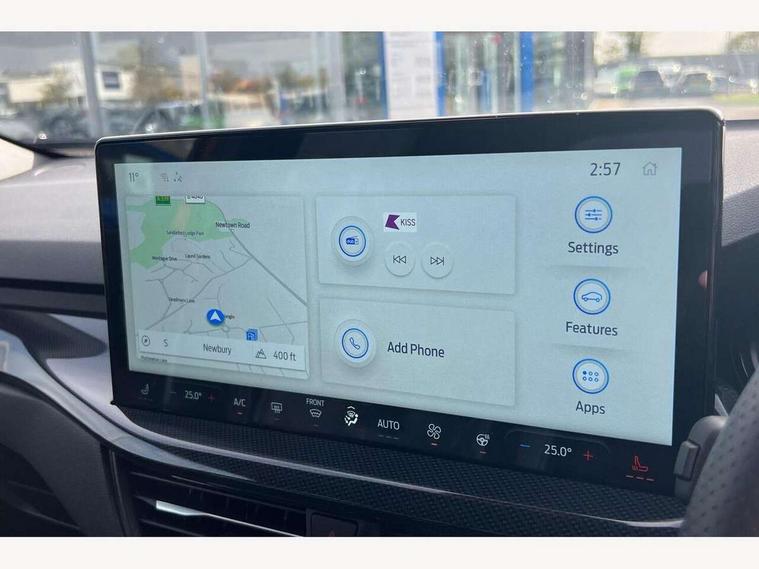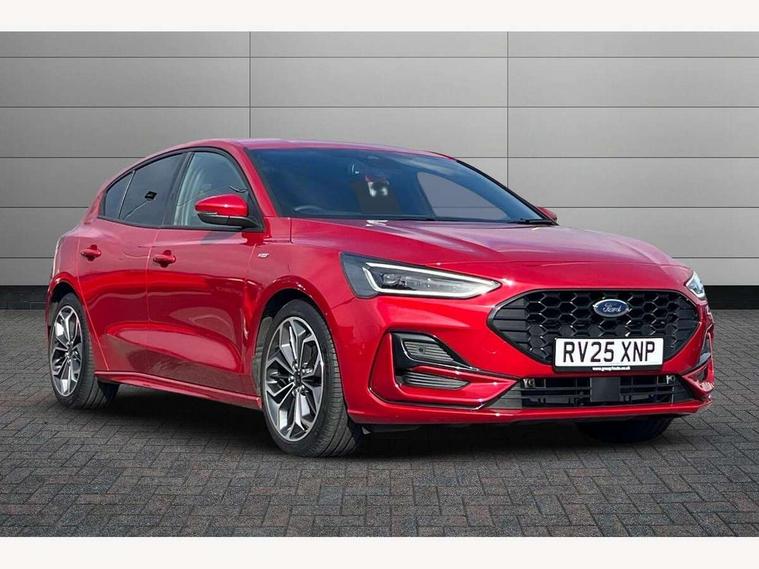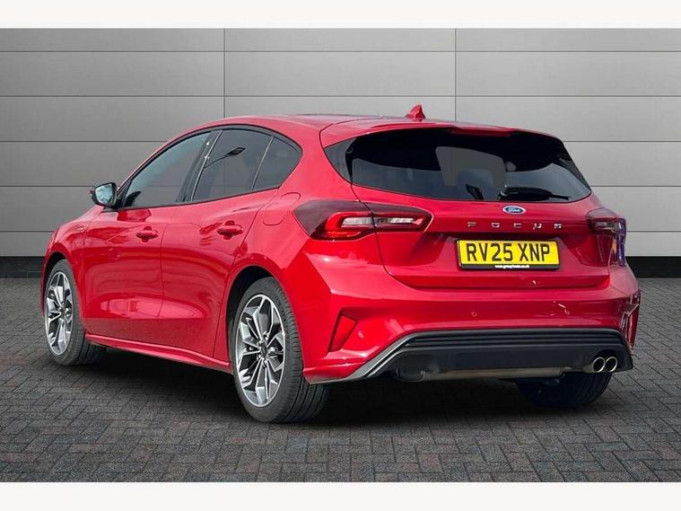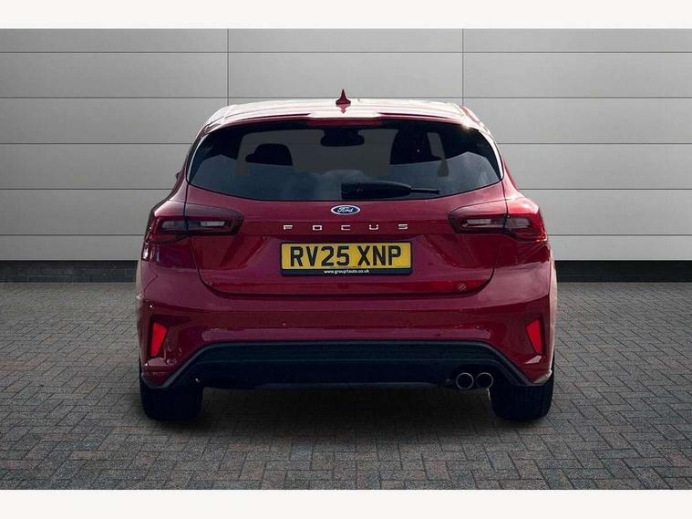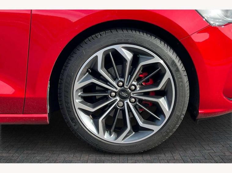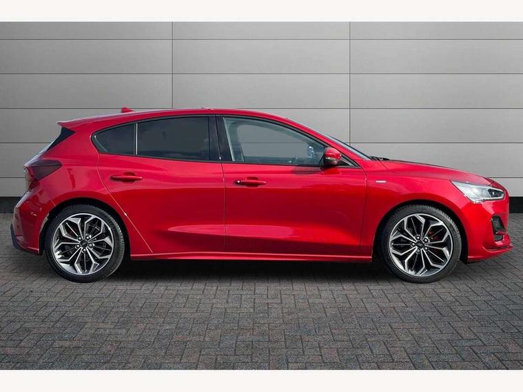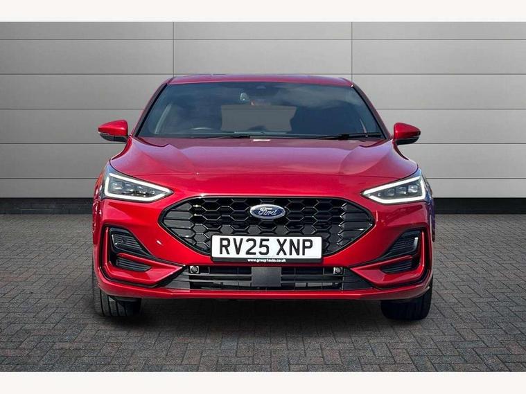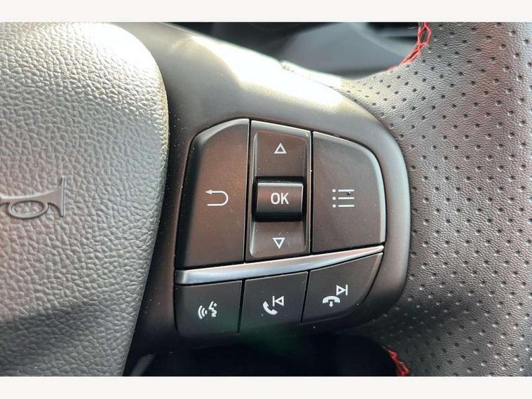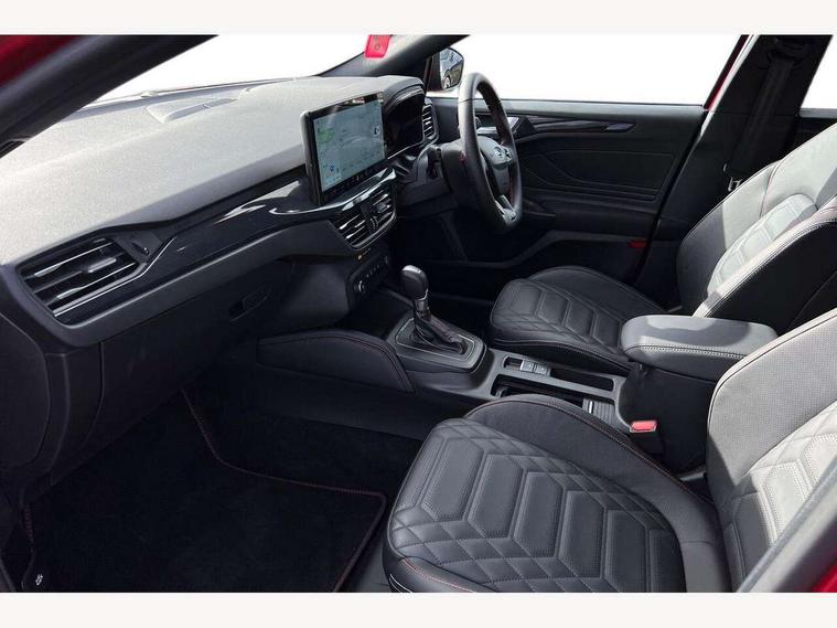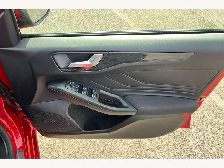 12.3" Digital instrument cluster, Bluetooth system, Digital clock, Easy fuel capless refuelling system, Eco mode, Ford SYNC4 Nav with 13.2'' touchscreen, DAB, Emergency Assistance, Apple Carplay & Android Auto, B&O Premium Audio with 10 speakers, FordPass Connect, Lane keeping system - lane keeping alert and lane keeping aid, PAS, Rev counter, Selectable drive mode, Service interval indicator, Trip computer, Wireless charging pad, Sports tuned suspension, 2 USB ports, Auto headlamps (on/off), Body coloured door handles, Electrically operated front and rear windows with one touch opening and closing, Electrically operated heated power fold door mirrors with puddle lamp with side indicators, Front variable intermittent wipers with electric wash, Heated rear window, LED daytime running lamp, LED rear lamps, LED third brake light, Polished twin tailpipe, Privacy glass, Quickclear heated windscreen, Rain sensor, Rear side wing doors, Tailgate wash/wipe, Unique ST-Line grille, full bodystyling kit, and large body coloured rear roof spoiler, 3 rear headrests, 3 seat bench in 2nd row, Dual zone electronic air temperature control, Full sensico premium upholstery, Height adjustable front headrests, Isofix child seat preparation, Load through ski hatch, Manual 2-way passenger seat adjust, Power 4-way driver seat adjust, with power lumbar adjust, Reach + rake adjustable steering column, Single front passenger seat, ST-Line Design pack - Focus, Winter pack - Focus, 3x3 point rear seatbelts, ABS+Electronic Brake force Distribution, Auto hold function, Driver airbag, EDL traction control, Electronic parking brake, Electronic stability control, Front and rear seatbelt reminder, Front inertia reel height adjustable seatbelts with pre-tensioners, Front passenger airbag, Front side airbags, Passenger airbag deactivate switch, Post collision braking, Pre collision assist with autonomous emergency braking and pedestrian/cyclist detection, Remote/power child rear door locks, Side curtain airbags, Three rear inertia reel lap/diagonal seatbelts, Tyre pressure monitoring system, Keyless entry and keyless start, MyKey system, Remote central locking & engine immobiliser, Thatcham alarm with power door dead locks, 18" 5x3 spoke pearl grey high gloss machined finish alloy wheels with mini spare wheel,