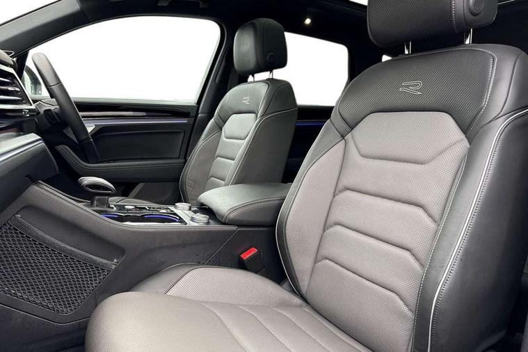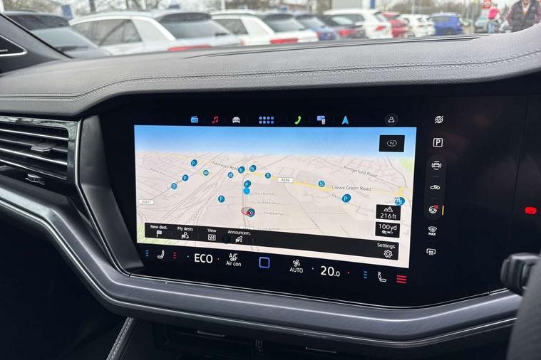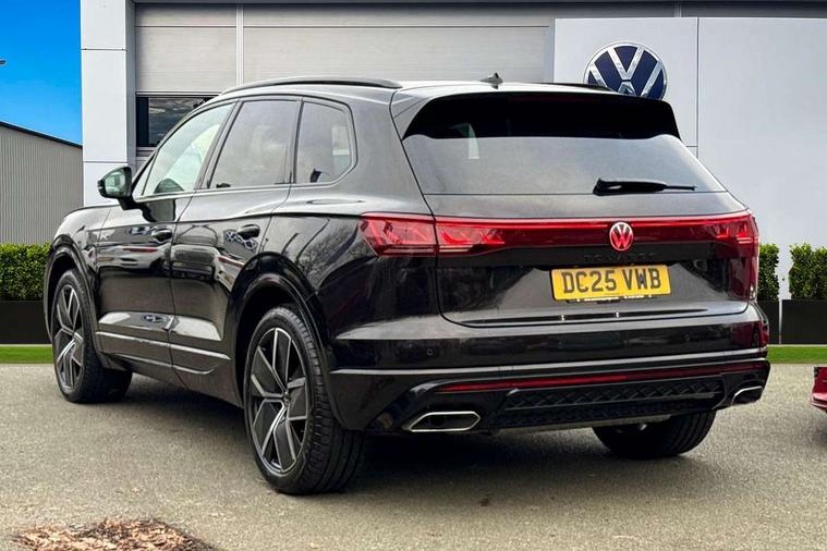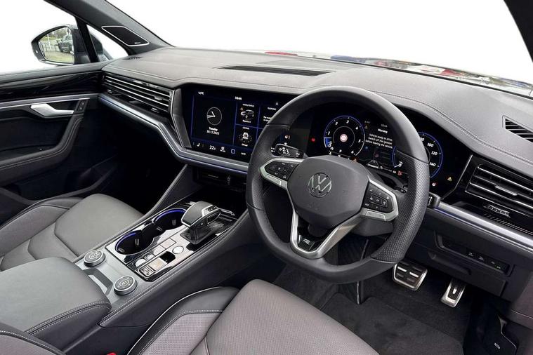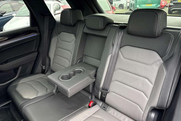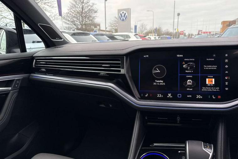 15" Screen Top infotainment system Premium (MIB3), Adaptive cruise control, Driver profile selection, Dynamic road sign display, E-Sim card for online connectivity, eCall emergency system, Innovision cockpit, Intelligent park assist, Mobile phone interface with inductive charging, Multi-colour Active Info display, Park Assist - Sensor controlled steering aid to assist parallel or bay parking, PAS, Warning signal and warning light for front and rear seatbelts not fastened, Wireless app connect, Adaptive chassis control, Air suspension, DAB Digital radio, Diversity antenna for AM/ FM reception, We Connect and We Connect Plus functionality, Automatic coming/leaving home lighting function, Automatic headlights, Black door mirrors, Black style comfort bumpers, Dynamic headlight range control with dynamic cornering light, Electric front tilt/slide panoramic sunroof and fixed rear sunroof, Electrically power adjustable, heated, folding, auto dimming, front passenger exterior door mirror lowering function, External USB type C socket and charging sockets, Gloss black roof rails, HD LED Matrix beam plus digital headlight projection with variable light distribution, Headlight washers, Heat insulating glass in side and rear windows, Heated windscreen washer jets, Highway light, LED 3rd brake light, LED daytime running lights, LED rear combination lamp with variable lighting functions and special styling, Poor weather light, Rear exhaust tailpipe, Rear fog light with back up light on both sides, Rear light bar and illuminated logo, Rear side wing doors, Rear wiper, Stainless steel door sill protection, 12V socket in centre console, 3 rear headrests, 3 seat bench in 2nd row, 4 zone climate control, Airbag label on sun visor and B-pillar, Black decorative trims, Brushed stainless steel pedals, Double sun visors with illuminated vanity mirrors, Front + rear carpet mats, Front centre armrest, Leather wrapped multifunction sports steering wheel, heated, with touch control and shift paddles, Mechanical rear seat release, Power adjustable lumbar support in front, Power seats in front, right side with memory features and seat cushion depth adjustment, Rear seat backrest and split folding with center armrest, Single front passenger seat, Tool kit, Extra acoustics pack - Touareg, Memory pack plus - Touareg, 3 point seatbelts, outer rear with ECE lable, ABS, Advanced driver attention and drowsiness monitor, Child locks on rear doors, Curtain airbags, Driver and front passenger safety-optimised head restraints, Driver/Front Passenger airbags, Extended pedestrian protection measures, Front assist, Front seat side impact airbags, Generative braking with start and stop system, Height adjustable 3 point front seatbelts with pre tensioners, Passenger airbag deactivate switch, Three 3 point rear seatbelts, Two tone horn, Tyre pressure loss indicator, Warning triangle and first aid kit, Alarm system with interior protection, Easy open and close sensor controlled luggage compartment opening and closing with remote unlocking, Keyless Access Keyless locking and starting system with SAFELOCK, Aluminium decorative inserts, Gloss black decorative inserts in centre console,