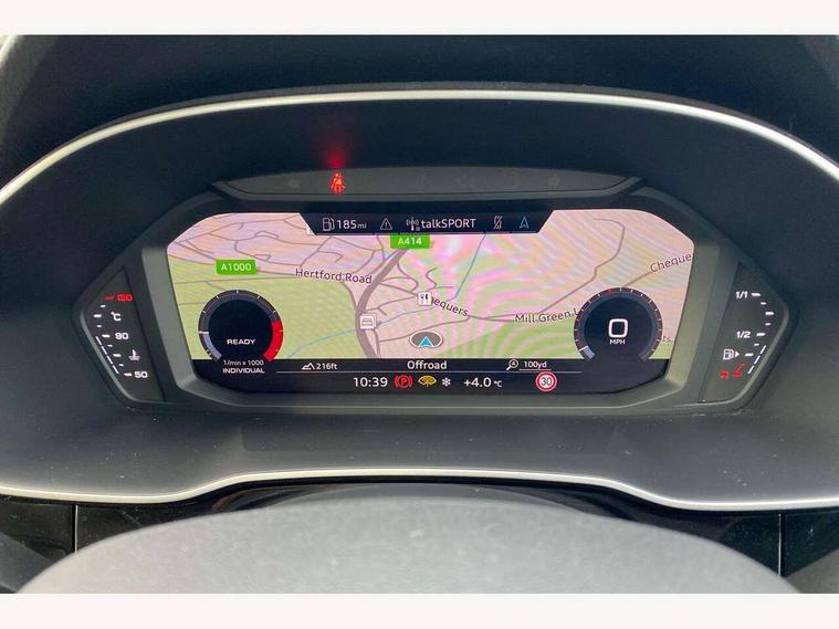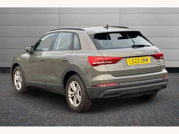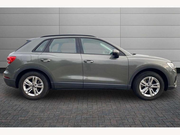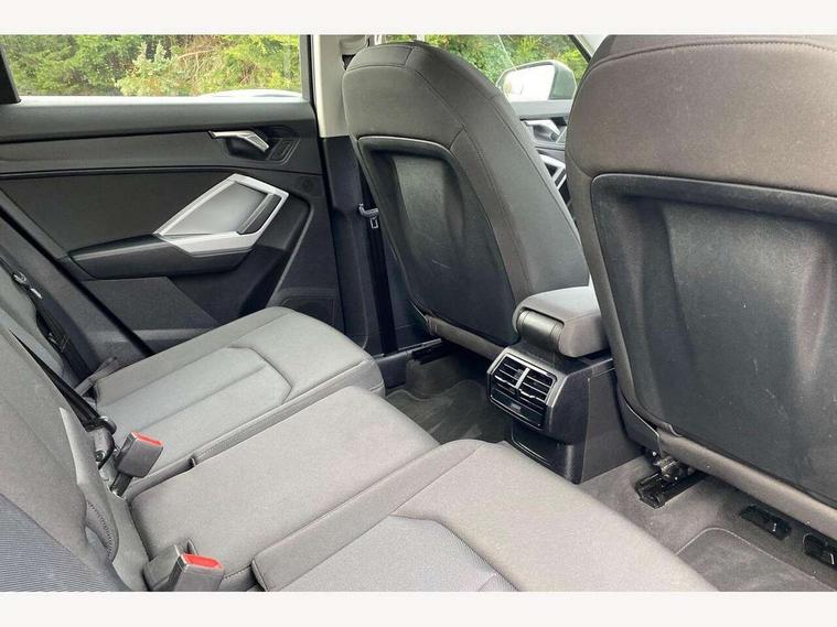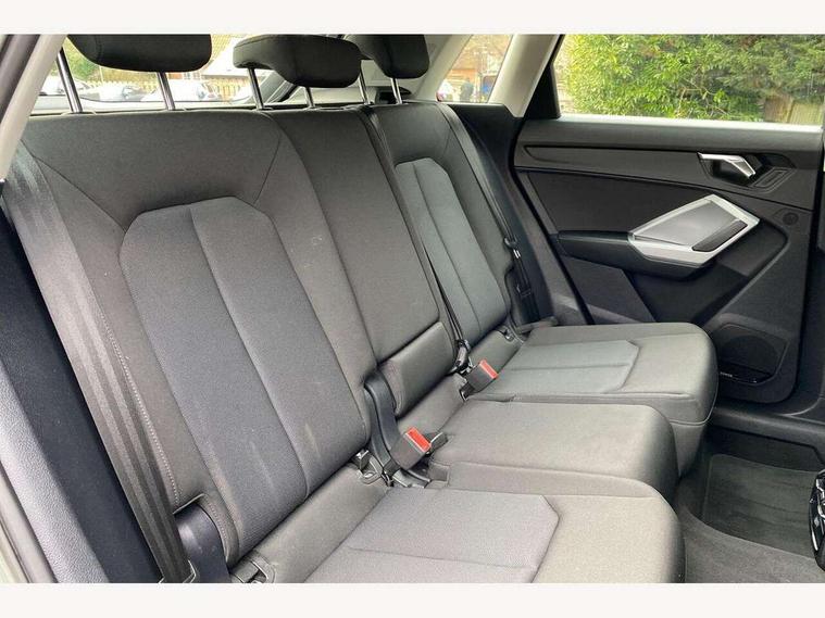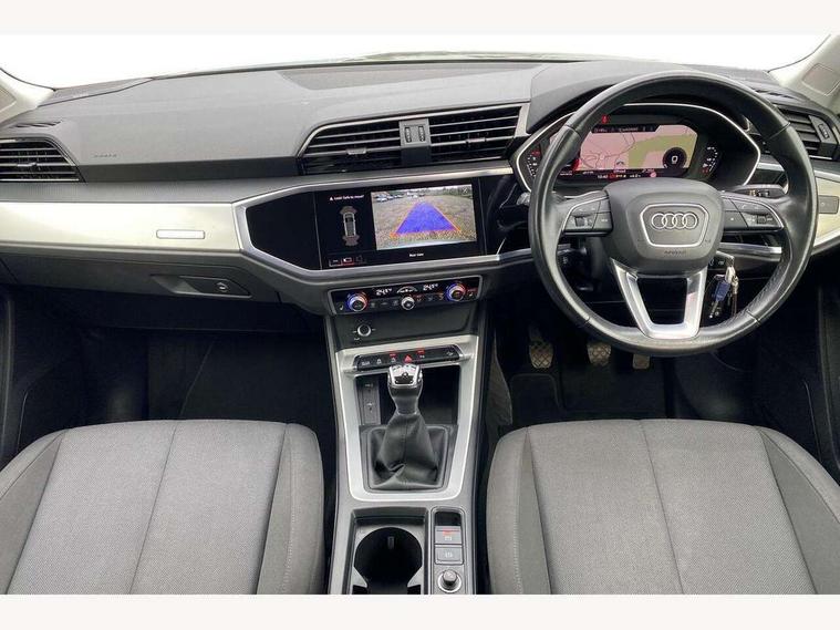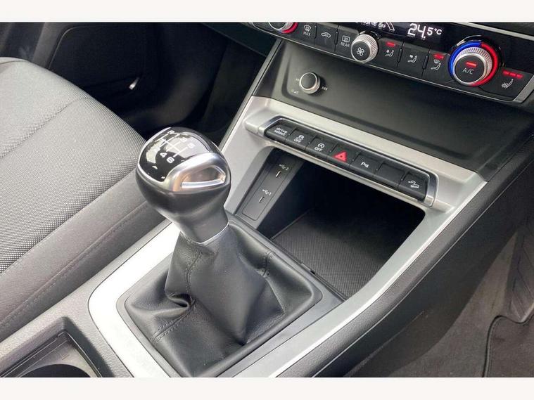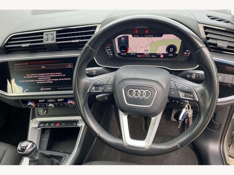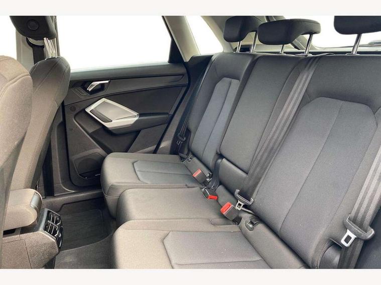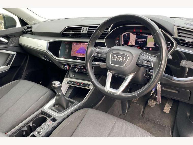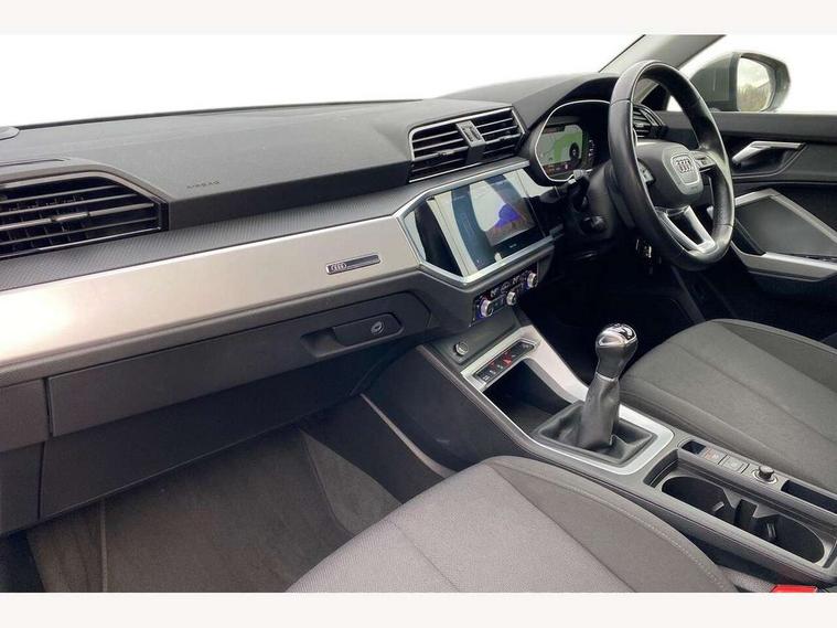 Amazon alexa Integration, Audi connect safety and service (e-call), Audi drive select, Audi lane departure warning, Audi Virtual Cockpit - 10.25" display, Bluetooth interface, Camera based traffic sign recognition, Cruise control + speed limiter, MMI Navigation Plus with high resolution 10.1 inch touchscreen colour display, Power operated tailgate, Progressive steering, Rear parking sensors, Service interval indicator, Smartphone interface includes wireless Apple carplay/Android Auto, Start stop system with recuperation, Voice control system with natural language interaction, Standard suspension, 2 USB-C ports with charge and data functions, 6 passive loudspeakers, DAB digital radio module, Acoustic windscreen, Auto dimming frameless rear view mirror, Black roof rails, Body colour door mirrors, Diffuser in grained anthracite, Electrically folding, adjustable and heated door mirrors with integrated LED side indicators and kerb view function for passenger side, Exterior bumper with wheel arch trims and side sill trims in grained black matt, Front and rear electric windows, Grained radiator protective grille, Halogen rear lights, LED headlights with LED daytime running lights, Rain and light sensors, Rear side wing doors, Rear wiper, Third brake light, Variable front intermittent wipers, 12V socket in rear centre console, 3 seat bench in 2nd row, 3 spoke multi-function leather steering wheel, 40:20:40 folding with manual adjustment for 60:40 forwards/backwards position and backrest angle, Dual zone electronic climate control, Front and rear floor mats, Front and rear headrests, Front and rear roof module including reading lights, Front centre armrest, Glove compartment lighting, Height and reach adjustable steering wheel, ISOFIX child seat mounting for front passenger with airbag deactivation and outer rear seat including top tether attachment point for outer rear seats, Luggage compartment light, Lunar silver cloth headlining, Manual front seats with height adjustment, Single front passenger seat, Stainless steel luggage compartment sill finisher, Non smoking pack - Q3, 3x3 point rear seatbelts, 6 airbags - Driver, front passenger, curtain and side windows, Audi pre-sense front with pedestrain and cyclist recognition, Electromechanical parking brake, Electronic stabilisation control including ABS, ASR and EDL, Front seatbelt reminder, Hill descent control, Hill hold assist, Manual child lock in rear doors, Pre sense basic, Seatbelt monitoring, Tyre pressure warning, Warning triangle and first aid kit, Anti theft alarm, Anti theft wheel bolts, Immobiliser, Remote central locking, Detail dashboard around MMI touch colour display in glass look, black with surround in aluminium look, Micrometallic silver inlay, 17" 5 twin spoke design alloy wheels,