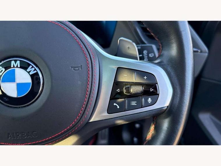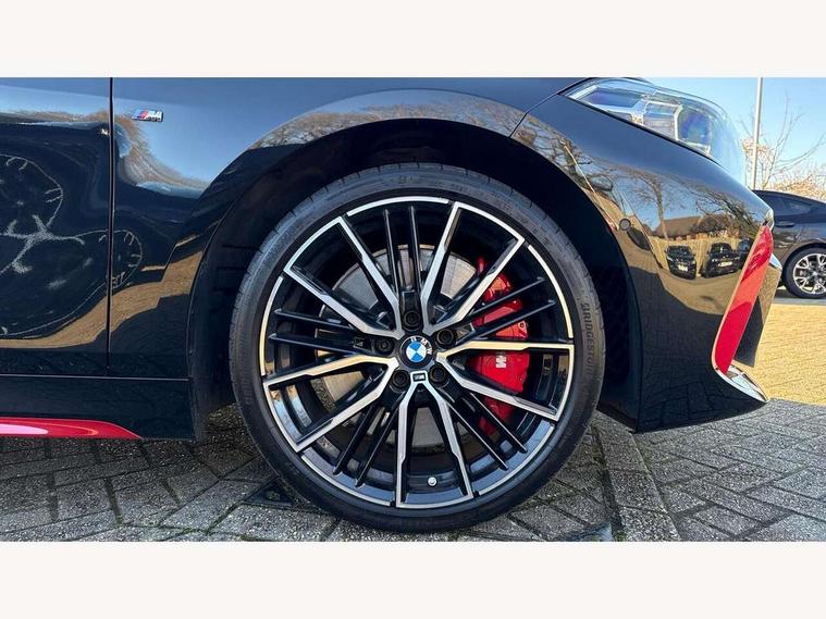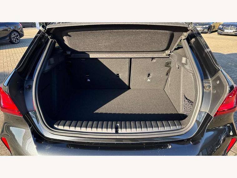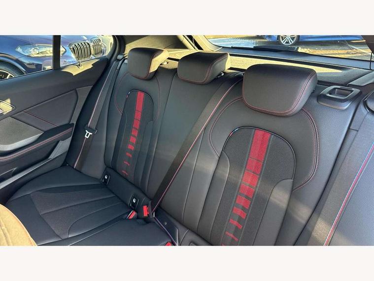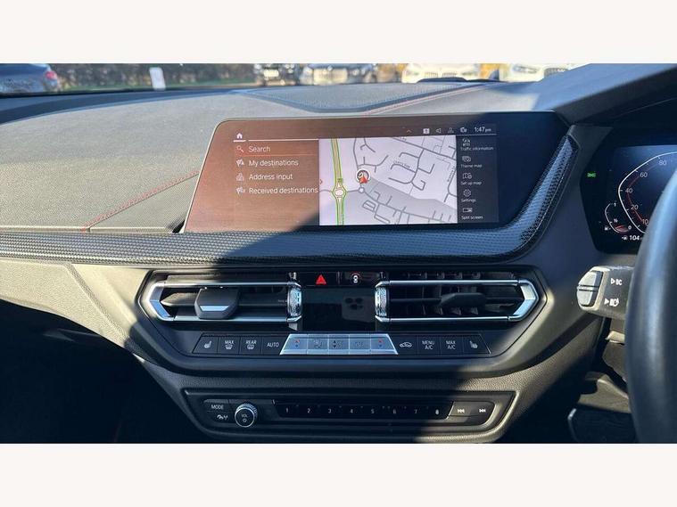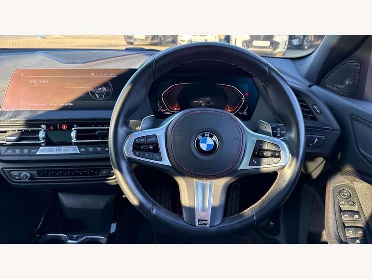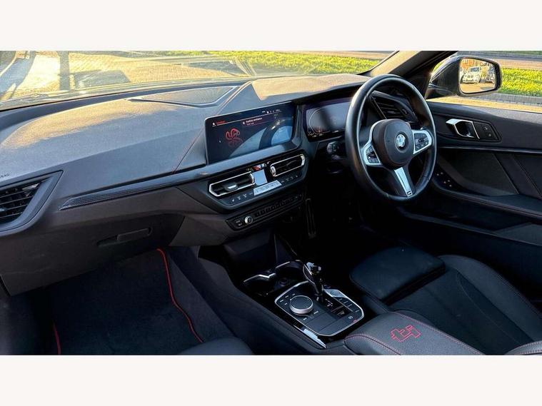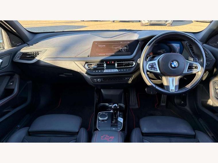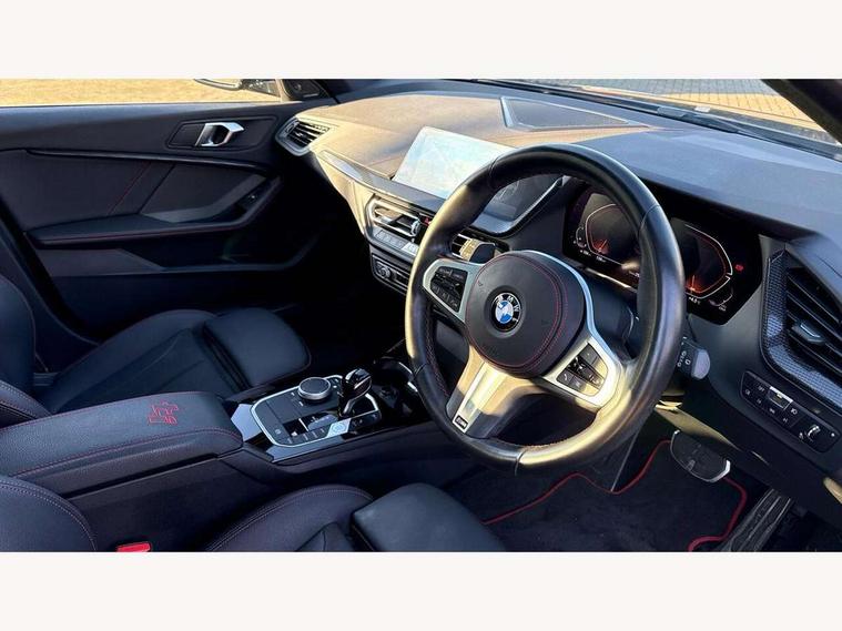 Active guard plus, Attentiveness assist, BMW ConnectedDrive online services, BMW Teleservices, Check Control warning system for monitoring of lights and door/luggage compartment open warning, Cruise control with speed limiter, Eco pro mode, Electric power steering with Servotronic steering optimised at all speed ranges, Front axle single joint with specific axle kinematics to minimise drive influences on steering + provide increased rigidity agile driving behaviour, Integrated owners handbook, Lane departure warning system, Oil sensor for level and grade, On board computer, Optimum shift indicator, Personal Profile, Pull away assistant, Rigidly mounted rear subframe - Multi link construction with separate spring / damper configuration and excellent driving characteristics, Speed limit Info including no-overtaking indicator, Aluminium lightweight construction, Anti roll bar front and rear, Balancer shaft, Double VANOS twin scroll turbocharging system, Drive Performance Control, Eight speed sport automatic transmission with gearshift paddle switches, Electronic differential lock, High precision injection, Larger fuel tank capacity (50 litres), M sport suspension with M128i xDrive specific settings, Petrol Particulate Filter, Twin tube gas filled shock absorbers with degressive characteristic curve, VALVETRONIC engine management, DAB Digital radio, Auto dimming rear view mirror, Automatic headlight beam throw control, Automatic windscreen wipers and automatic headlight, Black chrome tailpipe finishers, BMW individual high gloss shadow line with extended content, Body colour door handles, Body colour mirror caps, Body colour roof trims, Chrome 'M' logo side designation, Chrome kidney grille frame with Satin Aluminium struts, Direction indicator side lights in exterior mirrors, Electrically adjustable exterior mirror with mirror adjustment switch on drivers armrest and aspheric on driver side, convex on passenger side, Fading support, Folding side mirrors with auto dimming/folding wing mirrors with auto dimming, Follow me home headlights, Front and rear bumper system with replaceable deformation elements, Front and rear electric windows with open and close fingertip control, anti trap facility and comfort closing, Front door sill finishers in black plastic with M designation in metallic look, Green tinted heat protection glazing, High gloss shadowline window frame, Recess cover mirror frames and B/C pillar embelisher trim, High level third brake light, Integrated front windscreen with washer jets, Kidney frame and struts in high gloss black extended, LED daytime running lights, LED eyebrow turn indicators, Lightweight engineering, Matt black air guide grilles, Matt black wheel arch trim, Model designation on electric bootlid, Nearside reverse light in rear light cluster, Preparation for high beam assistant, Rear fog lights, Rear side wing doors, Rear window wiper, Shark fin antenna, Trailer stabilisation logic, Visible VIN plate, Welcome lighting, 12V power socket in front centre console with blanking plug, 3 rear seat head restraints, 3 seat bench in 2nd row, Anthracite headlining, Black boot net with lashing eyes, Cargo function on 2nd seat row, Child seat ISOFIX attachment for two outer rear seats and front passenger seat with anchorage points, Conditioned based service, Driver and front passenger backrest net on rear, Driver and front passenger seat heating, Driver side folding compartment in instrument panel, Folding rear clothes hook, Four grab handles integrated in roof lining, Front and rear door pockets with bottle holders, Front and rear side armrest integrated into door trim, Front armrest, Front sports seats, Glove compartment, Height adjustable front head restraints, Luggage compartment for bag hooks on left and right, foldable luggage compartment liner and four lashing eyelets, Manual adjust steering wheel, Multi-function controls for steering wheel, Single front passenger seat, Storage compartment in centre console, Storage compartment in luggage compartment, Stowage of the parcel shelf in luggage compartment trim, Sun visors with vanity mirrors and insert tab, Three spoke M sport design multi function leather steering wheel in unique red stitching, Two front centre console cupholders, Two zone automatic air conditioning, Type C two USB ports in rear centre console, Additional interior lighting pack - 1 Series, BMW live cockpit professional pack- 1 Series, Connected pack professional - 1 Series, Interior lights pack - 1 Series, M Sport exterior styling aerodynamics pack - 1 Series, 2 tone horn, 3 point seatbelts on all seats, front pyrotechnic belt tensioners, stopper and belt force limiters, rear coded belt buckles, Airbags - Front driver/passenger, front and rear curtain head protection, front side, manual deactivation of front passenger airbag, Anti lock braking system (ABS) with brake assist, BMW emergency call, Brake drying, Braking readiness, Child proof locking system in rear door, City braking function, Comfort modes, Cornering brake control, Crash sensor activating of airbags, Unlocking doors, hazard warning lights, interior light, safety battery terminal, Driver and front passenger seat belt security check, Dynamic stability control + (DSC+), Dynamic Traction Control - DTC, Electrically operated hand brake including automatic hold function, Front and rear disc brakes, M Sport brakes with red calipers, M Sport seatbelts, Seatbelt warning, Side impact protection, Tyre pressure monitoring system, Warning triangle and first aid kit, Central locking switch for all doors, fuel filler cap and luggage compartment, Deadlocking function system to all doors, Drive away locking system on all doors and luggage compartment with de-activated in iDrive settings, Locking wheel bolts, Remote control with integrated key with High-gloss Black inlay and M designation and 1 button for open/ close lock, window, open luggage compartment, Start/stop button illuminated in centre console with k