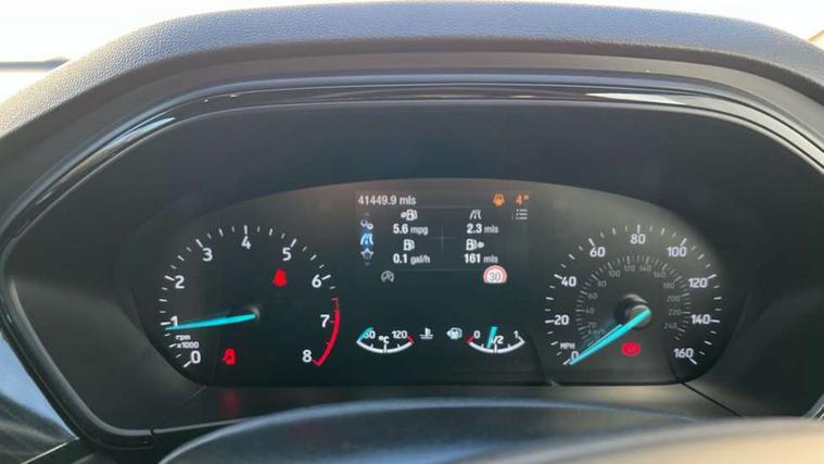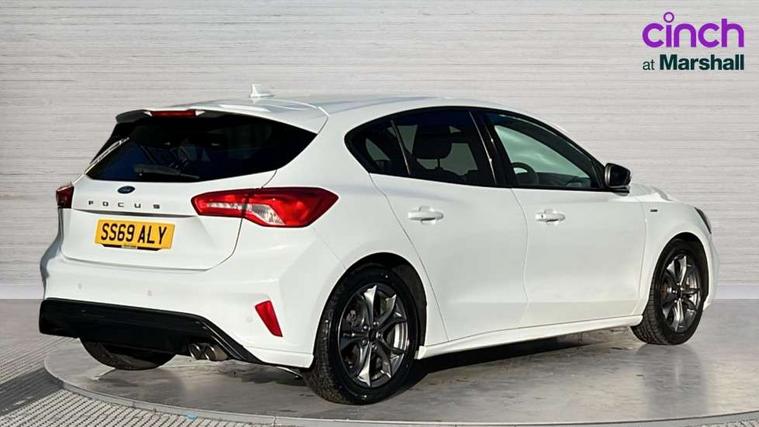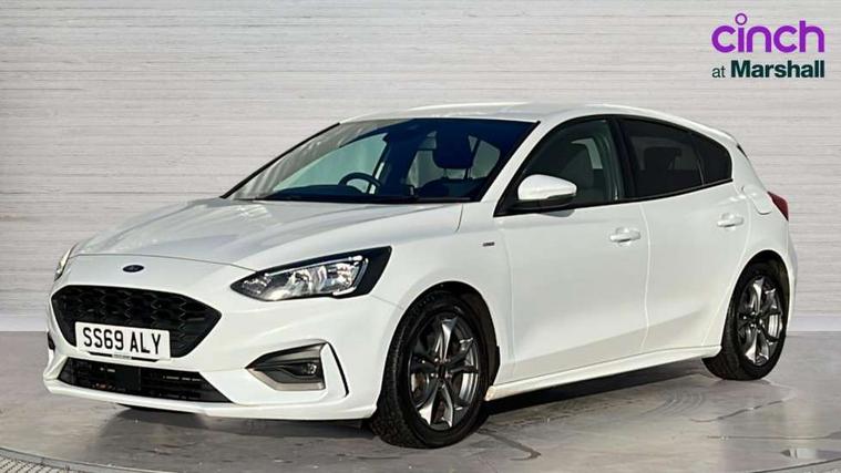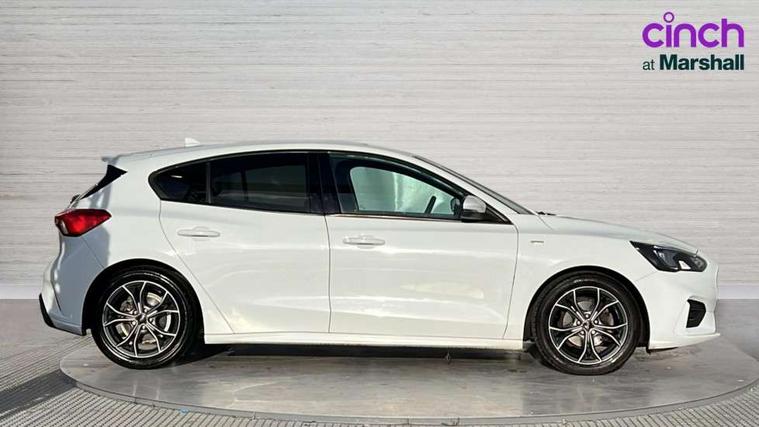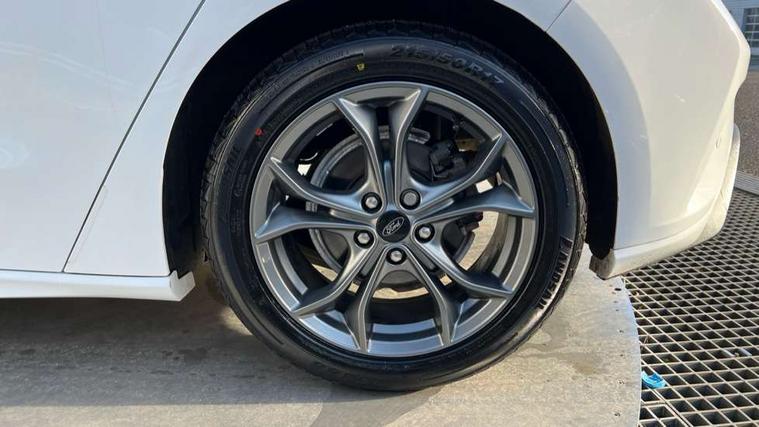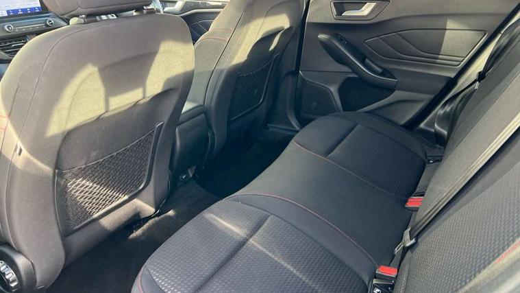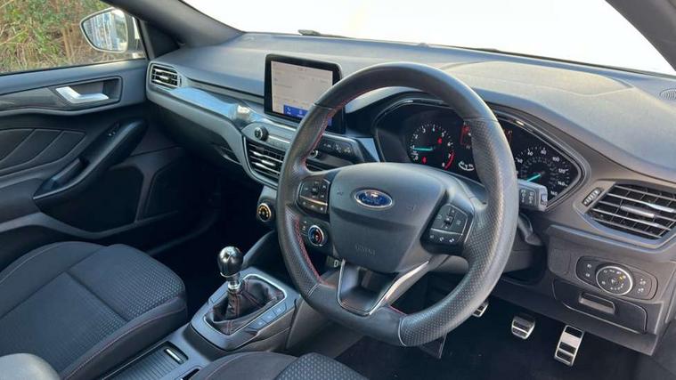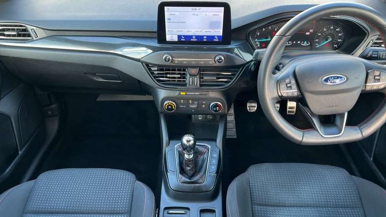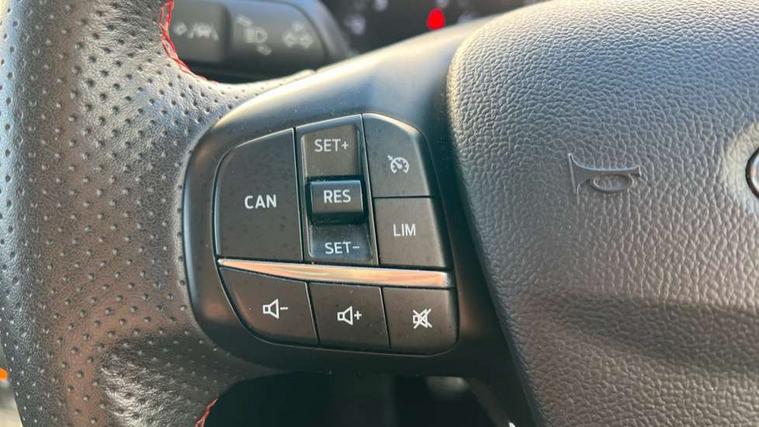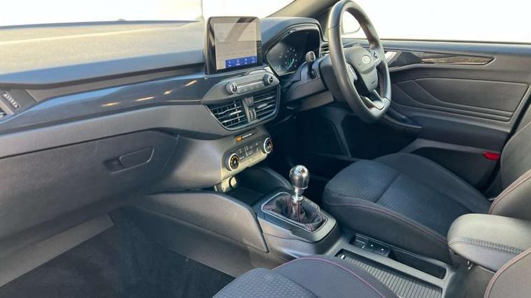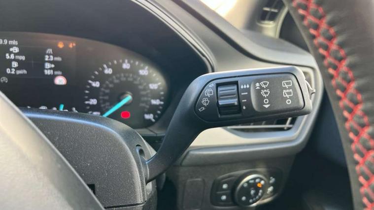 Bluetooth system, Digital clock, Easy fuel capless refuelling system, Eco mode, Ford pass connect, Ford SYNC 3 with 8" TFT touchscreen, and app link Android auto/Apple carplay, Intelligent speed assist, Lane keeping aid with lane departure warning, PAS, Selectable drive mode, Trip computer, Sports tuned suspension, 6 speakers, Aux input, 'Quickclear' heated windscreen/heated washer jets, Auto headlamps (on/off), Body colour large rear spoiler, Body colour side skirt, Body coloured bumpers, Body coloured door handles, Body coloured electrically operated and heated door mirrors with side indicators, Electrically operated front and rear windows with one touch opening and closing, Front variable intermittent wipers with electric wash, Halogen reflector headlamps, Heated rear window, LED daytime running lamp, LED front fog lamps with cornering function, Polished twin tailpipe, ST-Line upper and lower grille with full body styling kit and wing badges, Tailgate wash/wipe, 3 spoke flat bottomed leather steering wheel with red stitching, 60/40 split back and cushion rear seats with 2 height adjustable headrests, Alloy finish pedals, Aluminium gear knob, Centre console with armrest, Cloth upholstery with red stitching, Dark headliner, Driver's lumbar support, Front floor mats, Height adjustable front headrests, Isofix child seat preparation, Manual air conditioning, Reach + rake adjustable steering column, Rear centre headrest, ABS+Electronic Brake force Distribution, Auto hold function, Driver airbag, Electronic parking brake, Electronic stability control, Front and rear seatbelt reminder, Front inertia reel height adjustable seatbelts with pre-tensioners, Front passenger airbag, Front side airbags, Hill start assist, Passenger airbag deactivate switch, Post collision braking, Pre collision assist with autonomous emergency braking and pedestrian/cyclist detection, Side curtain airbags, Three rear inertia reel lap/diagonal seatbelts, Tyre pressure monitoring system, Keyless start with 'Ford Power' starter button, MyKey system, Remote central locking & engine immobiliser, Thatcham category 1 alarm, Contrast stitching - Red, 17" 5x2 spoke alloy wheels with rock metallic finish, Mini steel spare wheel,