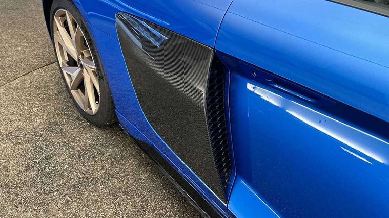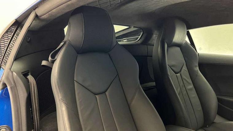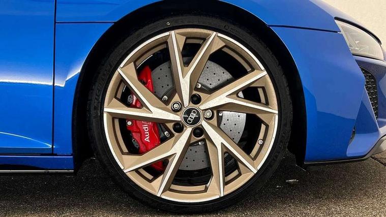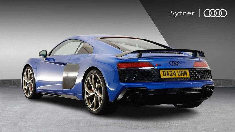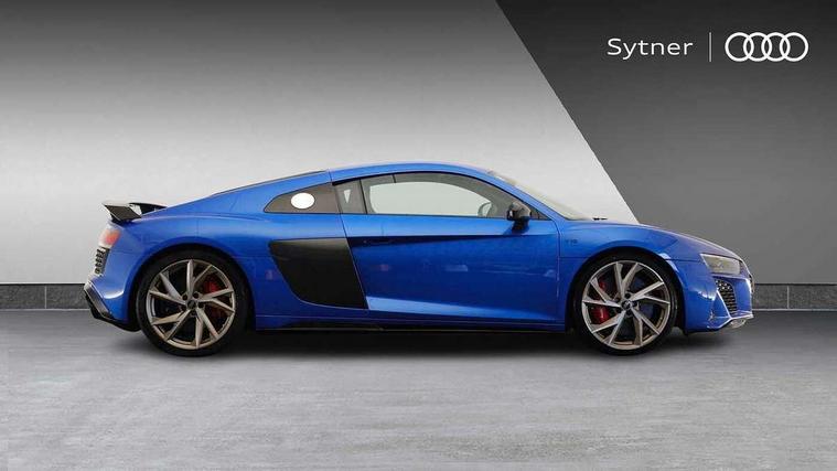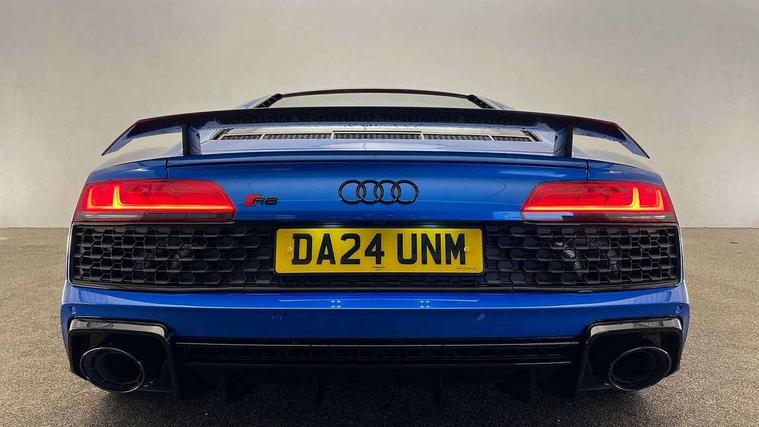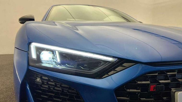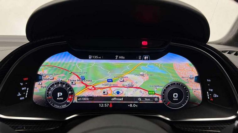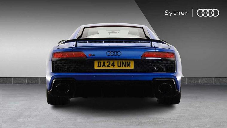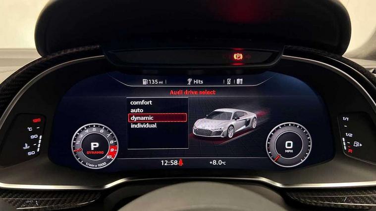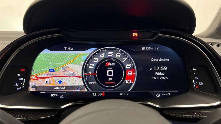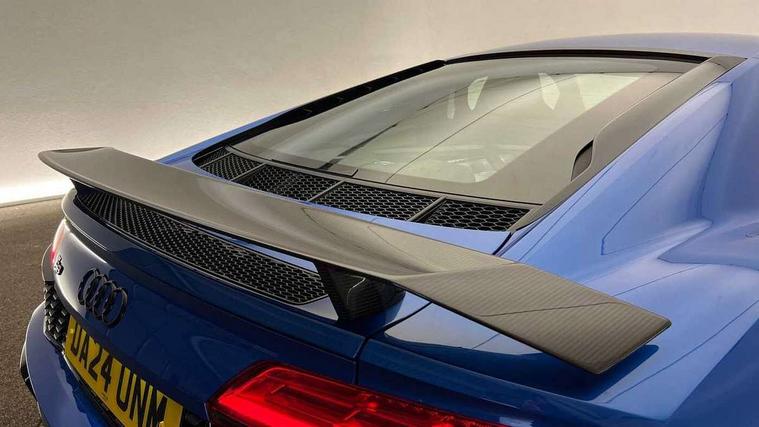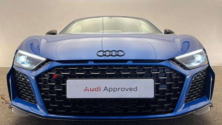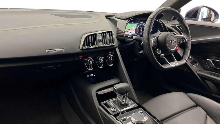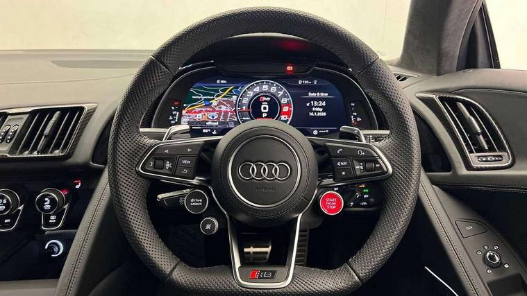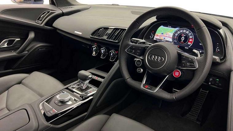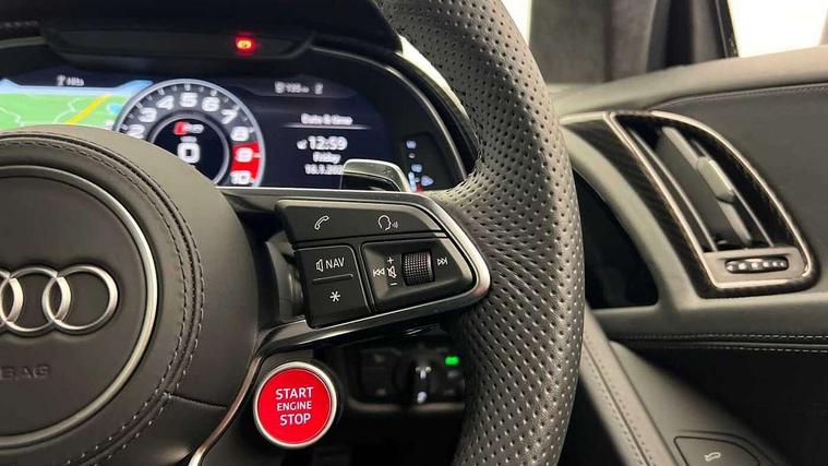 Audi connect, Audi drive select, Audi parking system plus with front and rear sensors, Audi phone box with wireless charging, Audi smartphone interface, Audi virtual cockpit, Bluetooth interface, Cruise control with speed above 18mph, Emergency call service, MMI navigation plus with MMI touch, PAS, Reversing camera, Service interval indicator, Start/Stop system with energy recuperation, Voice control system, Audi cylinder on demand, Performance sports suspension, S tronic transmission with hill hold assist, Audi music interface with 2 USB ports with charge and data functions, Bang and Olufsen Sound System with loudspeakers in the head restraints, DAB Digital radio, 3rd brake light, Audi beam, Audi space frame, Auto dimming rear view mirror and frameless with light and rain sensor, Black mirrors, Electric front windows, Electrically adjustable, heated, folding and automatically dimming door mirrors with integrated LED indicator, Fixed rear lip spoiler in Gloss Carbon, Gloss black oval tailpipe trim, Gloss black radiator grille with R8 emblem, Heated rear window, High beam assist, LED headlights with dipped beam, daytime running lights, indicator and static turning light in LED technology, LED rear lights with dynamic rear indicators, Light and rain sensor, Rear boot, Sideblades in gloss carbon, Variable front intermittent wipers, 3 spoke flat bottomed multi-functional perforated performance leather steering wheel with 3 operating satellites, Deluxe automatic climate control air conditioning, Illuminated door sills with aluminium insert, Pneumatic seat backrest and side bolster adjustment, Seat heating, Single front passenger seat, Stainless steel pedals and footrest, Black Styling pack - R8 Coupe, Gloss black styling pack - R8, Interior light pack - R8, ABS, Ceramic brakes in front with brake calipers in gloss red, Driver/front passenger airbag, EDL traction control, ESP, Front side airbags, Seatbelt monitoring, Side curtain airbags, Tyre pressure warning light, Warning triangle and first aid kit, Wave brake discs, Advanced key with safelock, Anti theft alarm and immobiliser, Locking wheel bolts, Remote central locking, Alcantara headlining with diamond stitched pattern, Belt loops, top section of centre console, centre armrest, door pull handle and speaker trim on front pass. side in fine Nappa leather seat up. colour, Door armrests and map compartments in fine Nappa leather in seat upholstery colour, Loudspeaker on drivers side in artificial black leather, Matt anthracite titanium finish inlays, Piano black lower inlays, Steering wheel impact absorber trim, lower part of centre console, door rails, rear panel rail and side panel trims in black Fine Nappa Leather, Upper and lower section of dashboard, cowl, monoposto, knee pad on the drivers side, airbag cover in black Fine Nappa Leather, Tool kit, Tyre repair kit,