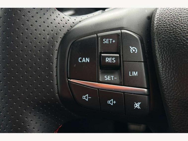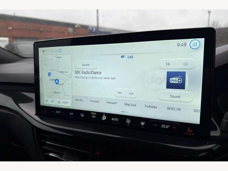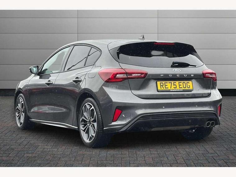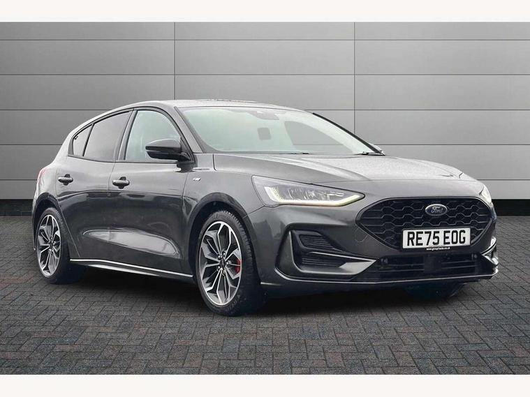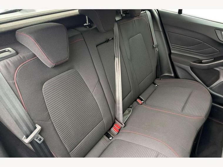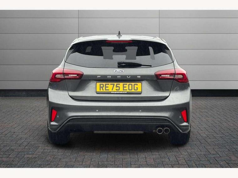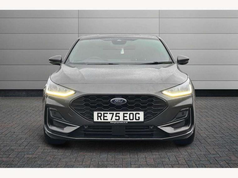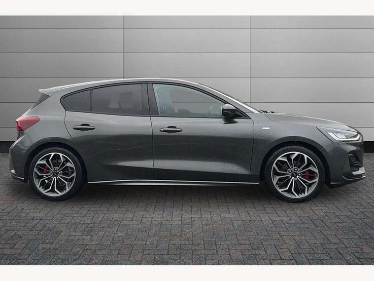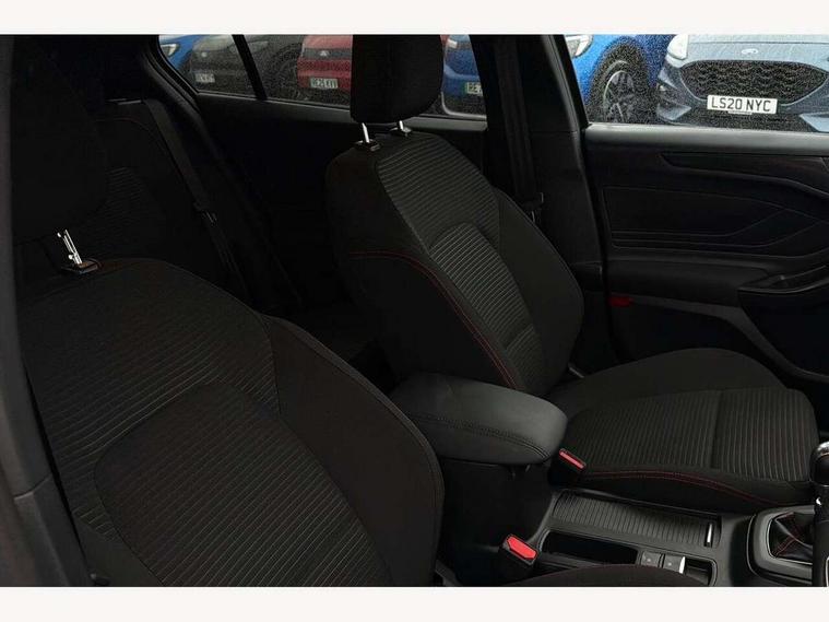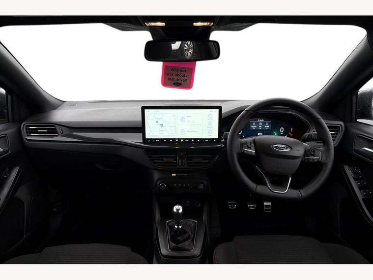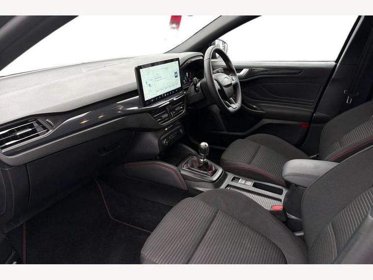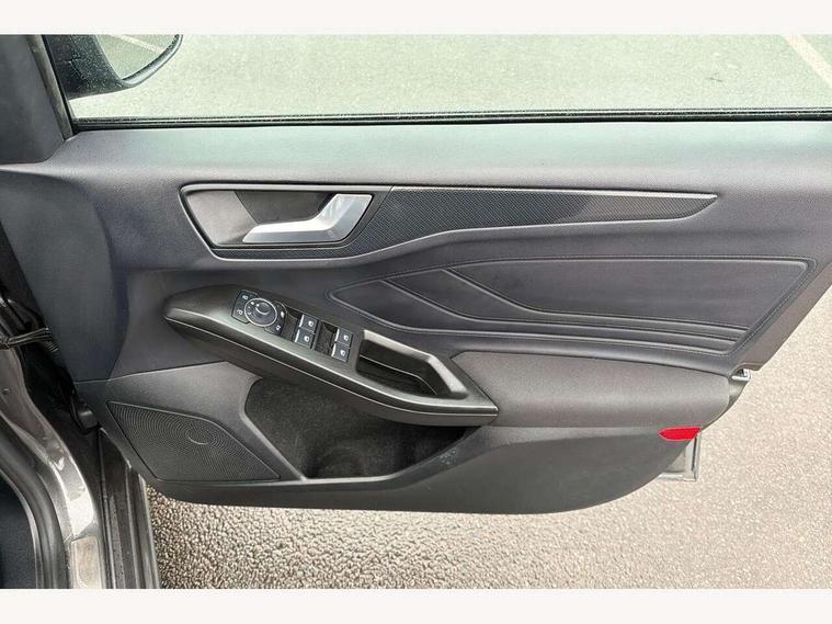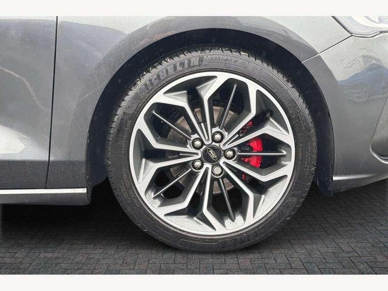 12.3" Digital instrument cluster, Bluetooth system, Digital clock, Easy fuel capless refuelling system, Eco mode, Ford SYNC4 Nav with 13.2'' touchscreen, DAB, Emergency Assistance, Apple Carplay & Android Auto, B&O Premium Audio with 10 speakers, FordPass Connect, Lane keeping system - lane keeping alert and lane keeping aid, PAS, Rev counter, Selectable drive mode, Service interval indicator, Trip computer, Wireless charging pad, Sports tuned suspension, 2 USB ports, Auto headlamps (on/off), Body coloured door handles, Electrically operated front and rear windows with one touch opening and closing, Electrically operated heated power fold door mirrors with puddle lamp with side indicators, Front variable intermittent wipers with electric wash, Heated rear window, LED daytime running lamp, LED rear lamps, LED third brake light, Polished twin tailpipe, Privacy glass, Quickclear heated windscreen, Rain sensor, Rear side wing doors, Tailgate wash/wipe, Unique ST-Line grille, full bodystyling kit, and large body coloured rear roof spoiler, 3 rear headrests, 3 seat bench in 2nd row, Dual zone electronic air temperature control, Full sensico premium upholstery, Height adjustable front headrests, Isofix child seat preparation, Load through ski hatch, Manual 2-way passenger seat adjust, Power 4-way driver seat adjust, with power lumbar adjust, Reach + rake adjustable steering column, Single front passenger seat, ST-Line Design pack - Focus, Winter pack - Focus, 3x3 point rear seatbelts, ABS+Electronic Brake force Distribution, Auto hold function, Driver airbag, EDL traction control, Electronic parking brake, Electronic stability control, Front and rear seatbelt reminder, Front inertia reel height adjustable seatbelts with pre-tensioners, Front passenger airbag, Front side airbags, Passenger airbag deactivate switch, Post collision braking, Pre collision assist with autonomous emergency braking and pedestrian/cyclist detection, Remote/power child rear door locks, Side curtain airbags, Three rear inertia reel lap/diagonal seatbelts, Tyre pressure monitoring system, Keyless entry and keyless start, MyKey system, Remote central locking & engine immobiliser, Thatcham alarm with power door dead locks, 18" 5x3 spoke pearl grey high gloss machined finish alloy wheels with mini spare wheel,