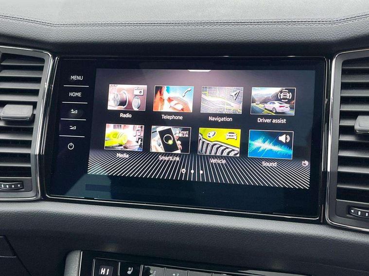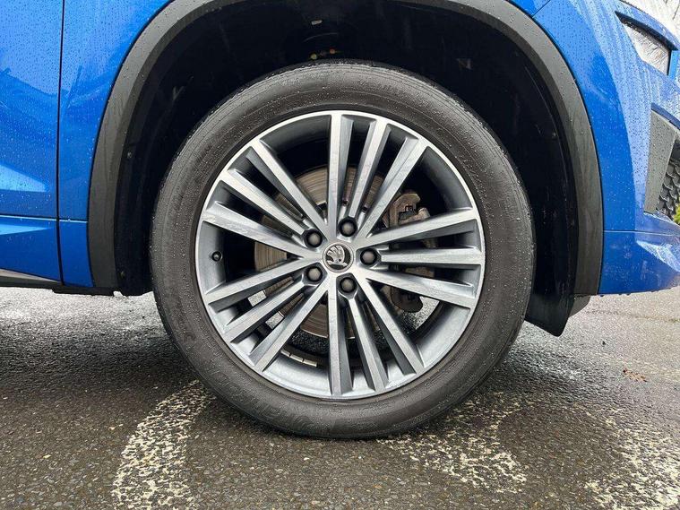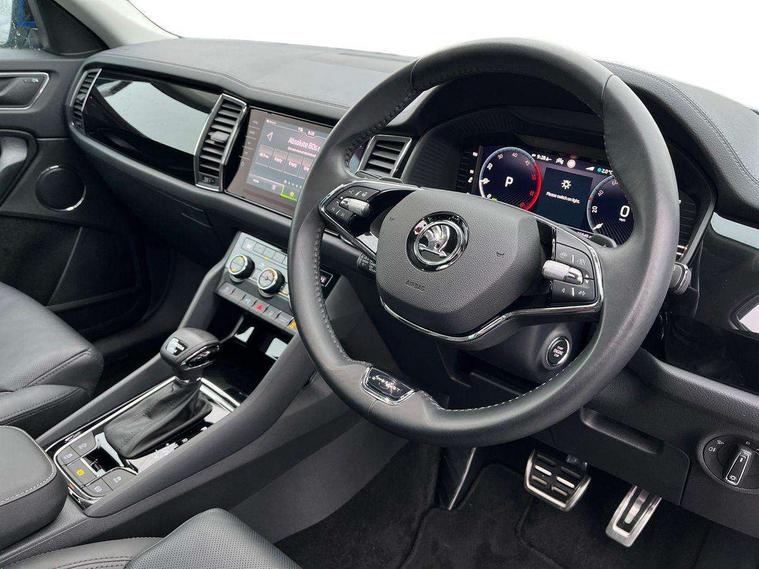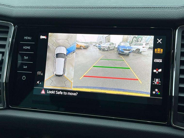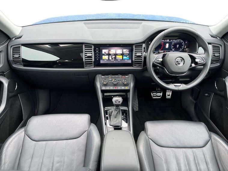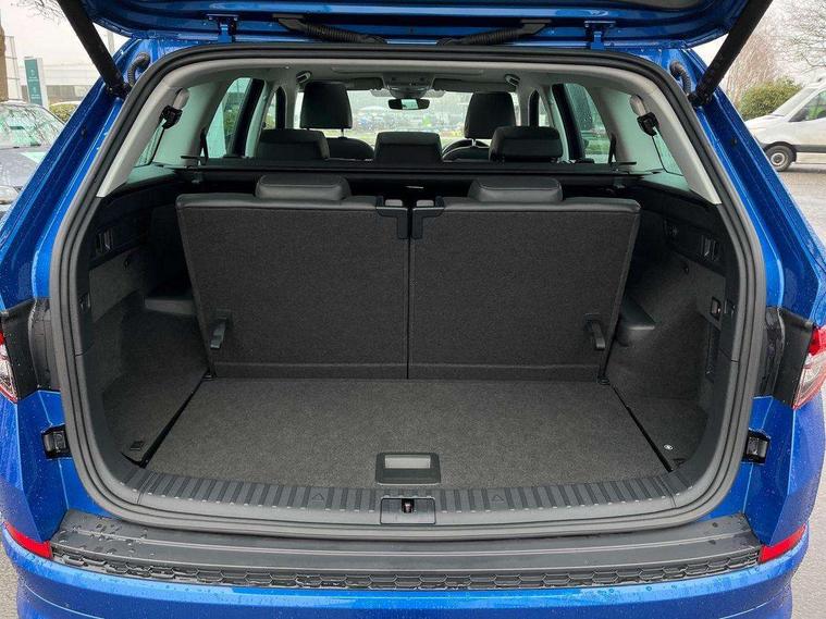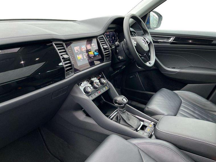 Area view, Blind spot detection system, Bluetooth system, Columbus satellite navigation with 9.2" touchscreen, integrated Wi-Fi, web radio, Digital voice enhancement, E-call, ECO Stop/start function, Exterior temperature indicator, Progressive steering, Smartlink wireless for apple carplay and wired for android auto, Speed limiter, Tailgate unlocking from outside, USB C Port x 2 in front centre console, Virtual Cockpit - 10.25" digital display, Wireless charging, Canton sound system, DAB Digital radio, Aero front windscreen wipers with intermittent function, Aero rear window wiper, Auto dimming rear view mirror, Black wheel arch surrounds, Body colour bumpers, Body colour door mirrors and handles, Body colour door panels, Chrome front grille, Chrome roof rails with chrome window surround, Electric adjustable/heated/folding door mirrors, driver side auto dimming with boarding sports and memory function, Electric front and rear windows, Extended rear spoiler with finlets in gloss black, Front fog lights, Full LED matrix headlights with AFS (adaptive front light system), cornering function and AWL (all weather lighting system), Headlight washers, Heated rear window, Invisible tailpipe, L&K front and rear bumpers including lower rear chrome strip, LED daytime running lights, LED rear fog light, LED third brake light in rear spoiler, Light assistant (coming/leaving home/tunnel light), Off-road style lower front bumper element, Panoramic sunroof, Privacy glass, Rain and light sensors, Rear LED lights (high functionality) with welcome effect and dynamic indicators, Rear side wing doors, Safety reflectors on front and rear doors, Window control switches with black trim, Without engine designation, 12V socket in boot, 2 rails with 2 hooks, 2 seat bench in 3rd row, 3 seat bench in 2nd row, 4 foldable roof handles with rear coat hooks, 60:40 foldable rear seat with sliding adjustment and backrest angle adjustment, Aluminium pedals, Bottle holders in door panel in the 1.5 litre front and 1 litre rear, Cargo storage compartments, Chrome headlight control button, Chrome interior door handles, Coat hooks on B pillar, Covered storage compartment on driver side, Front centre armrest with storage compartment, cup holder and 12V socket, Front courtesy lights, Gear shift lever with chrome frame and black gloss insert, Grey stitching in front and rear armrests and door armrests + door inserts, Height adjustable front headrests, Illuminated and cooled glovebox, Illuminated luggage compartment, Isofix child seat fittings in outer rear seats with top tether, Manually adjustable steering column, Net programme in boot (1x horizontal Net, 2x vertical Nets), Overhead glasses storage compartment, Pollen filter, Rear centre armrest with cupholders, Single front passenger seat, Sliding trunk cover, Small Bags on the inner sides of the front backrests, Sunvisors with illuminated vanity mirrors, Three rear height adjustable headrests, Ticket holder on A Pillar, Umbrella in door panel, Variable boot floor, LED Interior light pack - Kodiaq, Auto door release and activation of warning lights in the event of an accident, Child locks on rear doors, Driver and front passenger airbag with knee airbag and front passenger airbag deactivation, Electronic parking brake with hill start assist, Emergency rear braking signal, ESC (incl. ABS+MSR+ASR+EDS+HBA+DSR+RBS+MKB), Front assist with autonomous emergency braking, Front side airbags with curtain airbags, Fuel cut off safety device, Height adjustable front 3 point seatbelts + pretensioners, Hill hold control, Rear disc brakes, Safety vest holder in door, Seat belt reminder for all seats, Three point rear seat belts, Two tone horn, Tyre pressure monitor, Alarm with interior monitoring and tilt sensor with safe function, Anti-theft wheel bolts, Immobiliser, Keyless entry and start system (KESSY), Remote central locking with 2 keys, Grey stitching in dashboard, Piano black decorative inserts, Plaquette L&K front fenders, Temporary spare wheel (space saver),