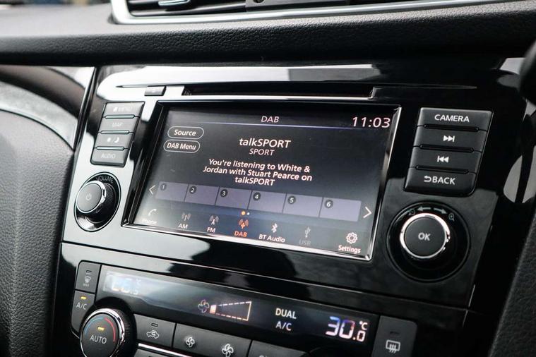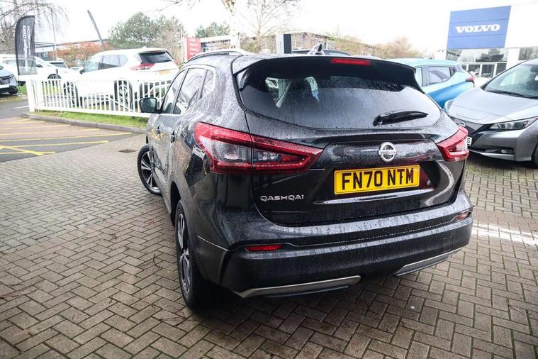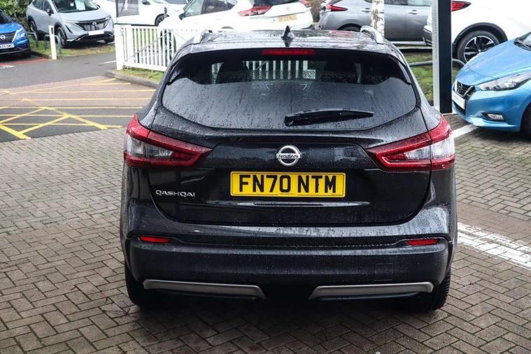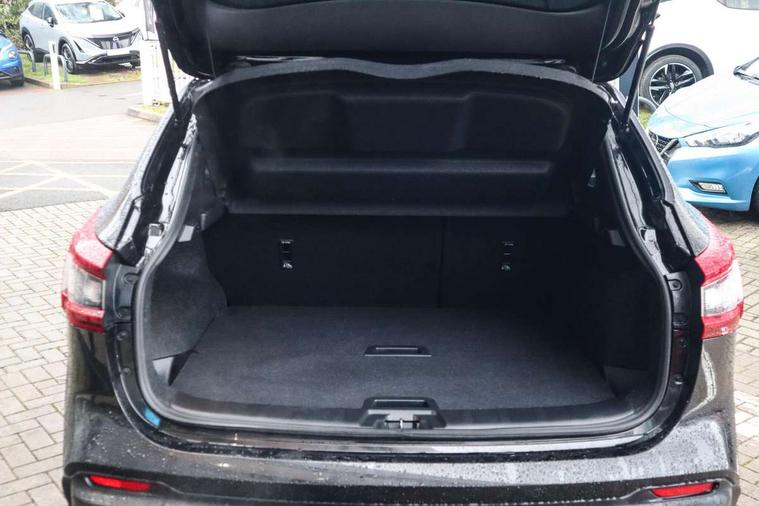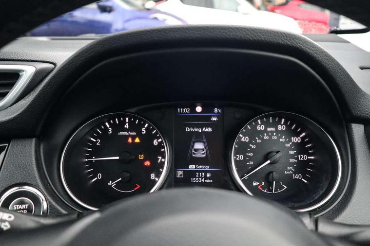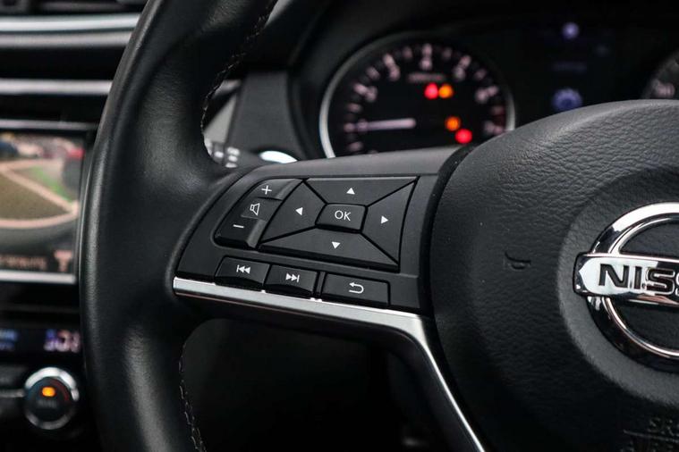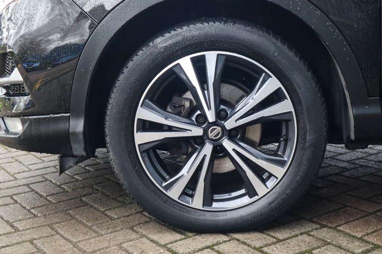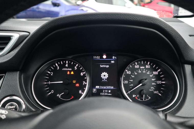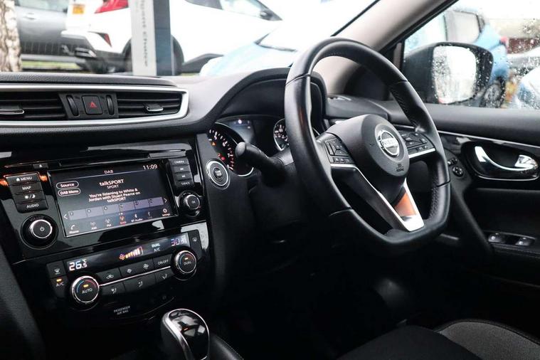 360 degree Intelligent around view monitor, Advanced drive assist display 5'' TFT coloured screen, Apple car play/Android Auto, Bluetooth connectivity, Cruise control + speed limiter, Electric speed sensitive power steering, Front parking sensors, Idle stop/start system, Intelligent park assist, Lane departure warning system, Nissan connect evo 7" touchscreen navigation and entertainment system, Normal or sport selectable steering, Outside temperature sensor, Premium Tomtom connected services, Push button starter, Rear parking sensors, Service interval indicator, Smartphone integration, Traffic sign recognition, Trip computer, Voice control system, Nissan chassis control (intelligent ride control, intelligent trace control, intelligent engine brake), 6 speakers, AM/FM radio, CD audio system, Aux-in socket, DAB Digital radio, Steering wheel mounted audio controls, USB port, Anti dazzle rear view mirror, Auto wipers, Body colour bumpers, Body coloured door handles, Body coloured door mirrors, Chrome window surround, Daytime running lights dip function when turn signal applied, Electric folding door mirrors, Electric front and rear windows with one touch illuminated window controls, Electrically adjustable door mirrors, Front fog lights, Halogen headlights, Heated door mirrors, High beam assist, Intelligent auto headlights, LED indicators in door mirrors, Matt silver roof rails, Privacy glass, Rear roof spoiler, Rear wiper with reverse link, Shark fin antenna, Signature LED daytime running lights, Silver rear styling plate, Underbody vortex generators, 2 X front 12v power sockets, 3 height adjustable rear headrests, 60/40 split folding rear seat, Ambient interior lighting, Ambient lighting around centre console, Bi-colour cloth upholstery, Boot lighting, Centre console storage box/armrest, Chrome interior door handles, Driver's seat manual height adjust, Dual zone climate control, Front and rear door pockets with bottle holders, Front and rear seat belt pre-tensioners with load limiters, Height adjustable front headrests, ISOFIX restraints on outer rear seats x2, Leather D shaped steering wheel, Leather gear lever, Leather knee pad, Luggage board system, Manual height adjustable passenger seat, Manual lumbar support on driver seat, Manual lumbar support on passenger seat, Monoform front sport seats with plastic backboard, Parcel shelf stow function under luggage board, Pollen filter, Rear armrest with 2 cupholders, Synthetic leather wrapped door handle with contrasting stitching, Tilt/telescopic adjustable steering wheel, Velour floor mats, Glass roof pack - Qashqai, 6 airbags - Driver, front passenger, curtain and side airbags, ABS, ESP, EBD and brake assist, Auto hold function, Child locks on rear doors, Electronic parking brake, Front and rear seat belt warning, Height adjustable front seatbelts, Hill start assist, Intelligent emergency braking with pedestrian recognition, Manual passenger airbag deactivation function, Three 3 point rear seatbelts, Tyre pressure monitoring system, Anti-theft immobiliser, Intelligent Key, Remote central locking, Thatcham Cat.1 alarm, Carbon graphite dash trim, 18" Two tone alloy wheels,
