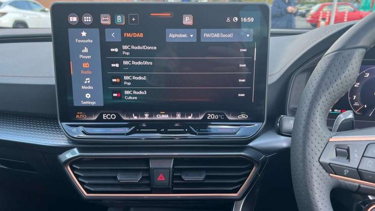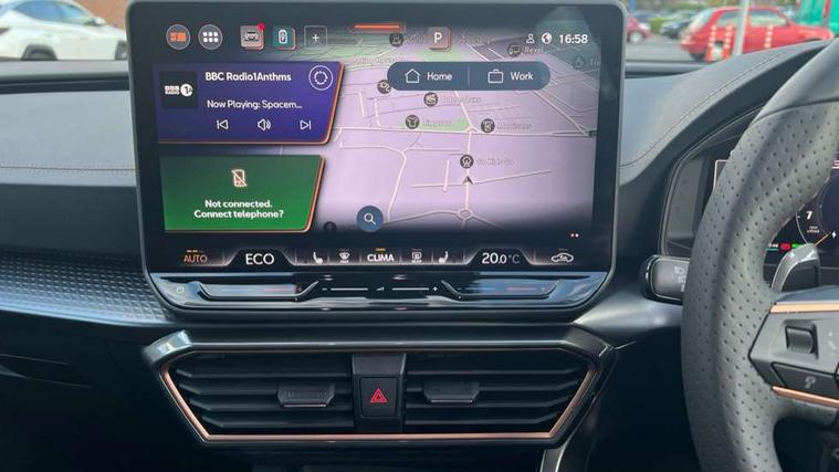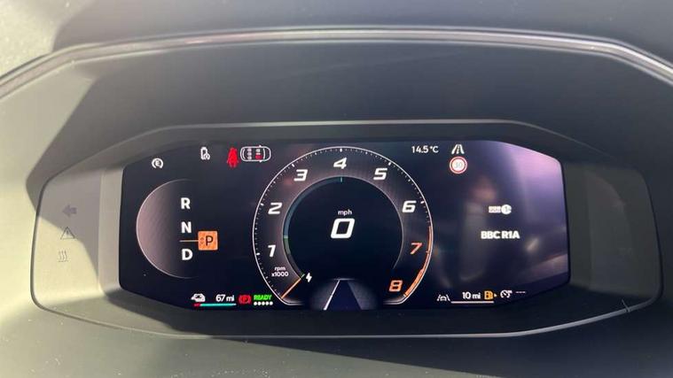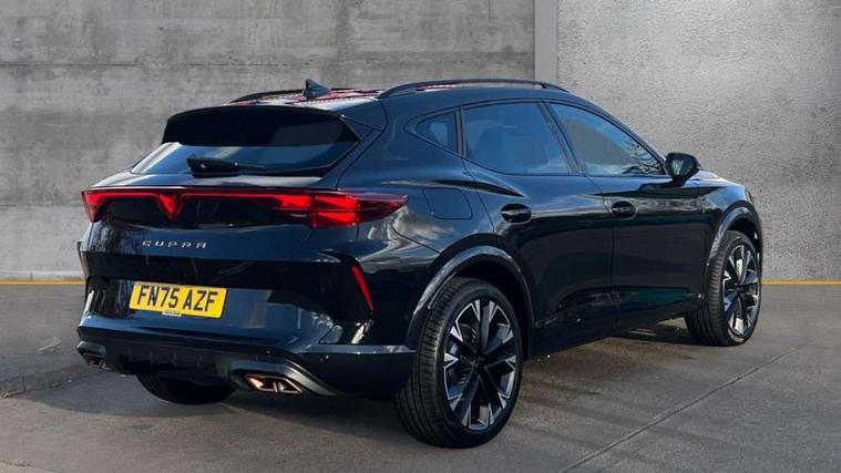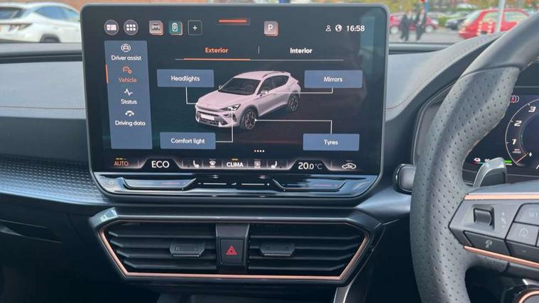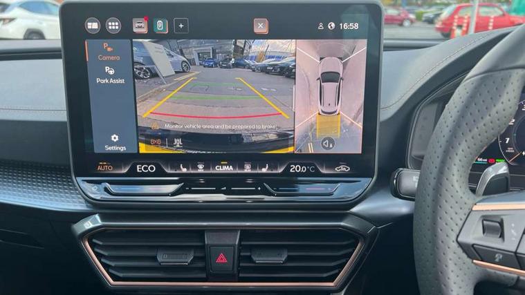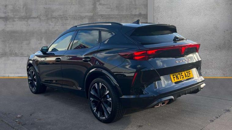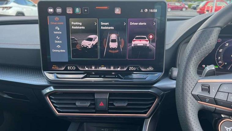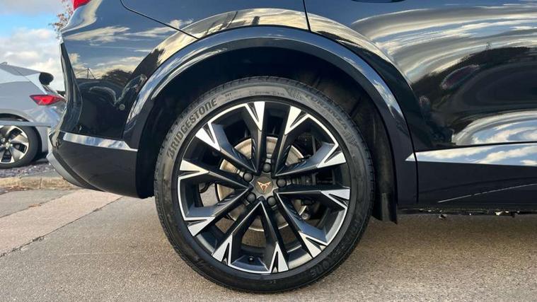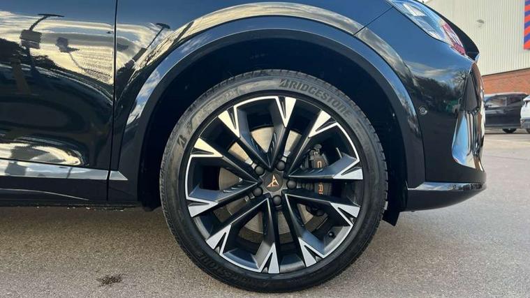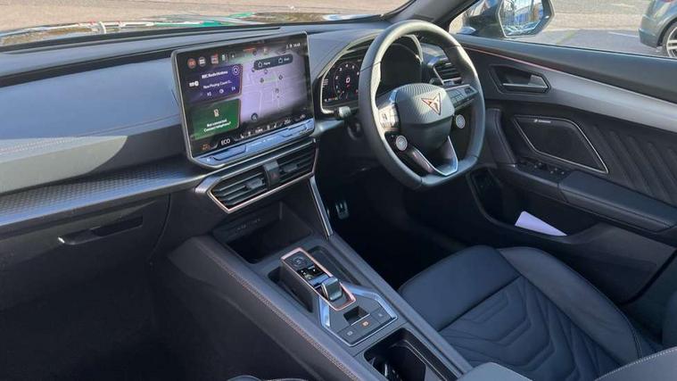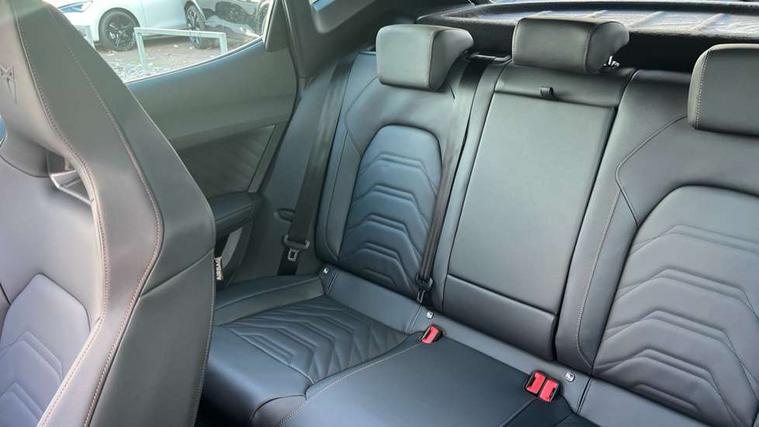 10.25" digital cockpit and configurable dashboard, Adaptive cruise control with follow-to-stop and speed limiter, Advanced driver alert system, Advanced lane assist with semi-automatic vehicle control in a medical emergency and traffic jam assist, Dynamic chassis control with driving profile selection (Comfort, Sport, CUPRA, Individual), Dynamic road sign display, Emergency steering support with turn assist, Forward collision warning with automatic braking, Front cross traffic assist, Full link phone integration, Intelligent park assist, RPM, trip computer, outside temp gauge, instrument light brightness, low fuel warning light, lights on reminder, gearshift indicator, Service interval indicator, Side and exit assist, Speed sensitive power steering, Start/stop system with regenerative braking, Top view camera, Virtual pedal and electric tailgate, Voice control system, Wired Android Auto, Wireless apple carplay, Wireless phone charger, 10 amp mode 2 charging cable, 32 amp mode 3 charging cable, Adaptive chassis control with continuous operation, CUPRA sport suspension, Electronic locking differential and dynamic traction support, 2 front and 2 rear USB type C sockets, Media system with navigation, 12.9" touchscreen display, voice control, DAB, steering wheel mounted controls, Auto dimming rear view mirror, Body colour door handles, Body coloured bumpers, Dark grey wing mirror, Daytime running light with automatic headlight control and coming home feature, Door panel ambient lighting, Dynamic headlight range control, Electric front/rear windows, Electrically adjustable heated and folding door mirrors with memory function, Gloss black roof rails and window surrounds, High beam assist, LED 3rd brake light, LED front fog lamps with cornering function, LED Taillights with dynamic indicator, Matrix Ultra HD headlights, Rain sensing wipers, Rear diffuser with copper simulated exhaust pipes, Rear fog lights, Rear side wing doors, Rear wash/wipe, Tinted rear windows, Welcome lights (within exterior mirror housing), 12V socket, 2 front and 2 rear reading lights, 3 seat bench in 2nd row, 60/40 split rear bench seat with armrest and mechanical seat release, Black headlining, Black interior roof lining, Cupra sports pedals, Dust/pollen filter, Electrically adjustable front seats with lumbar support and memory function, Front and rear head restraints, Front centre armrest, Heated front seats, Heated supersports multifunction leather steering wheel with satellite buttons and gear shift paddles, Height/reach adjust steering wheel, Illuminated aluminium doorsteps, Illuminated interior front door sills, Illuminated sunvisor with mirror, Isofix, Leather dashboard, door insert and side trim panel, LED smart wraparound lighting, PVC/Leather upholstery, Satellite steering wheel, Single front passenger seat, Storage pockets on rear of front seats, Three zone climate control with control panel in rear, 3 point seatbelts on all rear seats, ABS, Brake control system - ESC and brake booster, Child proof door locks, Driver and front passenger airbags with front passenger airbag de-activation, Electronic parking brake, Front and rear disc brakes, Front side curtain airbags, Hill hold control, Pre-crash front and rear seat belt tensioner, window closure and hazard lights, Public e-call, Seat belt reminder for front and rear seats, Tyre pressure monitoring system, Anti theft alarm system, KESSY Advanced - Keyless start, keyless entry with SAFELOCK, Locking wheel bolts, Warranty - 5 years/90, 000 miles, Copper and aluminium interior detailing, Breakdown and tool kit,
