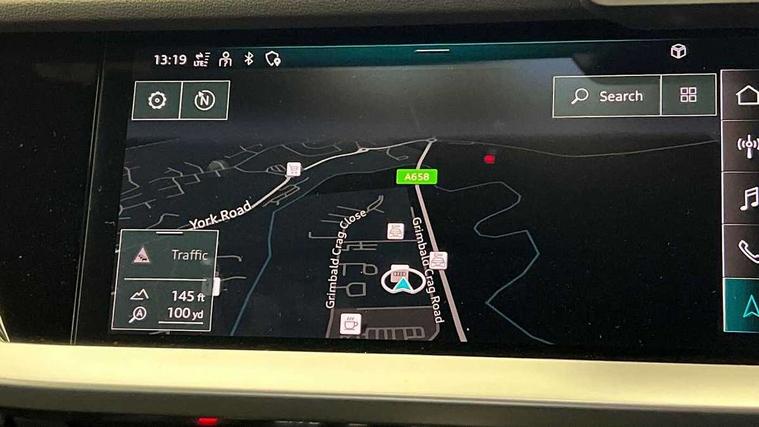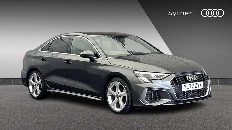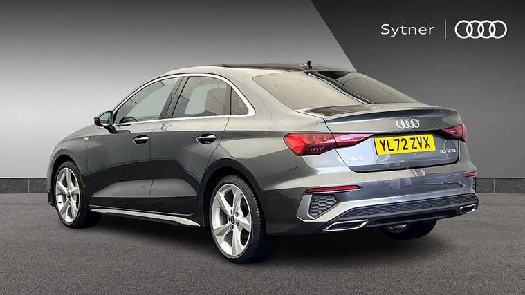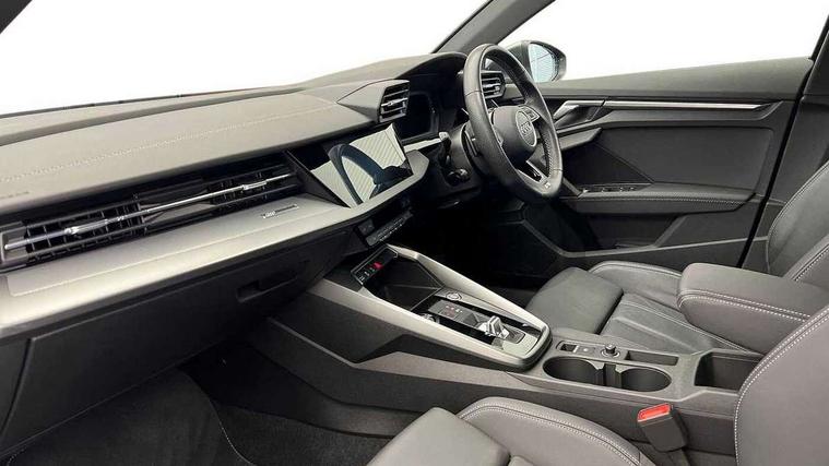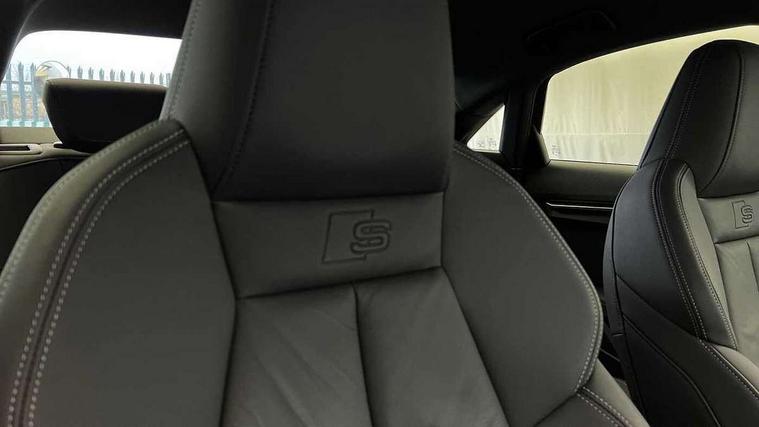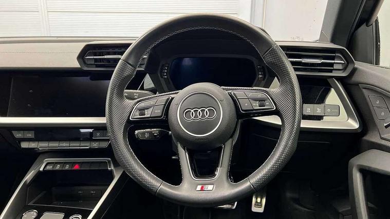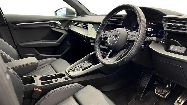 Audi drive select (Auto, Comfort, Dynamic, Efficiency and Individual), Audi smartphone interface, Audi Virtual Cockpit - 10.25" digital and colour instrument cluster, Automatic start/stop system with recuperation, Bluetooth interface, Camera based traffic sign recognition, Collision avoidance assistant, e-Call (emergency call), Electromechanical power speed sensitive steering, Lane departure warning system, MMI Navigation Plus with high resolution 10.1" colour touch screen display, Service indicator, Trip computer, Voice control system with natural language interaction, Sports suspension, 2xUSB-C connection with data and charging functions, CD player, DAB Digital radio, 3rd brake light, Acoustic glass windscreen, Aluminium window trim, Auto dimming frameless rear view mirror, Body colour exterior mirrors, Electrically adjustable/heated/folding/auto dimming door mirrors with integrated LED indications + kerb view function for passenger side, Front electric windows, Illuminated door sills with aluminium inserts at the front with S logo, LED daytime running lights, LED headlights with LED rear lights and dynamic rear indicators, Light and rain sensors, Model and engine designation badges at rear, Privacy glass - dark tinted rear window, rear door and side windows, Rear boot, Rear electric windows, Rear side wing doors, S line bumpers, S roof spoiler, 12V socket and storage compartment in front centre console, 3 seat bench in 2nd row, 3 spoke leather multifunction steering wheel with gear shift paddles, 4 way electrically adjustable lumbar support for driver and front passenger, 60/40 split folding rear seat bench, Black cloth headlining, Dual zone electronic climate control, Front and rear centre armrest in artificial leather, Front and rear headrests, Front/rear floor mats, Height and reach adjustable steering wheel, Interior lighting - glove compartment light and right hand side, Luggage compartment floor covering, Manual boot compartment lid, Manually adjustable front seats, Seat side bolsters, Single front passenger seat, Stainless steel pedals and front footrest in black, Twin leather upholstery with front sports seats S embossed logo, Aluminium interior elements pack - A3, LED interior lighting pack - A3 Saloon, S line styling pack - A3 Saloon, Technology pack with parking assist - A3 Saloon, 3x3 point rear seat belts, Driver and front passenger airbag with passenger airbag deactivation, Electronic Stabilisation Control (ESC) including ABS, ASR and EDL, First aid kit with warning triangle and 2 safety vests, Front side airbags with head airbags and interaction airbag, Pre-sense front with pedestrian and cyclist detection, Seatbelt monitoring, Tyre pressure loss indicator, Anti theft alarm, Anti-theft wheel bolts, Electronically operated child locks, Immobiliser, Remote control central locking, Aluminium air vent surrounds, Dark spectrum aluminium inlays, accent surfaces in the dashboard and centre console in platinum grey silk effect paint finish,