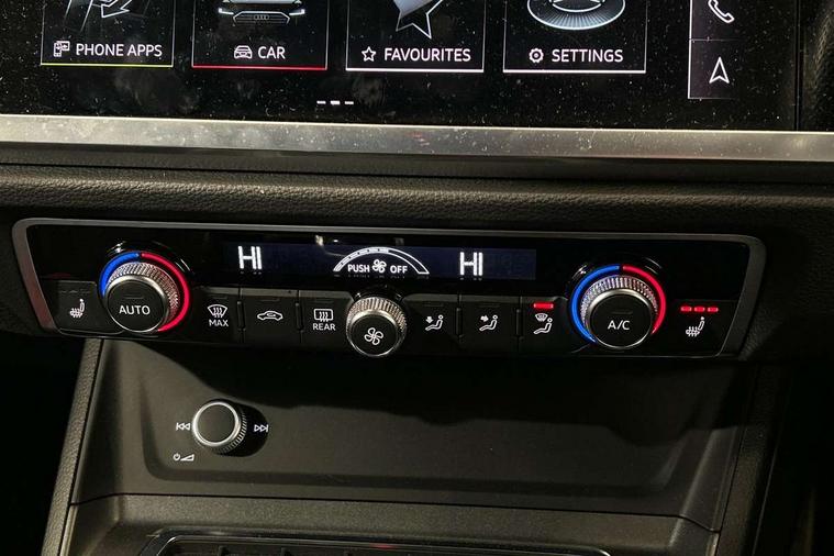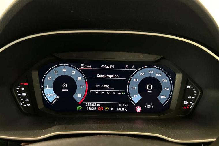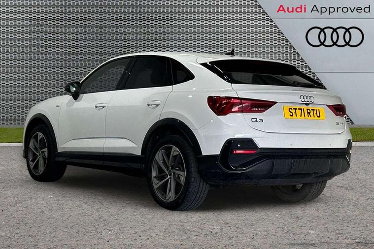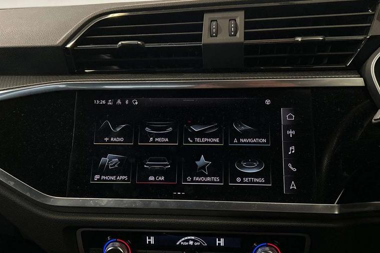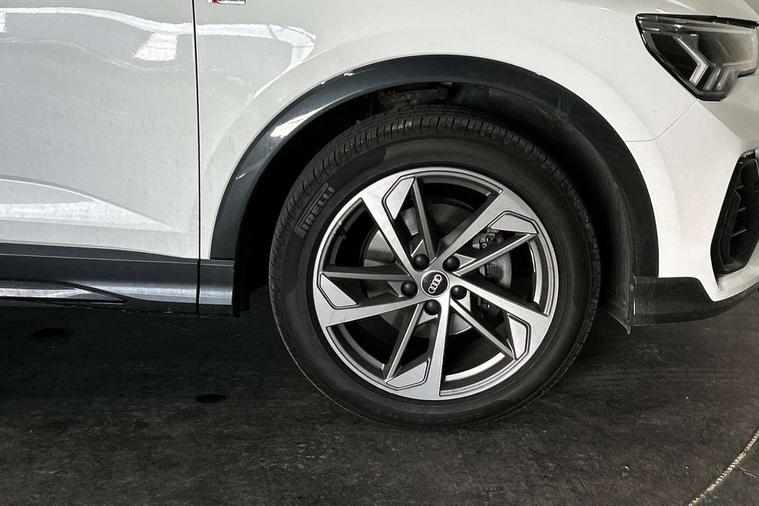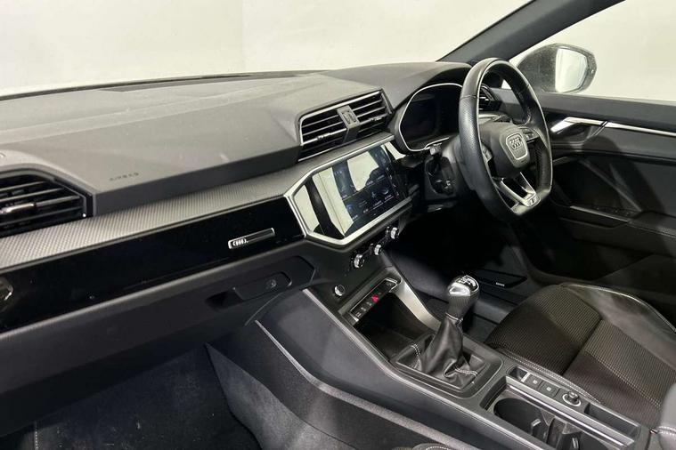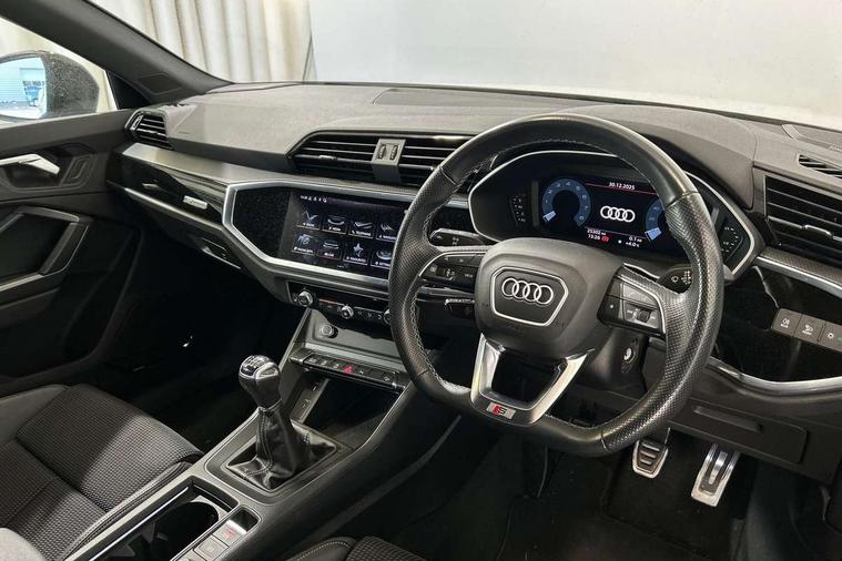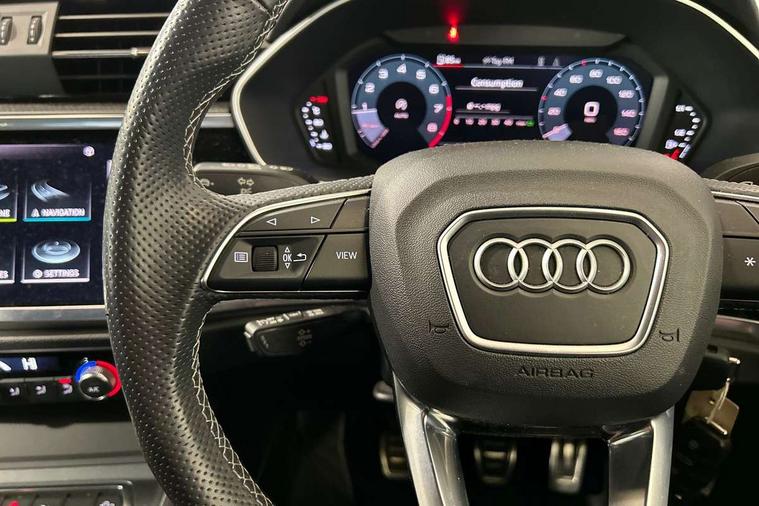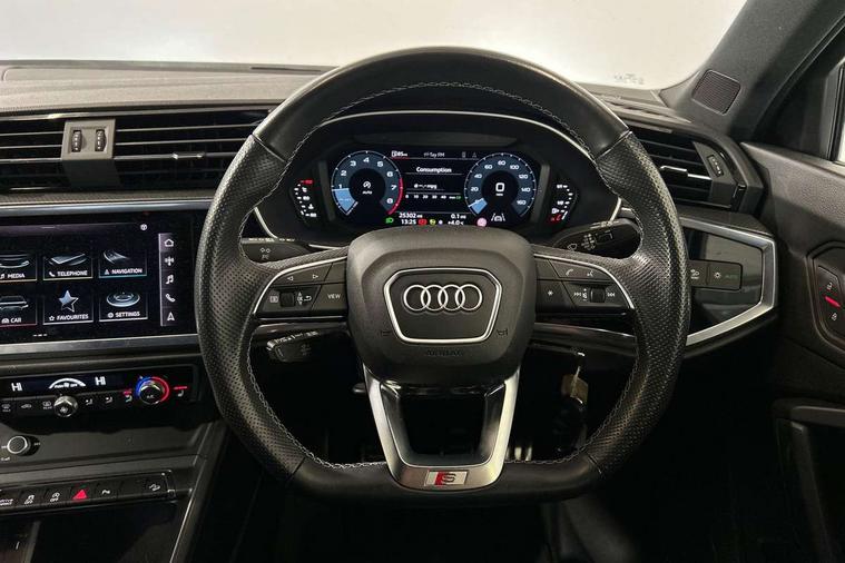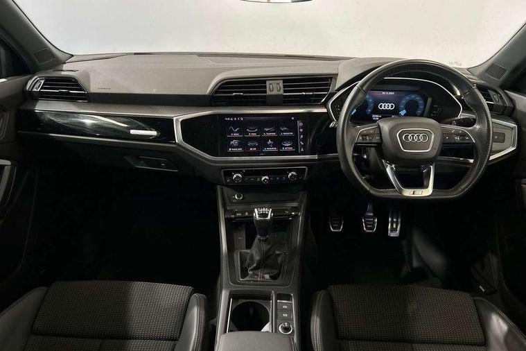 Amazon alexa Integration, Audi connect safety and service (e-call), Audi drive select, Audi lane departure warning, Audi Virtual Cockpit - 10.25" display, Bluetooth interface, Camera based traffic sign recognition, Cruise control + speed limiter, MMI Navigation Plus with high resolution 10.1 inch touchscreen colour display, Power operated tailgate, Progressive steering, Rear parking sensors, Service interval indicator, Smartphone interface includes wireless Apple carplay/Android Auto, Start stop system with recuperation, Voice control system with natural language interaction, Sports suspension, 2 USB-C ports with charge and data functions, 6 passive loudspeakers, DAB digital radio module, Acoustic windscreen, Auto dimming frameless rear view mirror, Black roof rails, Electrically folding, adjustable and heated door mirrors with integrated LED side indicators and kerb view function for passenger side, Front and rear electric windows, Front fog lights, Grille vertical bars in aluminium silver/Matt, High gloss black finish B and C pillars, LED headlights with LED daytime running lights and dynamic rear indicator, LED rear lights, Privacy glass dark tinted rear and rear-side windows (from B-pillar backwards), Rain and light sensors, Rear diffuser strip in matt titanium black, S line bumpers in contrasting Manhattan grey, 12V socket in rear centre console, 3 spoke flat bottomed multi-function leather sport steering wheel, 40:20:40 folding with manual adjustment for 60:40 forwards/backwards position and backrest angle, Adjustable rear seat bench/backrest with centre armrest and cupholder, Black cloth headlining, Dual zone electronic climate control, Front and rear black floor mats with contrast stitching in rock grey, Front and rear headrests, Front and rear roof module including reading lights, Front centre armrest, Glove compartment lighting, Height and reach adjustable steering wheel, Illuminated door sill trims with S logo, ISOFIX child seat mounting for front passenger with airbag deactivation and outer rear seat including top tether attachment point for outer rear seats, Luggage compartment light, Manual front seats with height adjustment, Perforated leather gearknob, Stainless steel luggage compartment sill finisher, Stainless steel pedals, Black styling pack - Q3, Non smoking pack - Q3, 3x3 point rear seatbelts, 6 airbags - Driver, front passenger, curtain and side windows, Audi pre-sense front with pedestrain and cyclist recognition, Electrically operated child locks on rear doors, Electromechanical parking brake, Electronic stabilisation control including ABS, ASR and EDL, Hill descent control, Hill hold assist, Pre sense basic, Seatbelt monitoring, Tyre pressure warning, Warning triangle and first aid kit, Anti theft alarm, Anti theft wheel bolts, Remote central locking, Detail dashboard around MMI touch colour display in glass look, black with surround in aluminium look, Leatherette door armrest, Piano black inlay,