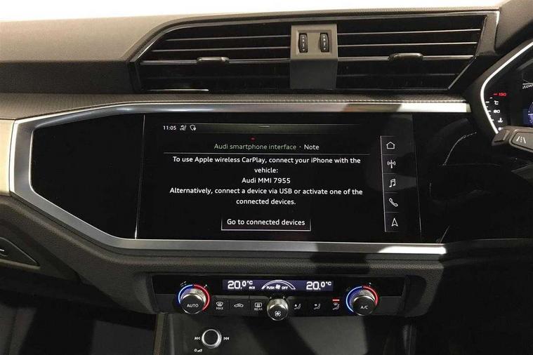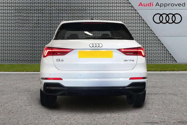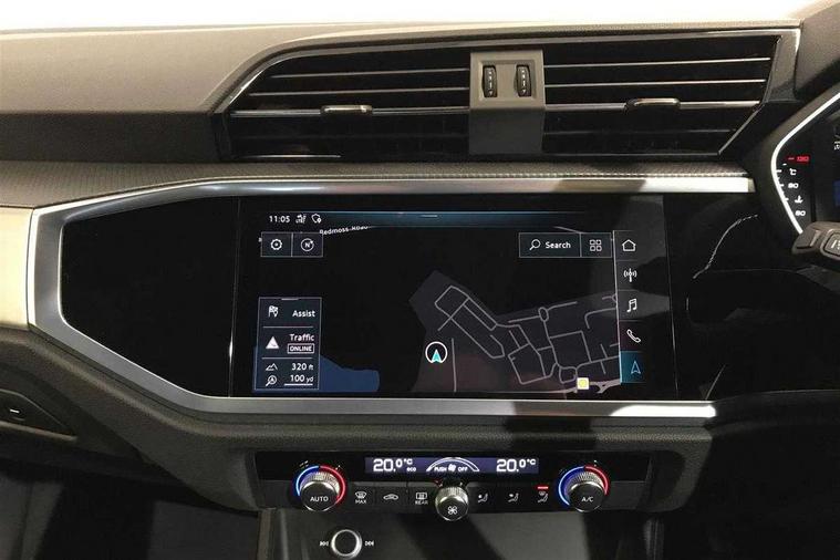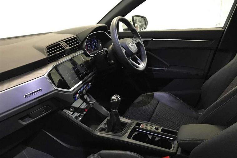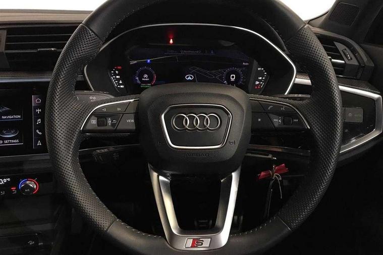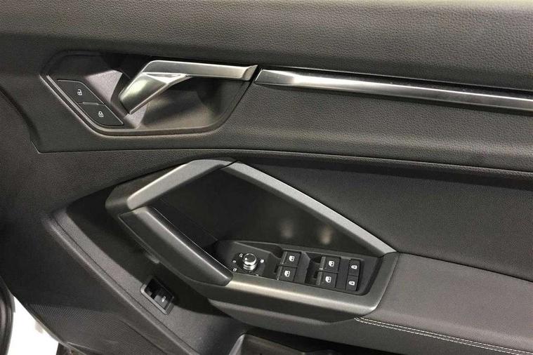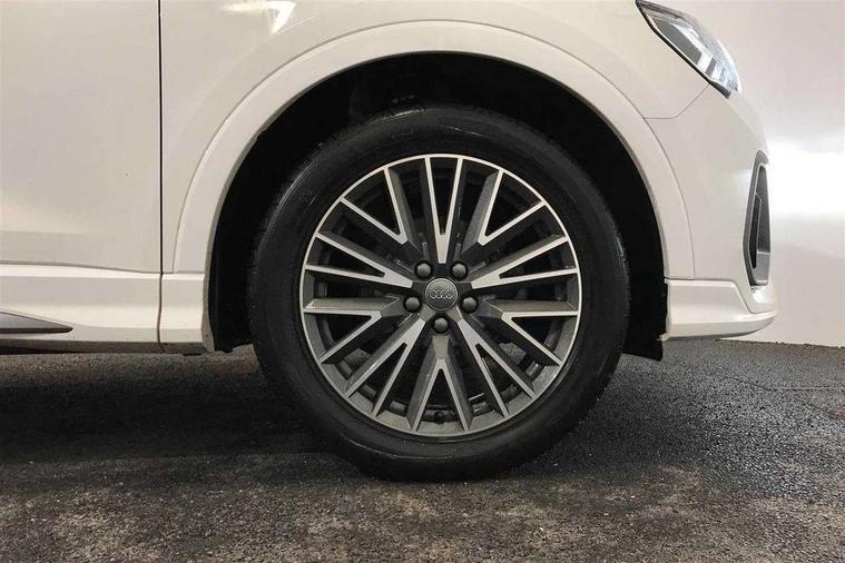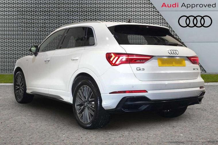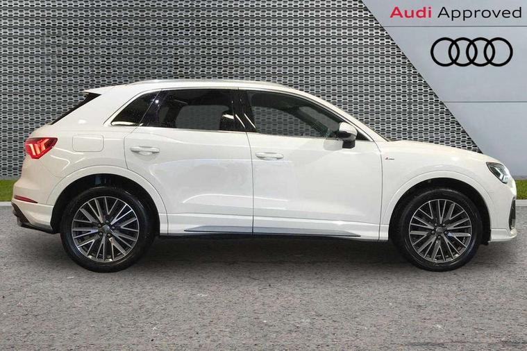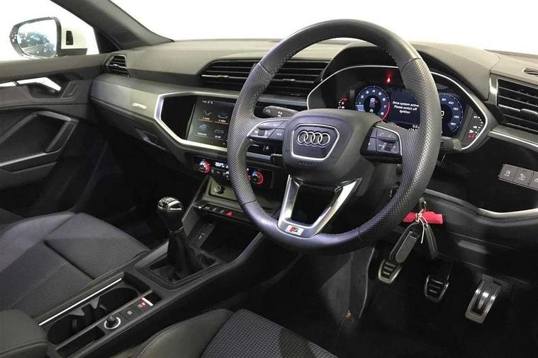 Amazon alexa Integration, Audi drive select, Audi lane departure warning, Audi Virtual Cockpit - 10.25" display, Bluetooth interface, Camera based traffic sign recognition, Cruise control + speed limiter, Legal emergency call, MMI Navigation Plus with high resolution 10.1 inch touchscreen colour display, Power operated tailgate, Progressive steering, Rear parking sensors, Service interval indicator, Smartphone interface includes wireless Apple carplay/Android Auto, Start stop system with recuperation, Voice control system with natural language interaction, Sports suspension, 2 USB-C ports with charge and data functions, 6 passive loudspeakers, DAB digital radio module, Acoustic windscreen, Aluminium roof rails, Aluminium window trim, Anthracite black radiator grille, Auto dimming frameless rear view mirror, Body colour front spoiler blade, Body coloured bumpers, Electrically folding, adjustable and heated door mirrors with integrated LED side indicators and kerb view function for passenger side, Front and rear electric windows, Front fog lights, Front side air inlets in matt platinum grey, Grille vertical bars in aluminium silver/Matt, High gloss black finish B and C pillars, LED Dynamic rear indicators, LED headlights with LED daytime running lights, LED rear lights, LED third brake light, Privacy glass dark tinted rear and rear-side windows (from B-pillar backwards), Rain and light sensors, Rear diffuser grille in grained matt black, Rear diffuser strip in matt anthracite black, Rear side wing doors, Rear wiper, S line badges on front wings, S Line front and rear bumpers, Side skirt insert in matt Platinium grey, Variable front intermittent wipers, 12V socket in rear centre console, 3 seat bench in 2nd row, 3 spoke leather multifunction steering wheel features S badging and grips in perforated leather with contrast stitching, 40:20:40 folding with manual adjustment for 60:40 forwards/backwards position and backrest angle, Adjustable rear seat bench/backrest with centre armrest and cupholder, Black cloth headlining, Dual zone electronic climate control, Front and rear black floor mats with contrast stitching in rock grey, Front and rear headrests, Front and rear roof module including reading lights, Front centre armrest, Glove compartment lighting, Height and reach adjustable steering wheel, Illuminated door sill trims with S logo, ISOFIX child seat mounting for front passenger with airbag deactivation and outer rear seat including top tether attachment point for outer rear seats, Luggage compartment light, Manual front seats with height adjustment, Perforated leather gearknob, Single front passenger seat, Stainless steel luggage compartment sill finisher, Stainless steel pedals, Ambient lighting pack - Q3, Non smoking pack - Q3, 3x3 point rear seatbelts, 6 airbags - Driver, front passenger, curtain and side windows, Audi pre-sense front with pedestrain and cyclist recognition, Electrically operated child locks on rear doors, Electromechanical parking brake, Electronic stabilisation control including ABS, ASR and EDL, Front seatbelt reminder, Hill descent control, Hill hold assist, Pre sense basic, Seatbelt monitoring, Tyre pressure warning, Warning triangle and first aid kit, Anti theft alarm, Anti theft wheel bolts, Immobiliser, Remote central locking, Aluminium look interior elements, Dark matt brushed aluminium inlay, Detail dashboard around MMI touch colour display in glass look, black with surround in aluminium look, Leatherette door armrest,