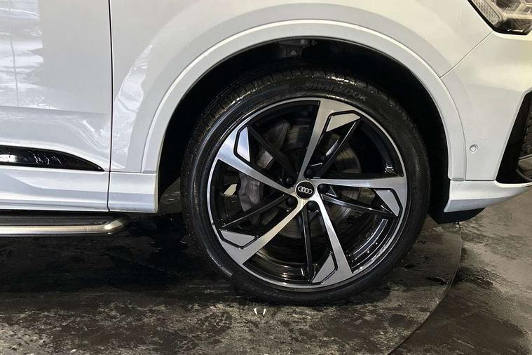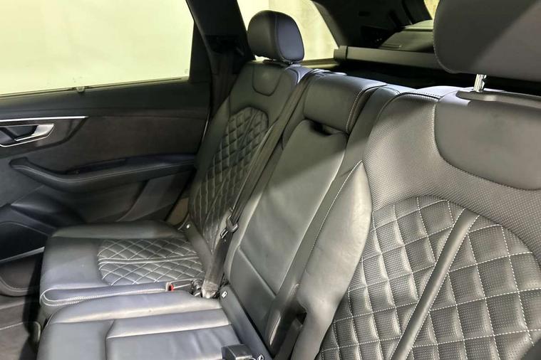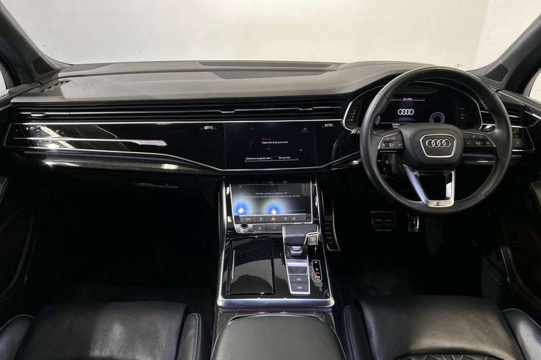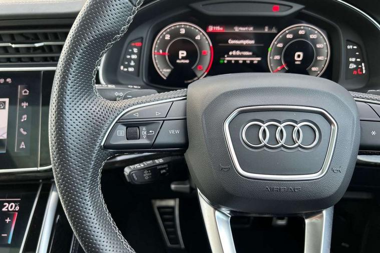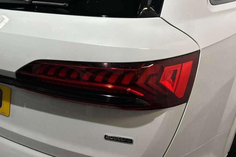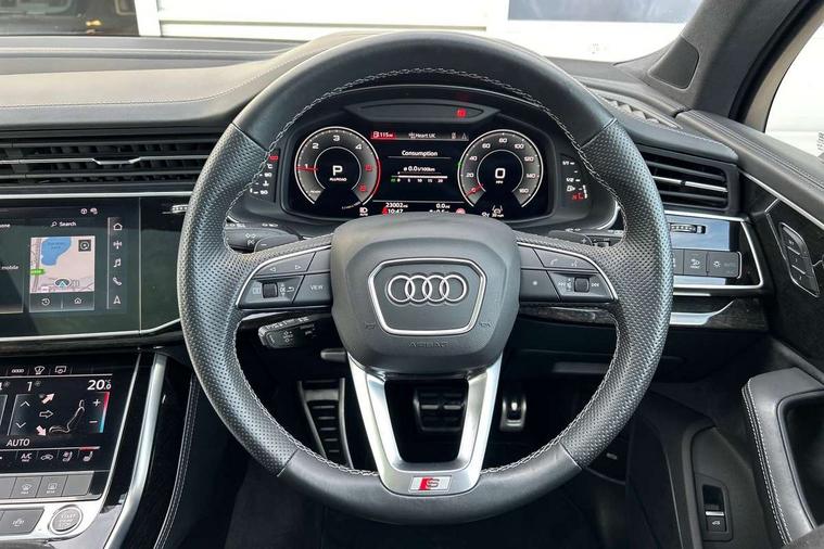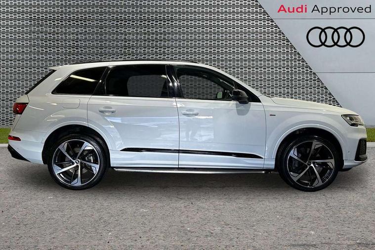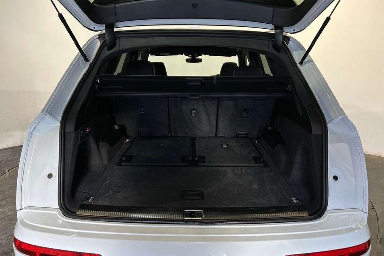 All wheel steering, Audi connect safety and service (e-call), Audi connect with Amazon Alexa Integration, Audi drive select (Auto, Comfort, Dynamic, Efficiency, Individual, Off-road and All road), Audi virtual cockpit - 12.3" high-resolution LCD display with fully customisable instrument cluster, Bluetooth interface, Camera based traffic sign recognition, Head up Display, MMI navigation plus with MMI touch screens includes 10.1" and 8.6" screens with haptic feedback, Natural voice recognition, Power door closure, Power operated tailgate, Smartphone interface includes wireless Apple carplay/Android Auto, Start/stop system, 48V Mild hybrid technology, Adaptive air sports suspension, Quattro all wheel drive with self locking centre differential, 2 USB-C ports with charging functionality in the rear, Audi music interface - front 2 USB-C ports with charger and data functions, DAB digital radio module, 3rd brake light, Audi Beam uses LEDs to project Audi logo onto the ground as you exit your Q7, Audi HD matrix LED headlights with Audi laser light + dynamic front and rear indicators, Auto dimming frameless rear view mirror, Black roof rails, Bumpers in contrast paint scandium grey finish includes door trim and wheel arch trim strips, inlays in door strip contain quattro embossing, Electric panoramic glass sunroof, Electrically adj heated/folding + automatically dimming exterior mirrors with memory + automatic kerb side function for passenger side exterior mirror, Gloss black finish for exterior Audi rings and Q7 logos without engine badging, Headlight washers, Heat insulating glass in windshield, Integrated LED indications in door mirrors, LED daytime running lights, LED rear tail lights, Privacy glass - dark tinted rear and rear side windows from B-pillar backwards, Rear side wing doors, Rear wiper, Side running boards, 2 seat bench in 3rd row, 3 seat bench in 2nd row, 3 spoke heated leather multi-function steering wheel including paddle shift, 4 zone deluxe automatic climate control, 7 seat layout with ISOFIX points for the front passenger seat and rear passenger seat, Black dinamica headlining, Comfort front centre armrest, Double sun visors with illuminated vanity mirrors, Electric adjustable front seats/backrest bolsters, lumbar support, memory functionality, Folding rear seats, Front head restraints, Front/rear floor mats, Heated front and outer rear seats for second row, Illuminated door sill trims with S logo, Luggage compartment cover, Manual sunblind for the rear side windows and manual sunblind for the rear window, Rear head restraints, Seat ventilation and massage function in the front, Single front passenger seat, Stainless steel pedals, Valcona leather upholstery with front super sport seat S embossed logo, Anthracite black styling pack - Q7/SQ7, City assist pack - Q7, Comfort and sound pack with Bang + Olufsen premium sound system - Q7, Extended leather pack - Q7, Tour pack with Adaptive cruise assist - Q7, 3 point seatbelts on all rear seats, Audi pre sense front, Child locks on rear doors, Driver and front passenger, front side and curtain airbags, Electromechanical parking brake, Electronic Stabilisation Control (ESC) including ABS, ASR and EDL, Extended pedestrian protection measures, Hill hold assist, Seatbelt monitoring, Tyre pressure loss indicator, Warning triangle and first aid kit, Anti theft alarm, Anti-theft wheel bolts and wheel loosening detection, Remote central locking, Polished oak trim with grey finish inlay, Tool kit, Tyre repair kit,