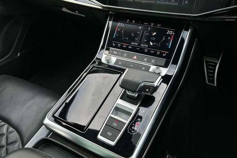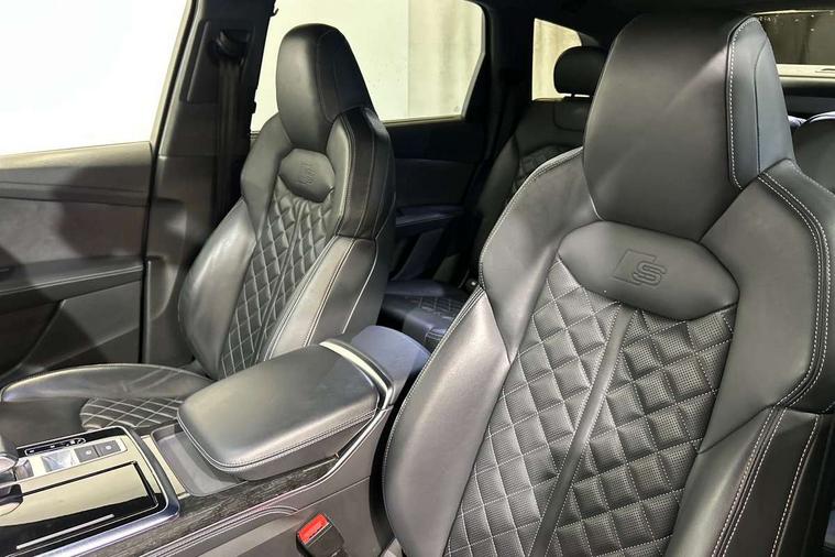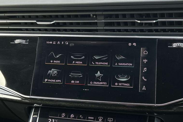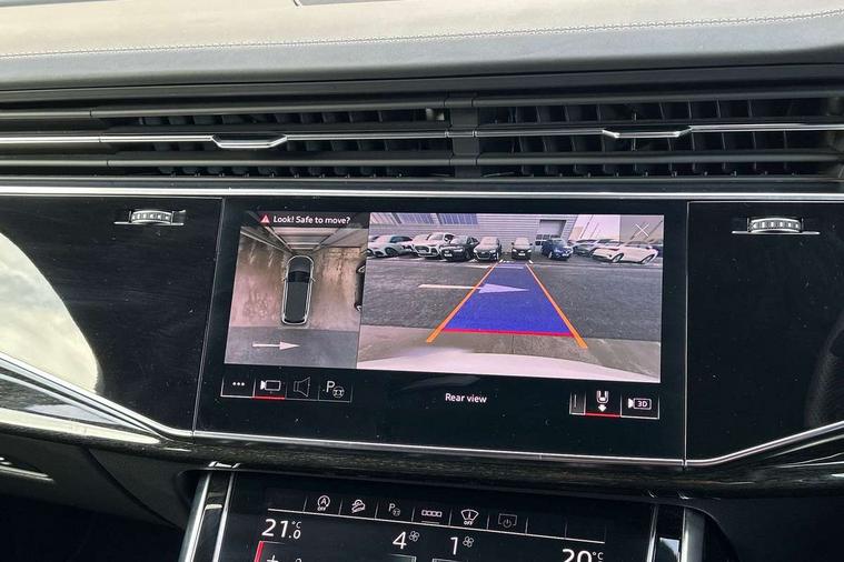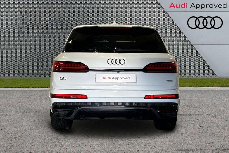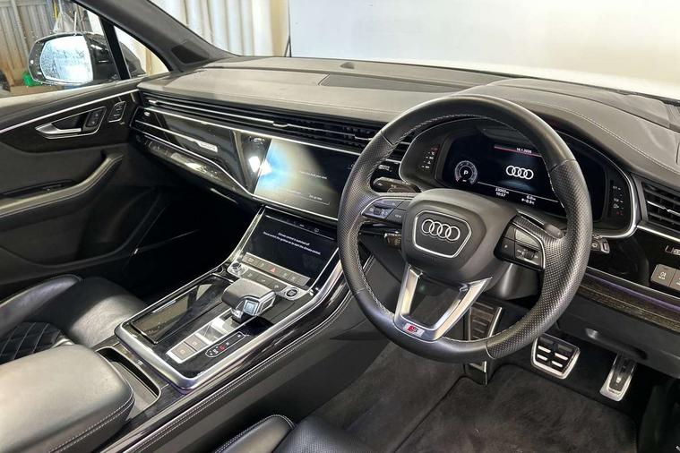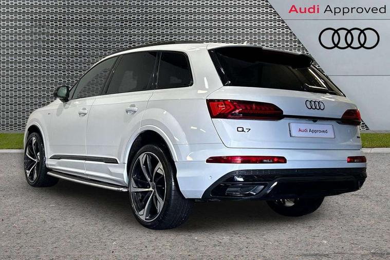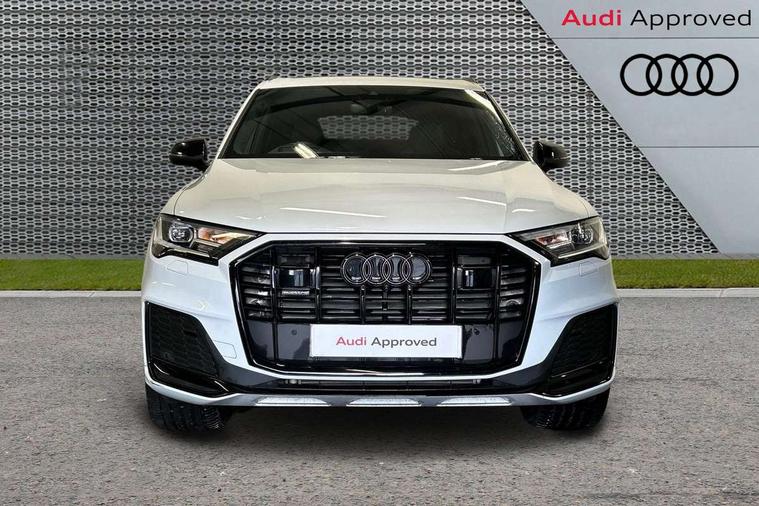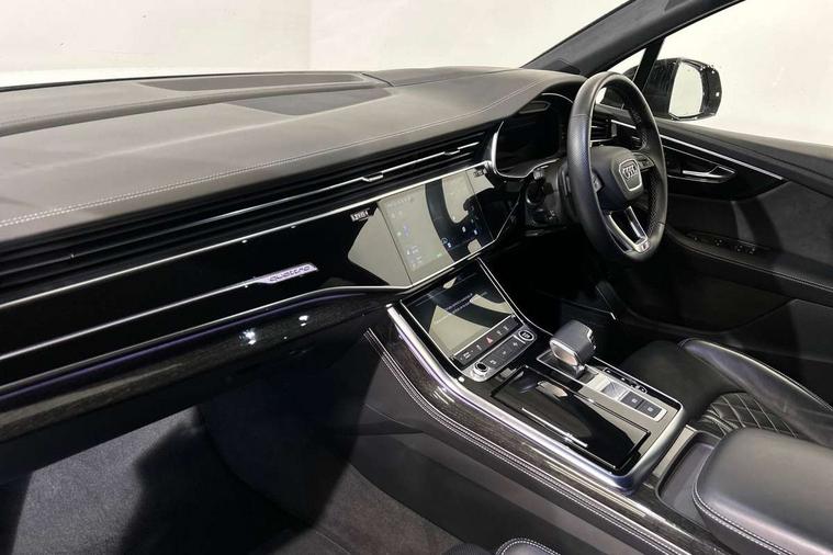 All wheel steering, Audi connect safety and service (e-call), Audi connect with Amazon Alexa Integration, Audi drive select (Auto, Comfort, Dynamic, Efficiency, Individual, Off-road and All road), Audi virtual cockpit - 12.3" high-resolution LCD display with fully customisable instrument cluster, Bluetooth interface, Camera based traffic sign recognition, Head up Display, MMI navigation plus with MMI touch screens includes 10.1" and 8.6" screens with haptic feedback, Natural voice recognition, Power door closure, Power operated tailgate, Smartphone interface includes wireless Apple carplay/Android Auto, Start/stop system, 48V Mild hybrid technology, Adaptive air sports suspension, Quattro all wheel drive with self locking centre differential, 2 USB-C ports with charging functionality in the rear, Audi music interface - front 2 USB-C ports with charger and data functions, DAB digital radio module, 3rd brake light, Audi Beam uses LEDs to project Audi logo onto the ground as you exit your Q7, Audi HD matrix LED headlights with Audi laser light + dynamic front and rear indicators, Auto dimming frameless rear view mirror, Black roof rails, Bumpers in contrast paint scandium grey finish includes door trim and wheel arch trim strips, inlays in door strip contain quattro embossing, Electric panoramic glass sunroof, Electrically adj heated/folding + automatically dimming exterior mirrors with memory + automatic kerb side function for passenger side exterior mirror, Gloss black finish for exterior Audi rings and Q7 logos without engine badging, Headlight washers, Heat insulating glass in windshield, Integrated LED indications in door mirrors, LED daytime running lights, LED rear tail lights, Privacy glass - dark tinted rear and rear side windows from B-pillar backwards, Rear side wing doors, Rear wiper, Side running boards, 2 seat bench in 3rd row, 3 seat bench in 2nd row, 3 spoke heated leather multi-function steering wheel including paddle shift, 4 zone deluxe automatic climate control, 7 seat layout with ISOFIX points for the front passenger seat and rear passenger seat, Black dinamica headlining, Comfort front centre armrest, Double sun visors with illuminated vanity mirrors, Electric adjustable front seats/backrest bolsters, lumbar support, memory functionality, Folding rear seats, Front head restraints, Front/rear floor mats, Heated front and outer rear seats for second row, Illuminated door sill trims with S logo, Luggage compartment cover, Manual sunblind for the rear side windows and manual sunblind for the rear window, Rear head restraints, Seat ventilation and massage function in the front, Single front passenger seat, Stainless steel pedals, Valcona leather upholstery with front super sport seat S embossed logo, Anthracite black styling pack - Q7/SQ7, City assist pack - Q7, Comfort and sound pack with Bang + Olufsen premium sound system - Q7, Extended leather pack - Q7, Tour pack with Adaptive cruise assist - Q7, 3 point seatbelts on all rear seats, Audi pre sense front, Child locks on rear doors, Driver and front passenger, front side and curtain airbags, Electromechanical parking brake, Electronic Stabilisation Control (ESC) including ABS, ASR and EDL, Extended pedestrian protection measures, Hill hold assist, Seatbelt monitoring, Tyre pressure loss indicator, Warning triangle and first aid kit, Anti theft alarm, Anti-theft wheel bolts and wheel loosening detection, Remote central locking, Polished oak trim with grey finish inlay, Tool kit, Tyre repair kit,