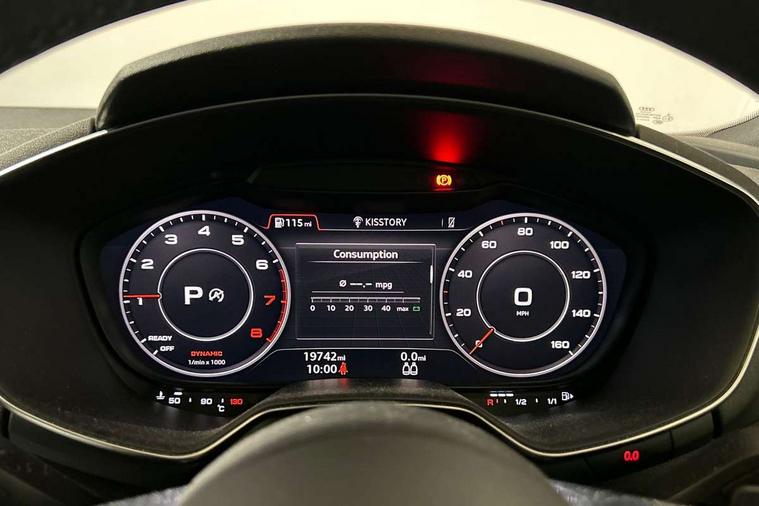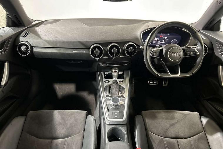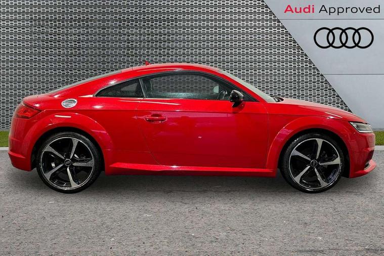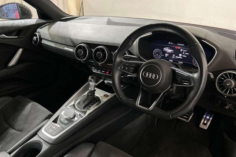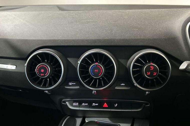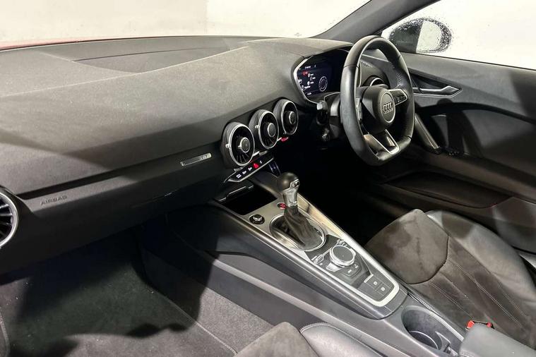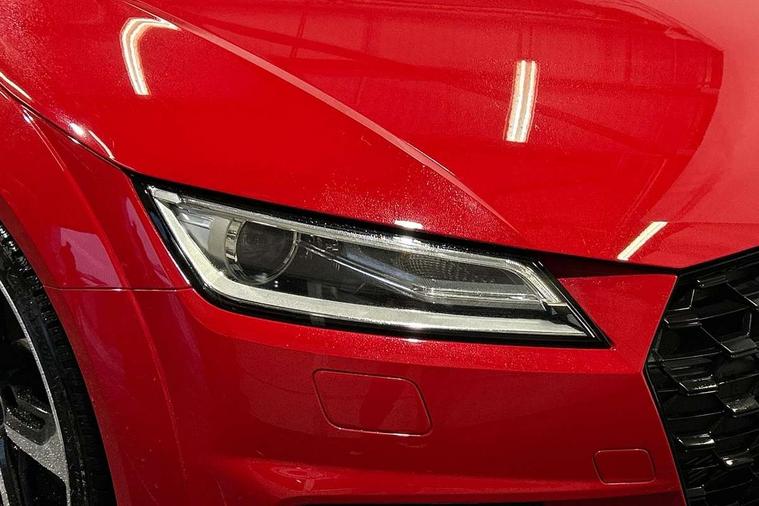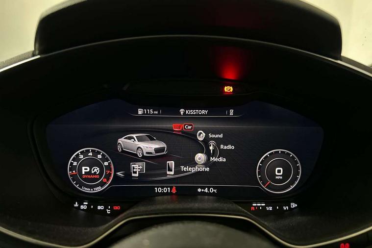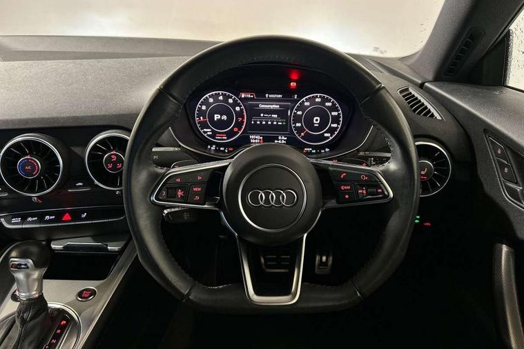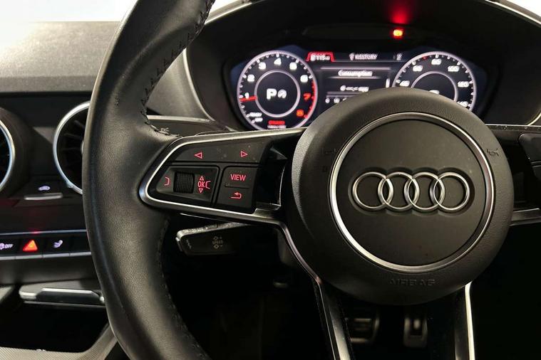Audi drive select with 4 Pre configured modes, Audi smartphone interface, Audi virtual cockpit - 12.3" high-resolution LCD display with fully customisable instrument cluster, Cruise control + speed limiter, Emergency call service, MMI touch panel, Mobile phone preparation with bluetooth interface, Progressive power assisted steering, Service interval indicator, Start/Stop system with energy recuperation, TP memo, Sports suspension, AM/FM radio, Bluetooth audio streaming, DAB Digital radio, MMI Radio with CD player and SD/XC card slot, Auto dimming rear view mirror, Electric folding door mirrors, Electric front windows, Electrically adjustable and heated door mirrors with integrated LED side indicators, Front fog lights, Green tinted heat insulating glass, LED 3rd brake light, Light and rain sensors, Rear boot, Retractable rear boot spoiler, Sunband for windscreen, Xenon headlights with LED daytime running lights with automatic headline range control + LED rear lights, brake lights and rear indicators, 12V socket, 2 rear seats, 3 spoke flat bottomed high multi-function leather sport steering wheel with gearshift paddles, Alcantara/Leather upholstery includes seat centre panels, door trim inserts in black Alcantara with side bolsters, head restraints in black leather, Aluminium door sill trims, Front centre armrest, Front passenger seat, Front sports seats, Heated front seats, Height adjustable driver's seat, Height adjustable front head restraints, Height/reach adjust steering wheel, ISOFIX child seat mounting for front passenger seat with airbag deactivation, Rear head restraints, Rear top tether child seat ISOFIX attachment, Split folding rear seat, Black styling pack - TT, Non smoking pack - TT/TT RS, 3 point front seat belts, ABS, ASR traction control, Curtain airbags, Driver and front passenger airbag with front passenger airbag deactivation, EDL traction control, Electromechanical parking brake, ESP, First aid kit, Front side airbags, Head airbags, Hill hold assist, Seatbelt warning, Tyre pressure loss indicator, Warning triangle, Anti theft alarm, Anti theft wheel bolts, Immobiliser, Keyless Go, Remote central locking, Aluminium design inlays, Tool kit, Tyre repair kit,