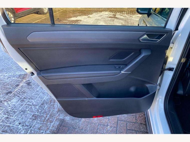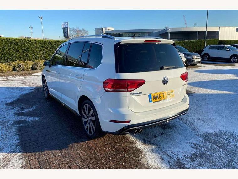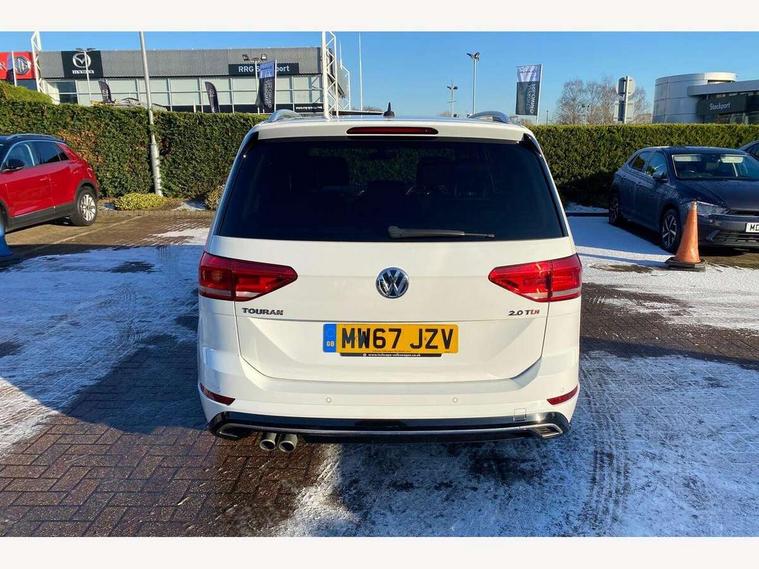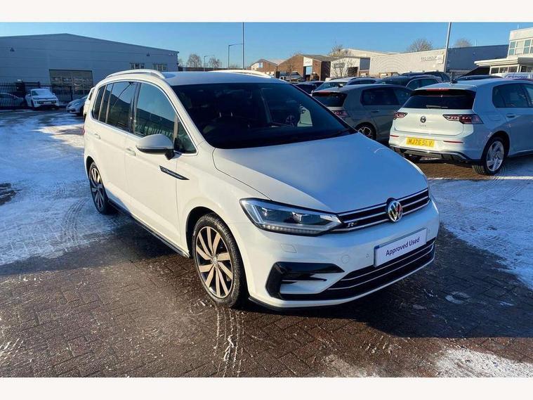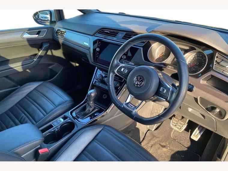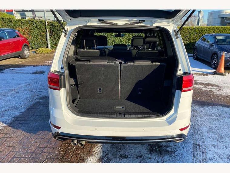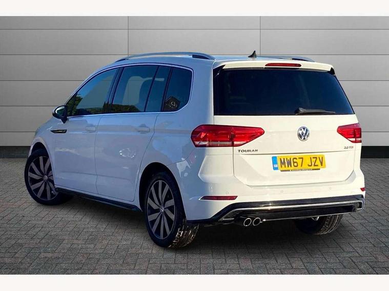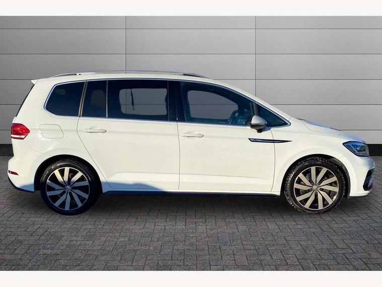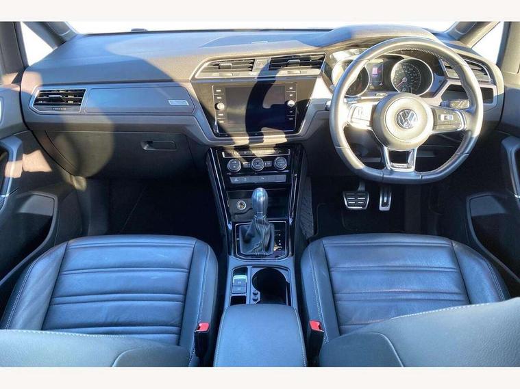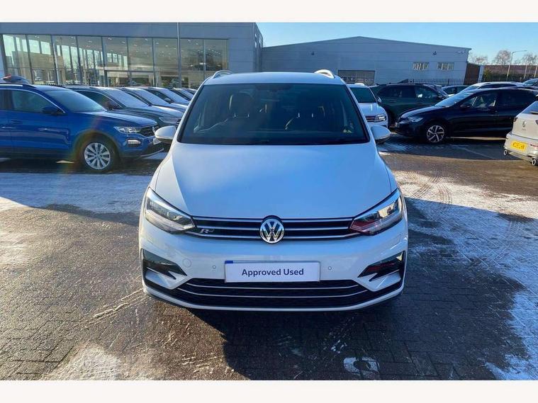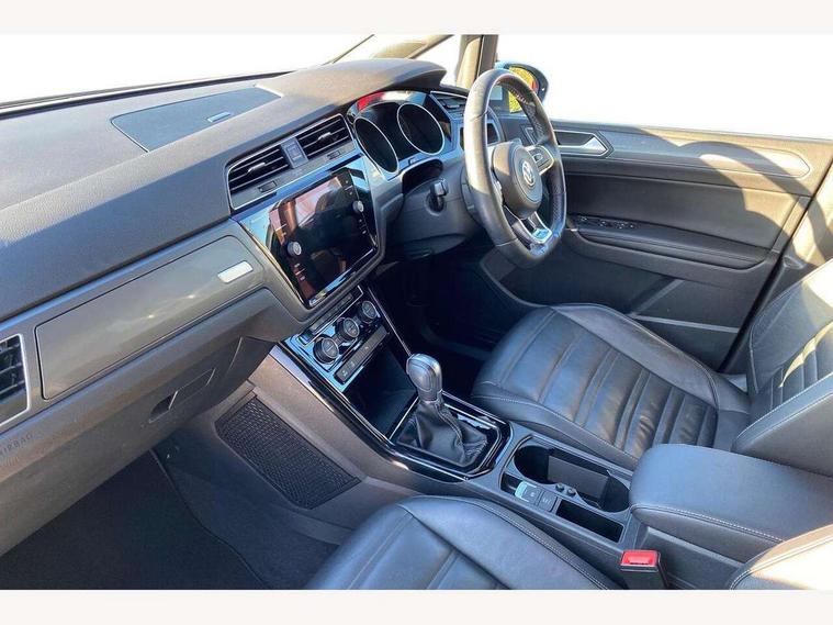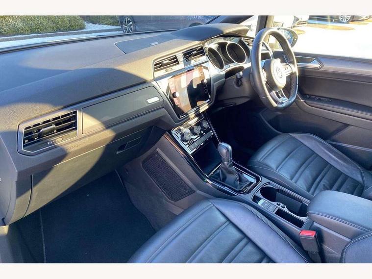 Adaptive cruise control, App-Connect, Audible lights on warning, Driver alert system, Driver profile selection, External temperature gauge, Flat tyre indicator, Speed limiter, Speed sensitive power steering, Trip and service interval display, Diesel particulate filter, 8 Speakers, DAB Digital radio, Multi device interface, SD card slot, Aerial integrated into side window, Auto dimming rear view mirror/rain sensor, Automatic coming/leaving home lighting function, Automatic headlights, Body colour door handles, Body colour door mirrors with integral indicators, Chrome fog light surround, Chrome lower front bumper insert, Chrome trimmed front air intake surrounds, Chrome trimmed radiator grille louvre inserts, Chrome trimmed side windows, Electric folding door mirrors, Electric heated + adjustable door mirrors, Front and rear electric windows, Green tinted heat insulating glass, Heat insulated tinted glass 65% light absorbing from B pillar back, Rear wash/wipe with intermittent wipe setting, Silver roof rails, Tailgate wiper- reverse gear activation, Windscreen wipers/ intermittent wipe + 4 position delay, 12V power point for Row 2, 12V socket in luggage compartment, 2 head restraints in 3rd row, 2 individual fold flat 3rd row seats, 2 three point seatbelts in 3rd row, 2nd row centre seat converts into table, 3 head restraints in 2nd row, 3 single slide/fold/removable 2nd row seats, 3 Zone electronic climate control with automatic air recirculation, 3x3 point seatbelts on 2nd row with height adjust on outer seats, 4 boot load lashing points, 4 way adjustable front head restraints, Aluminium kick plate, Ambient lighting in door trim, Black roof lining, Brushed stainless steel pedals and footrest, Centre armrest on rear seat bench, Driver and front passenger under seat drawer, Dust/pollen filters, Folding front passenger seat, Front and rear reading lights, Front centre armrest with storage compartment, Front cupholders x 2, Front height/lumbar adj comfort seats, Front passenger seat height adjust, Front seat storage pockets, Front seatback folding tables, Front/rear floor mats, Height adjustable driver's seat, Height/reach adjust steering wheel, Illuminated sun visor mirrors, Interior light with delay, Isofix on 2nd row outer seats, Isofix on 3rd row seats, Leather gear knob and handbrake grip, Leather multifunction steering wheel, Lockable/illuminated glovebox, Luggage compartment lighting, Multi storage in passenger/luggage areas, Multi-function centre console with storage facilities, Retractable luggage cover, Split folding rear seat backrests, Storage bins on all doors, Storage in roof console, Convenience Pack - Touran, Mirror pack - Touran, R line styling pack - Touran, 3 point height adjustable front seatbelts, ABS, Automatic post collision braking system, Door open warning reflectors, Driver/Front Passenger airbags, Driver/Passenger whiplash optimised head restraints, Drivers knee airbag, EDL + ASR, Electrically operated child locks on rear doors, Electronic parking brake, ESP, Front and rear (row 2) curtain airbags, Front assist including city emergency braking, Front seat side impact airbags, Hill hold control, Hydraulic Brake Assist (HBA), Loose wheel warning function, Manual passenger airbag deactivation function, Pre crash system, Seatbelt warning lamp and buzzer, Traction control, Warning triangle, Alarm, Electronic engine immobiliser, Remote central locking with 2 remote folding keys, Black lead grey decorative inserts dash and door panel, Embroidered emblems to headrestraints, 18" Marseille alloy wheels with mobility tyres and anti-theft wheel bolts, Tyre repair kit,