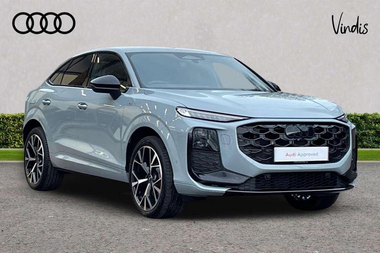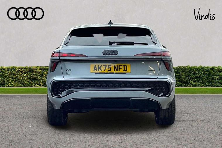 Adaptive cruise assist plus, Audi connect emergency call and service, Audi connect remote and controls, Audi drive select (Balanced/individual, efficiency, comfort, dynamic and Offroad+), Audi drive select for suspension with damper control, Audi side assist with exit warning and rear cross traffic assist, Audi virtual cockpit plus - 11.9" display, Bluetooth interface, Camera based traffic sign recognition, Driver attention and fatigue monitor with driver monitoring, Emergency assist, Front cross traffic assist, Head up Display, In-car-office assist, Panoramic curved display with 12.8" MMI navigation plus and MMI touch, Phonebox light with wireless charging, Progressive steering, Projection of a black ice warning, Smartphone interface includes wireless Apple carplay/Android Auto, Start/stop system, Surround view cameras, Swerve assist and turn assist, Traffic sign based speed limiter, Trained parking, Voice control system with natural language interaction, Petrol Particulate Filter, Sound actuator for interior drive sound, Suspension with damping control, 2 USB-C ports with charge and data functions, DAB digital radio module, SONOS premium sound system, USB interfaces with higher charging capacity, Acoustic glass for front door windows, Acoustic windscreen, Advanced dynamic light scenario of the coming home/leaving home function, All weather light, Aluminium window trim, Audi Q3 sportback lettering on the B-pillars, Auto dimming rear view mirror, Automatic dynamic headlight range control, Automatically dimming exterior mirrors with memory function, Contrasting finish in volcano grey, Cornering light, Digital daytime running lights with a choice of 4 digital light signatures, Digital matrix LED headlights, Digital OLED rear lights, Dipped beam, Dynamic indicators, Electrically folding, adjustable and heated door mirrors with integrated LED side indicators and kerb view function for passenger side, Full paint finish, Headlight cleaning system, High resolution main beam, Illuminated door sills with aluminium inserts at the front with S logo, Intersection light, Lane light with side assist and direction indicator, LED third brake light, Loading sill protector in stainless steel, Main beam assist, Manoeuvring light, Motorway light, Orientation light with lane departure warning, Position light, Privacy glass - dark tinted rear window, rear door and side windows, Projection light in the exterior mirrors - Projects a graphic element onto the ground, Q3 badging on the rear, Rain and light sensors, Rear side wing doors, Rear window, rear door windows and rear side windows in clear glass, Rear wiper, Sports bumpers, Turning light, 3 seat bench in 2nd row, 3 spoke heated flat top and bottomed leather multi function sport steering wheel with gear shift paddles and "S" badging, 3-zone deluxe automatic air conditioning, 4 way lumbar support for the front seats - electric with horizontal and vertical adjustment in four directions, Black carpet mats, Black cloth headlining, Electrically adjustable front seats with memory function for driver's side, Front and rear floor mats, Front and rear headrests, Front centre armrest, Heated front seats, Height and reach adjustable steering wheel, Interior storage compartment, Luggage compartment lid, electrically opening and closing, Microfibre upholstery with rhombus pattern and S emblem + front sports seats, Rear seat bench plus with split folded 40:20:40, Single front passenger seat, Stainless steel pedals, Steering wheel operating unit, gloss black, Storage compartment in front centre console, Ambient lighting package pro - Q3, Black styling package - Q3 Sportback, Function pack - Q3, 3 point seat belts in front, with pretensioner and electric height adjustment, 3x3 point rear seatbelts, Convenience key with safelock, Downhill assist, Driver and front passenger airbag with passenger airbag deactivation, Electromechanical parking brake, Electronic stabilisation control including ABS, ASR and EDL, First aid kit with warning triangle and high visibility vests, Front emergency brake assist, Front side airbags with head airbags and interaction airbag, Hill hold assist, i - Size child seat mounting on the front passenger side and i - Size and top tether on the outer rear seats, Power operated child locks, Proactive occupant protection, front, side and rear, Red brake callipers, front and rear, Seatbelt monitoring, Tyre pressure loss indicator, Anti theft wheel bolts, Remote central locking, Thatcham approved category 1 anti theft alarm, Anthracite american whitewood natural inlay, Interior elements in dinamica microfibre, Interior trims in aluminium look, 20" 5-spoke tripod design alloy wheels with gloss turned finish in metallic black, Tool kit and Jack, Tyre repair kit,