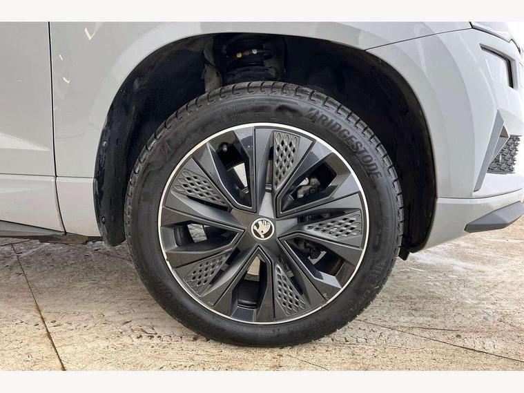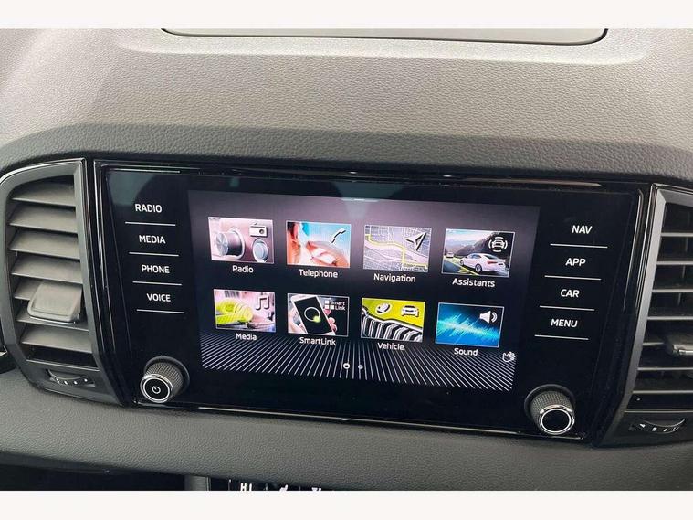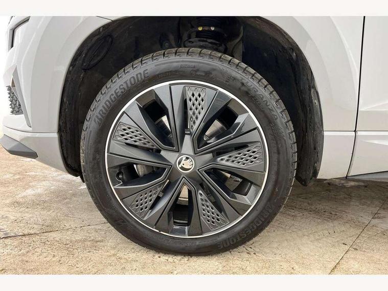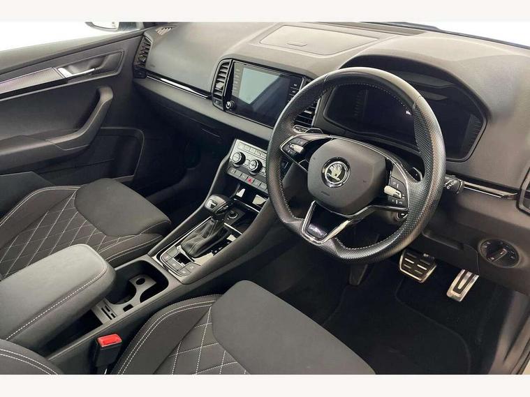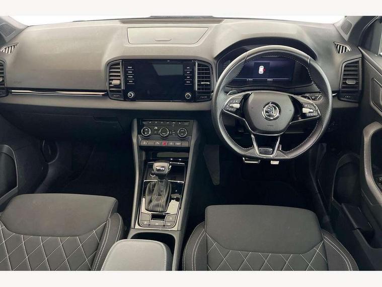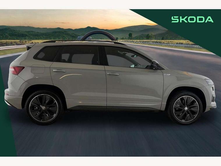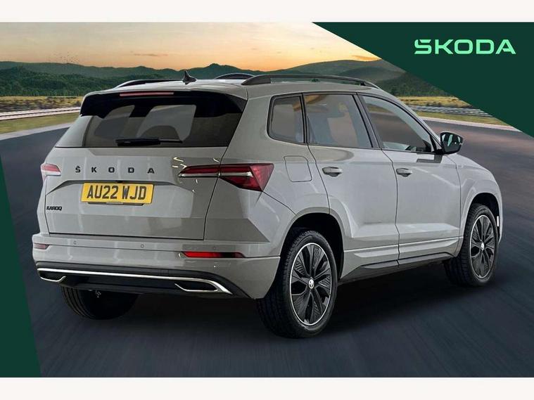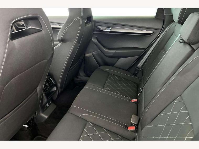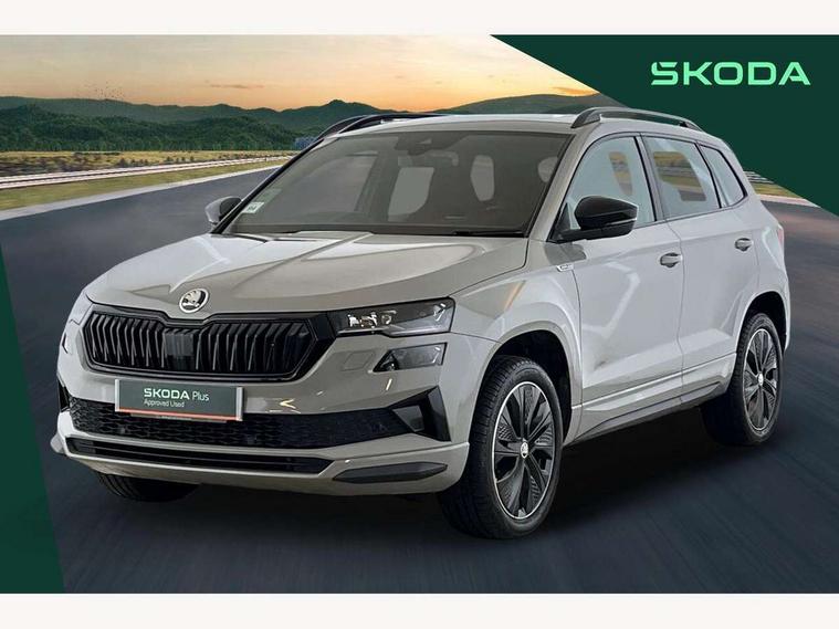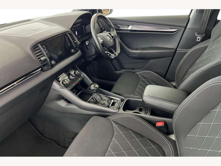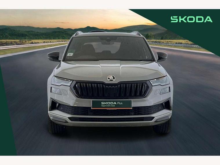Care connect, Driver fatigue sensor, Emergency services call system, Multifunction colour trip computer, Outside temperature gauge, Service interval indicator, SmartLink wireless for Apple and wired for Android, Start/stop system with regenerative braking, USB C Port x 2 in front centre console, Virtual pedal with electrically operated boot door, 8 Speakers, DAB radio with Bluetooth, USB connection, Acoustic glass, Aero front windscreen wipers with intermittent function, Auto dimming rear view mirror with light and rain sensors, Automatic headlight control system, Black door mirrors, Black electric window control buttons, Black radiator grille, Black roof rails, Body colour door handles, Body coloured bumpers, Electric front and rear windows with child proof lock, Front door steps with SportLine logo, Heated rear windscreen, LED daytime running lights, LED rear lights with high functionality welcome effect and dynamic indicators, Light assistant (coming/leaving home/tunnel light), Panoramic sliding sunroof, Privacy glass, Protective door side sills in body colour, Rear diffuser, Rear side wing doors, Rear spoiler, Rear wiper, Safety reflectors on front doors, Skoda lettering on tailgate in black, Sportline badge on front fender, Sportline decorative inserts with badging, Sports front and rear bumpers, 1.5 litre bottle holders in driver and front passenger door panels, 12V socket in boot, 12v socket in front centre armrest with storage compartment and rear air vents, 2 Folding hooks and nets in boot, 3 rear height adjustable headrests, 3 seat bench in 2nd row, 3 spoke leather sports multifunction steering wheel and silver stitching with gear shift paddles, 4 foldable roof handles with rear coat hooks, Black floor carpet, Black roof headlining, Chrome inner door handles, Double sided boot floor, Foldable hooks in the boot, Front head restraints, Height adjustable front three point seats belts with tensioners, Height/reach adjust steering wheel, Ice scraper, Illuminated and cooled glovebox, Illuminated luggage compartment, Isofix child seat preparation outer rear, Manual lumbar support for front seats, Pen holder, Pollen filter, Rear reading lights, Rear seats fixed folding and divided 60:40, Retractable parcel shelf attachable to tailgate, Rubbish bin door, Safety vest holder, Single front passenger seat, Solid rear boot cover, Storage box in upper central dashboard closed, Sunvisors with illuminated vanity mirrors, Textile floor mats, Titan black interior ceiling, Umbrella under passenger seat, Welcome animation with sportline logo, Light Pack - Karoq, Parking pack - Karoq, Airbags - Front side, head, knee and curtain, Automatic door unlocking in case of crash, Automatic fuel cut off in case of crash, Child locks on rear doors, Driver airbag, Electronic parking brake with auto hold function, Emergency rear braking signal, ESC including ABS, MSR, ASR, EDS, HBA, DSR, RBS, MKB and traction control, Front assist radar scanning of the space in front of the car with automatic braking, Hill hold control, Passenger airbag with switch-off function, Pedestrian monitor, Seatbelt reminder signalisation and pretensioner for all seats, Three point seatbelts rear, Two tone horn, Tyre pressure display, Tyre pressure monitor, Alarm with interior monitoring, back up horn and tilt sensor with safe function, Electronic engine immobiliser, Keyless entry and start/stop system with SAFE system, Remote central locking with 2 remote folding keys, Black air vent surround, Black centre console, Satin black dashboard, Satin black door trim, 18" Procyon alloy wheels in black, Anti-theft wheel bolts protection, Matt black aero hub caps, Storage on wheel cover,