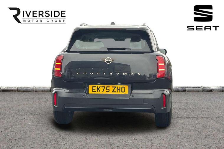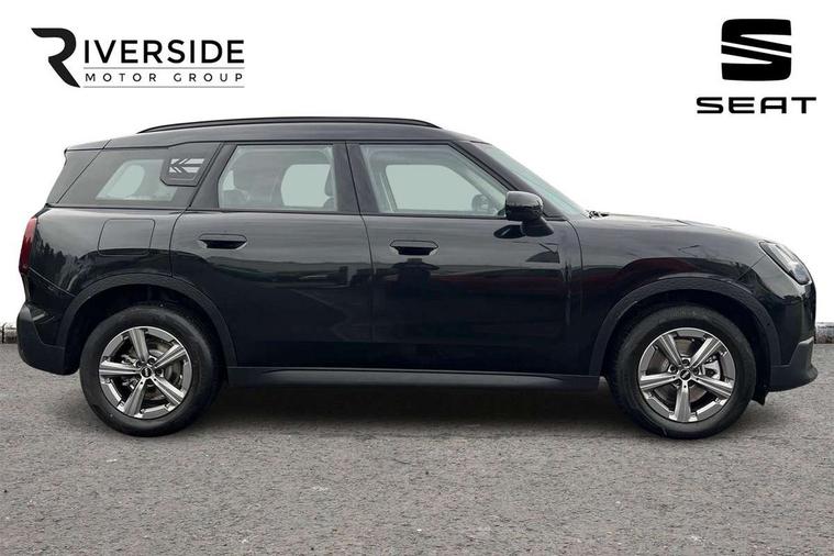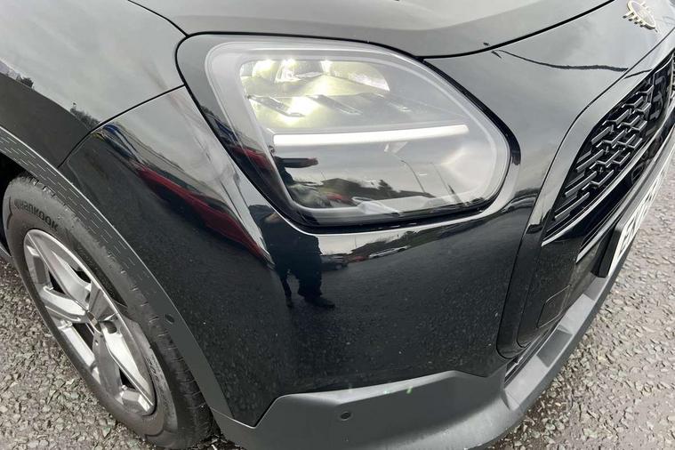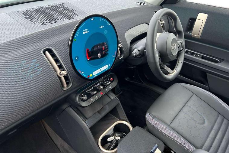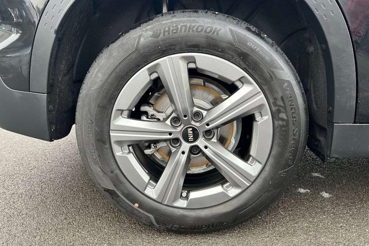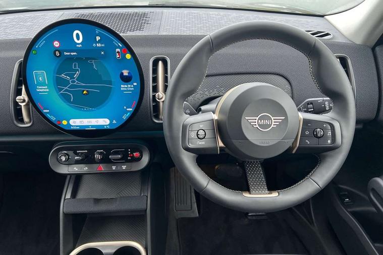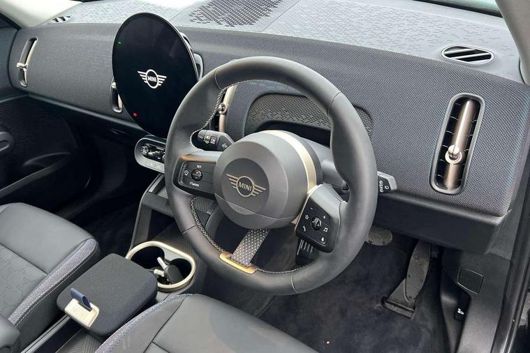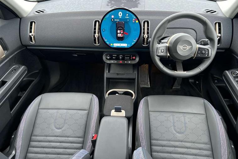 Bluetooth connection, Circular OLED Screen, Compatible mobile phone bluetooth with audio streaming, Cruise Control (DCC), Digital dashboard display, Driving assistant, E-call, Electro-mechanical speed dependant steering assistance, MINI Experience Modes, Mini navigation system, MINI TeleServices, Parking assistant in camera and ultrasound based assistance system, rear view camera, parking aid and distance control, Auto transmission with Paddles, Larger capacity fuel tank, 6 speakers, DAB Digital radio, Personal eSim, Auto tailgate, Electric adjustable heated door mirrors, Front and rear electric windows, Heated rear window, LED daytime running lights, LED Headlights, LED rear lights, LED third brake light, Rain sensor with auto headlights, Rear side wing doors, Rear window wiper, Roof rails, 3 seat bench in 2nd row, 60/40 split rear bench seat, Auto air conditioning, Floor mats, Front armrest, Front headrests, Heated steering wheel, Height and length steering column adjustment, Light headliner, Rear headrests, Single front passenger seat, Sport Vescin Steering Wheel, Sunvisors with vanity mirrors, Vescin/Cloth upholstery, 3x3 point rear seat belts, 6 Airbags - front, side, head and seat belt tensioners, ABS, DSC - Dynamic Stability Control, Electronic handbrake, Electronic Stability Programme (ESP), Front ISOFIX (iSize), Hill hold assist, Hill start assist, Manual rear child locks, Traction control, Tyre pressure monitoring system, Warning triangle, Alarm system with tilt sensor, monitoring doors, bonnet interior and tailgate, Auto drive away locking, Deadlocking function, Electronic vehicle immobiliser, Locking wheel bolts, Remote control locking, Start/stop toggle with keyless go, Black/Blue dashboard knit, MINI Mobility Kit,