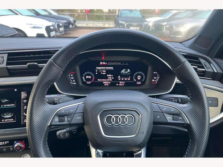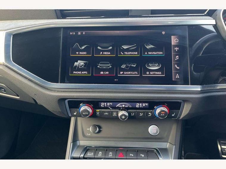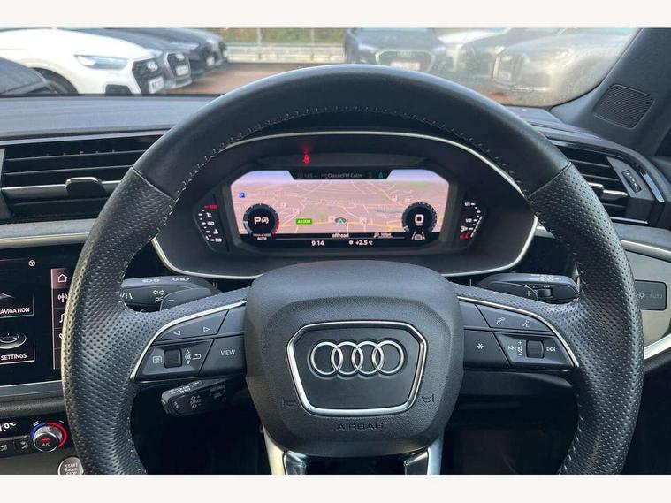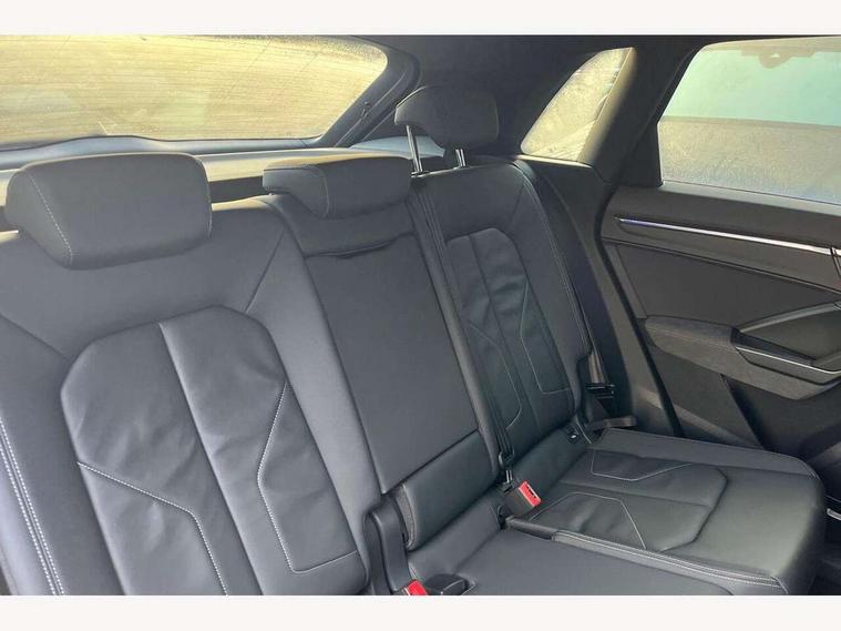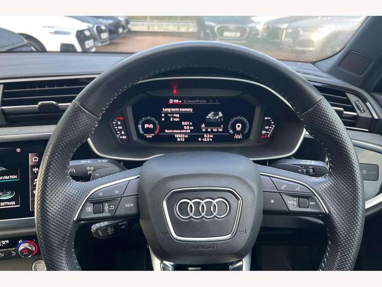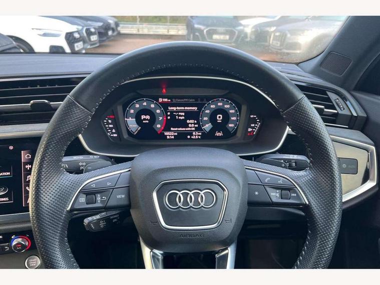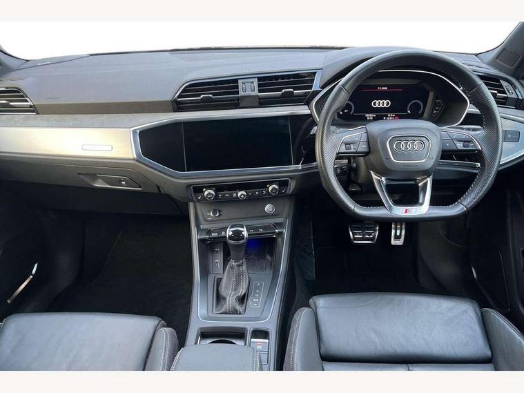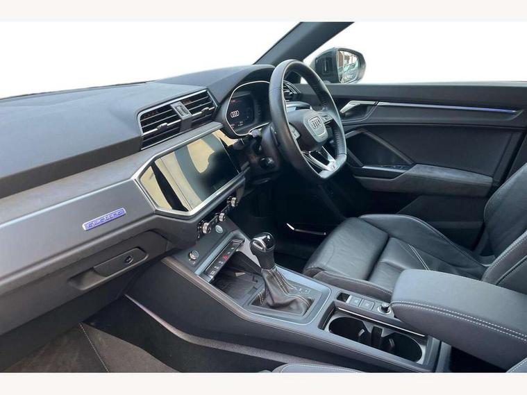 360 degree parking camera, Audi connect safety and service (e-call), Audi drive select, Audi lane departure warning, Audi parking system plus with front and rear sensors, Audi phone box with wireless charging, Audi side assist, Audi smartphone interface, Audi virtual cockpit plus, Bluetooth interface, MMI navigation plus with MMI touch, Power opening/closing tailgate, Progressive steering, Rear cross traffic alert, Service interval indicator, Stop/start system, Voice control system, Adaptive suspension with damping control, Bang & Olufsen 3D Premium Sound System, DAB digital radio module, Acoustic windscreen, Aluminium roof rails, Auto dimming and folding door mirrors, Auto dimming rear view mirror, Black roof rails, Contrast bumpers in Manhattan grey paint finish, Diffuser in matt Platinum grey, Electrically adjustable and heated door mirrors with integrated LED side indicators, Front and rear electric windows, Front fog lights, Front side air inlets in matt platinum grey, Front spoiler blade in matt platinum grey, Front spoiler in matt selenite silver, Grille vertical bars in aluminium silver/Matt, Headlight washers, High gloss black finish B and C pillars, Matrix LED headlights with LED rear lights and dynamic front and rear indicator, Panoramic opening glass sunroof, Privacy glass, Rain and light sensors, Rear diffuser strip in selenite silver, S line bumpers in contrasting Manhattan grey, 12V socket in rear centre console, 3 spoke flat bottomed high multi-function leather sport steering wheel with gearshift paddles, 4 way electric lumbar support for driver and front passenger, 40:20:40 split folding rear bench seat, Adjustable rear seat bench/backrest with centre armrest and cupholder, Aluminium door sill trims, Black cloth headlining, Dual zone climate control, Electrically adjustable front seats, Front and rear black floor mats with contrast stitching in rock grey, Front and rear headrests, Front centre armrest with storage compartment and angle adjustment, Heated front seats, ISOFIX child seat mounting and Top Tether with front passenger airbag deactivation, Perforated leather gearknob, Stainless steel luggage compartment sill finisher, Stainless steel pedals, Black styling pack - Q3, Driver Assistance Pack - Q3, Multi coloured extended ambient interior lighting pack - Q3, Non smoking pack - Q3, 3x3 point rear seatbelts, 6 airbags - Driver, front passenger, curtain and side windows, Audi pre-sense front with pedestrain and cyclist recognition, Electronic stabilisation control including ABS, ASR and EDL, Hill hold assist, Pre sense basic, Seatbelt monitoring, Tyre pressure warning, Warning triangle and first aid kit, Advanced key, Anti theft alarm, Anti theft wheel bolts, Remote central locking, Dark matt brushed aluminium inlay, MMI touch colour display in gloss black with aluminium surround,