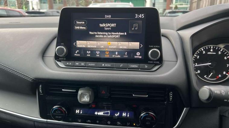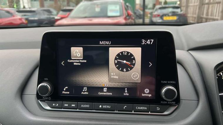 7" High definition full colour TFT screen combimeter, Android auto/Apple CarPlay (Wired), Blind spot warning, Drive modes (sport, normal, eco), Electric speed sensitive power steering, Emergency and breakdown call, Idle stop/start system, Intelligent Cruise control (ICC), Intelligent driver alert system, Intelligent forward collision warning, Intelligent lane intervention, Lane departure prevention, Lane departure warning system, Maximum speed limiter, Nissan connect 8" touchscreen infotainment system, Push button starter, Rear cross traffic alert, Rear parking sensors, Rear view camera, Traffic sign recognition with legal speed adjustment, Trip computer, 6 speakers, AM/FM audio system with DAB, Bluetooth audio streaming, Front USB connections (Type-A and Type-C), Auto dimming rear view mirror, Auto rear wiper when reversing, Automatic hazard signal with emergency stop signal, Body colour mirror caps, Body coloured door handles, Bodyside mouldings, Chrome side window finisher, Door handle with button, Electric auto folding door mirrors, Electrically adjustable and heated door mirrors with LED turn indicator, Follow me home headlights, High beam assist, Intelligent auto headlights, LED 3rd brake light, LED daytime running lights, LED Headlights, LED rear lights, One touch front and rear electric windows with remote opening and closing, Partially body coloured bumpers, Rear reversing light (bulb lighting), Rear roof spoiler, Rear side wing doors, Shark fin antenna, Splash free rain sensing wipers, Three blink turn signal, 12v power socket in dashboard and luggage, 2x Rear coat hooks, 3 bench rear seats in 2nd row, 3 rear headrests, 4 folding assist grip, 6-way manually adjustable driver's seat, 60/40 split folding rear seat bench, Centre console storage tray, Chrome interior door handles, Cloth monoform upholstery, Driver and front passenger sunvisors with illuminated vanity mirrors, Dual zone automatic climate control with pollen filter, Electrically adjustable lumbar support for driver, Front and rear door storage, Front centre console and armrest, Front cupholders x 2, Front door with bottle holders, Glovebox with light, Hard trunk cover, Height adjustable driver's seat, Height adjustable front headrests, Height adjustable passenger seat, Leather shift knob, Luggage space lighting, Manually adjustable passenger (slide recline + lifter), Multifunction steering wheel, Passenger seat back pocket, Rear armrest with 2 cupholders, Rear door bottle holders, Single front passenger seat, Steering wheel switches, Sunglasses holder, Tilt/telescopic adjustable steering wheel, Two rear isofix child seat anchorage points with top tether, 3x3 point rear seatbelt pretensioners + load limiters, ABS with EBD and brake assist, Active brake limited slip, Auto hold function, Child locks on rear doors, Curtain and front side, far side airbags, Driver and passenger airbags, Driver, passenger and 2nd row rear seat belt reminder, Electronic parking brake, Front seatbelt pretensioners + load limiters, Height adjustable front seatbelts, Hill start assist, Intelligent blind spot intervention, Intelligent front emergency braking with pedestrian, cyclist recognition and junction assist, Intelligent rear automatic braking, Tyre pressure monitoring system, Vehicle dynamic control, Capless fuel filler, Engine immobiliser, Intelligent Key, Remote central door locking with deadlocking, Thatcham Cat.1 alarm, Interior instrumental panel A finisher, 17" Alloy wheels, Tyre puncture repair kit,