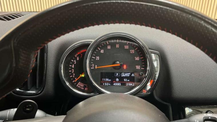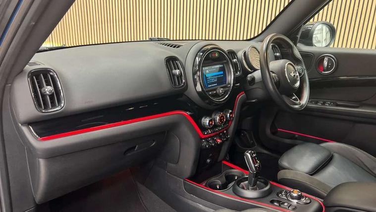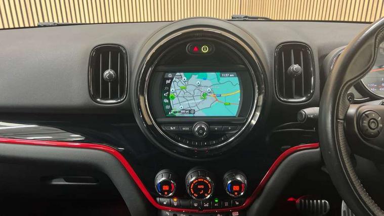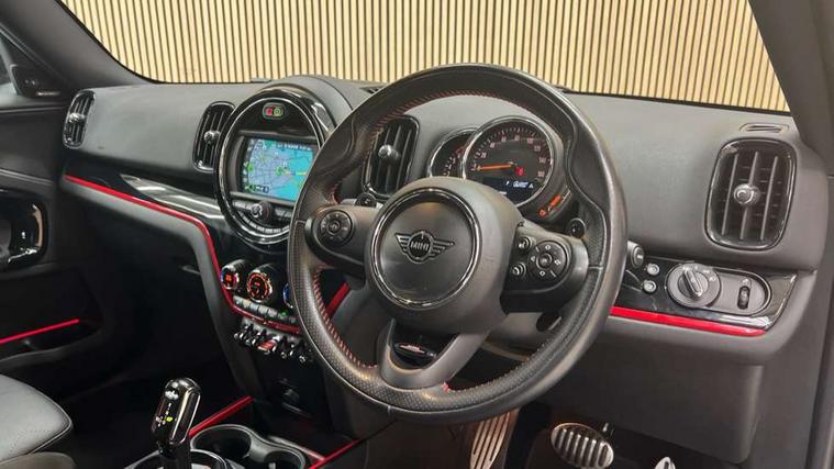 Active Guard incl speed limiting and lane departure functions with auto steering, and front collision warning with brake intervention, Automatic start/stop function with brake energy recuperation, Compatible mobile phone bluetooth with audio streaming, Electro-mechanical speed dependant steering assistance, Instrument cluster, MINI Driving Modes - centre toggle switch to control driving setting (sport, mid and green), Mini E-call, MINI TeleServices, On board computer, Rear parking distance control, Double Vanos system, Fully variable valve control, High precision injection, Performance Control, Sport automatic transmission with steering wheel paddles, FM tuner and DAB digital radio, Bonnet scoop, Chrome border honeycomb structure radiator grille with S badge, Chrome fuel filler cap, Day time driving lights, Dynamic brake lights, Electric windows, Heated rear window, Heated windscreen washer jets, John Cooper Works - aerodynamic kit (front and rear apron, spoiler), front and rear sport bumpers and part-painted side sills with door sill finishers, John Cooper Works Logo, John Cooper Works rear spoiler, Metal door sill strips with Cooper S imprint, Model logo, Model logo on Tailgate, Rain sensor with auto headlights, Rear fog lights, Rear window wiper, Side scuttle panel with integrated indicator, Split rear doors, Sun/heat protection glass, Twin exhaust tailpipe, White indicator lenses, 12V Accessory socket in centre console, 360L luggage compartment capacity, 4 lashing eyes in luggage compartment, 40:20:40 split folding rear seats, Anthracite headlining with grab handles and clothes hooks, Chrome interior highlights, Colour line - Carbon black, Cupholders, English handbook, Front headrests, Glove compartment, Height and length steering column adjustment, Interior lighting with 12 basic colours selectable via toggle switch in roof, Isofix rear child seat preparation, John Cooper Works perforated leather steering wheel with contrast stitching in chilli red and John Cooper Works logo, Leather gearshift lever and handbrake gaiters, LED reading lights, vanity mirror lights, front foot well light and spotlight on front seats, Manual air conditioning, Mechanical seat adjustment, driver seat height adjust, forward/back and front seats backrest, Multifunction steering wheel, Passenger seat height adjuster, Rear headrests, Storage compartments in doors, Sunvisors with vanity mirrors, Excitement pack - Countryman, Navigation pack - Countryman, 2 tone horn, 3 point seatbelts on all seats, 6 Airbags - front, side, head and seat belt tensioners, Anti-lock braking system (ABS), DSC - Dynamic Stability Control, Electronic handbrake, Front and rear disc brakes, Hill start assist, Tyre pressure monitoring system, Alarm system with tilt sensor, monitoring doors, bonnet interior and tailgate, Auto drive away locking, Deadlocking function, Electronic vehicle immobiliser, Locking wheel bolts, Start/stop toggle with keyless go, Tool kit,