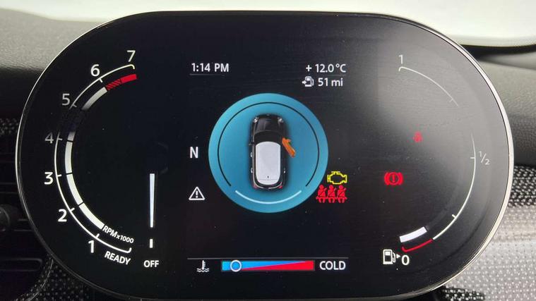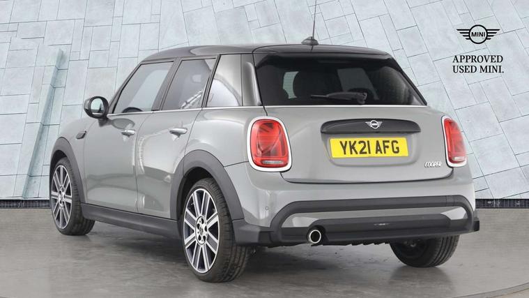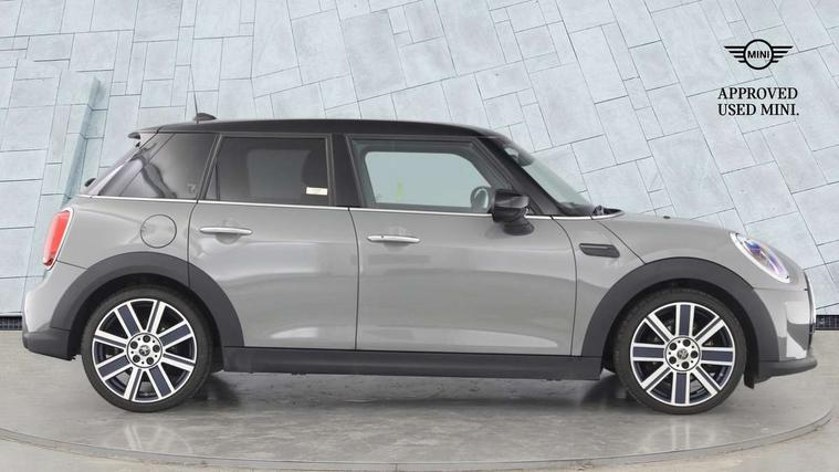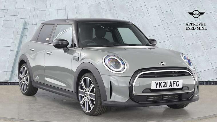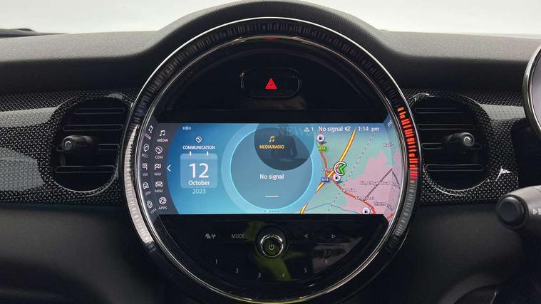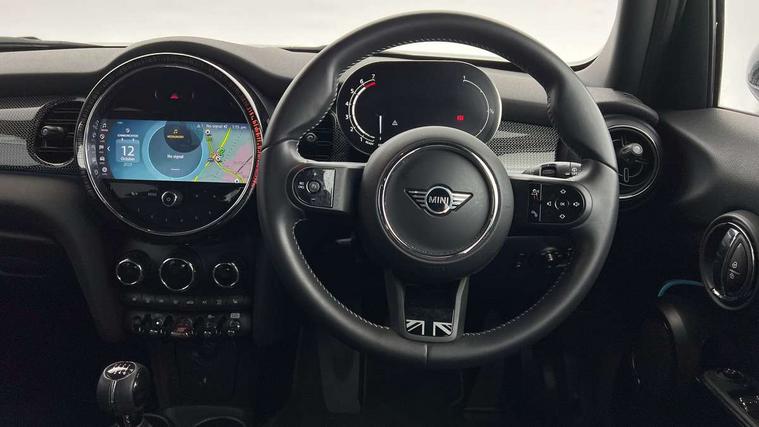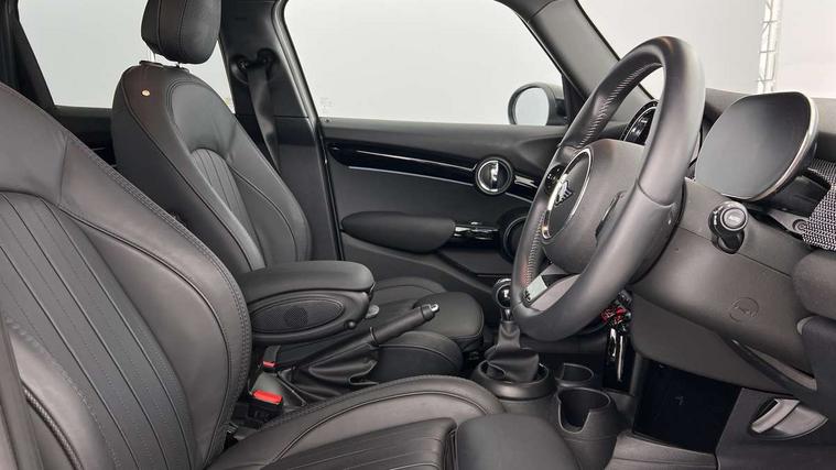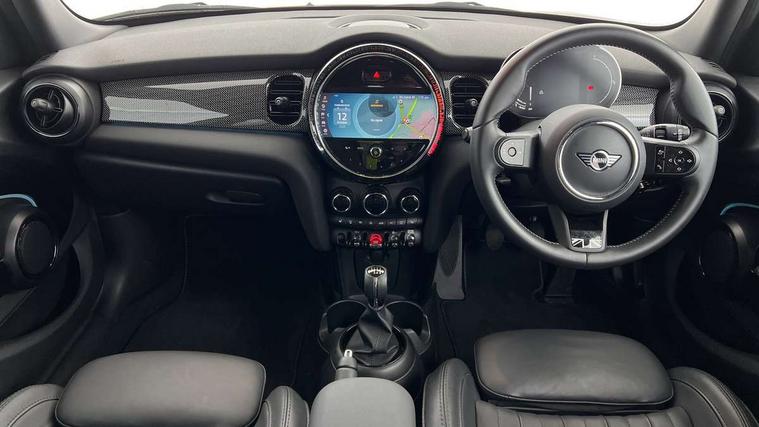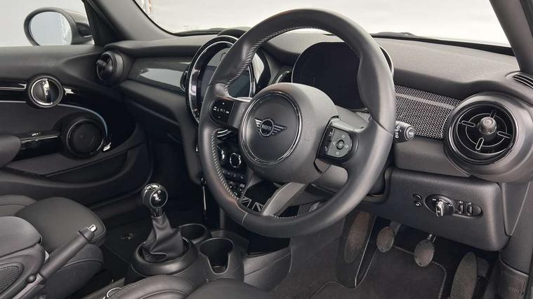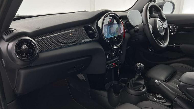Automatic start/stop function with brake energy recuperation, Compatible mobile phone bluetooth with audio streaming, Cruise control with brake assist, Electro-mechanical speed dependant steering assistance, Flexible car sharing preparation, Instrument cluster, MINI Driving Modes - centre toggle switch to control driving setting (sport, mid and green), Mini E-call, MINI TeleServices, On board computer, Rear park distance control, Service interval indicator, 6 Speed manual transmission including gear change indicator display, Double Vanos system, Fully variable valve control, High precision injection, Performance Control, 6 speakers in front door trims and underneath front seats, 8.8" touchscreen with LED ring, FM tuner and DAB digital radio, Automatic headlight activation switch, Body colour fuel filler cap, Chrome line exterior - radiator grille bars, tailgate handle, lower front grille grating and rear central fog-light, Dynamic brake lights, Electric front+rear windows, Heated rear window, Heated windscreen washer jets, LED headlight with closed ring and daytime driving lights, Metal door sill strips with MINI imprint, Model logo Cooper on right of tailgate, Rain sensor window wipers, Rear fog lights, Rear LED lights with union jack design, Rear window wiper, Side scuttle panel with integrated indicator, Sun/heat protection glass, White indicator lenses, 12V Accessory socket in centre console, 4 lashing eyes in luggage compartment, 60/40 split folding rear seat, Anthracite headliner including grab handles and clothes hooks, Carbon black colour line - Knee roll and door armrest, Chrome interior highlights, Chrome line interior - air vents, gear lever base, door handles and speakers in doors, Cupholders, Front and rear head restraints, Front and rear isofix with front passenger airbag deactivation, Glove compartment, Height and length steering column adjustment, Interior lighting with 12 different colours across the dashboard, underneath door bezel with illuminated laser-engraved design on central display, Leatherette gearshift lever and handbrake gaiters, LED reading lights, vanity mirror lights, front foot well light and spotlight on front seats, Manual air conditioning, Mechanical seat adjustment - forward/back & backrest for front seats and driver seat height adjust, MINI yours badge on exterior pillar, Multifunction steering wheel, Storage compartments in doors, Sunvisors with vanity mirrors, Tool kit, Velour floor mats, Walknappa leather steering wheel with grey seam and MINI Yours badge on Piano Black lower steering wheel spoke, 3 point seatbelts on all five seats, 6 Airbags - front, side, head and seat belt tensioners, Anti-lock braking system (ABS), DSC - Dynamic Stability Control, Front and rear disc brakes, Hill start assist, Single tone fanfare horn, Tyre pressure monitoring system, Alarm system with tilt sensor, monitoring doors, bonnet interior and tailgate, Electronic vehicle immobiliser, Start/stop toggle with keyless go,