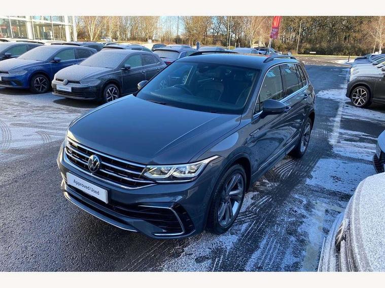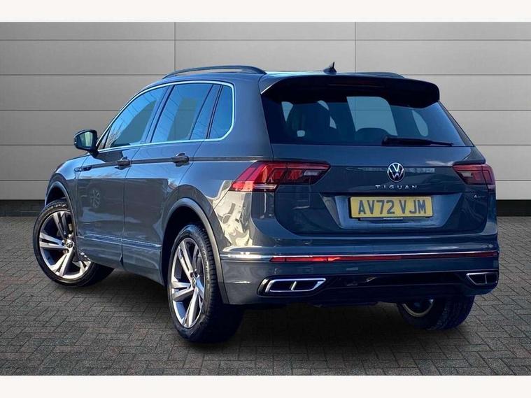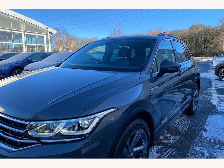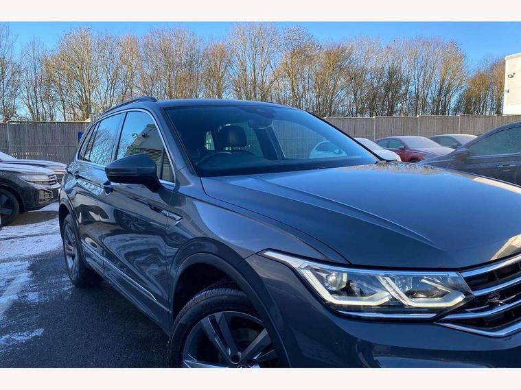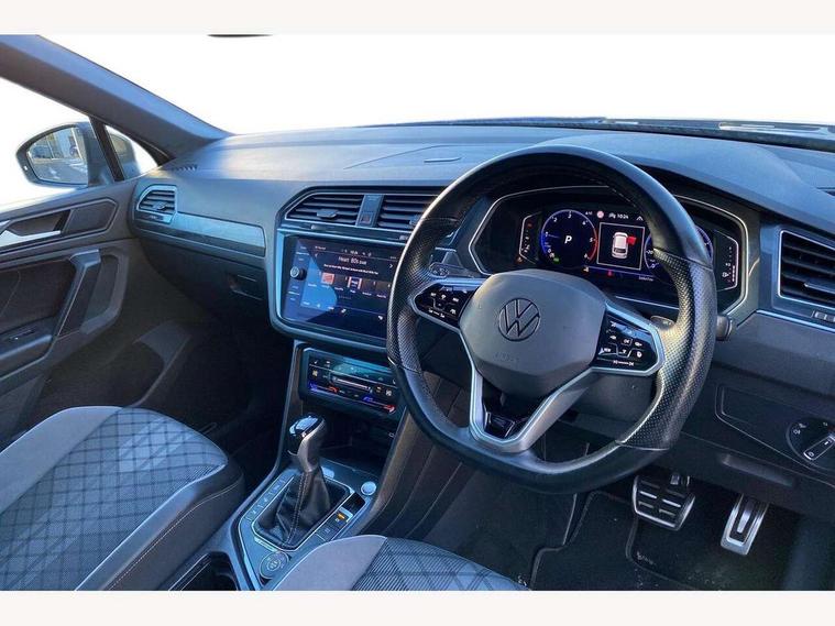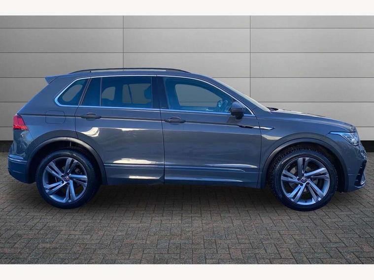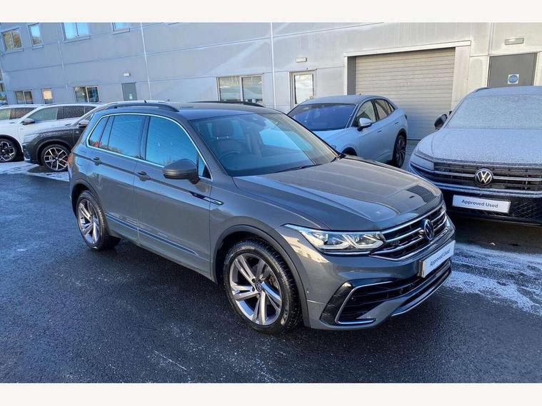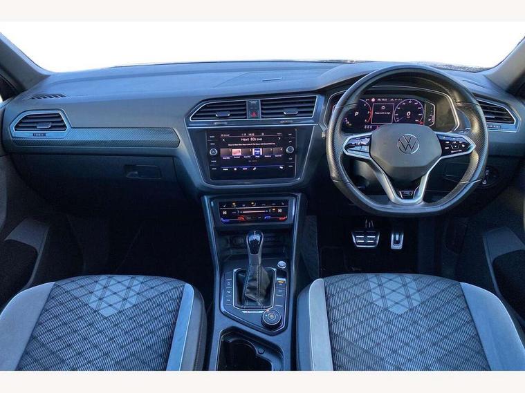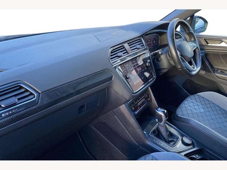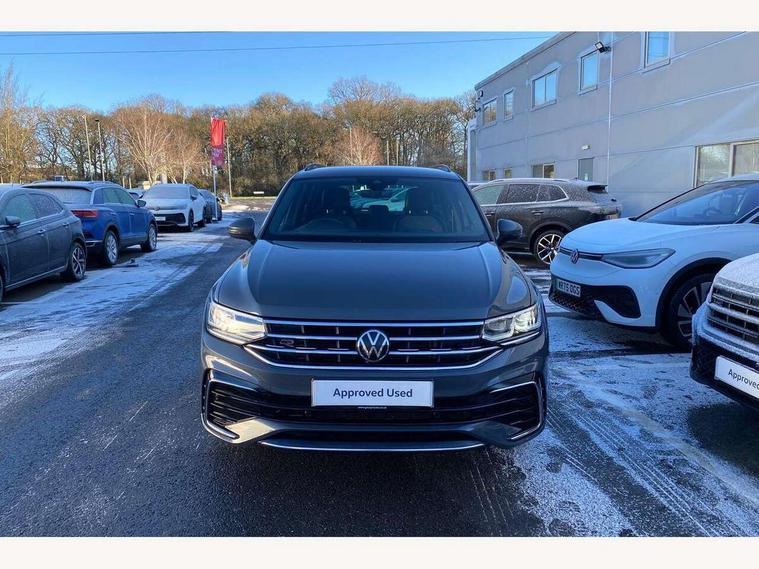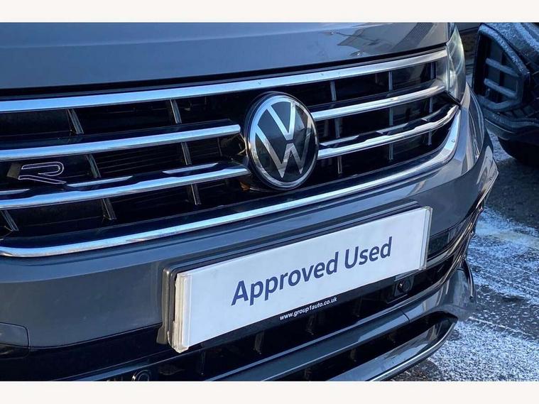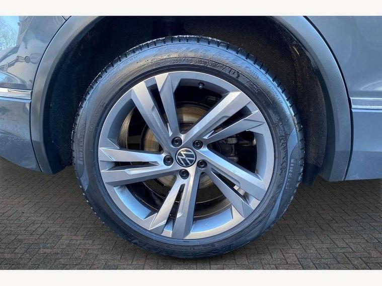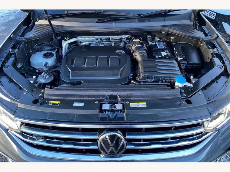Adaptive cruise control ACC stop and go including speed limiter, App-Connect incl. App-Connect Wireless for Apple CarPlay and Android Auto, Bluetooth phone integration system, Comfort drive travel assist, Digital cockpit pro, Driver alert system, Driver profile selection, Dynamic road sign display, eCall emergency call system, Electromechanical speed sensitive power steering, Emergency assist, Front and rear parking distance sensors, Instrument cluster mph speedometer Great Britain, Lane keeping system Lane Assist, Lights on warning, Multifunction front facing camera, Outside temperature display, Premium multifunction display with multi colour display, Preparation for subsequent activation Navigation feature Discover Media includes Streaming and Internet, Remote control boot opening, Rev counter, Service interval indicator, Speed limit display, Start/stop system with regenerative braking, Tailgate/trunk lid unlocking from outside, Trip computer, Warning sound and light for doors and tailgate open, Battery regeneration during braking, Sports suspension, 8 speakers, Digital radio reception DAB+, Diversity antenna for FM reception, Radio, Auto dimming interior rear view mirror, Automatic headlight control system, Body colored bumpers in R-Line style, Body colored exterior mirror housings, Body colour door handles, Chrome moldings on the side windows, Coming/leaving home lighting function, Dynamic headlight range control, Front and rear electric windows, Heated rear window, High level 3rd brake light, Laminated safety glass windshield, heat and sound insulating, LED headlamps with LED separate daytime running light and dynamic cornering light, LED rear combination lamps, LED rear number plate lights, License plate carrier in front and rear, Poor weather light and cornering light, Power adjustable, folding and heated door mirrors with surround lighting, front passenger exterior mirror lowering function, Privacy glass for rear side windows and rear window, R Line body kit, R Line side sills, Rain sensor, Rear exhaust tailpipe, Rear fog lamp, Rear side wing doors, Rear spoiler in R style, Rear windscreen washer and wiper with interval delay, Side and rear windows in heat insulating glass, Trailer Stability Programme, Unique R Line badging, Windscreen wipers/ intermittent wipe + 4 position delay, 12V outlet in center console rear and in luggage compartment, 12V outlet in front and tray, 2 LED front reading lights, 2 LED rear reading lights, 3 bench rear seats in 2nd row, 3 rear headrests, Air Care Climatronic 3 zone automatic climate control with enhanced air filter and controls in the rear, Art Velours greyson sports cloth upholstery, Backrest release for left front seat, Black headlining, Brushed stainless steel pedals and footrest, Carpet mats in front and rear with decorative stitching in Gray, Climate control unit rear with touch function, Door and side trim panel in foam film, insert in leatherette, Driver + front passenger lumbar support, Front footwell illumination, Front scuff plates in aluminum with R-Line logo, Front seats head restraints (x-adjustment), Height adjustable front seats, Height/reach adjust steering wheel, Isofix Preparation 2 Rear child seats, Leather gear knob, Rear bench seat asymetrically split folding, longitudinally movable and folding with load-through hatch and center armrest, Remote unlocking for rear seat backrest, Single front passenger seat, Sun visors with illuminated vanity mirrors, Top front comfort seats, Winter pack - Tiguan, 3 point seat belt for centre rear seats, 3 point seat belts with seat belt pretensioners for the outer rear seats, Curtain airbags for front and rear passengers, Driver/Front Passenger airbags, Drivers knee airbag, Electronic parking brake with auto hold, Electronic Stability Control with driver steering recommendation, ABS, ASR, EDL, EDTC and trailer stabilization, Front assist with autonomous emergency braking (for Adaptive Cruise Control ACC up to 130 mph), Front disc brakes, Front passenger airbag deactivation, Front side airbags, Height adjustable front 3 point seatbelts + pretensioners, Manual child proof rear door locks, Pedestrian monitoring system, Proactive passenger protection system in combination with front assist, Rear disc brakes, Two tone horn, Tyre pressure loss indicator, Warning sound and light for front seat belts if unfastened, Warning triangle, Anti theft alarm system with interior monitoring, backup horn and towing protection, Anti theft wheel bolts, Electronic engine immobiliser, Keyless locking and starting system keyless access with safelock, Chrome elements on the mirror switch power window switches and door pulls, Decorative inserts Carbon Gray for dashboard and front door trim panels, Interior door handle in matte chrome, 19" Valencia alloy wheels with AirStop tyres, Tool kit, Tyre mobility kit Includes 12V compressor and tyre sealant,
