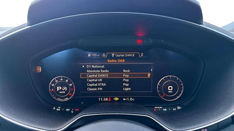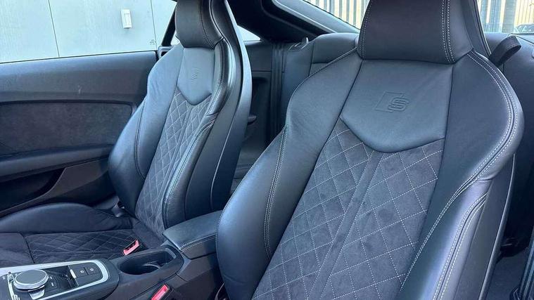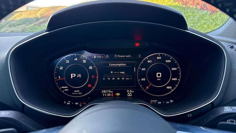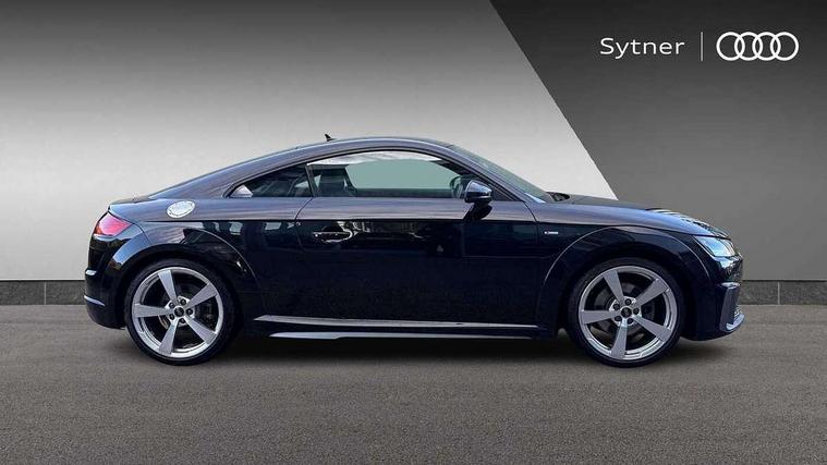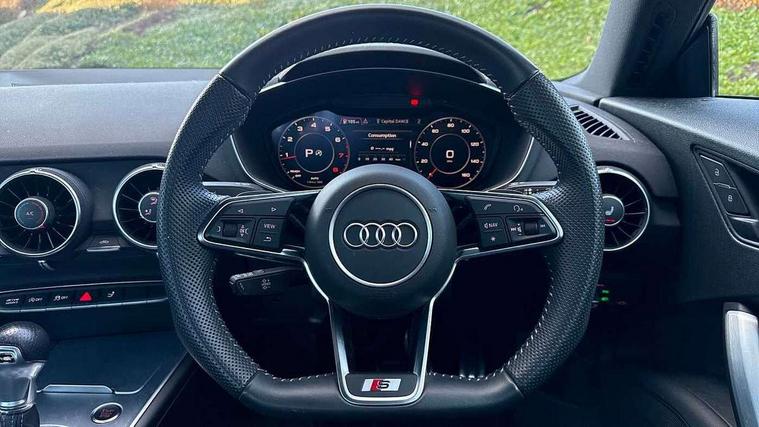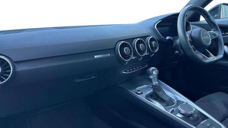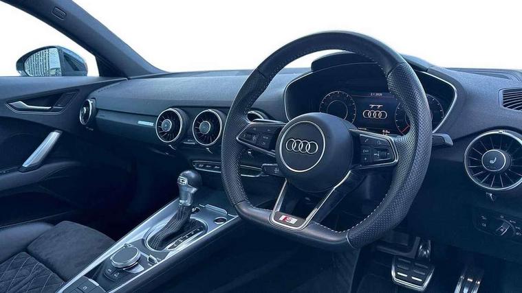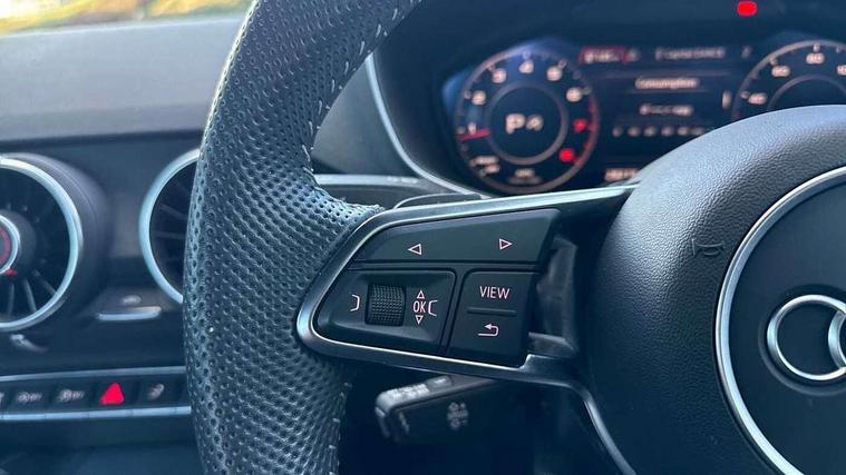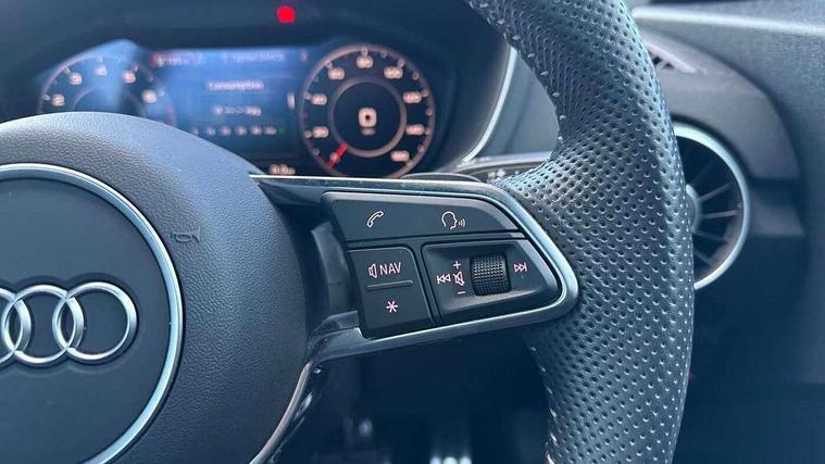 Audi drive select with 4 Pre configured modes, Audi smartphone interface, Audi virtual cockpit - 12.3" high-resolution LCD display with fully customisable instrument cluster, Cruise control + speed limiter, Emergency call service, MMI touch panel, Mobile phone preparation with bluetooth interface, Progressive power assisted steering, Service interval indicator, Start/Stop system with energy recuperation, TP memo, S line sports suspension, AM/FM radio, Bluetooth audio streaming, DAB Digital radio, MMI Radio with CD player and SD/XC card slot, Auto dimming rear view mirror, Auto headlight range control, Black door mirrors, Body colour bumpers, Electric folding door mirrors, Electric front windows, Electrically adjustable and heated door mirrors with integrated LED side indicators, Front fog lights, Green tinted heat insulating glass, High gloss black radiator grille, LED 3rd brake light, LED daytime running lights, LED headlights with LED rear lights + dynamic rear indicators, Light and rain sensors, Rear boot, Retractable rear spoiler, S line badges on front wings, Sunband for windscreen, 12V socket, 2 rear seats, 3 spoke flat bottomed high multi-function leather sport steering wheel with gearshift paddles, 4 way electric lumbar support for driver and front passenger, Black headlining, Contrasting silver stitching in steering wheel, Door sill trims with S line logo, Extended aluminium look with stainless steel pedals, Front centre armrest, Front passenger seat, Front super sports seats, Heated front seats, Height/reach adjust steering wheel, Integrated head restraints, ISOFIX child seat mounting for front passenger seat with airbag deactivation, Manual adjustment of seat height, fore/aft position, seat angle, seat depth and backrest angle, Perforated leather gearknob in black, Rear head restraints, Rear top tether child seat ISOFIX attachment, S Line badge on steering wheel, Split folding rear seat, Tool kit, Non smoking pack - TT/TT RS, S Line design styling pack - TT, 3 point front seat belts, ABS, ASR traction control, Curtain airbags, Driver and front passenger airbag with front passenger airbag deactivation, EDL traction control, Electromechanical parking brake, ESP, First aid kit, Front side airbags, Head airbags, Hill hold assist, Seatbelt warning, Tyre pressure loss indicator, Warning triangle, Anti theft alarm, Anti theft wheel bolts, Immobiliser, Keyless Go, Remote central locking, Matt brushed aluminium inlays, Tyre repair kit,