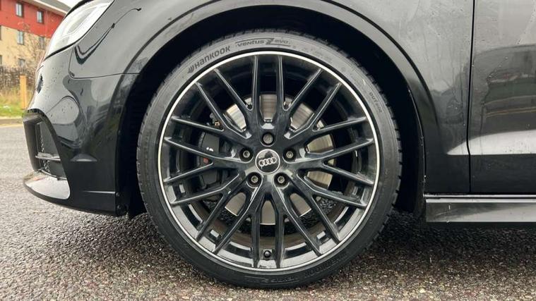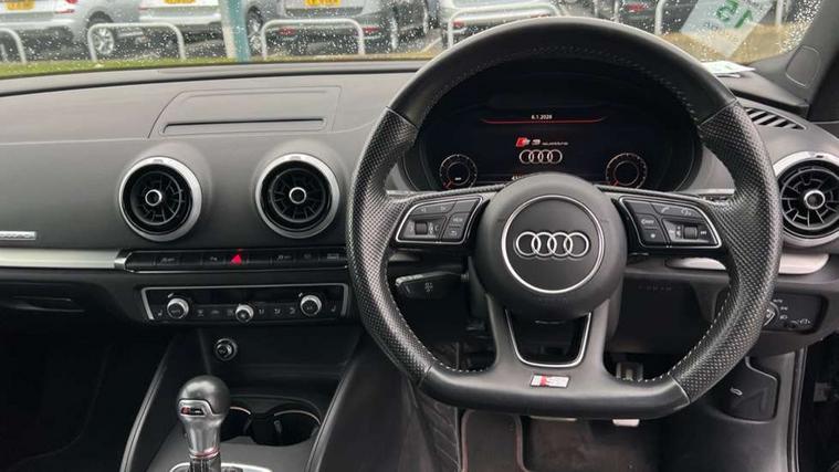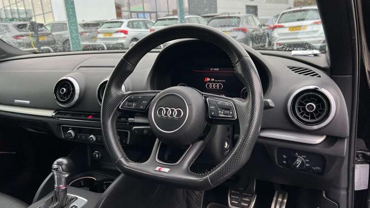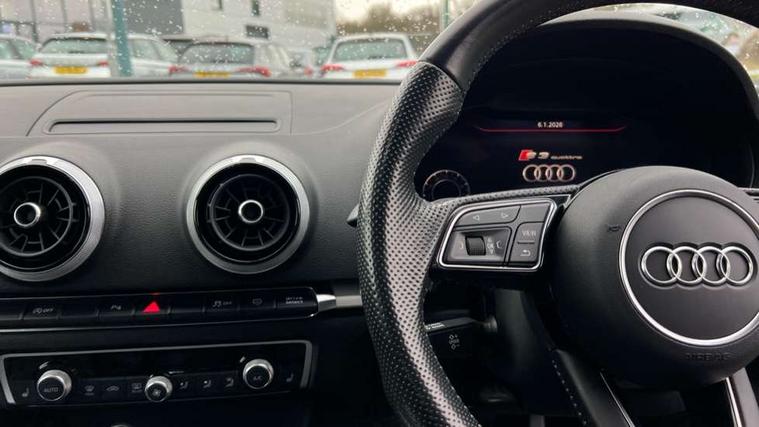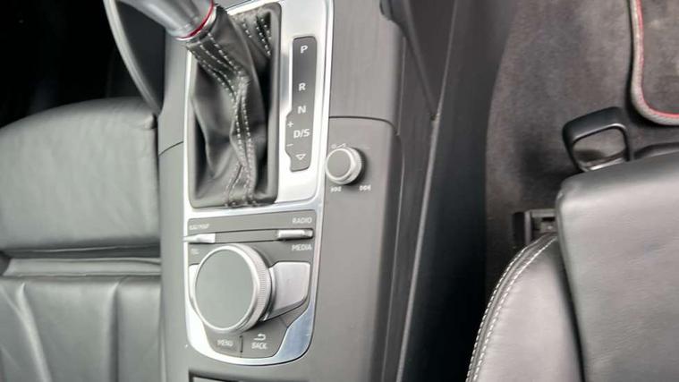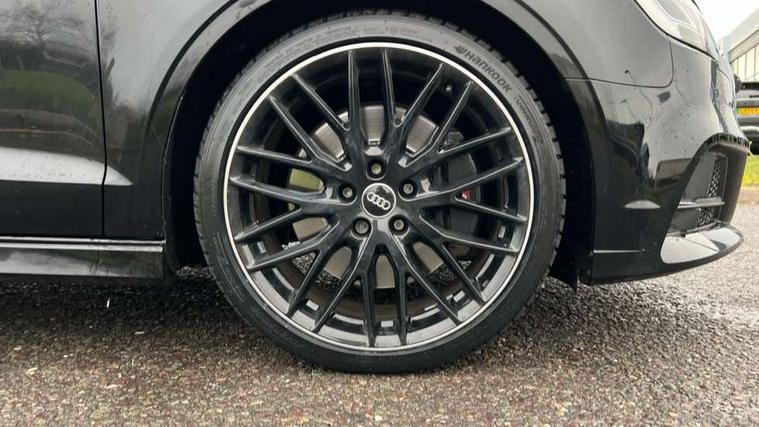 Audi connect, Audi smartphone interface, Automatic start/stop system, Bluetooth interface, Colour driver's information system display, Instrument dials with S3 logo, Progressive power assisted steering, SD card based MMI navigation, Service indicator, Voice control system, Audi magnetic ride, S sports suspension, 2 USB interfaces and Aux-In jack, Bang and Olufsen sound system, CD player, DAB Digital radio, MMI radio plus with 7" colour MMI screen and MMI controller, Two SDXC card slots, Auto dimming rear view mirror, Automatic lights and wipers, Black door mirrors, Black rear diffuser, Body colour roof spoiler, Dual branch oval twin exhaust tailpipes in chrome finish, Electrically adjustable and heated door mirrors with integrated LED side indicators, Front and rear electric windows, Headlight washers, Heated rear window, Heated windscreen washer jets, Privacy glass, S3 Front bumper, 3 adjustable rear headrests, 3 spoke flat bottomed high multi-function leather sport steering wheel with gearshift paddles, 4 lashing points to secure luggage, Adjustable front centre armrest, Cloth headlining, Driver/passenger sunvisors, Dual zone electronic climate control, Front and rear interior lights with delay, Front/rear floor mats, Heated front seats, Height/depth adjustable steering column, Illuminated door sill trims with S logo, Illuminated glovebox, Illuminated luggage compartment, ISOFIX child seat mounting and Top Tether with front passenger airbag deactivation, Stainless steel pedals, Storage compartments in doors side trims, centre console and under front drivers seat, Black styling pack - A3/S3, LED interior light pack - A3/RS3, Non smoking pack - A3, Storage and luggage pack - A3/RS3, 3 point seatbelts on all seats, ABS/EBD, Active front headrests, Airbags - front driver/passenger, front & rear side, curtain, drivers knee, ASR, EDL, Electromechanical parking brake, ESC - Electronic Stability Control + traction control, Hill hold assist, Predictive pedestrian protection, Seatbelt warning, Tyre pressure warning, Warning triangle and first aid kit, Anti theft alarm, Anti-theft wheel bolts, Immobiliser, Remote control central locking, Aluminium air vent surrounds, Aluminium trim elements, Matt brushed aluminium inlays, Tool kit, Tyre repair kit,