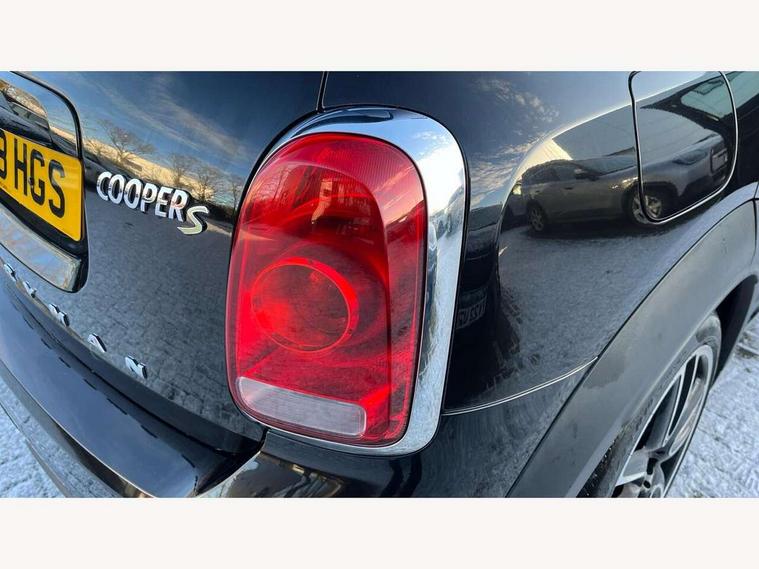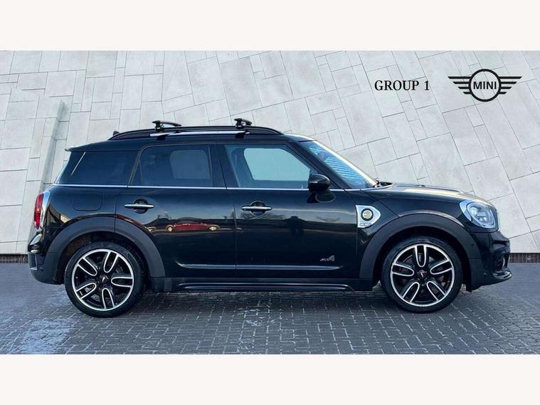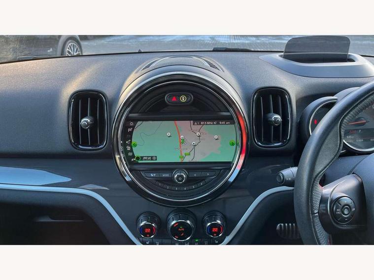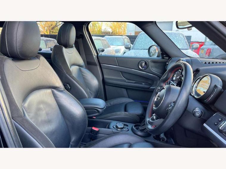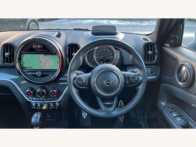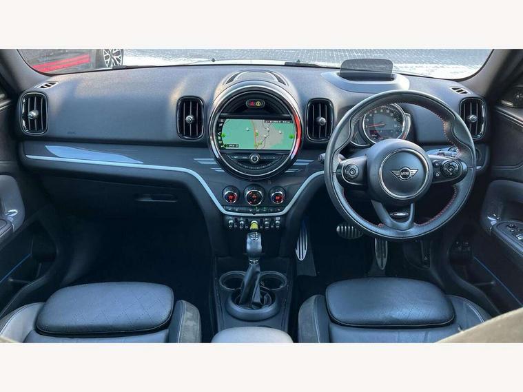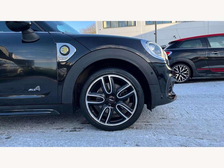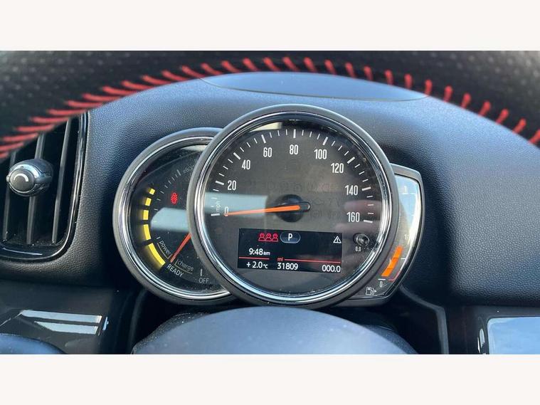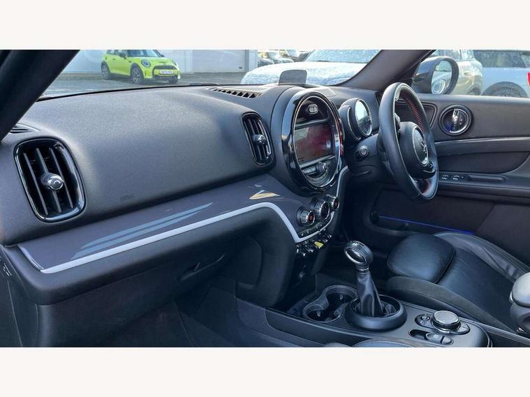 Active Guard incl speed limiting and lane departure functions with auto steering, and front collision warning with brake intervention, Automatic start/stop function with brake energy recuperation, eDrive button, Electro-mechanical speed dependant steering assistance, Instrument cluster, Mini E-call, MINI TeleServices, On board computer, Rear parking distance control, Automatic transmission, Charging flap on front left lower A-panel, Double Vanos system, Fully variable valve control, High precision injection, Performance Control, FM tuner and DAB digital radio, Bonnet scoop, Chrome border honeycomb structure radiator grille with S badge, Chrome fuel filler cap, Day time driving lights, Dynamic brake lights, Electric windows, Heated rear window, Heated windscreen washer jets, John Cooper Works - aerodynamic kit (front and rear apron, spoiler), front and rear sport bumpers and part-painted side sills with door sill finishers, John Cooper Works Logo, John Cooper Works rear spoiler, Metal door sill strips with Cooper S imprint, Model logo, Model logo on Tailgate, Rain sensor with auto headlights, Rear fog lights, Rear window wiper, Side scuttle panel with integrated indicator, Split rear doors, Sun/heat protection glass, Twin exhaust tailpipe, White indicator lenses, 12V Accessory socket in centre console, 360L luggage compartment capacity, 4 lashing eyes in luggage compartment, 40:20:40 split folding rear seats, Anthracite headlining with grab handles and clothes hooks, Charging cable, Chrome interior highlights, Colour line - Carbon black, Cupholders, English handbook, Front headrests, Glove compartment, Height and length steering column adjustment, Isofix rear child seat preparation, John Cooper Works perforated leather steering wheel with contrast stitching in chilli red and John Cooper Works logo, Leather gearshift lever and handbrake gaiters, LED reading lights, vanity mirror lights, front foot well light and spotlight on front seats, Manual air conditioning, Mechanical seat adjustment, driver seat height adjust, forward/back and front seats backrest, Multifunction steering wheel, Passenger seat height adjuster, Rear headrests, Storage compartments in doors, Sunvisors with vanity mirrors, Excitement pack - Countryman, Navigation pack - Countryman, 2 tone horn, 3 point seatbelts on all seats, 6 Airbags - front, side, head and seat belt tensioners, Anti-lock braking system (ABS), DSC - Dynamic Stability Control, Electronic handbrake, Front and rear disc brakes, Hill start assist, Tyre pressure monitoring system, Alarm system with tilt sensor, monitoring doors, bonnet interior and tailgate, Auto drive away locking, Deadlocking function, Electronic vehicle immobiliser, Locking wheel bolts, Start/stop toggle with keyless go, Tool kit,