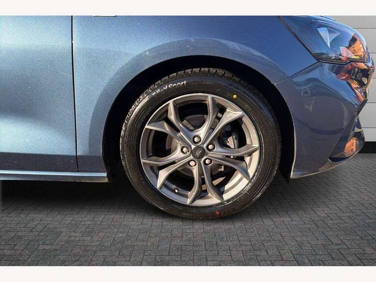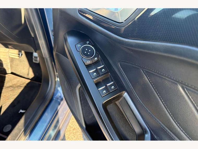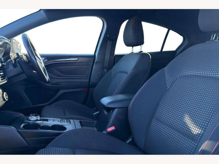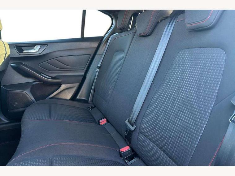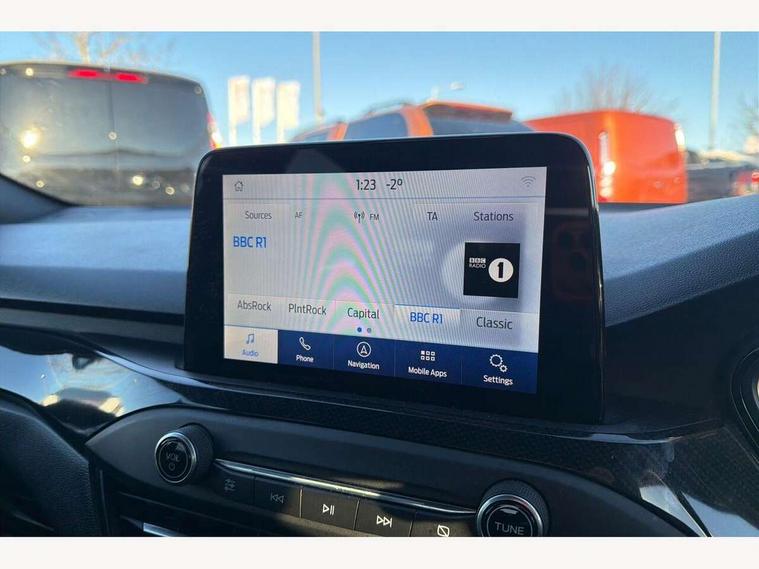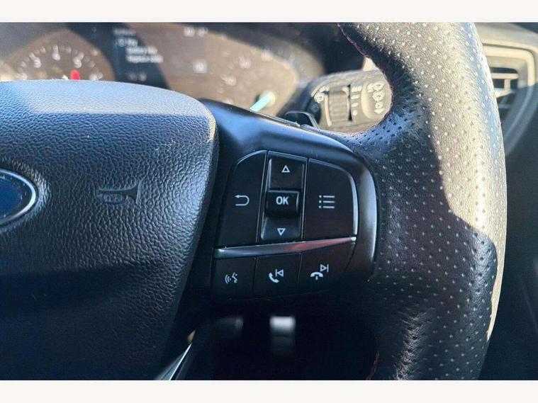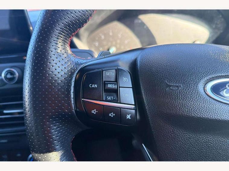 Bluetooth system, Digital clock, Easy fuel capless refuelling system, Eco mode, Ford pass connect, Ford SYNC 3 with 8" TFT touchscreen, and app link Android auto/Apple carplay, Intelligent speed assist, PAS, Rotary gear shift dial, Selectable drive mode, Trip computer, Sports tuned suspension, 6 speakers, Aux input, 'Quickclear' heated windscreen/heated washer jets, Auto headlamps (on/off), Body colour large rear spoiler, Body colour side skirt, Body coloured bumpers, Body coloured door handles, Body coloured electrically operated and heated door mirrors with side indicators, Electrically operated front and rear windows with one touch opening and closing, Front variable intermittent wipers with electric wash, Halogen reflector headlamps, Heated rear window, LED daytime running lamp, LED front fog lamps with cornering function, Polished twin tailpipe, ST-Line upper and lower grille with full body styling kit and wing badges, Tailgate wash/wipe, 3 spoke flat bottomed leather steering wheel with red stitching, 60/40 split back and cushion rear seats with 2 height adjustable headrests, Alloy finish pedals, Centre console with armrest, Cloth upholstery with red stitching, Dark headliner, Driver's lumbar support, Front floor mats, Height adjustable front headrests, Isofix child seat preparation, Manual air conditioning, Paddle shift controls, Reach + rake adjustable steering column, Rear centre headrest, ABS+Electronic Brake force Distribution, Auto hold function, Driver airbag, Electronic parking brake, Electronic stability control, Front and rear seatbelt reminder, Front inertia reel height adjustable seatbelts with pre-tensioners, Front passenger airbag, Front side airbags, Hill start assist, Passenger airbag deactivate switch, Post collision braking, Pre collision assist with autonomous emergency braking and pedestrian/cyclist detection, Side curtain airbags, Three rear inertia reel lap/diagonal seatbelts, Tyre pressure monitoring system, Keyless start with 'Ford Power' starter button, MyKey system, Remote central locking & engine immobiliser, Thatcham category 1 alarm, Contrast stitching - Red, 17" 5x2 spoke alloy wheels with rock metallic finish, Mini steel spare wheel,
