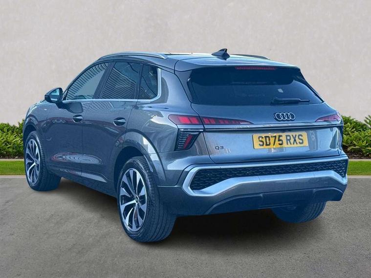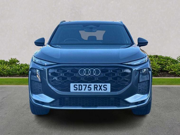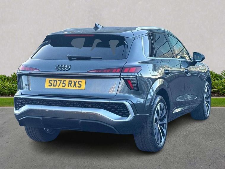 Adaptive cruise control, Audi connect emergency call and service, Audi connect remote and controls, Audi drive select (Balanced/Individual, effeciency, comfort and dynamic), Audi virtual cockpit plus - 11.9" display, Bluetooth interface, Camera based traffic sign recognition, Driver attention and fatigue monitor with driver monitoring, Front cross traffic assist, Lane departure warning with emergency assist, Panoramic curved display with 12.8" MMI navigation plus and MMI touch, Park assist plus with parking system and 360 display, Phonebox light with wireless charging, Reversing camera, Smartphone interface includes wireless Apple carplay/Android Auto, Start/stop system, Swerve assist and turn assist, Traffic sign based speed limiter, Voice control system with natural language interaction, Comfort suspension, Petrol Particulate Filter, 2 USB-C ports with charge and data functions, Audi sound system with 10 loudspeakers, subwoofer, 8 channel amplifier with 260 watts, DAB digital radio module, Acoustic glass for front door windows, Acoustic windscreen, Aluminium roof rails, Aluminium window trim, Audi Q3 lettering on the B-pillars, Auto dimming door mirrors, Auto dimming rear view mirror, Body colour door mirrors, Contrasting finish in volcano grey, Electrically folding, adjustable and heated door mirrors with integrated LED side indicators and kerb view function for passenger side, Full paint finish, Illuminated door sills with aluminium inserts at the front with S logo, LED daytime running lights, LED headlights plus with LED rear lights pro with continous light strip, illuminated Audi rings, rear, LED third brake light, Loading sill protector in stainless steel, Main beam assist, Privacy glass - dark tinted rear window, rear door and side windows, Projection light in the exterior mirrors - Projects a graphic element onto the ground, Q3 badging on the rear, Rain and light sensors, Rear side wing doors, Rear window, rear door windows and rear side windows in clear glass, Rear wiper, Sports bumpers, 3 seat bench in 2nd row, 3 spoke flat top and bottomed leather multi function sport steering wheel with gear shift paddles and "S" badging, 3-zone deluxe automatic air conditioning, 4 way lumbar support for the front seats - electric with horizontal and vertical adjustment in four directions, Black cloth headlining, Front and rear floor mats, Front and rear headrests, Front centre armrest, Heated front seats, Height and reach adjustable steering wheel, Interior storage compartment, Leather/artificial leather upholstery combination with S emblem + front sports seats, Luggage compartment lid, electrically opening and closing, Manual front seats with height adjustment, Rear seat bench plus with split folded 40:20:40, Single front passenger seat, Stainless steel pedals, Steering wheel operating unit, gloss black, Storage compartment in front centre console, Ambient lighting package pro - Q3, S line exterior styling pack - Q3, 3x3 point rear seatbelts, Convenience key with safelock, Driver and front passenger airbag with passenger airbag deactivation, Electromechanical parking brake, Electronic stabilisation control including ABS, ASR and EDL, First aid kit with warning triangle and high visibility vests, Front emergency brake assist, Hill hold assist, i - Size child seat mounting on the front passenger side and i - Size and top tether on the outer rear seats, Power operated child locks, Seatbelt monitoring, Three point automatic belts with belt tensioner and height adjustment, Tyre pressure loss indicator, Anti theft wheel bolts, Remote central locking, Thatcham approved category 1 anti theft alarm, Dark aluminium divergence inlay, Interior elements in dinamica microfibre, Interior trims in aluminium look, Tool kit and Jack,