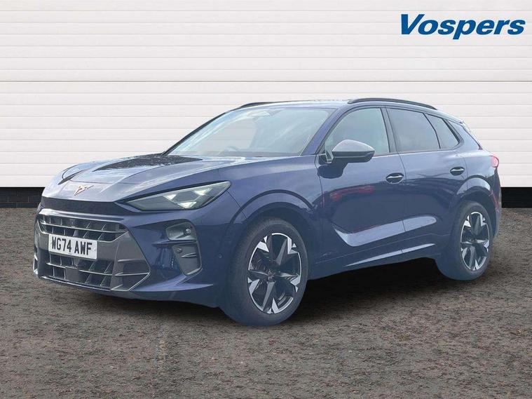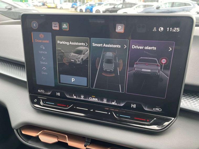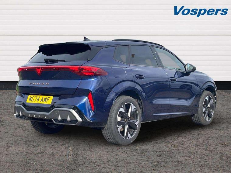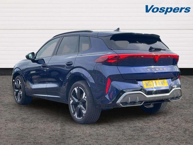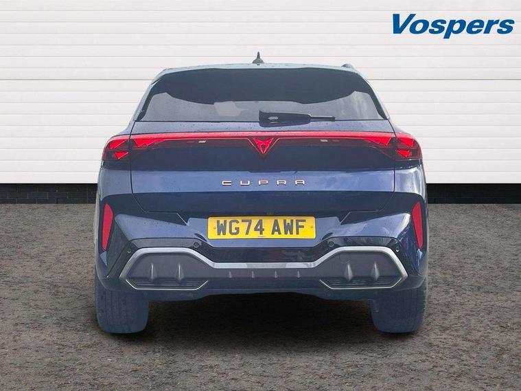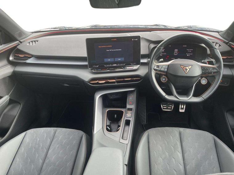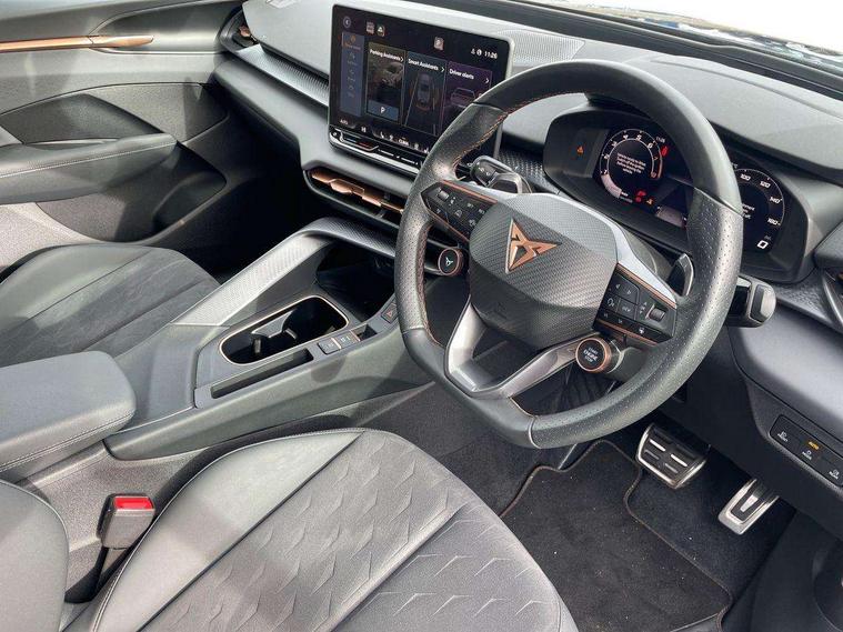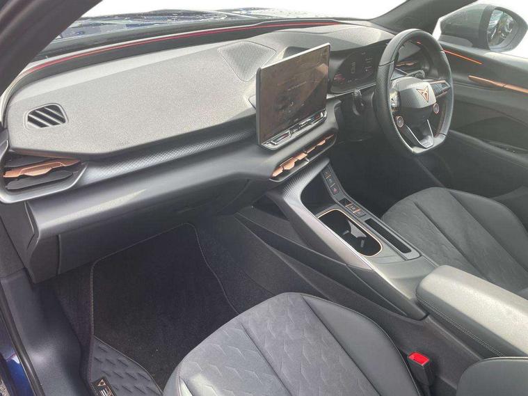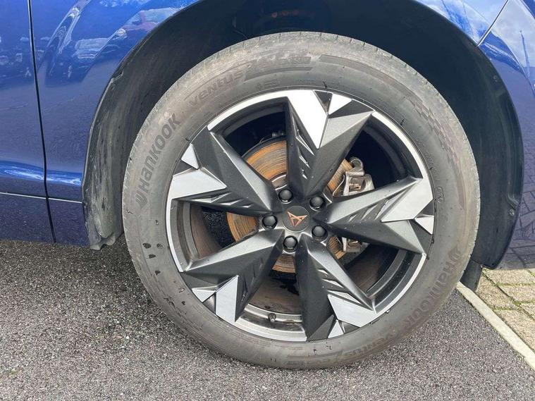10.25" digital cockpit and configurable dashboard, Adaptive cruise control with follow-to-stop and speed limiter, Advanced driver alert system, Advanced lane assist with semi-automatic vehicle control in a medical emergency and traffic jam assist, Driving profile selection and conventional shock absorber, Dynamic road sign display, E-call, Electric tailgate with virtual pedal, Emergency steering support with turn assist, Four x USB Type C ports (2 in front and 2 in rear), Front and rear parking sensors, Front assist (Forward collision warning with automatic braking) with multifunction camera and front cross traffic assist, Head up Display, Intelligent park assist, Media system with Nav - 12.9" touch display, voice control, full link phone (wired/wireless), DAB and Steering wheel mounted controls, Rear traffic assist, Side and exit assist, Speed sensitive power steering, Start/stop system with regenerative braking, Top view camera (front camera, rear camera, 2 side cameras), Wireless phone charger, Auto dimming rear view mirror, Black roof rails, CUPRA 3D rear lights with ceremony & swiping indicator and illuminated logo, Dark tinted rear windows, Daytime running lights with automatic headlight control and Coming and Leaving home function, Door mirrors with memory function and lowing function on passenger mirror, Dynamic headlight range control, Electric front/rear windows, Electrically adjustable, heated and folding door mirrors, Front fog lamps with cornering function, Heat reflecting windscreen, High beam assist, LED headlamps with signature "CUPRA LED", Rain sensing wipers, Rear fog light on one side, back up light on both sides, Rear side wing doors, Rear wash/wipe, Third brake light, Welcome lights (within exterior mirror housing), 3 seat bench in 2nd row, Black roof lining, Cupra sports pedals, Dinamica cloth upholstery, Driver seat memory function, Electrically adjustable front seats including lumbar support, Front and rear head restraints, Front and rear reading lights X 4, Front centre armrest, Heated front seats, Heated leather wrapped multi function sports steering wheel with tiptronic, Illuminated interior front door sills, Isofix, Operating voltage 12V, Single front passenger seat, Smart wraparound interior lighting, Sunvisors with illuminated mirror, Three zone climate control with control panel in rear, Unsplit rear seat bench, split folding backrest, with centre armrest, Variable luggage/load compartment floor, 3 point seatbelts in front with pretensioner and electric height adjustment, 3 point seatbelts on all rear seats, Brake control system - ESC and brake booster, Child proof door locks, Driver and front passenger airbags, Electronic parking brake, Front and rear disc brakes, Front interaction airbag, Front passenger airbag deactivation switch, Front side airbags with curtain airbags, Pre-crash front and rear seat belt tensioner, window closure and hazard lights, Tyre pressure monitoring system, Visual and acoustic seat belt reminder, electric contact in front and rear, Anti theft alarm, Keyless locking and starting system with keyless access, Locking wheel bolts, Black decorative trims, Chrome interior detailing, 19" Spectrum exclusive machine alloy wheels, Tool kit,