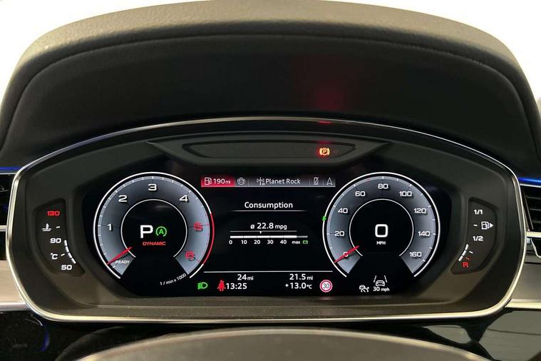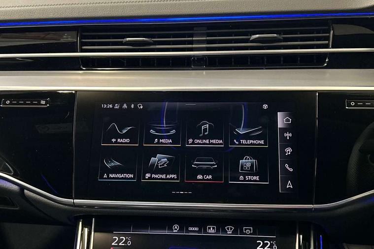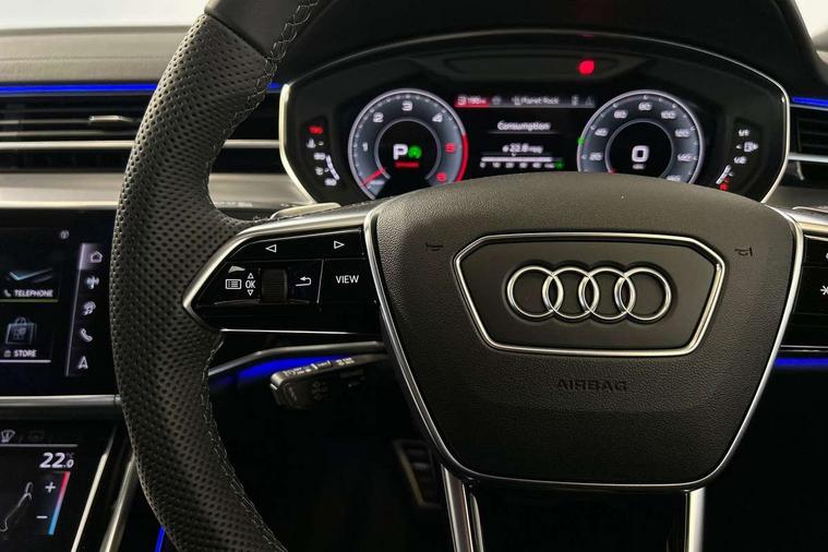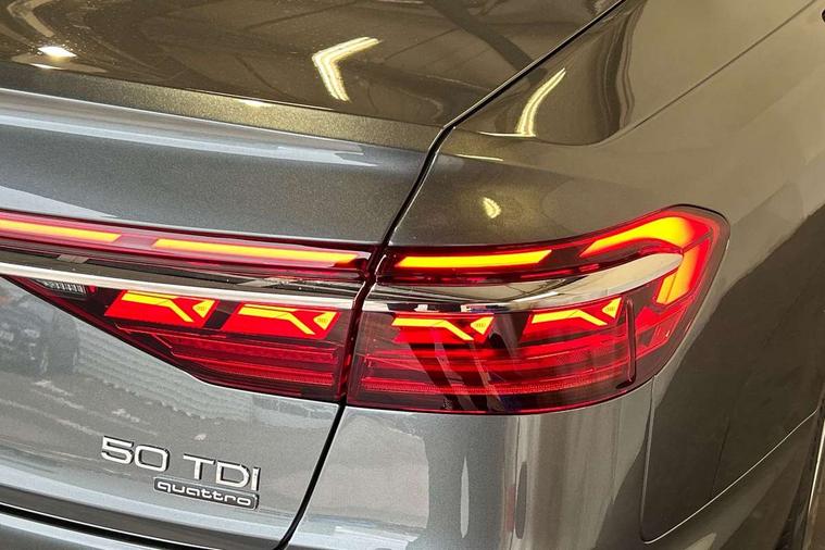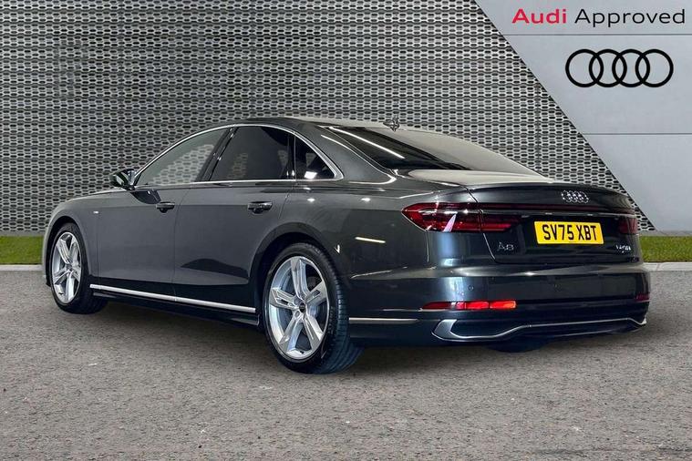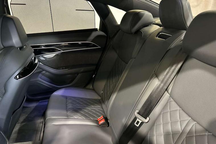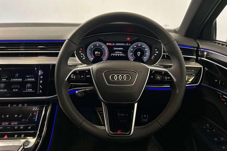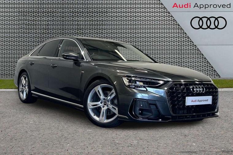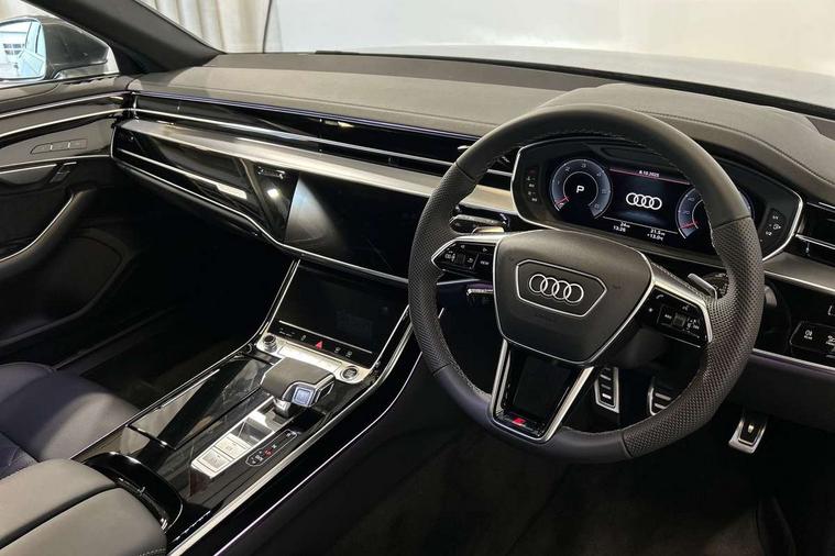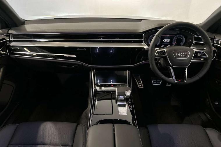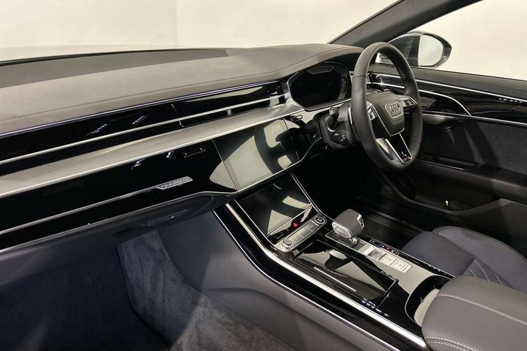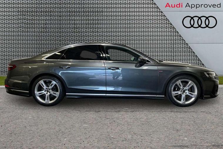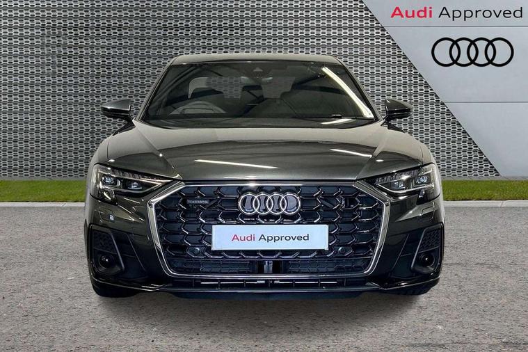 'Lights On' Reminder warning buzzer, Adaptive cruise control with cruise assist, emergency assist, efficiency assist, swerve assist, turn assist and speed limiter, Audi connect safety and service (e-call), Audi drive select, Audi parking system plus with front and rear sensors, Audi smartphone interface with app store includes wireless Apple carplay, Android auto and Amazon alexa integration, Audi virtual cockpit, Bluetooth interface, Camera based traffic sign recognition, Convenience key, Electro - mechanical power assisted steering, Head up Display, MMI navigation plus with MMI touch + Twin touch screens with haptic feedback, Operating buttons in black, glass look with haptic feedback including extended aluminium look, Power door closure, Power operated tailgate, Rear central control unit, Rear view camera, Remote fuel filler release, Service interval indicator, 24 litre AdBlue tank, 48V Mild hybrid technology, 8 speed transmission with hill hold assist, 82 litre fuel tank, Adaptive air suspension, Diesel particulate filter, Quattro all wheel drive with self locking centre differential, Audi music interface, Audi sound system, DAB digital radio module, MMI radio plus, USB connection, USB ports with charging function in the rear, Acoustic double glazing, All-weather, manoeuvring, position, static cornering, turning and motorway lights with automatic dynamic headlight range control, Audi space frame, Auto dimming rear view mirror, Body colour bumpers, Body colour exterior mirror housings, Dipped beam, Electric front windows, Electric rear windows with isolation switch, Electric sunblinds for rear window and rear door windows, Electrically adjustable heated folding + automatically dimming exterior mirrors with memory function and integrated LED indicators, Front wash/wipe with interval delay, HD matrix LED headlights with dynamic light presentation and dynamic indicators, Headlight cleaning system, Heat insulating darkened glass in side and rear windows, Heat insulating glass windscreen, Heated rear windscreen, Heated windscreen washer jets, High beam assist, LED brake lights, LED daytime running lights, LED third brake light, OLED rear lights with changeable rear light signature, Privacy glass, Rear boot, Rear side wing doors, Welcome/leaving lighting, 4 zone control automatic air conditioning, Audi phone box light, Black cloth headlining, Centre console with cupholders, Comfort centre armrest front, Comfort rear headrests, Door pockets with bottle holder, Driver and front passenger side sunvisors with illuminated vanity mirrors, Dust/pollen filters, Electric front seats with memory function, Front floor mats, Glove compartment cooling, Heated front seats, Heated rear seats, Height/reach electric steering column with easy exit function, Illuminated door sill trims with aluminium inlays and S diamond emblem, Interior S Line Badging, Isofix child seat mounting points on outer rear seats, Leather gearknob, Passenger footwell storage net, Roof mounted sunglasses holder, Single front passenger seat, Stainless steel pedals and footrest, Upper and lower dashboard, carpet in black, Valcona leather upholstery with front sports seats in diamond quilted with S embossed logo, Chrome exterior pack - A8, Extended LED Interior multi coloured light pack - A8, High gloss styling pack - A8, S line exterior styling pack - A8, 3 point seatbelts on all rear seats, ABS/EBD, Active front headrest system, ASR traction control, Audi pre sense basic, Audi pre sense front, Black brake calipers, Driver/Front Passenger airbags, EDL traction control, Electromechanical parking brake, ESP, Extended pedestrian protection measures, Front and rear disc brakes, Front and rear side airbags with head airbag system, Front passenger airbag deactivation, Rear child proof door locks, Seatbelt reminder + electric contact in buckle + advanced safety equipment, Tyre pressure loss indicator, Warning triangle and first aid kit, Anti theft alarm tow away protection, Anti-theft wheel bolts and wheel loosening detection, Remote central locking, Dark matt brushed aluminium lower inlays, Piano black finish upper inlays,