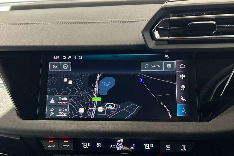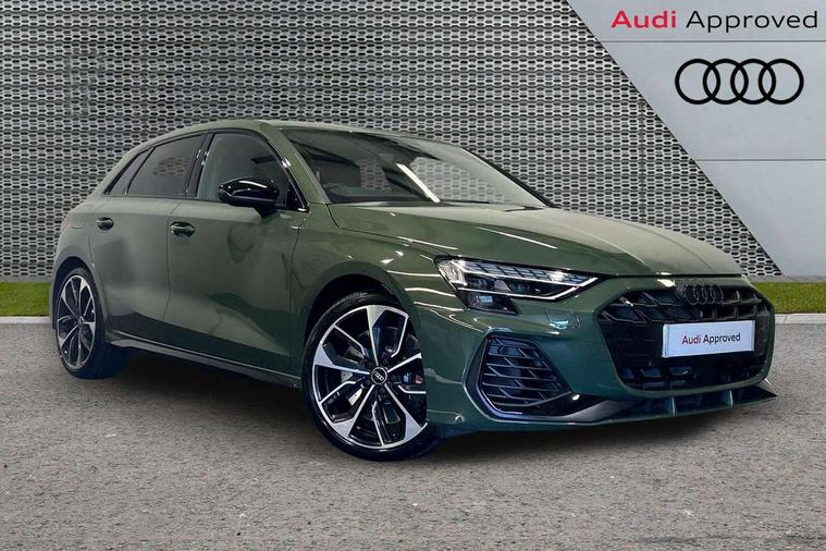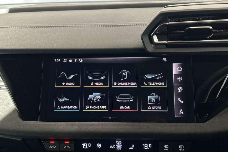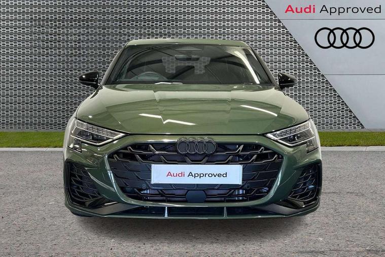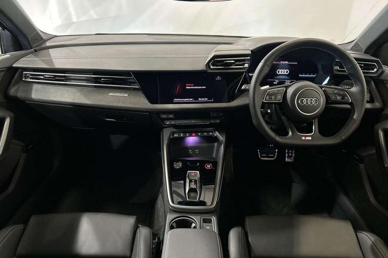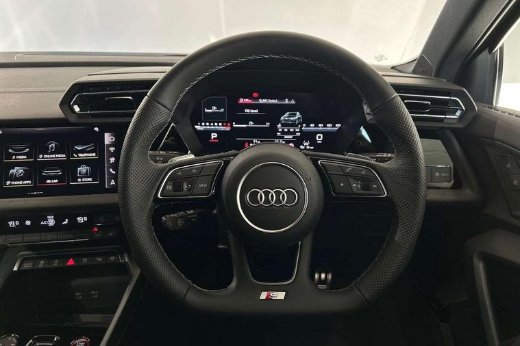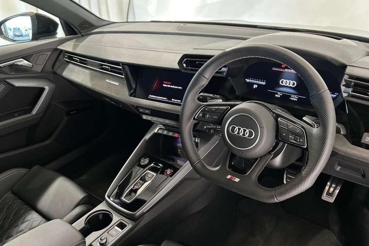 Adaptive cruise control (ACC), Adjustable speed limiter, Audi drive select (Auto, Comfort, Dynamic, Efficiency and Individual), Audi virtual cockpit plus - 12.3" full HD resolution dynamic digital instrument cluster, Automatic start/stop system with recuperation, Bluetooth interface, Camera based traffic sign recognition, Collision avoidance assistant, Driver attention and fatigue detection, e-Call (emergency call), Emergency assist, Intersection assist, Lane departure warning system, MMI Navigation Plus with high resolution 10.1" colour touch screen display, Park Assist with parking system Plus, Progressive steering, Reversing camera, Service indicator, Smartphone interface with app store includes wireless Apple carplay, Android auto and Amazon alexa integration, Trip computer, Voice control system with natural language interaction, quattro permanent all-wheel drive with torque splitter, S sport suspension with spring damper adjustment and lowering by 15mm, Audi Phonebox light with wireless charging, DAB Digital radio, USB ports with charging function in the rear, Anthracite grey Audi rings (front and rear), Audi Beam uses LEDs to project the rhombus S logo onto the ground as you exit your S3, Auto dimming frameless rear view mirror, Black accents front and rear bumpers including air inlets, Black accents in front grille and frame, Black accents in window trims, Electrically adjustable/heated/folding/auto dimming door mirrors with integrated LED indications + kerb view function for passenger side, Exterior model badging, Front and rear side air inlets in grained matt black with dark liquid chrome frame, Front electric windows, Front radiator grill in high gloss dark chrome, Heat insulating glass windscreen, Illuminated door sills with aluminium inserts at the front with S logo, LED 3rd brake light, Light and rain sensors, Privacy glass - dark tinted rear window, rear door and side windows, Rear diffuser and grill in grained matt black with inlay in dark liquid chrome, Rear electric windows, Rear side wing doors, Rear wiper, S grille, S3 front bumper with S specific air intake grilles, S3 roof spoiler, Side sill trim in dark liquid chrome, 12V socket and storage compartment in front centre console, 3 seat bench in 2nd row, 3 spoke flat bottomed leather multifunction sport steering wheel with gear shift paddles, 3-zone deluxe automatic air conditioning, 4 way electrically adjustable lumbar support for driver and front passenger, 40/20/40 split folding rear seat bench, Black cloth headlining, Black front and rear floor mats, Fine Nappa leather upholstery with front sports seats S embossed logo, Front and rear centre armrest in artificial leather with contrasting stitching on armrests and instrument panel, Front and rear headrests, Heated front seats, Height and reach adjustable steering wheel, i-Size child seat mounting on the front passenger side and outer rear seats, i-Size and top tether on the outer rear seats, Manual boot compartment lid, Manually adjustable front seats, Rear centre armrest with cupholder, S badging on the steering wheel, Seat side bolsters, Single front passenger seat, Stainless steel pedals and front footrest in black, Aluminium interior elements pack - A3, Storage package - A3, Technology pack with Matrix LED headlights - A3, 3x3 point rear seat belts, Driver and front passenger airbag with passenger airbag deactivation, Electronic Stabilisation Control (ESC) including ABS, ASR and EDL, First aid kit with warning triangle and 2 safety vests, Front side airbags with head airbags and interaction airbag, Hill hold assist, Pre-sense front with pedestrian and cyclist detection, Seatbelt monitoring, Tyre pressure loss indicator, Anti theft alarm, Anti-theft wheel bolts, Electronically operated child locks, Immobiliser, Black dashboard, Tyre repair kit,