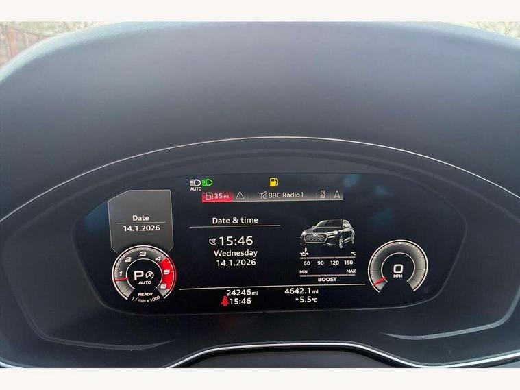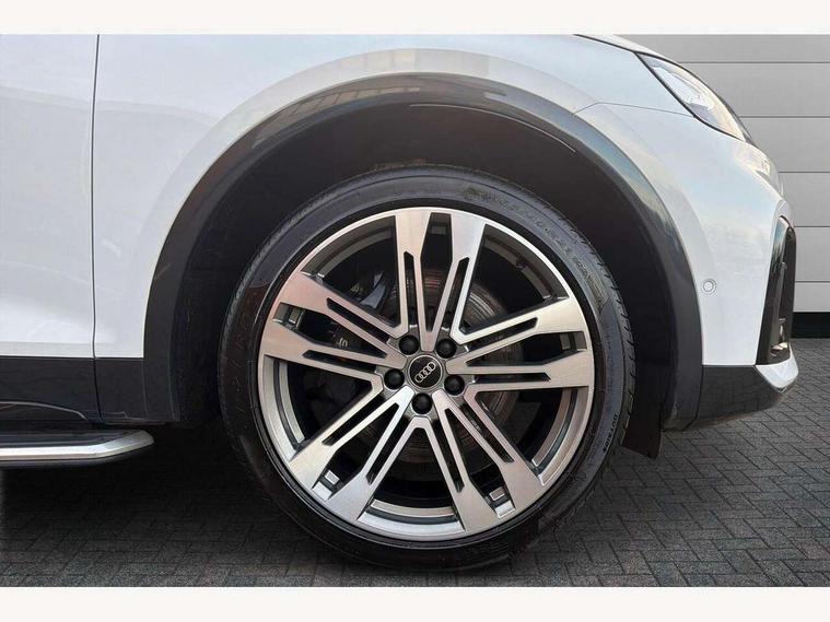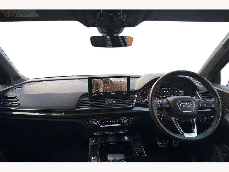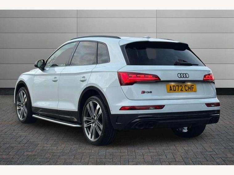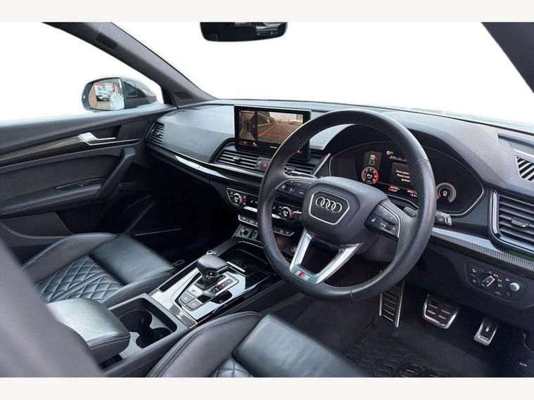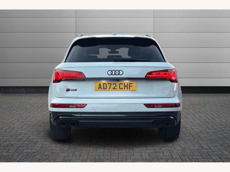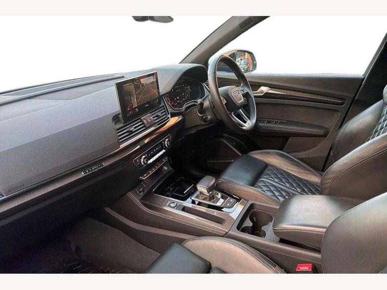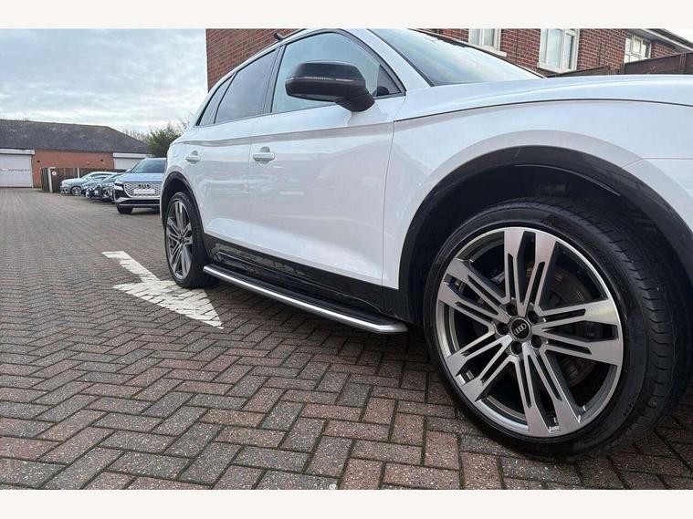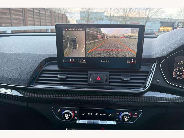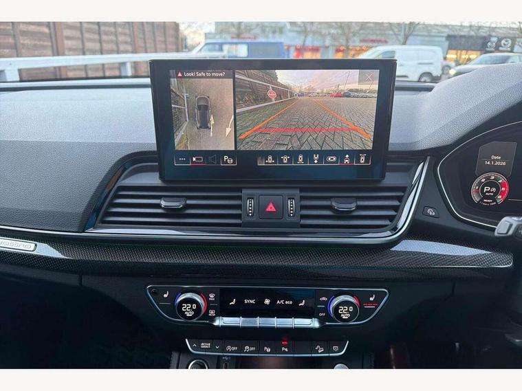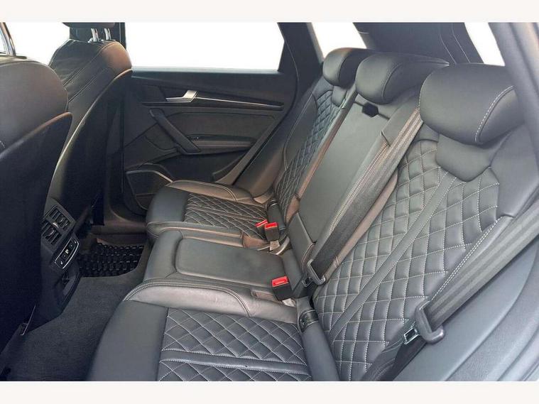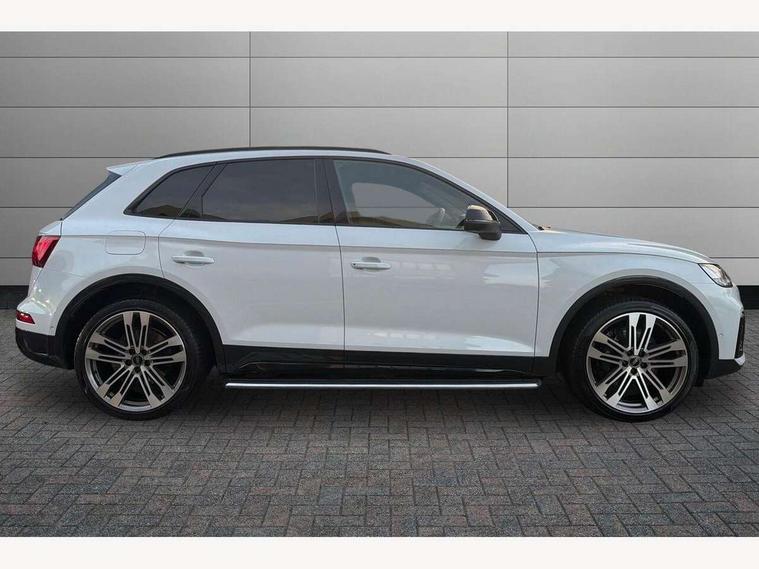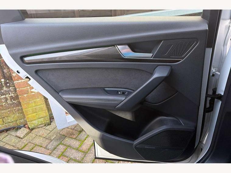 360 degree camera with top view, Advanced key with electric hands free boot opening system, Audi connect safety and service (e-call), Audi connect with Amazon Alexa Integration, Audi drive select, Audi virtual cockpit plus with 12.3" screen and three different layout designs, Audi wireless smartphone interface, Automatic start-stop system with coasting functionality and efficiency programme, Bluetooth interface, Electro - mechanical power assisted steering, Head up Display, MMI navigation plus with 10.1" touch screen, Park assist with parking aid plus, Power tailgate, Service interval indicator, Voice control system with Audi hotword activation "Hey Audi", 70 litre fuel tank and 24 litre AdBlue tank, Diesel particulate filter, Quattro with sport differential, S adaptive air suspension, Bang + Olufsen sound system, DAB Digital radio, Acoustic windscreen, Audi beam with 'Vorsprung' logo, Audi matrix LED headlights with OLED rear lights + dynamic front and rear indicators, Auto dimming door mirrors, Auto dimming rear view mirror, Automatic headlight adjustment, Automatic headlights and windscreen wipers, Black roof rails, Body colour bumpers, Body colour underbody protection, Chrome plated exhaust trims, Contrast bumpers in Manhattan grey, Daytime running lights, Door sills in Selenite silver, Electric adjustable/heated/folding door mirrors, Front air inlet surrounds in titanium black, Front and rear electric windows, Gloss black finish for Audi rings and SQ5 logos, Headlight washers, High gloss black B pillar trims and triangular rear door trim, High level LED brake light, Matrix LED headlights with dynamic front and rear indicators, Panoramic sunroof, Rear chrome trim strip below lights, Rear privacy glass and rear side windows, Rear side wing doors, Rear wiper, Roof bars, Running boards, S front and rear bumpers, S Line rear spoiler, S Line side skirts, S specific rear diffuser, 2 x USB charging port with aux input socket, 3 rear headrests, 3 spoke flat bottomed multi-function leather steering wheel, 4 way electric lumbar support for driver and front passenger, 40:20:40 split folding 3 rear bench seat in 2nd row with rear centre armrest, Black cloth headlining, Comfort front centre armrest, Contrast stitching on seats, steering wheel and gear lever gaiter, Deluxe 3 zone electronic climate control, Fine Nappa leather upholstery with diamond pattern contrast stitching + front sport seats with S embossed logo, Front/rear floor mats, Fully electrically adjustable seats, Gear lever in black leather, Heated front and outer rear seats, Height adjustable front head restraints, Illuminated door sill trims with S logo, ISOFIX child seat mounting and top tether, Luggage compartment cover, Massage function for front seats, Rear seat bench plus, Removable luggage compartment floor, Single front passenger seat, Stainless steel pedals, Sunvisors with vanity mirrors, Tool kit, Black styling package - Q5, City Assist pack - Q5, Extended interior upholstery pack - Q5, Extended LED Interior multi coloured Lighting Pack - Q5, Tour pack - Q5, 3 point seatbelts on all seats, 6 airbags - Driver, front passenger, curtain and side airbags, Electrically operated child locks on rear doors, Electromechanical parking brake, Electronic stabilisation control including ABS, ASR and EDL, Front passenger airbag deactivation, Hill descent control, Hill hold assist, Multi collision brake assist, Pop-up bonnet for pedestrian protection, Pre sense city, Seat belt force limiter, Seatbelt monitoring, Tyre pressure warning, Warning triangle and first aid kit, Anti theft alarm, Anti-theft wheel bolts, Keyless Go access/ignition system, Remote central locking, Carbon atlas inlays, Tyre repair kit,