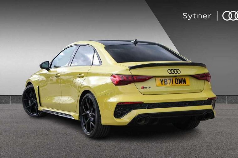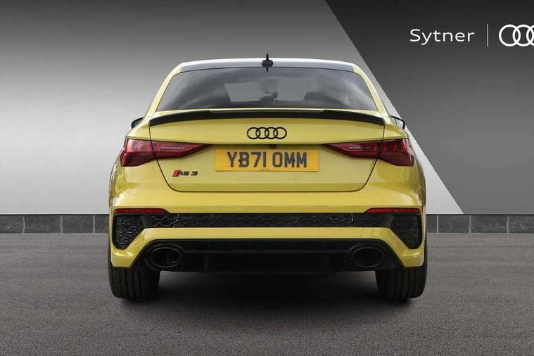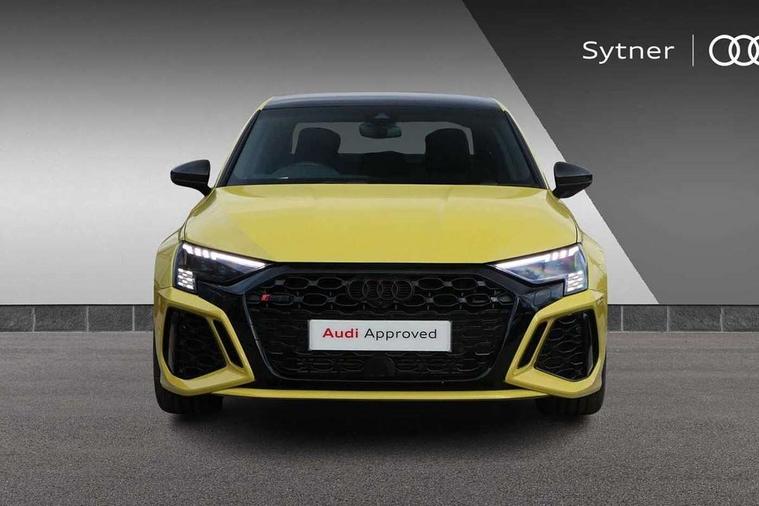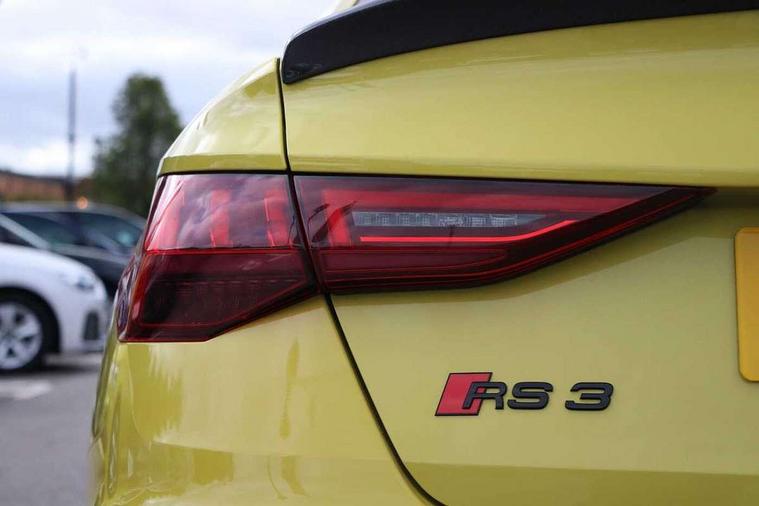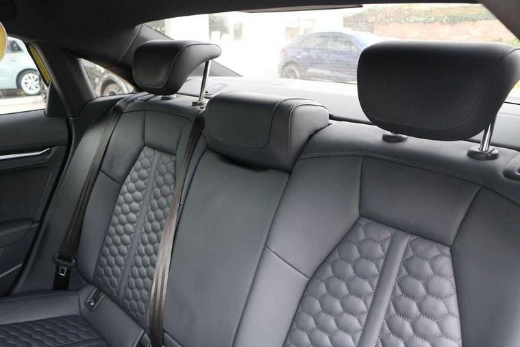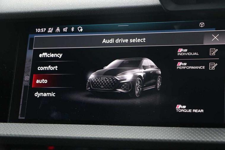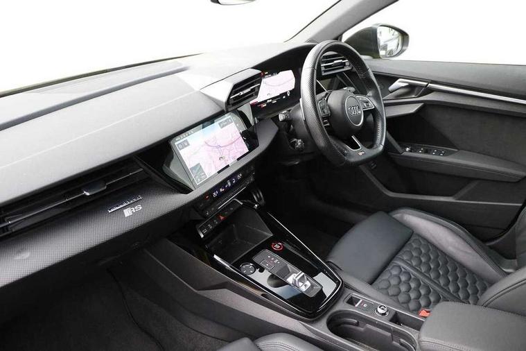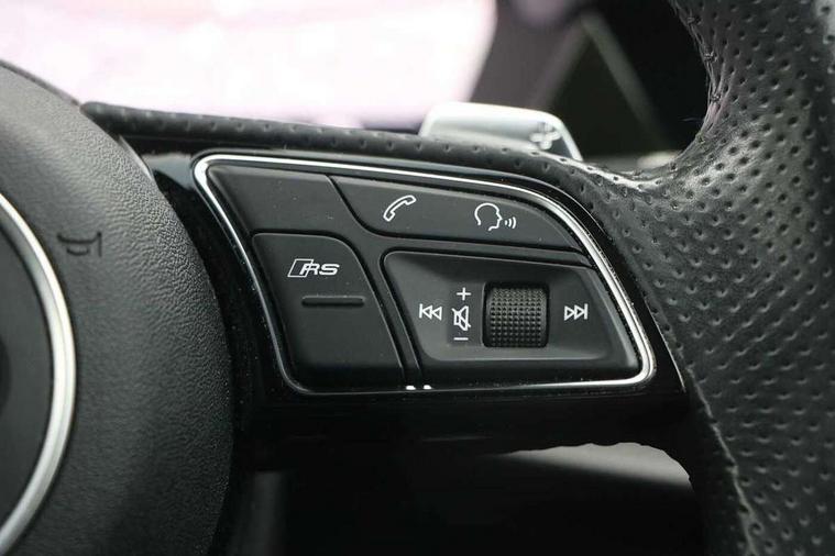 Audi connect emergency call and service, Audi smartphone interface, Audi virtual cockpit with RS specific display 12.3" full colour digital instrument cluster, Automatic start/stop system with recuperation, Bluetooth interface, Collision avoidance assistant, Lane departure warning system, Legal emergency call, Manual boot opening, Parking assist with parking system plus, Progressive power assisted steering, Quattro permanent four wheel drive, Rear suspension, Audi sound system impressive sound with 10 loudspeakers including centre speaker and subwoofer, 6-channel amplifier with a total output of 180 watts, DAB Digital radio, 3rd brake light, Acoustic glass windscreen, Audi beam uses LEDs to project the Audi sport logo onto the ground as you exit your RS 3, Audi matrix LED headlights, LED rear lights, dynamic front and rear indicators and headlight cleaning system, Auto dimming rear view mirror, Black coloured roof, Carbon exterior door mirror, Carbon fibre engine cover, Door mirrors - electrically adjustable, heated, folding and auto dimming on both sides, Front spoiler in high gloss black, Light and rain sensors, Privacy glass - dark tinted rear and rear side windows from B-pillar backwards, RS exterior features in gloss black, RS sports exhaust system, Side skirt in carbon inlay, 40/20/40 split folding rear seat bench, Black cloth headlining, Dual zone electronic climate control, Front and rear headrests, Front centre armrest, Front sports seats RS embossed logo, Front/rear floor mats, Heated front seats, Honeycomb stitching and RS embossing, Illuminated door sill trims inlays in aluminium with RS 3 logo, Manually adjustable front seats, RS emblems, Stainless steel pedals and front footrest in black, Aluminium interior elements pack - RS3, Ambient lighting pack - RS3, MMI navigation plus with MMI touch - RS3, RS bodystyling - RS3, Storage Pack - RS3, 3x3 point rear seat belts, ABS/EBD, ASR, Audi pre sense front, Driver/Front Passenger airbags, EDL, ESC - Electronic Stability Control + traction control, Front passenger airbag deactivation, Front side airbags with head airbags and interaction airbag, Hill hold assist, Seat belt reminder with passenger presence detection in rear, Tyre pressure loss indicator, Warning triangle and first aid kit, Anti theft alarm, Anti-theft wheel bolts, Electronically operated child lock, Remote control central locking, Full decorative carbon trim, 19" 5 Y spoke matt black alloy wheels, Tool kit, Tyre repair kit,