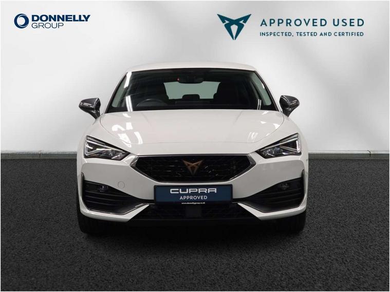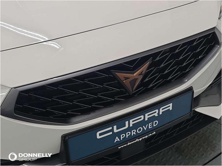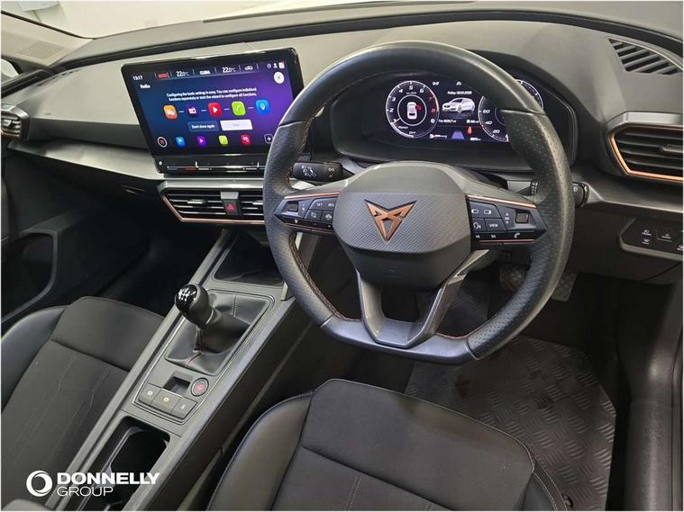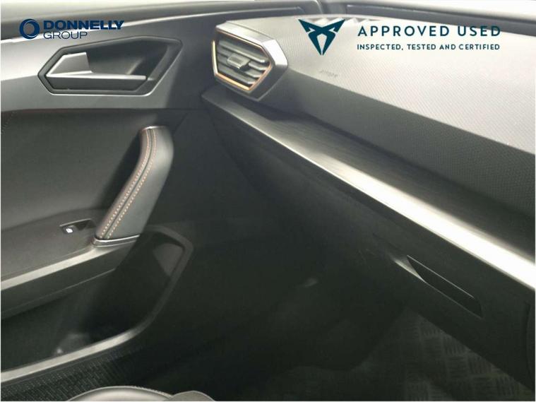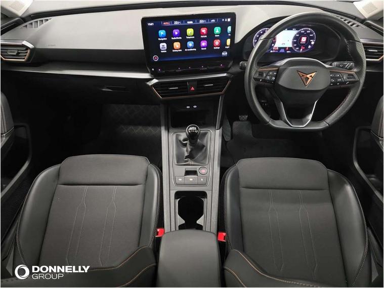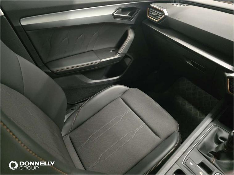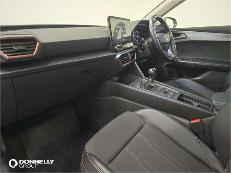 CUPRA drive profile selection with (Comfort/Sport/Individual), throttle response and gearshift mode, Digital cockpit, E-call, Electro mechanical speed sensitive power steering, Front assist with forward collision warning braking reaction to vehicles, pedestrians and cyclists, Full link smartphone integration with Mirror Link, wireless Apple CarPlay and wired Google Android Auto, Lane assist, Lockable tailgate, Park assist (inc front/rear parking sensors), Rear view camera, RPM, trip computer, outside temp gauge, instrument light brightness, low fuel warning light, lights on reminder, gearshift indicator, Service interval indicator, Start/stop system with regenerative braking, Wireless phone charger, Sports suspension, Auxiliary input socket, Auto dimming rear view mirror, Body colour door handles, Body coloured bumpers, Cupra sports bumpers, Dark tinted rear windows, Electric front/rear windows, Electrically adjustable, heated and folding door mirrors, LED front fog lamps with cornering function, LED headlights with dynamic turn signals, tail lights, rear fog lights with rear coast to coast lighting, Rain sensing wipers, Rear diffuser with twin exhaust pipe on each side, Rear side wing doors, Rear wash/wipe, Separate daytime running light with automatic headlight control and coming home feature, Third brake light, 12v power supply in centre console, 3 seat bench in 2nd row, 5 headrests, 60/40 split rear bench seat with armrest, Ambient lighting with glovebox, footwell and single monocolour, Cupra Leather flat bottomed, perforated steering wheel, Driver/passenger manual seat height adjustment, Folding boot cover, Four x USB Type C ports (2 in front and 2 in rear), Front and rear reading lights X 4, Front centre armrest, Front seats manual lumbar adjustment, Grey headlining, Height/reach adjust steering wheel, Illuminated interior front door sills, ISOFIX points in outer rear seats with top tether anchorage points, Jack and tool kit, PVC/Cloth upholstery with copper stitching, Single front passenger seat, Sports seats, Sunvisors with illuminated mirror, Three zone climate control, Media system plus with navigation pack - Leon Cupra, Safety and driving pack (M) - Cupra leon, 3 point seatbelts on all rear seats, ABS, Brake control system - ESC and brake booster, Child proof door locks, Cupra black brake calipers, Driver and front passenger airbags with front passenger airbag de-activation, front side and curtain airbags, Electronic parking brake, Extended safety system - seat belt tensioner, window closure and hazard lights, Hill hold control, Rear disc brakes, Seat belt reminder for front and rear seats, Tiredness recognition system, Tyre pressure monitoring system, Anti theft alarm system with interior monitoring in cab, backup horn and towing protection, KESSY Advanced - Keyless start, keyless entry, Locking wheel bolts, Chrome and copper interior detailing, 18" Machined sport black and silver alloy wheels with 92Y tyres,