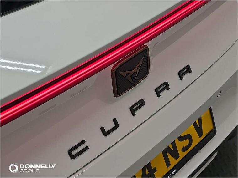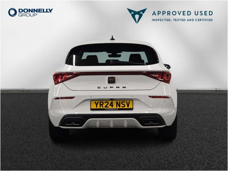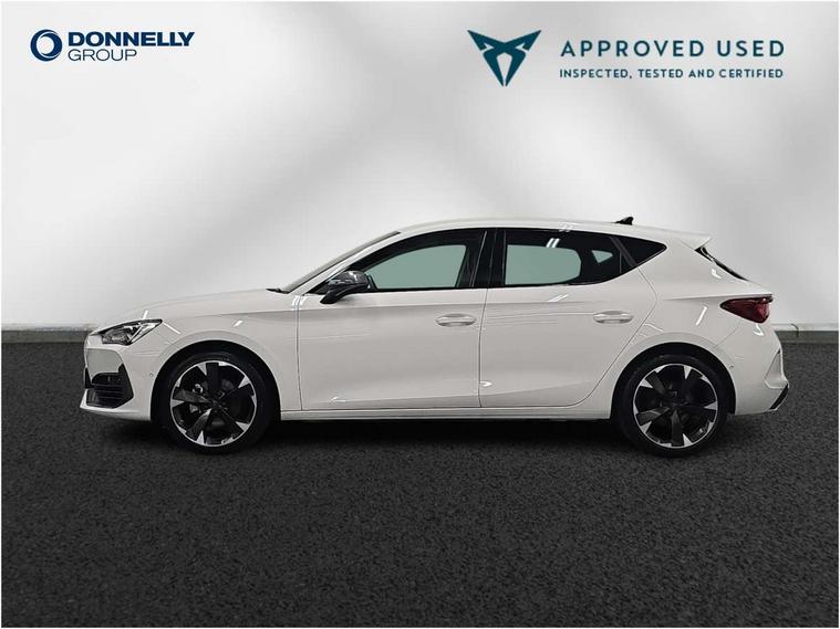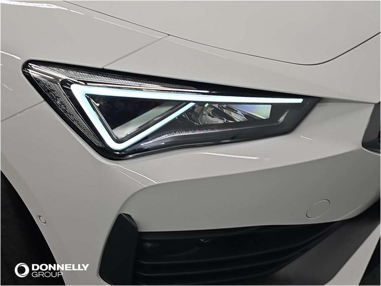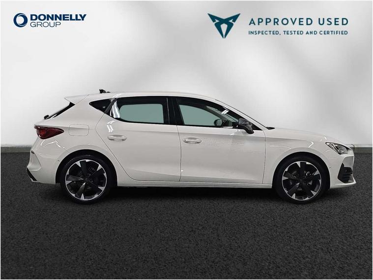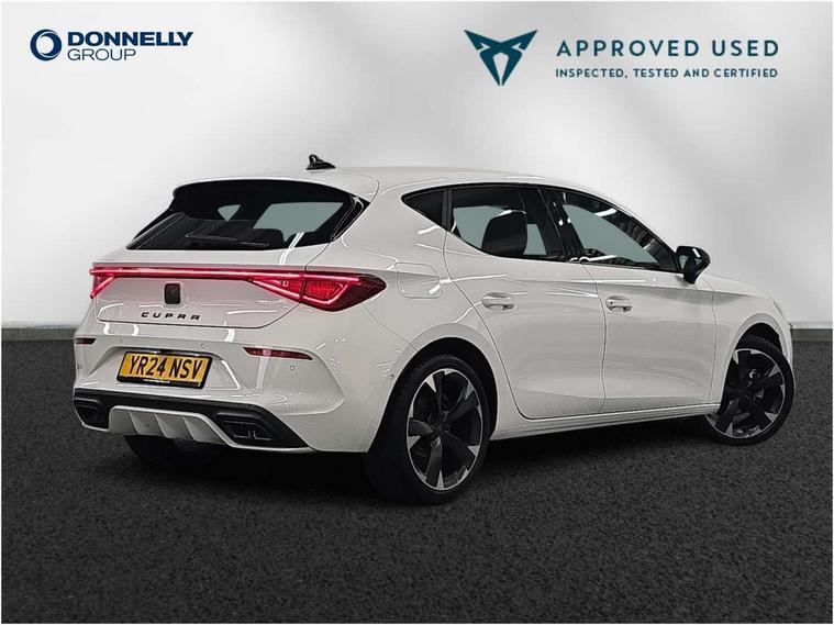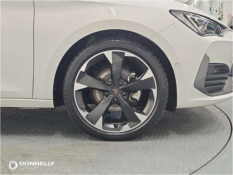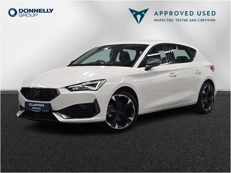 CUPRA drive profile selection with (Comfort/Sport/Individual), throttle response and gearshift mode, Digital cockpit, E-call, Electro mechanical speed sensitive power steering, Front assist with forward collision warning braking reaction to vehicles, pedestrians and cyclists, Full link smartphone integration with Mirror Link, wireless Apple CarPlay and wired Google Android Auto, Lane assist, Lockable tailgate, Park assist (inc front/rear parking sensors), Rear view camera, RPM, trip computer, outside temp gauge, instrument light brightness, low fuel warning light, lights on reminder, gearshift indicator, Service interval indicator, Start/stop system with regenerative braking, Wireless phone charger, Sports suspension, Auxiliary input socket, Auto dimming rear view mirror, Body colour door handles, Body coloured bumpers, Cupra sports bumpers, Dark tinted rear windows, Electric front/rear windows, Electrically adjustable, heated and folding door mirrors, LED front fog lamps with cornering function, LED headlights with dynamic turn signals, tail lights, rear fog lights with rear coast to coast lighting, Rain sensing wipers, Rear diffuser with twin exhaust pipe on each side, Rear side wing doors, Rear wash/wipe, Separate daytime running light with automatic headlight control and coming home feature, Third brake light, 12v power supply in centre console, 3 seat bench in 2nd row, 5 headrests, 60/40 split rear bench seat with armrest, Ambient lighting with glovebox, footwell and single monocolour, Cupra Leather flat bottomed, perforated steering wheel, Driver/passenger manual seat height adjustment, Folding boot cover, Four x USB Type C ports (2 in front and 2 in rear), Front and rear reading lights X 4, Front centre armrest, Front seats manual lumbar adjustment, Grey headlining, Height/reach adjust steering wheel, Illuminated interior front door sills, ISOFIX points in outer rear seats with top tether anchorage points, Jack and tool kit, PVC/Cloth upholstery with copper stitching, Single front passenger seat, Sports seats, Sunvisors with illuminated mirror, Three zone climate control, Media system plus with navigation pack - Leon Cupra, Safety and driving pack (M) - Cupra leon, 3 point seatbelts on all rear seats, ABS, Brake control system - ESC and brake booster, Child proof door locks, Cupra black brake calipers, Driver and front passenger airbags with front passenger airbag de-activation, front side and curtain airbags, Electronic parking brake, Extended safety system - seat belt tensioner, window closure and hazard lights, Hill hold control, Rear disc brakes, Seat belt reminder for front and rear seats, Tiredness recognition system, Tyre pressure monitoring system, Anti theft alarm system with interior monitoring in cab, backup horn and towing protection, KESSY Advanced - Keyless start, keyless entry, Locking wheel bolts, Chrome and copper interior detailing, 18" Machined sport black and silver alloy wheels with 92Y tyres,