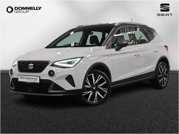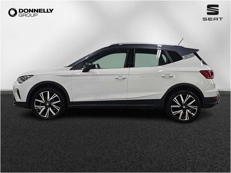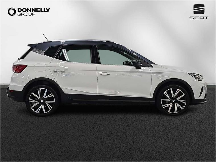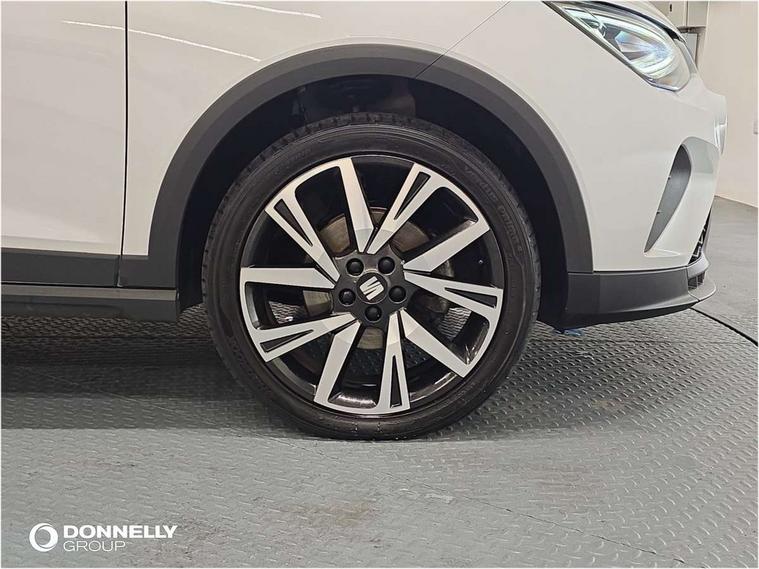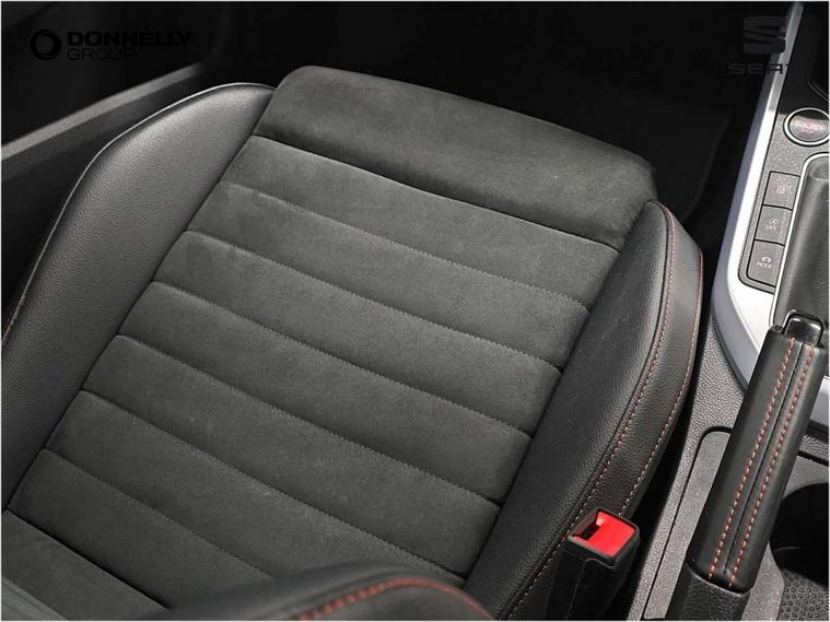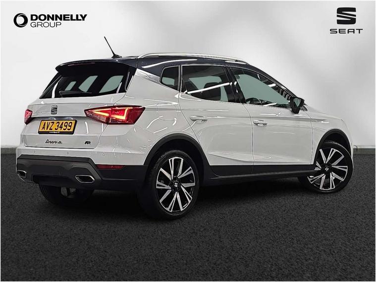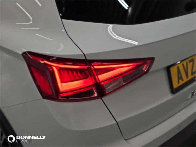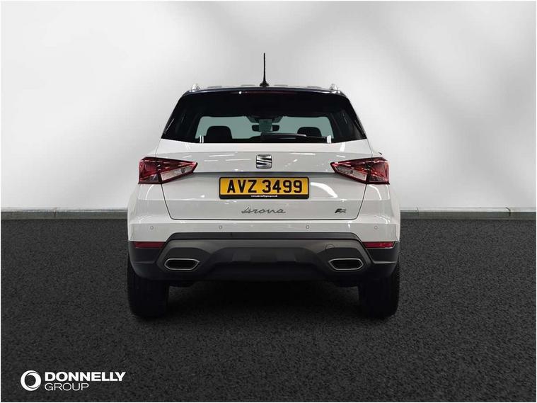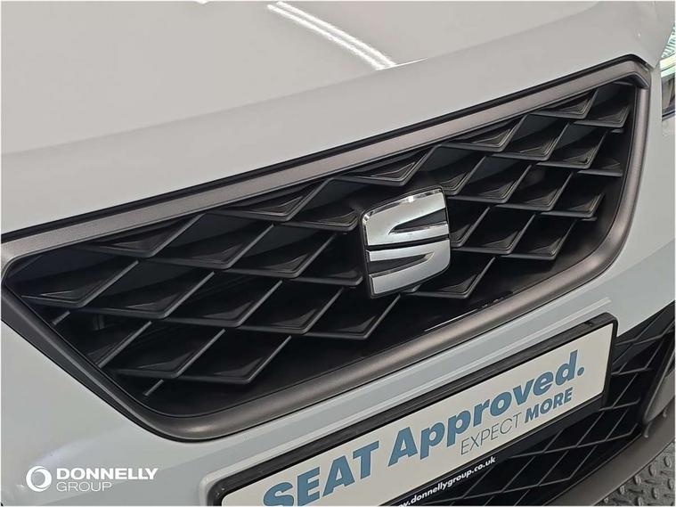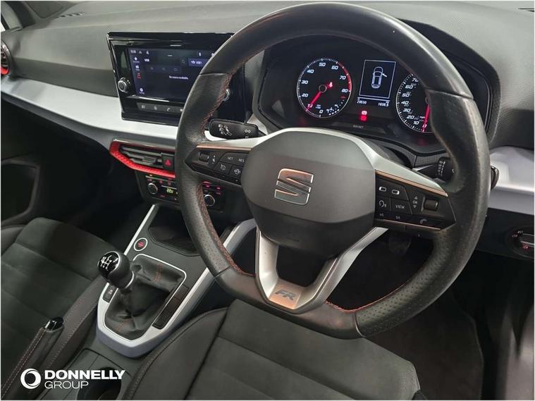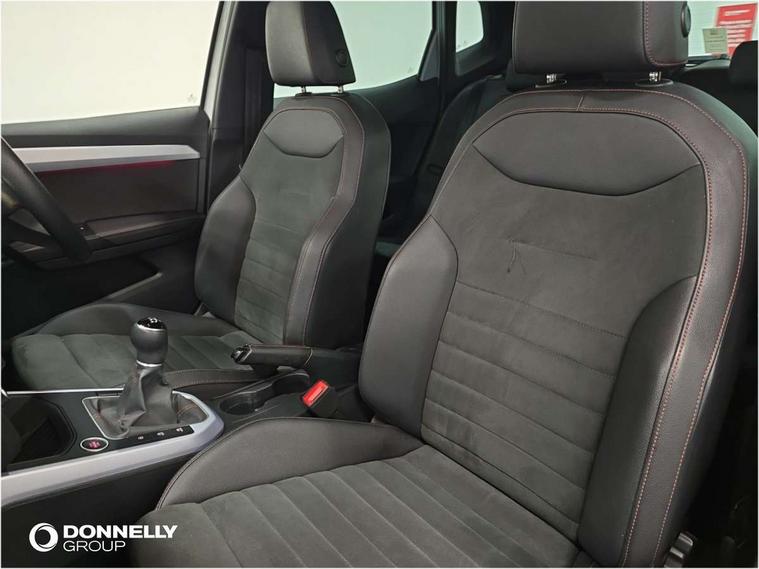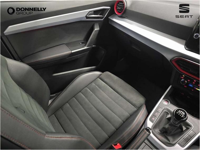'Lights On' Reminder warning buzzer, Analogue cockpit with physical dials, Digital clock, E-call, Electric speed sensitive power steering, Full Link Smartphone Integration with Mirror Link, Apple Car Play, Google Android Auto with USB Type C cable for Apple and Android compatibility, Lane keeping system, Low fuel warning light, Outside temperature display, Rear parking sensor, RPM counter, Seat connect with safety, service and remote, SEAT Drive profile - Four different models normal-sport-eco-individual, steering response, throttle response, Trip computer, Wireless phone charger, Bluetooth interface for hands free and audio streaming, DAB digital radio and AM/FM radio, Media system with 8.25" colour touchscreen with USB port (type c), Steering wheel mounted audio controls, Anti theft roof antenna, Automatic activation of hazard warning lights, Body coloured bumpers, Body coloured door handle inserts, Chrome roof rails and window surrounds, Dark tinted rear windows, Dimming rear view mirror, Electric front/rear windows, Electrically adjustable and heated door mirrors, Front fog lights with cornering function and rear fog light, FULL LED automatic headlights with dynamic headlight range control, coming and leaving home, LED daytime running lights, LED rear tail lights and licence plate lights, Protective side mouldings, Rear side wing doors, Rear spoiler, Rear window wash/wipe, Roof colour door mirrors, Third brake light, Twin exhaust pipe styling hidden exhaust pipe, Visible VIN plate, Windshield wiper with intermittent control and potentiometer, 2 cupholders, 3 seat bench in 2nd row, 60/40 split folding rear seat, Aircare filter, Black interior roof, Double boot floor, Driver sunvisor with covered mirror + card holder, Dual zone climate control, Front comfort seats, Front courtesy light with 2x front and 2x rear reading lights, Gear shift indicator, Height adjustable front seats, Height/reach adjustable steering column, Illuminated boot, Instrument lighting with brightness control, Interior ambient lighting, Interior light in footwell, central console and door panel, ISOFIX points in outer rear seats with top tether anchorage points, Microsuede cloth upholstery, Passenger sunvisor with vanity mirror, Perforated flat bottomed leather steering wheel/gear knob/handbrake with red stitching and FR logo, Single front passenger seat, Two front and three rear height adjustable headrests, Interior chrome pack - Arona, 3 point seatbelts on all rear seats, ABS, Active front headrests, Child locks on rear doors, Driver and front passenger airbags with front passenger airbag de activation, front side and curtain airbags, Electronic stability control, Emergency Brake Assist (EBA) and front assist, Front and rear seatbelt reminder, Hill hold control, Multi-Collision braking, Tiredness recognition system, Traction control, Tyre pressure monitoring system, Alarm with back-up horn, Electronic engine immobiliser, KESSY Keyless entry and go, Locking wheel bolts, Remote central locking + deadlocks, Tow away protection, Titan black dashboard,