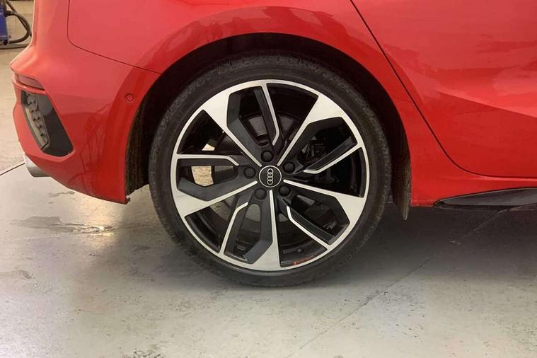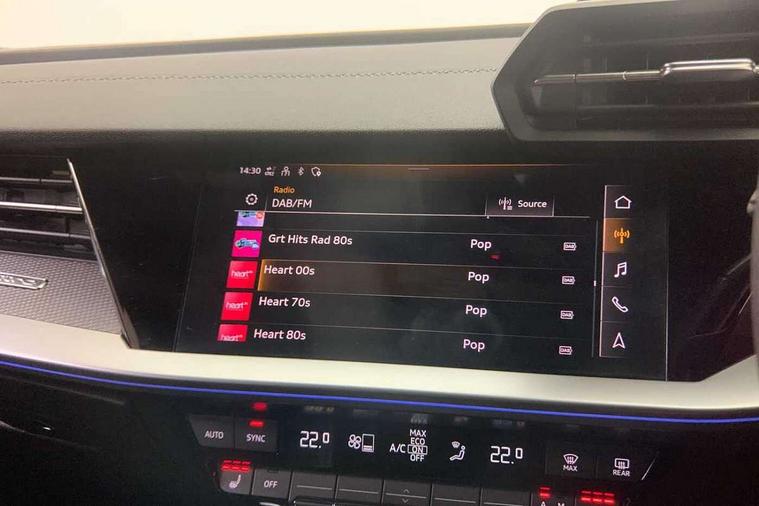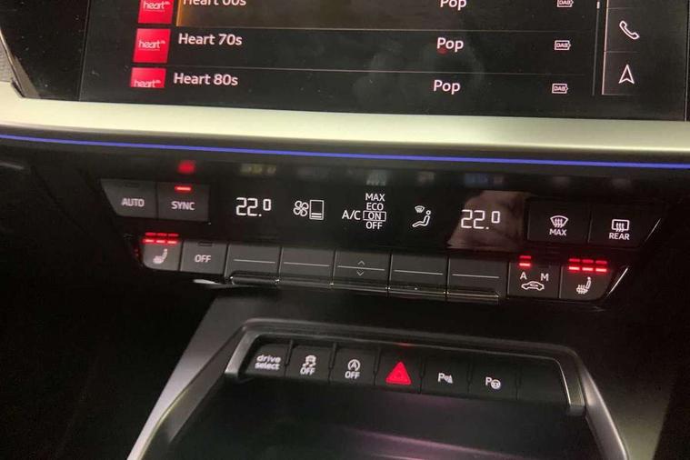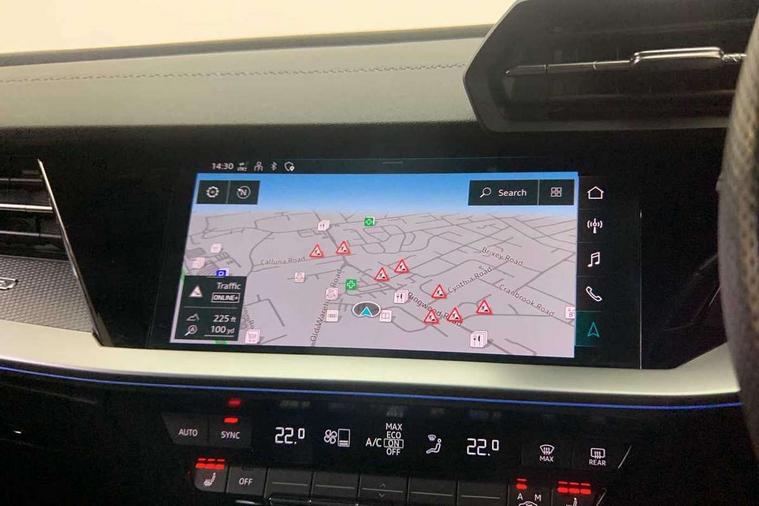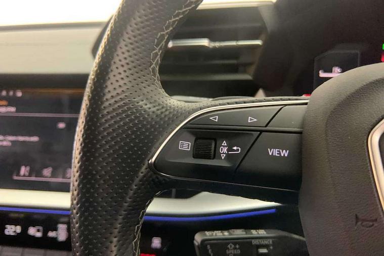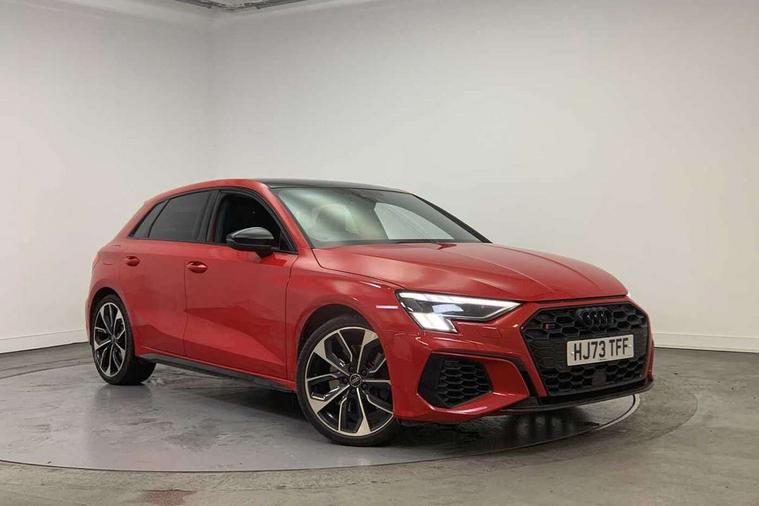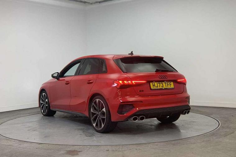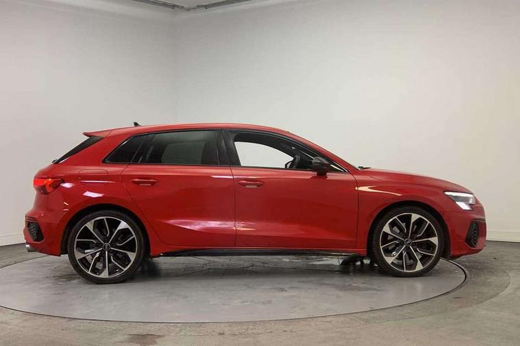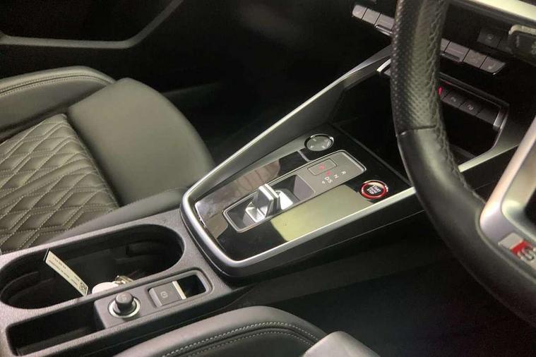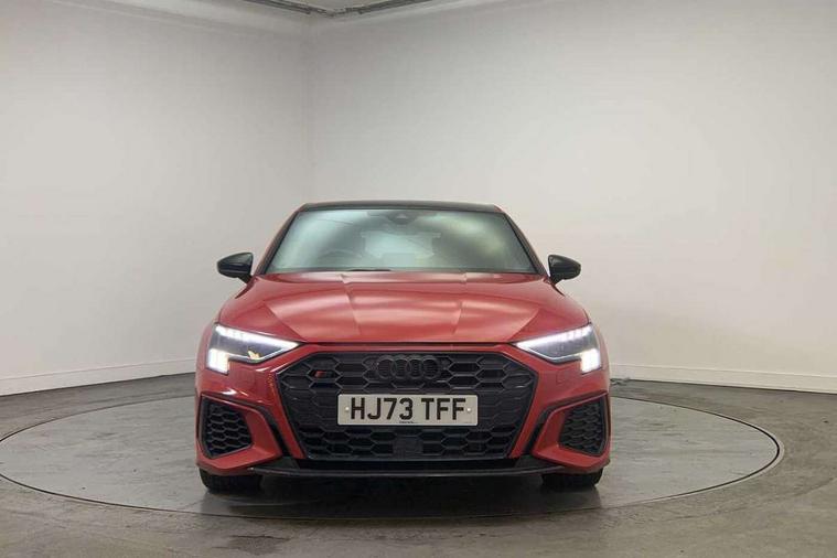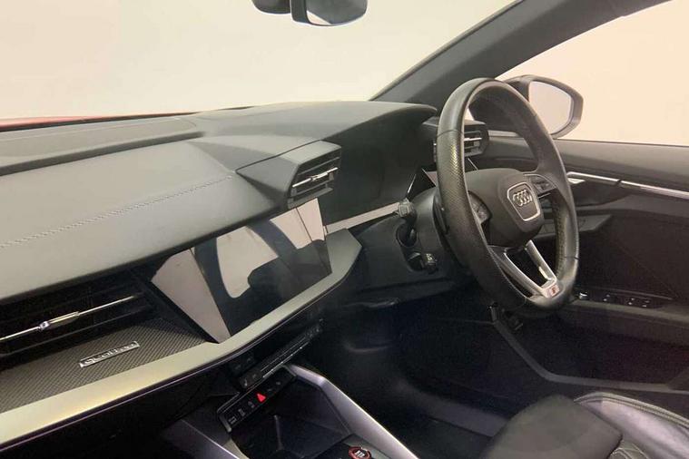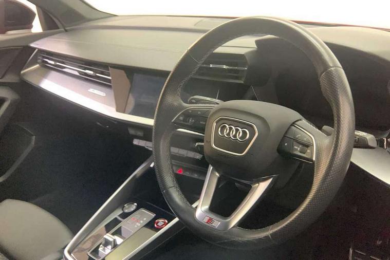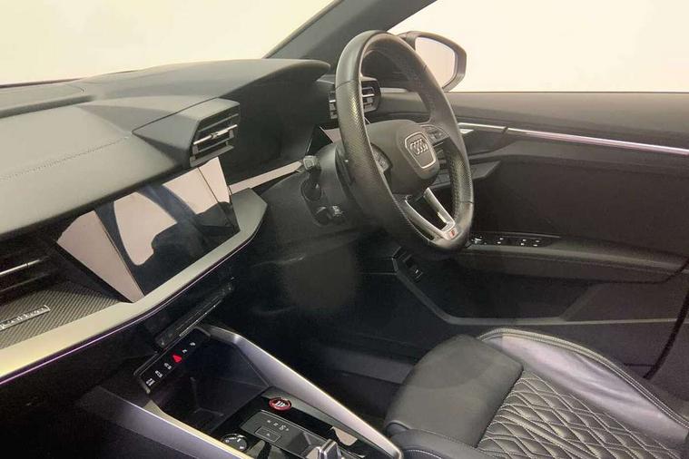 Adaptive cruise assist, Audi drive select (Auto, Comfort, Dynamic, Efficiency and Individual), Audi smartphone interface, Audi virtual cockpit plus - 12.3" full HD resolution dynamic digital instrument cluster, Automatic start/stop system with recuperation, Bluetooth interface, Collision avoidance assistant, e-Call (emergency call), Head up Display, Lane change assistant with exit warning system and rear cross traffic alert, Lane departure warning system, MMI Navigation Plus with high resolution 10.1" colour touch screen display, Power operated tailgate - Luggage compartment lid opens/closes electrically, Progressive steering, Service indicator, Trip computer, Voice control system with natural language interaction, Quattro permanent all wheel drive, S suspension with damper control, 2xUSB-C connection with data and charging functions, DAB Digital radio, 3rd brake light, Acoustic glass windscreen, Audi Beam uses LEDs to project Vorsprung onto the ground as you exit your S3, Auto dimming frameless rear view mirror, Carbon door mirror housings, Dual branch oval twin tailpipes in chrome plated finish, Electrically adj heated/folding + automatically dimming exterior mirrors with memory + automatic kerb side function for passenger side exterior mirror, Front electric windows, Headlight washers, Heat insulating glass windscreen, Illuminated door sills with aluminium inserts at the front with S logo, Integrated LED indicators in door mirrors, LED daytime running lights, Light and rain sensors, Privacy glass - dark tinted rear window, rear door and side windows, Rear electric windows, Rear side air outlets in grained matt black, Rear side wing doors, Rear wiper, 12V socket and storage compartment in front centre console, 3 seat bench in 2nd row, 3 spoke leather multifunction steering wheel with gear shift paddles, 4 way electrically adjustable lumbar support for driver and front passenger, 60/40 split folding rear seat bench, Black cloth headlining, Dual zone electronic climate control, Fine Nappa leather upholstery with front sports seats S embossed logo, Front and rear centre armrest in artificial leather, Front and rear headrests, Front/rear floor mats, Height and reach adjustable steering wheel, Interior lighting - glove compartment light and right hand side, Luggage compartment floor covering, Seat side bolsters, Single front passenger seat, Stainless steel pedals and front footrest in black, Aluminium interior elements pack - A3 Sportback, Black styling pack - A3 Sportback/S3, Body styling design pack - S3, Extended ambient lighting pack - A3 Sportback, Storage pack - A3 Sportback, Technology pack pro with 360 camera - A3 Sportback/Voursprung, 3x3 point rear seat belts, Driver and front passenger airbag with passenger airbag deactivation, Electronic Stabilisation Control (ESC) including ABS, ASR and EDL, First aid kit with warning triangle and 2 safety vests, Front side airbags with head airbags and interaction airbag, Pre-sense front with pedestrian and cyclist detection, Seatbelt monitoring, Tyre pressure loss indicator, Anti theft alarm, Anti-theft wheel bolts, Electronically operated child locks, Immobiliser, Remote control central locking, Carbon inlays, accent surfaces in the dashboard and centre console in platinum grey silk effect paint finish,