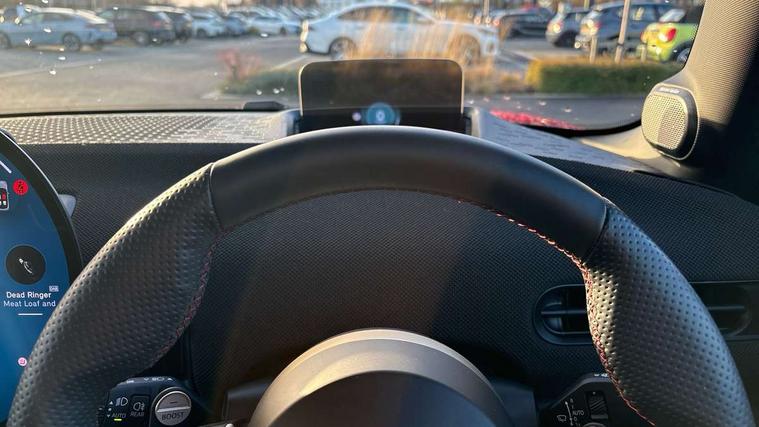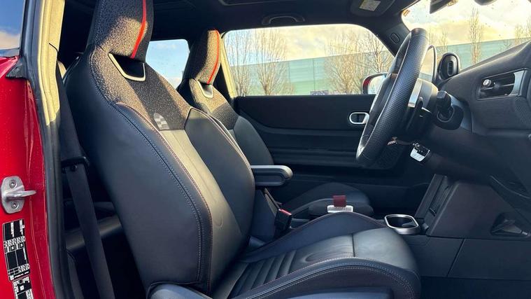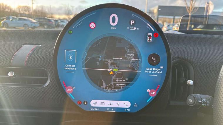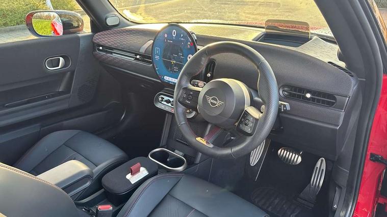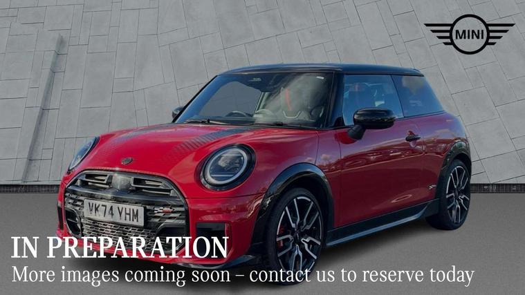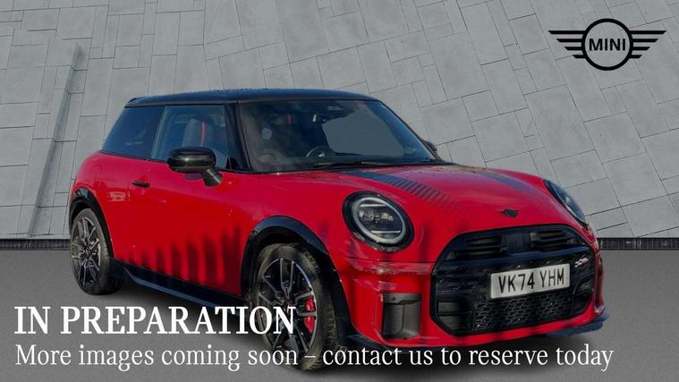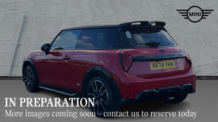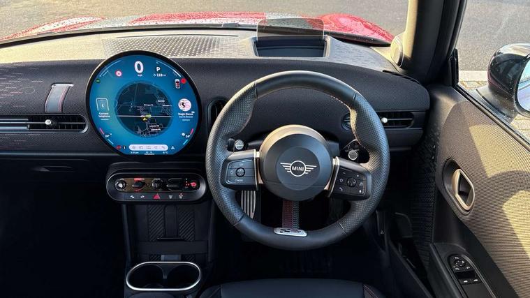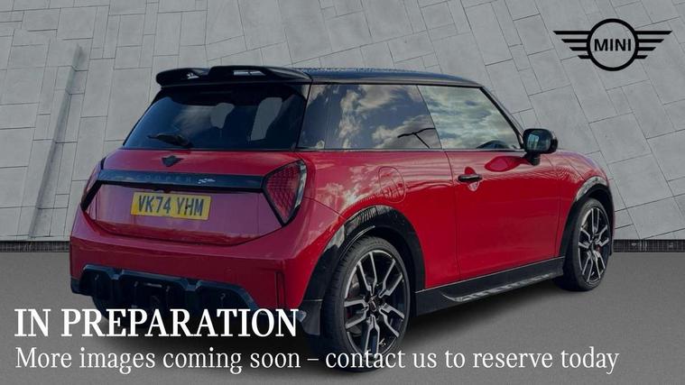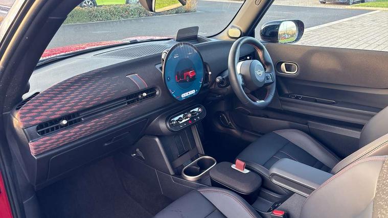 Central toggle bar, Circular OLED Screen, Compatible mobile phone bluetooth with audio streaming, Cruise control, Digital instrument cluster, Electro-mechanical speed dependant steering assistance, Emergency call service, JCW Experience mode, Mini navigation system, On board computer, Service interval indicator, Tailgate, 7 speed steptronic sport transmission with double clutch, Adaptive suspension, DAB Digital radio, Harman Kardon sound system, Personal eSim, Adaptable light signatures, Auto headlights, Central exhaust tailpipe, Electric adjustable heated door mirrors, Electric front windows, Front and rear apron, Heated rear window, Heated windscreen washer jets, High gloss black wheel arches, High gloss hexagonal patterned grille surround, JCW body kit, LED daytime running lights, LED indicator lights, LED rear lights, Rain sensor window wipers, Rear fog lights, Rear roof spoiler with airblades, Rear window wiper, 2 seat bench in second row, 2 zone automatic air conditioning, 60/40 rear seat bench, Ambient lighting, Black lower band in high gloss, Cupholders, Dark headliner, Floor mats, Front and rear head restraints, Front compact armrest, Heated steering wheel, Height adjustable passenger seat, Lidded storage box in Black/Red knit, Luggage compartment lighting, Partially perforated vescin steering wheel with red accent, black/red decorative strap, Single front passenger seat, Stainless steel pedals, Steering wheel paddle shift, Sunvisors with vanity mirrors, Vescin/Cord upholstery, Driving assistant pack - Cooper Hatchback, Level 1 pack - Mini Hatchback, Park assistant pack - Cooper Hatchback, 3 point seatbelts on all four seats, 6 Airbags - front, side, head and seat belt tensioners, Acoustic pedestrian protection, Anti-lock braking system (ABS), DSC - Dynamic Stability Control, Electronic parking brake, Front and rear disc brakes, Front ISOFIX (iSize), Front passenger airbag deactivation, JCW Sport Brakes, Red brake callipers, Traction control, Tyre pressure monitoring system, Alarm, Immobiliser, Remote central locking, Black/Red decorative dash strap, JCW Black/Red dashboard knit, Tyre repair kit,