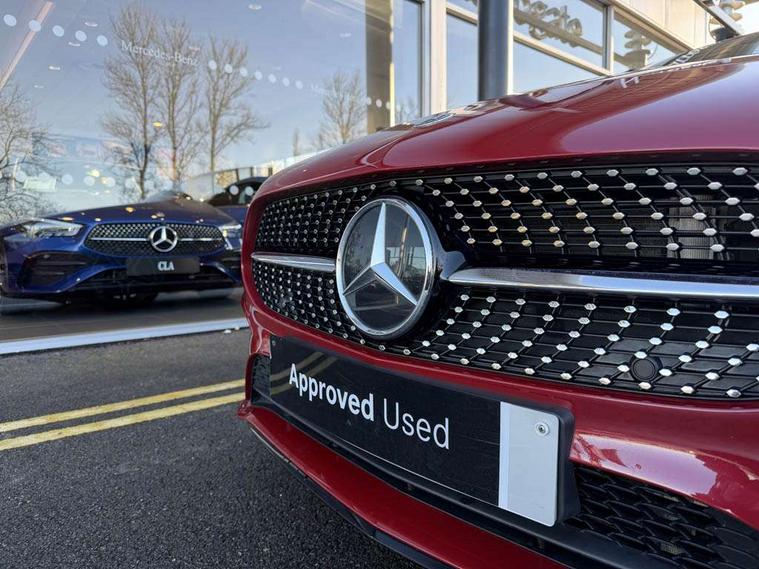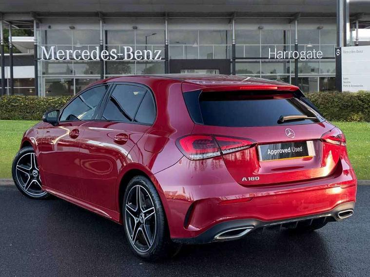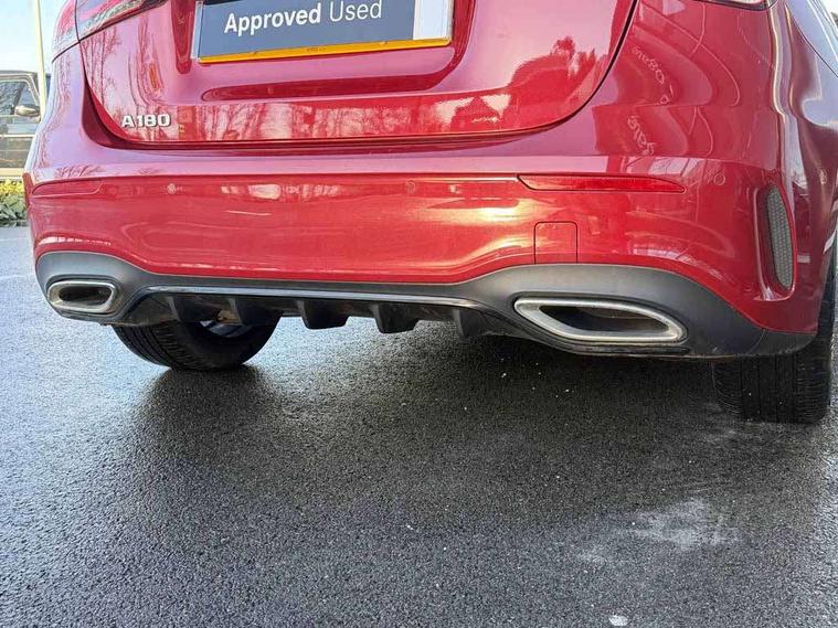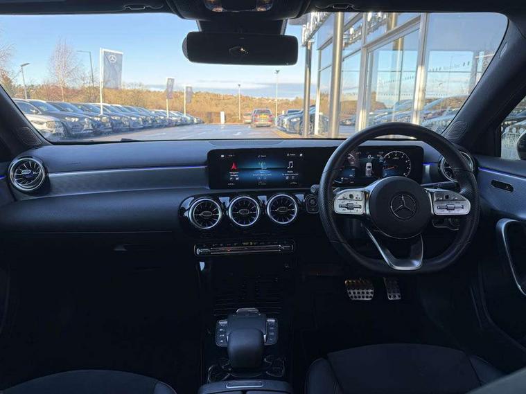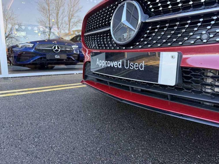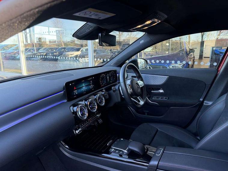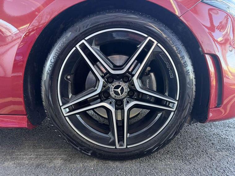 10.25" Digital instrument cluster display screen, 10.25" media display, 180 degree rear view camera with parking guidelines, Active parking assist with visual and audible warning of detected obstacles, Attention assist, Brake pad wear indicator warning light, Car wash mode, Cruise control + speed limiter, Direct steering, Dual bluetooth interfaces, DYNAMIC SELECT with a choice of driving modes (ECO, Comfort, Sport and Individual), ECO start/stop function, Fluid level warning indicator for fuel, oil, coolant and washer fluid, Hard-disk navigation, Hey Mercedes Voice activation, Lamp failure indicator, Lane keeping system, Mercedes me connect including emergency call system, accident recovery, breakdown and maintenance management, Mercedes me remote services, Outside temperature gauge, Owners manual in English, Pre-installation for private car sharing, Preinstallation for Mercedes Benz link, Service indicator (ASSYST), Smartphone integration with Apple CarPlay and Android auto, Speed limit assist, Speed sensitive power steering, Trip computer, Ultrasonic sensors positioned in the front and rear bumpers, Lowered comfort suspension, Rear axle torsion beam, 2 USB ports (type C) in rear stowage compartment and one in front of center console, 6 speakers, DAB Digital radio, MBUX multimedia system with DAB digital radio and touchpad including satellite navigation, Mercedes-Benz sound system - 100W, 4 Electric Front and Rear windows, Adaptive brake lights, AMG bodystyling - Front apron with splitter in chrome, rear apron with chrome trim and chrome visible trim elements in tailpipe, Automatic headlights, Black weather strip, Body colour bumpers, Body colour door handles with chrome inserts, Body colour side skirt, Electric adjustable and heated door mirrors with integrated LED side indicators, Exclusive diamond radiator grille, Exhaust system - Twin visible tailpipes in polished stainless steel, Headlamp assist automatic headlamp activation, Heated glass rear windscreen + timer control, LED High level third brake light, LED high performance headlamps with integrated LED daytime running lights, LED tail lamp, Privacy glass, Radio aerial, Rain sensing windscreen wipers with two sensitivity settings, Rear fog lights, Rear side wing doors, Rear wiper, 3 seat bench in 2nd row, 3 Spoke flat bottom leather multi function steering wheel with perforated leather in grip area, 40:20:40 split folding rear seats, Artico man-made leather/Microfibre Dinamica upholstery with red contrast stitching, Auto Mercedes-Benz child seat recognition sensor, Black air vents with surround in silver chrome, Black roof lining, Brushed stainless steel sports pedals with rubber studs, Controller on centre console with chrome surround, Floor mats with AMG lettering, Front centre armrest with storage compartment, Front seat backs luggage nets, Galvanished gear shift paddles on steering wheel, Heated front seats, Height/reach adjustable steering column, Illuminated Mercedes Benz lettering front door sills with changeable cover, Interior lighting - 64 colour Ambient lighting, Interior mirror with reading lamps in black and frameless, Manual height adjustable front seats, Rear head restraints, Seat occupancy sensor for front passenger seat, Single front passenger seat, Sports seats with integrated headrests, Stowage compartment in centre console with retractable cover, Sunvisors with illuminated vanity mirrors, Touchpad on center console, Twin front cupholders, Two zone thermotronic luxury automatic climate control, Light and sight pack - A Class, Mirror package - A Class, Night pack - A Class Saloon/Hatchback, Seat comfort pack - A Class, 3 rear 3 point seatbelts, ABS with Brake Assist, Active bonnet, Active brake assist includes forward collision warning system with autonomous braking, Adaptive brake assist with hold function and hill start assist, Black seatbelts, Childproof locks manually operated for rear doors and electrically operated for rear power windows, Crash responsive emergency lighting, Driver and passenger head and side airbags, Drivers knee airbag, Dual stage driver/passenger airbags, Electronic parking brake, ESP curve dynamic assist, ESP with ASR, Front and rear seatbelt reminder, Front brake callipers with Mercedes Benz lettering, ISOFIX and top tether child seat fixing points in two outer rear seats, Tyre pressure monitoring system, Warning triangle and first aid kit, Window airbags, Alarm system/interior protection/immobiliser, Keyless Go, Remote central locking and crash sensor with emergency opening function, Urban guard vehicle protection system with immobiliser and interior protection, Matrix look light longitudinal grain aluminium trim element, 18" AMG 5 twin spoke light alloy wheels aerodynamically optimised painted in black with highsheen finish, Summer tyres, Tirefit sealant kit,