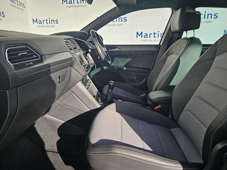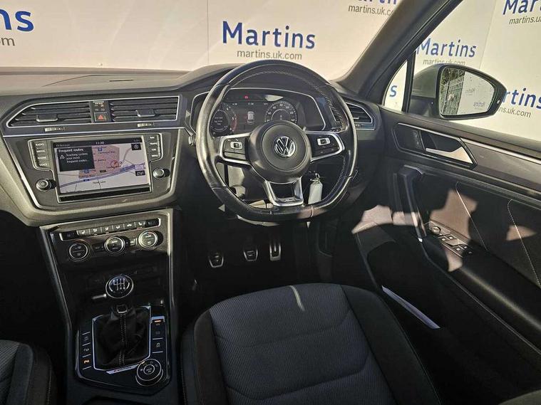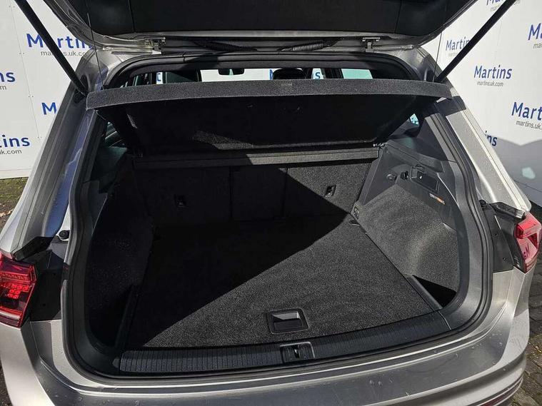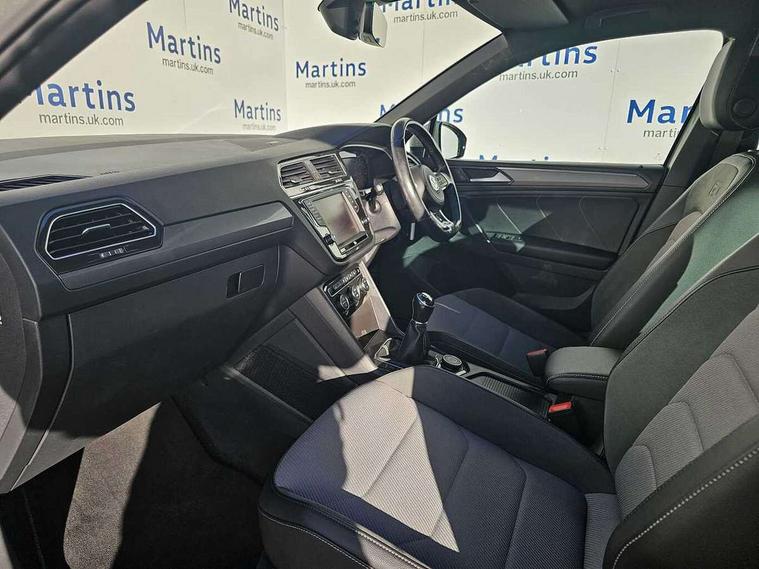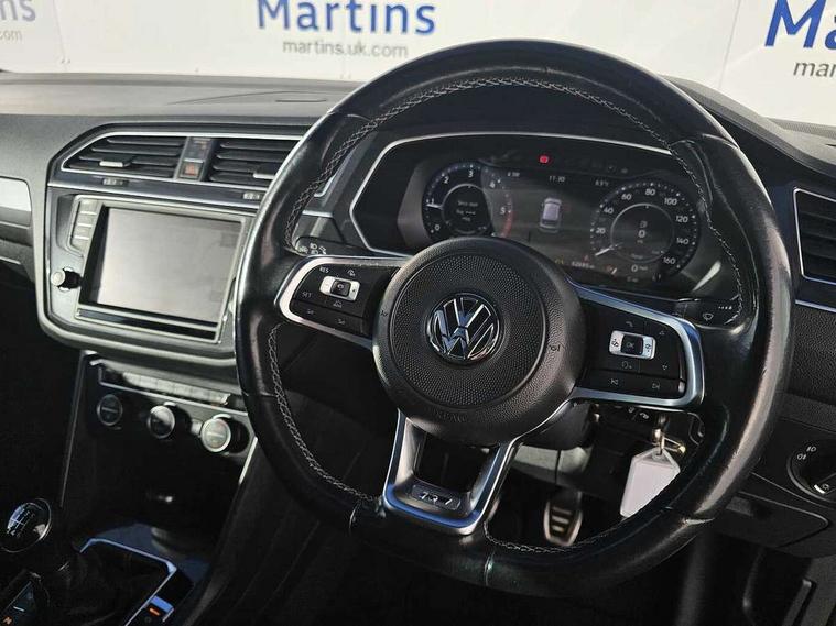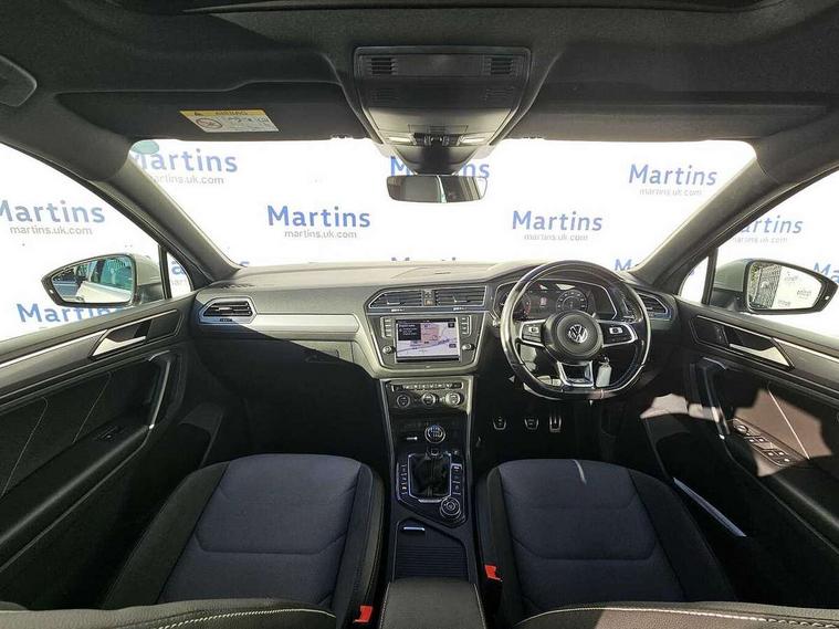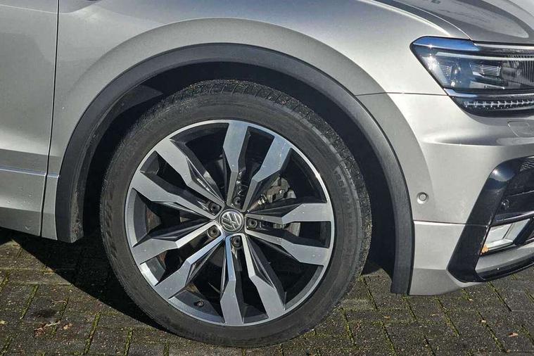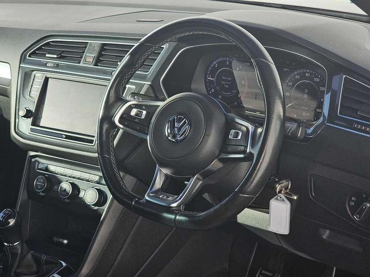 Active information display, Adaptive cruise control, App-Connect, Bluetooth phone integration system, Instrument cluster, Lane assist, Low washer fluid warning light, Outside temperature display, Service interval indicator, Warning lights, Diesel particulate filter, Sports suspension, Aux-in socket, DAB Digital radio, SD card slot, USB connection, Auto dimming interior mirror, Body colour door handles, Body colour door mirrors, Body colour rear spoiler, Body coloured bumpers, Chrome side window surrounds, Chrome trimmed radiator grille, Coming/leaving home lighting function, Dual chrome exhaust, Electric folding door mirrors, Electric heated + adjustable door mirrors, Electric panoramic sunroof with sunblind, Front and rear electric windows, LED headlights with dynamic light assist daytime running lights and cornering front fog lights, LED rear lights, Piano black rear diffuser, R Line body kit, Rain sensor windscreen wipers, Silver roof rails, Silver under body guard, Tinted windows (B pillar backwards), Twin trapezoid chrome exhaust pipes, 3 rear headrests, 3 zone climate control, 4 load lashing points, 40:20:40 split folding rear seats, Bag hook in luggage compartment, Black headlining, Driver + front passenger lumbar support, Front + rear carpet mats, Front centre armrest with 12v socket, Front centre armrest with storage + rear 2 air vents + cupholders, Front seatback folding tables, Height adjustable front seats, Height/reach adjust steering wheel, Illuminated driver/passenger vanity mirrors, Illuminated scuff plates, Interior light with delay, Isofix Preparation 2 Rear child seats, Leather gear knob, Leather multifunction steering wheel, Lockable cooled glovebox, Luggage compartment lighting, Map pockets on front seats, Rear cupholders, Removable luggage cover, Sliding/reclining rear seats, Stainless steel pedals, Storage compartment in driver's door, Storage compartment in passenger's door, Storage drawers under front seats, Storage tray on dashboard, Sunglasses storage, Variable boot floor, Ambient lighting pack - Tiguan, 3 rear 3 point seatbelts, ABS+EBD+Brake assist, Active bonnet, Active pedestrian safety system, Curtain airbags, Driver/Front Passenger airbags, Driver/Passenger whiplash optimised head restraints, Drivers knee airbag, Electronic parking brake with auto hold, ESP with EDL + ASR, First aid kit, Front assist including city emergency braking, Front side airbags, Head airbag system, Height adjustable front 3 point seatbelts + pretensioners, Hill hold control, Passenger airbag deactivate switch, Passenger knee airbag, Pre crash system, Rear side airbags, Seatbelt warning lamp and buzzer, Warning triangle, Alarm with interior protection, Electronic engine immobiliser, Chrome door trim inserts, Piano black interior trim, 20" Suzuka alloy wheels + anti theft wheel bolts, Steel space saver spare wheel,