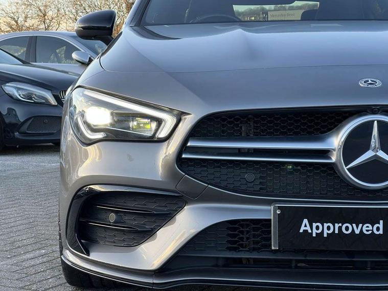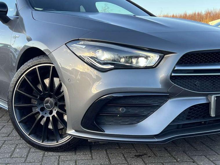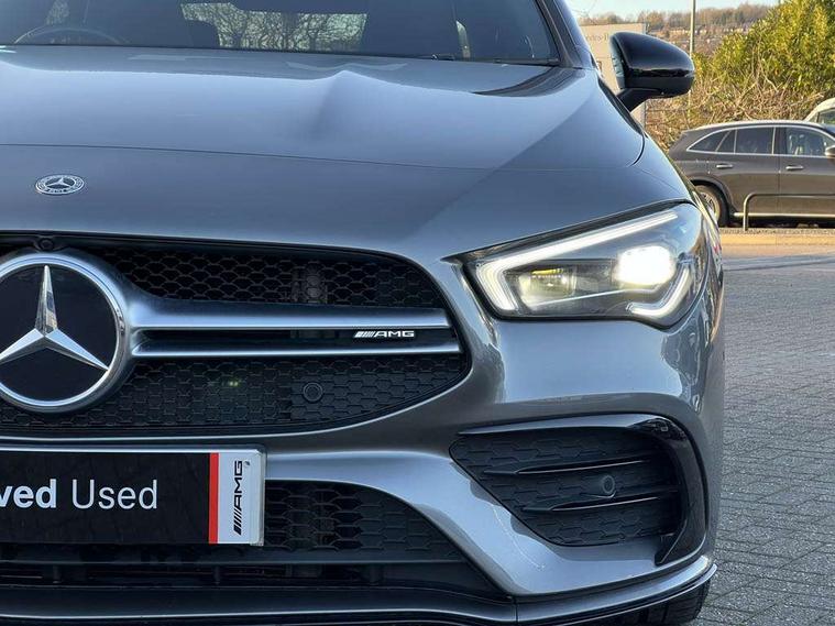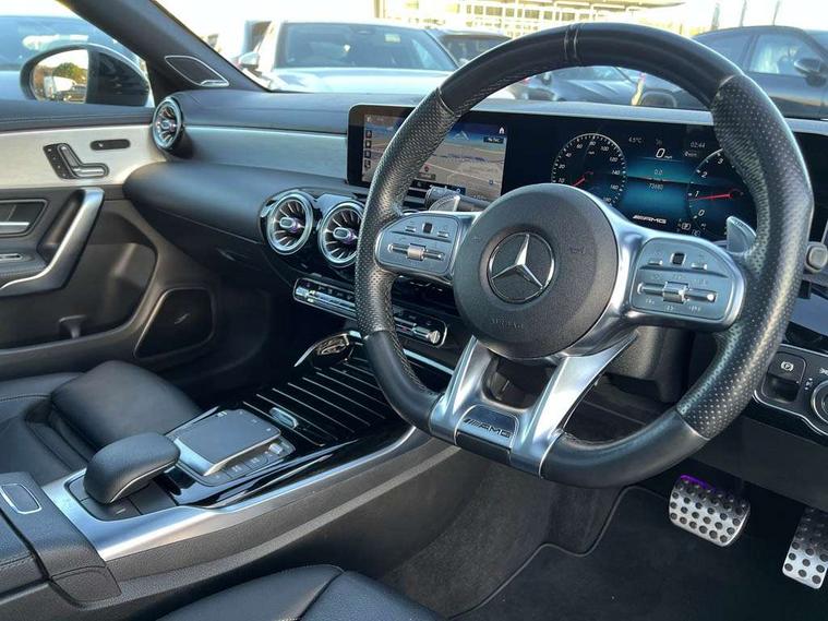 10.25 inch Instrument display with digital cockpit, 10.25 inch touchscreen central media display, Attention assist - Monitors steering behaviour and long journey fatigue, Digital instrument cluster with three AMG display styles and AMG menu, Dual bluetooth interfaces, DYNAMIC SELECT with driving programs (Slippery, Comfort, Sport, Sport+ and Individual), ECO start/stop function, Fluid level warning indicator for fuel, oil, coolant and washer fluid, Hard-disk navigation, Hey Mercedes Voice activation, Lamp failure indicator, MBUX augmented reality for navigation, Mercedes me connect including emergency call system, accident recovery, breakdown and maintenance management, Outside temperature gauge, Owners manual and service booklet in English, Pre-installation for Vehicle Monitoring, Pre-installation for Vehicle Setup, Pre-installation of private car share, Preinstallation for Mercedes Benz link, Radio aerial integrated into front and rear windshields, Service indicator (ASSYST), Smartphone integration with Apple CarPlay and Android auto, Traffic sign assist, Trip computer in multifunction display with current consumption indicator, Wireless charging, 7G-DCT 7 speed automatic transmission, AMG suspension, Rear axle multi-link, Suspension with adaptive damping system, Burmester surround sound system (590W) with premium mid range speaker, tweeter, 2 speakers in C pillars, subwoofer, DSP amplifier + burmester letter, DAB digital radio tuner, MBUX multimedia system with DAB digital radio and touchpad including satellite navigation, USB (type C) ports (2) in stowage compartment and 1 in front of centre console, Adaptive brake lights, AMG body styling with AMG front apron and rear apron and visible exhaust tailpipe in chrome trim elements, AMG bodystyling side skirts, AMG Front apron with flics as air deflector elements on the outer air intakes, AMG radiator grille with twin blade lamella and AMG Lettering, AMG Rear apron with specific diffuser look with four vertical fins and two round chrome plated tailpipe trim elements with a diameter of 90 mm, AMG Sports exhaust system with two round tailpipes measuring 90 mm in diameter attached in rear apron, AMG lettering plus ribbing on the inside of the, Beltline strips in High gloss Black, Body colour bumpers, Body colour door handles, Chrome weather strip, Electric windows, Electrically adjustable and heated door mirrors with integrated LED indicators, Front wings with TURBO 4MATIC lettering, Headlamp assist automatic headlamp activation, Heated glass rear windscreen + timer control, High level LED third brake light, Integrated LED daytime running lights, LED tail lamp, Multibeam LED headlamps with adaptive highbeam assist plus, Privacy glass with dark tinting on rear side windows and rear window, Rain sensing windscreen wipers with two sensitivity settings, Rear fog lamp, Vehicle Monitoring, Vehicle Setup, Window line trim strip in high gloss black, 40:20:40 split folding rear seat backrests, Air conditioning - Two zone thermotronic luxury automatic climate control with display, Air vents with surround in silver chrome, AMG Performance steering wheel in nappa leather, Automatic child seat recognition sensor, Black roof lining, Brushed stainless steel sports pedals with rubber studs, Electrically adjustable front memory seats including lumbar support, Floor mats with stitched AMG lettering, Front centre armrest with stowage, Front seat cushion length adjustment, Heated front seats, Illuminated glove compartment stowage, Illuminated Mercedes benz door sills with Mercedes Benz lettering, Interior lighting - 64 colour Ambient lighting, Luggage net on driver/front passenger seat backrest, Manually height and reach adjustable steering column, Rear armrest with two integral cup holders for drinks, Rear head restraints, Rear interior lamp, Silver coloured aluminium gear shift paddles on steering wheel, Spectacles compartment for driver, Sport seats with fixed head restraints, Stowage compartment in centre console with retractable cover, Sunvisors with illuminated vanity mirrors, Touchpad on center console, Twin front cupholders, Two outer rear seat isofix and top tether child seat fixing points, Aerodynamics pack - CLA, AMG Night package - CLA 35/45, Keyless go pack - CLA, Light and sight pack - CLA, Mirror pack - CLA, Parking package - CLA, Seat comfort pack - CLA, Active bonnet pedestrain safety measure which detects an impact and raises bonnet by 65mm, Adaptive brake assist with hold function and hill start assist, Anti-lock braking system (ABS), Black seat belts, Bonnet with power domes, Brake pad wear warning indicator, Childproof locks manually operated for rear doors and electrically operated for rear power windows, Crash responsive emergency lighting, Driver and front passenger head and sidebags, Driver and front passenger windowbags, Drivers knee airbag, Dual stage driver and front passenger airbags, Electric parking brake, Electronic stability programme with acceleration skid control, ESP curve dynamic assist, Front and rear seatbelt reminder, Front brake calipers with AMG lettering, Front passenger seat occupancy sensor, Perforated front brake discs, Three point rear seat belts, Tyre pressure monitoring system, Warning triangle and first aid kit, Alarm system with immobiliser and interior protection -Thatcham category 1, Remote central locking and crash sensor with emergency opening function, Light aluminium with longitudinal grain interior trim, 19" AMG multi-spoke matt black painted light alloy wheels with high sheen finish, Summer tyres, Tirefit tyre sealant kit, Wheel arches wider for AMG wheels,