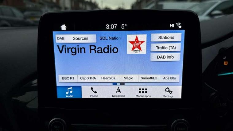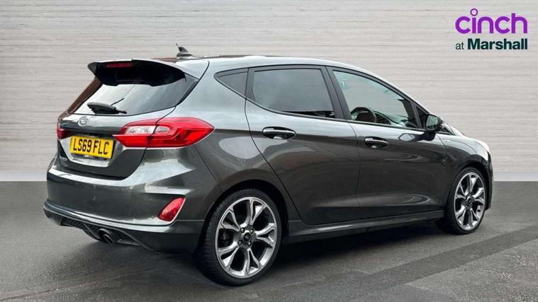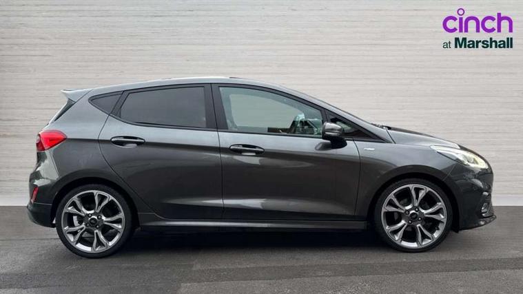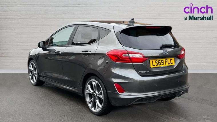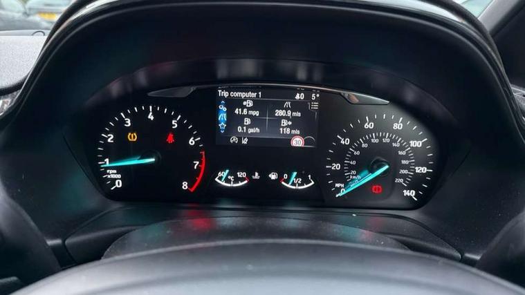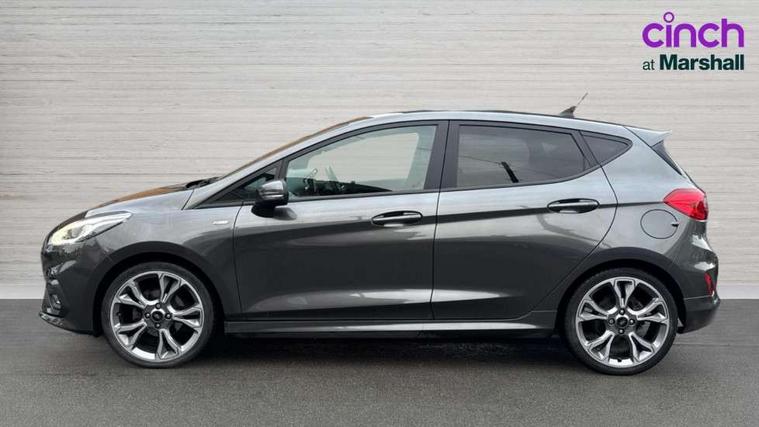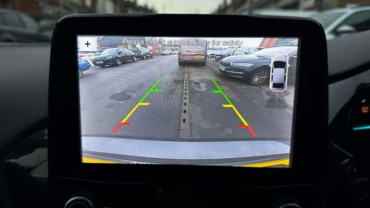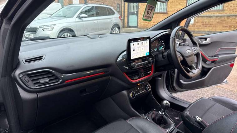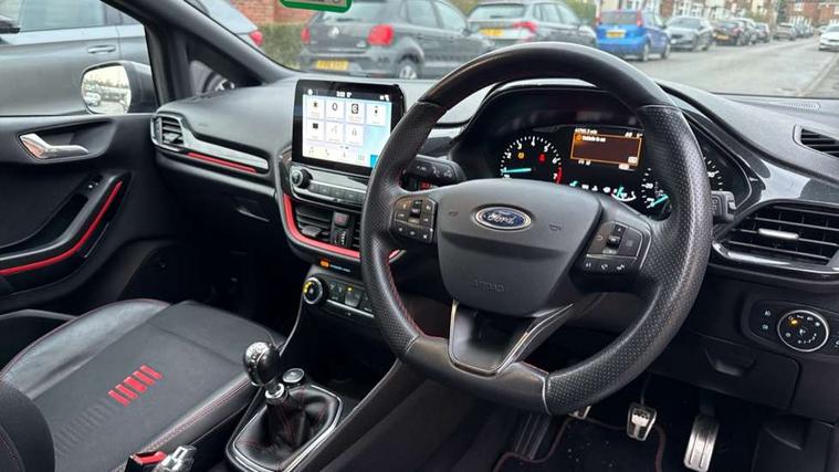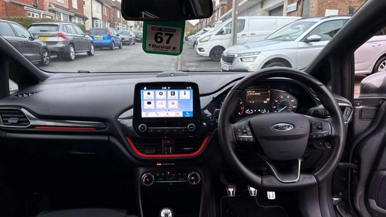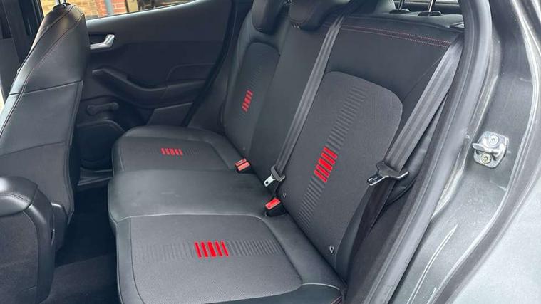 Bluetooth system, Electric power steering, Ford easy fuel, Trip computer, Sports suspension, 2 USB ports, Auxiliary input socket, DAB Digital radio, Steering wheel mounted controls, Auto dimming rear view mirror, Body colour bumpers, Body colour door handles, Body colour large rear spoiler, Chrome door handles, Chrome lower window surround, Cornering front fog lights, Electric front windows/one touch facility, LED Night signature to rear lights, LED rear lights, Power foldable door mirrors with puddle lights, Privacy glass, Quickclear heated windscreen, Rain sensing wipers and auto dimming rear view mirror, Rear privacy glass, Rear wiper, Rugged body styling kit with active front wing badges, Tinted glass, Unique ST-Line upper grille & full bodystyling kit with ST-Line wing badges, 12V Accessory socket in centre console, 3 spoke flat bottomed leather steering wheel, 60/40 split folding rear seat, Adjustable head restraints, Black headlining, Boot carpet, Centre console with armrest and illuminated cupholders, Chrome inner door handles, Drivers and Passenger lumbar support, EATC - Electronic Auto Temperature control, Footwell illumination, Front and rear velour floor mats, Front map reading lights, Front seat and rear pockets, Illuminated glovebox, Leather gear knob, Leather trimmed handbrake handle, Load area light, Overhead console with sunglasses holder, Pollen filter, Rake/reach adjustable steering wheel, Rear centre head restraint, Sports front seats, Sports pedals, Driver assistance pack - Fiesta/Titanium/Titanium X/Active B+O/Active X/ST-Line X, NCAP Pack - Fiesta, Red pack - Fiesta ST-Line X, 3 point seatbelts on all rear seats, ABS+EBA, Curtain airbags, Driver and passenger airbags, Drivers knee airbag, Electronic stability control with hill start assist, Front passenger airbag deactivation, Front side airbags, Seatbelt warning, Tyre pressure monitoring system, MyKey system, Remote central locking & engine immobiliser, Thatcham Cat.1 alarm,