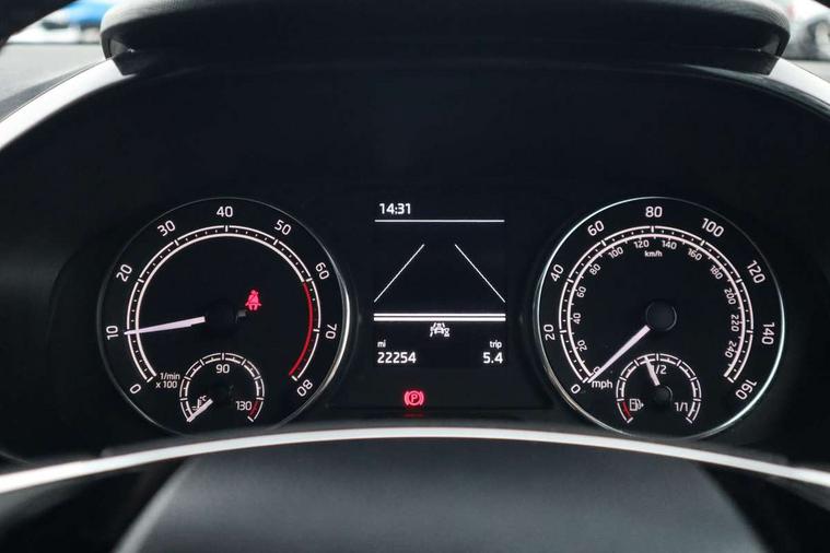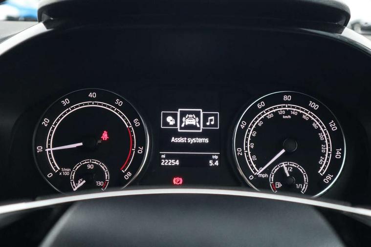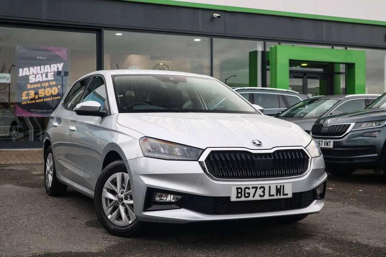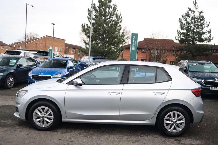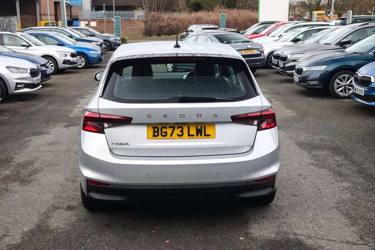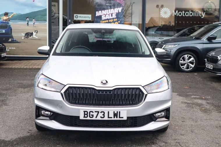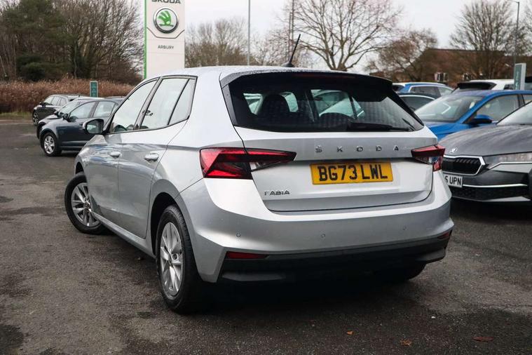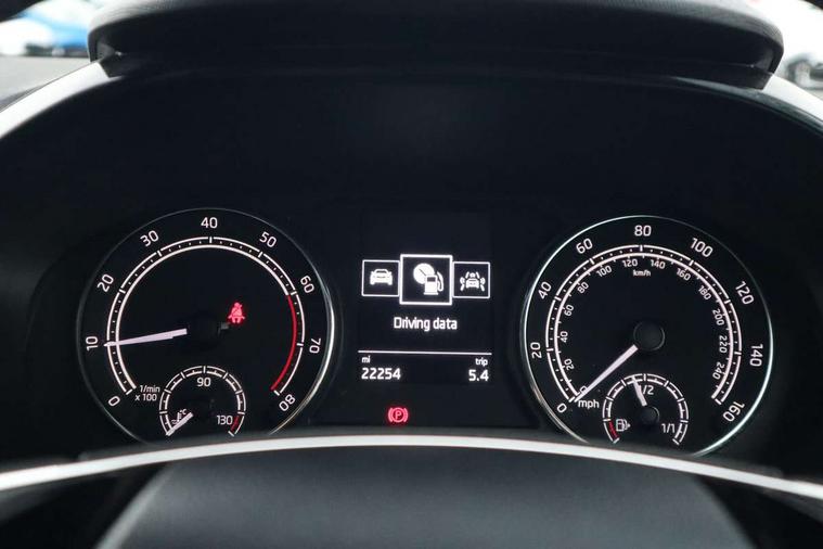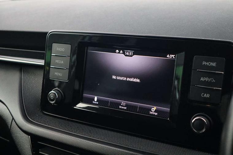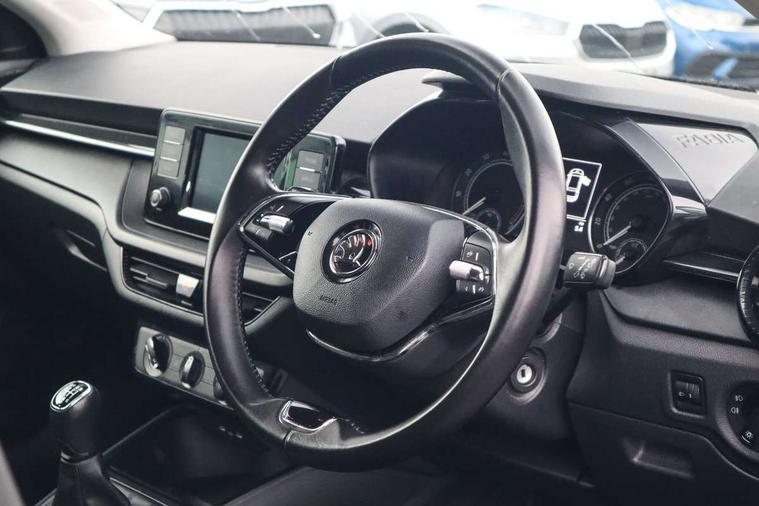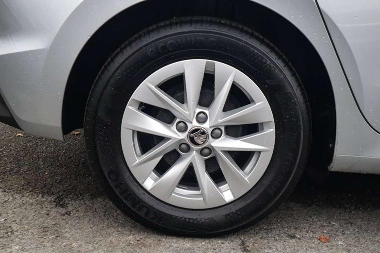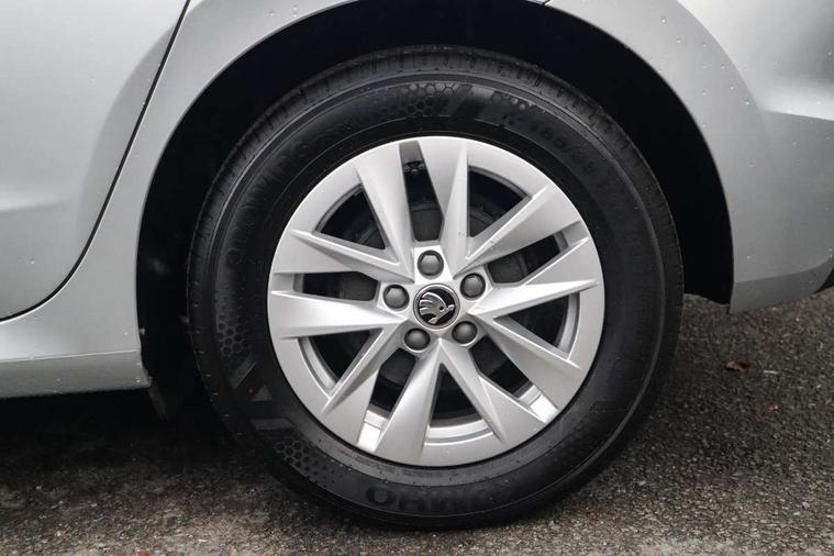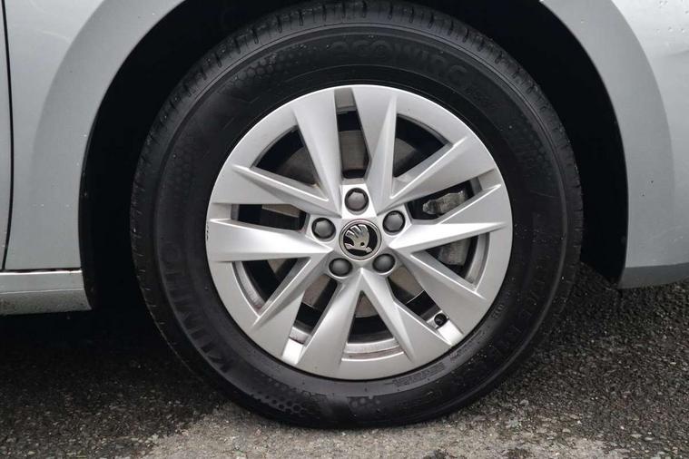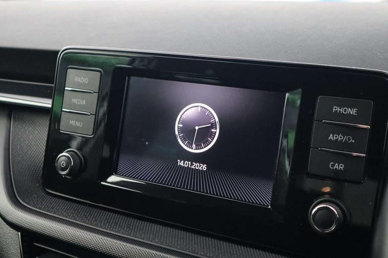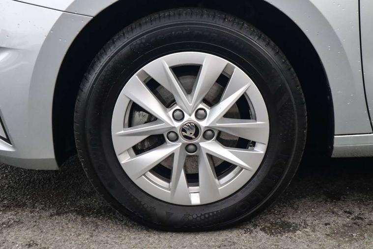 Bluetooth connection, Driver alert system - DAS, Electromechanical power steering, Exterior temperature gauge, Lane assist including road edge detection, Multifunction trip computer in black and white, Service interval indicator, Speed limiter, 2x USB-C in the front (for data transmission and charging), 4 speakers in front, Auxiliary socket for external MP3 player, DAB digital radio reception, Radio Swing with 6.5" colour display, Basic LED Headlights, Body colour door mirrors, Body coloured bumpers, Dimming rear view mirror with black frame, Door mirror integrated indicators, Electrically adjustable and heated door mirrors, Electrically adjustable front windows with function auto up/down, Front fog lights, Front window wiper intermittent control, Headlight range control - Automatic, Ice scraper in fuel cap, LED daytime running lights with coming and leaving home feature, Mechanical adjustable rear windows, Rain sensor, Rear LED fog light, Rear side wing doors, Rear window wiper with washing nozzles, Roof mounted spoiler, SKODA tailgate lettering in chrome, Third brake light, 2 reading lights in front and 2 reading lights in rear, 2 spoke leather multifunction steering wheel, 3 rear headrests, Backrest split and folding, Central console with fixed cup holder and storage box, Chrome handbrake release button, Fabric upholstery, Gearshift knob/handle in leather, Grain satin black interior door handles, Hand brake lever handle in leather, Height adjustable front headrests, Height adjustable front seats, Height adjustable steering wheel, ISOFIX and TopTether anchorage points to the outer rear seats, ISOFIX and TopTether on the front passenger seat, Luggage compartment lighting, Manual air conditioning, Manually adjustable lumbar support in front seats, Pollen filter, Rear seat bench unsplit, Single front passenger seat, Storm grey headlining, Sun visors with mirror and airbag label on passenger side, Ticket holder, 3-point height adjustable front seats belts with pretensioner and force limiter, Automatic warning lights in case of crash, Driver and passengers airbag with switch off function, e-Call+, ESC including ABS, MSR, ASR, EDS, HBA and XDS, Front and rear seat belt warning, FRONT ASSIST (AEB City and AEB Inter Urban), Front side airbags, Head airbags, One tone horn, Pedestrian protection, Three rear 3-points safety seat belts with pretensioner and force limiter including stop function for outer rear seat belts, Tyre pressure monitoring system, Anti-theft alarm system including immobiliser, interior monitoring, backup horn, and towing protection, Central locking with radio remote control, interior controls, SAFE function and 2 foldable keys, Black painted air vents, Glossy black decorative trim, Grain satin black central console cover, Grain satin black lower decorative trim, Satin black door and side trim panel in front, Anti-theft wheel bolts protection, Super-low rolling resistance tyres,