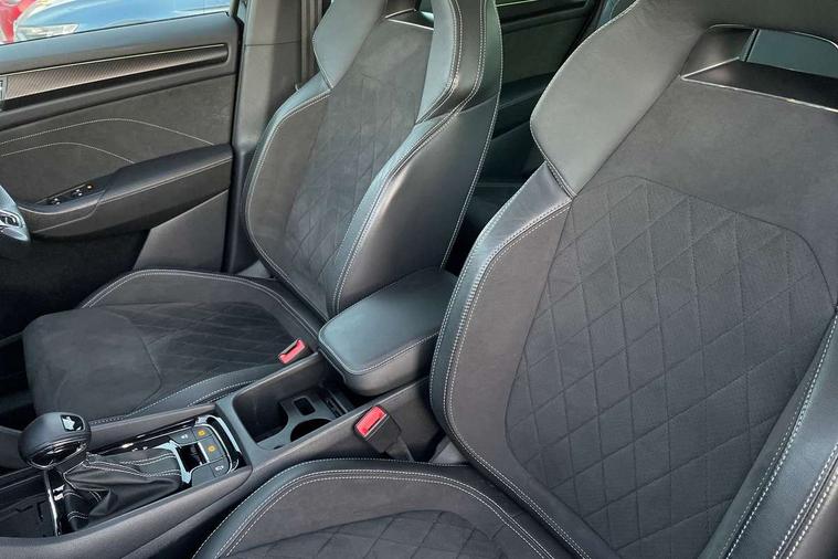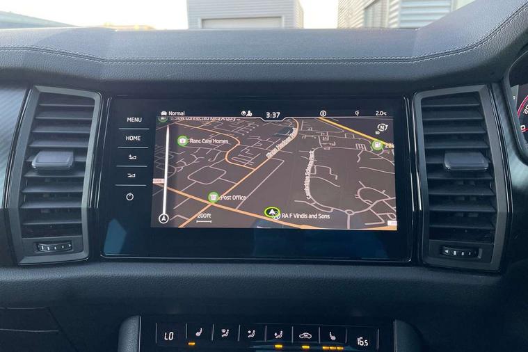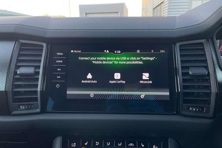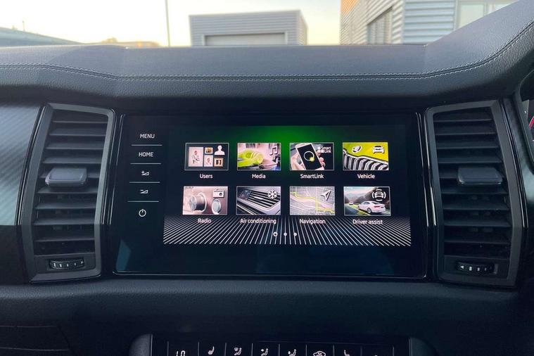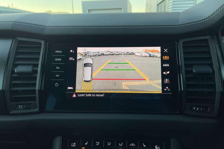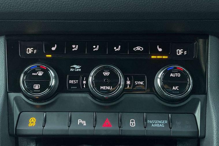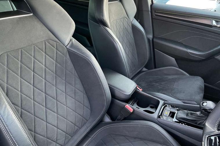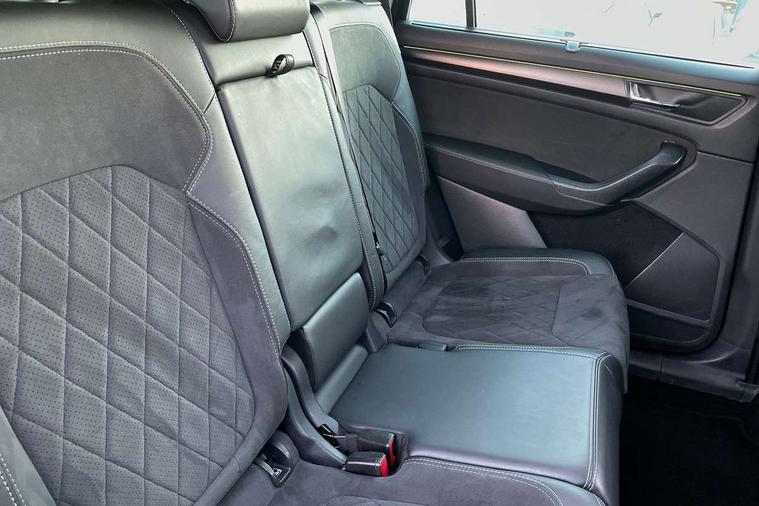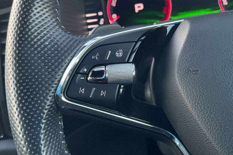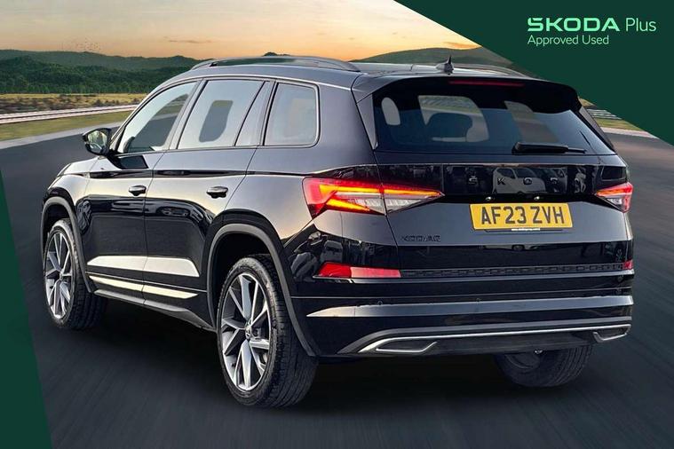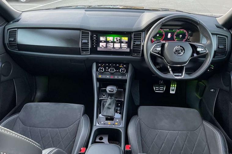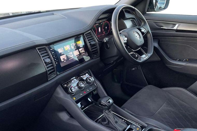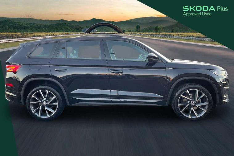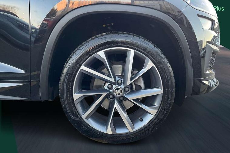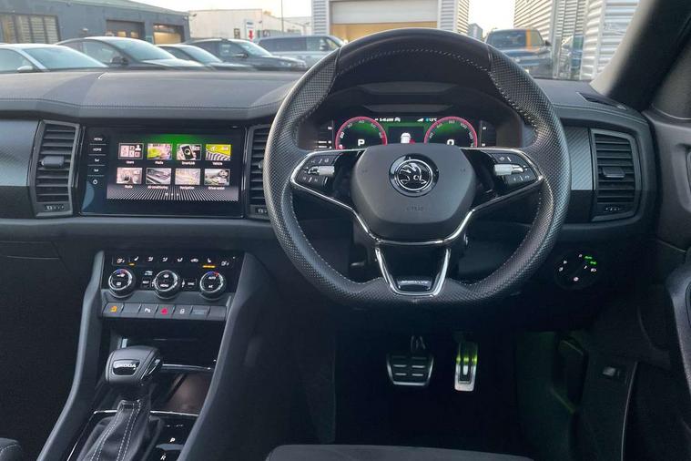 Bluetooth system, Columbus satellite navigation with 9.2" touchscreen, integrated Wi-Fi, web radio, Digital voice enhancement, e call+, ECO Stop/start function, Exterior temperature indicator, Progressive steering, Rear view camera, Smartlink wireless for apple carplay and wired for android auto, Speed limiter, Tailgate unlocking from outside, USB C Port x 2 in front centre console, Virtual Cockpit - 10.25" digital display with additional sports design, Wireless charging, 8 Speakers, DAB Digital radio, Aero front windscreen wipers with intermittent function, Aero rear window wiper, Auto dimming rear view mirror, Black roof rails, Black sports styling including front grille and window surrounds, Black wheel arch surrounds, Body colour bumpers, Body colour door handles, Electric adjustable/heated/folding door mirrors, driver side auto dimming with boarding sports and memory function, Electric front and rear windows, Extended rear spoiler with finlets in gloss black, Front fog lights, Full LED matrix headlights with AFS (adaptive front light system), cornering function and AWL (all weather lighting system), Gloss black door mirrors, Headlight washers, Heated rear window, Invisible tailpipe, LED daytime running lights, LED rear fog light, LED third brake light in rear spoiler, Light assistant (coming/leaving home/tunnel light), Off-road style lower front bumper element, Privacy glass, Rain and light sensors, Rear diffuser, Rear LED lights (high functionality) with welcome effect and dynamic indicators, Rear side wing doors, Safety reflectors on front and rear doors, Sportline badge on front fender, Sports front and rear bumpers including lower rear chrome strip, Tailgate lettering in Black, Window control switches with black trim, 12V socket in boot, 2 rails with 2 hooks, 2 seat bench in 3rd row, 3 seat bench in 2nd row, 3 spoke leather multifunction sports steering wheel with DSG paddles, 4 foldable roof handles with rear coat hooks, 60:40 foldable rear seat with sliding adjustment and backrest angle adjustment, Aluminium pedals, Black roof headlining, Bottle holders in door panel in the 1.5 litre front and 1 litre rear, Cargo storage compartments, Chrome headlight control button, Chrome interior door handles, Coat hooks on B pillar, Covered storage compartment on driver side, Decorative door sill covers, Front and rear door armrest with black adductor trim, Front centre armrest with storage compartment, cup holder and 12V socket, Front courtesy lights, Gear shift lever with chrome frame and black gloss insert, Grey stitching in front and rear armrests and door armrests + door inserts, Height adjustable front headrests, Illuminated glovebox, Illuminated luggage compartment, Isofix child seat fittings in outer rear seats with top tether, Manually adjustable steering column, Microsuede door panels, Net programme in boot (1x horizontal Net, 2x vertical Nets), Overhead glasses storage compartment, Pollen filter, Rear centre armrest with cupholders, Single front passenger seat, Sliding trunk cover, Small Bags on the inner sides of the front backrests, Sports seats, Sunvisors with illuminated vanity mirrors, Three rear height adjustable headrests, Ticket holder on A Pillar, Umbrella in door panel, Variable boot floor, LED Interior light pack - Kodiaq, Auto door release and activation of warning lights in the event of an accident, Driver and front passenger airbag with knee airbag and front passenger airbag deactivation, Electronic parking brake with hill start assist, Emergency rear braking signal, ESC (incl. ABS+MSR+ASR+EDS+HBA+DSR+RBS+MKB), Front assist with autonomous emergency braking, Front side airbags with curtain airbags, Fuel cut off safety device, Height adjustable front 3 point seatbelts + pretensioners, Hill hold control, Rear disc brakes, Safety vest holder in door, Seat belt reminder for all seats, Three point rear seat belts, Two tone horn, Tyre pressure monitor, Alarm with interior monitoring and tilt sensor with safe function, Anti-theft wheel bolts, Immobiliser, Keyless entry and start system (KESSY), Remote central locking with 2 keys, Black air vent surround, Carbon finish dashboard and door inserts, Grey stitching in dashboard, 20" Vega Anthracite alloy wheels, Temporary spare wheel (space saver),