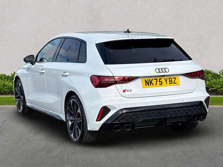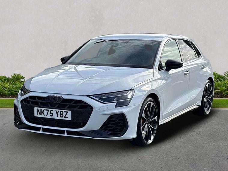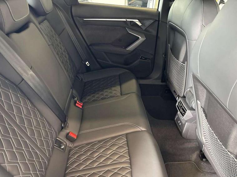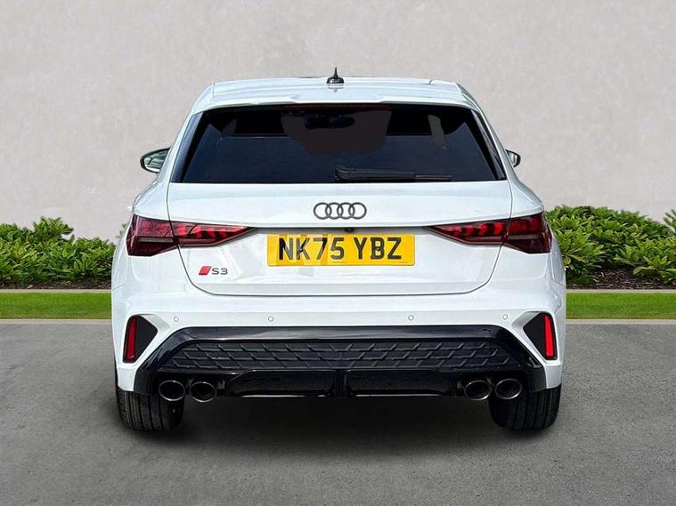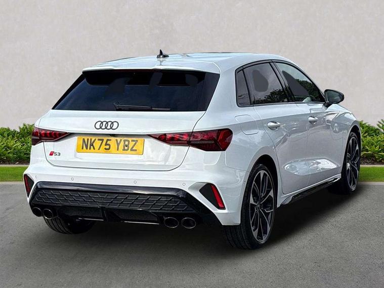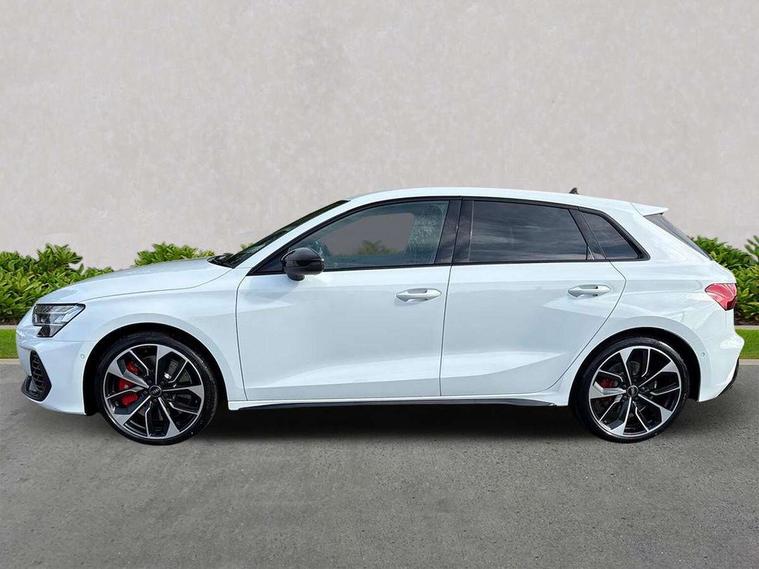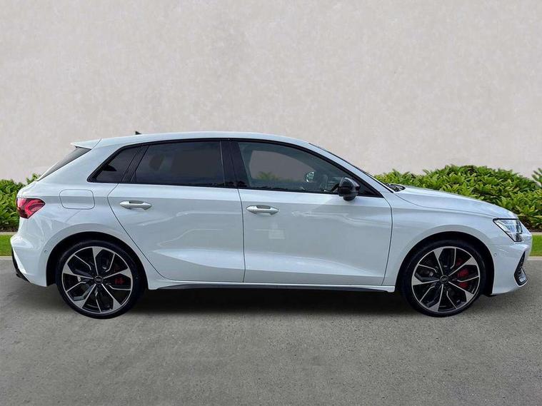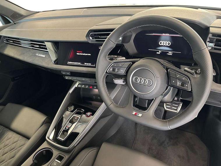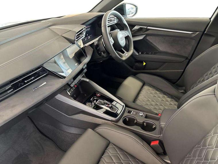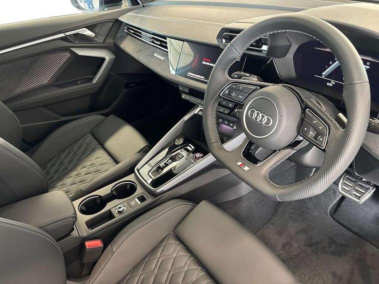 Adaptive cruise control (ACC), Adjustable speed limiter, Audi drive select (Auto, Comfort, Dynamic, Efficiency and Individual), Audi virtual cockpit plus - 12.3" full HD resolution dynamic digital instrument cluster, Automatic start/stop system with recuperation, Bluetooth interface, Camera based traffic sign recognition, Collision avoidance assistant, Driver attention and fatigue detection, e-Call (emergency call), Emergency assist, Intersection assist, Lane departure warning system, MMI Navigation Plus with high resolution 10.1" colour touch screen display, Park Assist with parking system Plus, Progressive steering, Reversing camera, Service indicator, Smartphone interface with app store includes wireless Apple carplay, Android auto and Amazon alexa integration, Trip computer, Voice control system with natural language interaction, quattro permanent all-wheel drive with torque splitter, S sport suspension with spring damper adjustment and lowering by 15mm, Audi Phonebox light with wireless charging, DAB Digital radio, USB ports with charging function in the rear, Anthracite grey Audi rings (front and rear), Audi Beam uses LEDs to project the rhombus S logo onto the ground as you exit your S3, Auto dimming frameless rear view mirror, Black accents front and rear bumpers including air inlets, Black accents in front grille and frame, Black accents in window trims, Electrically adjustable/heated/folding/auto dimming door mirrors with integrated LED indications + kerb view function for passenger side, Exterior model badging, Front and rear side air inlets in grained matt black with dark liquid chrome frame, Front electric windows, Front radiator grill in high gloss dark chrome, Heat insulating glass windscreen, Illuminated door sills with aluminium inserts at the front with S logo, LED 3rd brake light, Light and rain sensors, Privacy glass - dark tinted rear window, rear door and side windows, Rear diffuser and grill in grained matt black with inlay in dark liquid chrome, Rear electric windows, Rear side wing doors, Rear wiper, S grille, S3 front bumper with S specific air intake grilles, S3 roof spoiler, Side sill trim in dark liquid chrome, 12V socket and storage compartment in front centre console, 3 seat bench in 2nd row, 3 spoke flat bottomed leather multifunction sport steering wheel with gear shift paddles, 3-zone deluxe automatic air conditioning, 4 way electrically adjustable lumbar support for driver and front passenger, 40/20/40 split folding rear seat bench, Black cloth headlining, Black front and rear floor mats, Fine Nappa leather upholstery with front sports seats S embossed logo, Front and rear centre armrest in artificial leather with contrasting stitching on armrests and instrument panel, Front and rear headrests, Heated front seats, Height and reach adjustable steering wheel, i-Size child seat mounting on the front passenger side and outer rear seats, i-Size and top tether on the outer rear seats, Manual boot compartment lid, Manually adjustable front seats, Rear centre armrest with cupholder, S badging on the steering wheel, Seat side bolsters, Single front passenger seat, Stainless steel pedals and front footrest in black, Aluminium interior elements pack - A3, Storage package - A3, Technology pack with Matrix LED headlights - A3, 3x3 point rear seat belts, Driver and front passenger airbag with passenger airbag deactivation, Electronic Stabilisation Control (ESC) including ABS, ASR and EDL, First aid kit with warning triangle and 2 safety vests, Front side airbags with head airbags and interaction airbag, Hill hold assist, Pre-sense front with pedestrian and cyclist detection, Seatbelt monitoring, Tyre pressure loss indicator, Anti theft alarm, Anti-theft wheel bolts, Electronically operated child locks, Immobiliser, Black dashboard, Tyre repair kit,