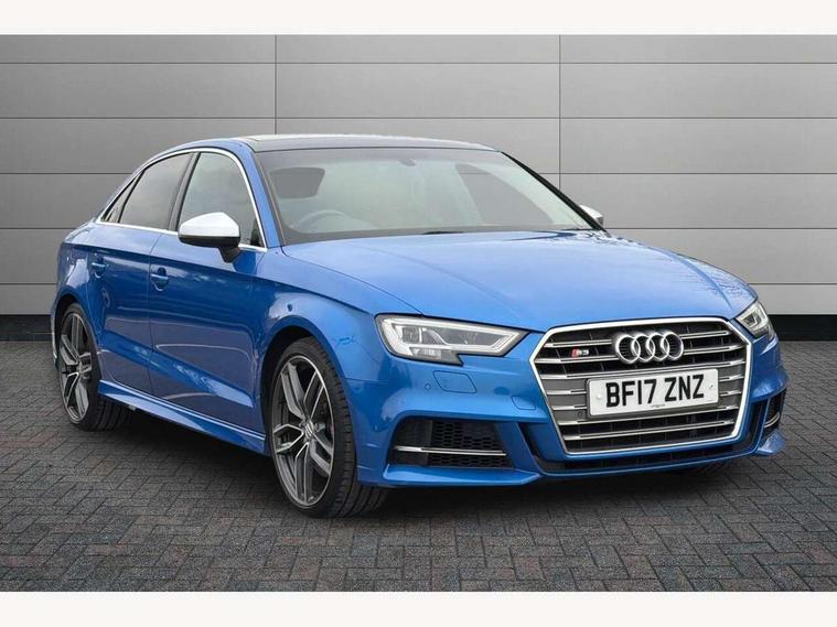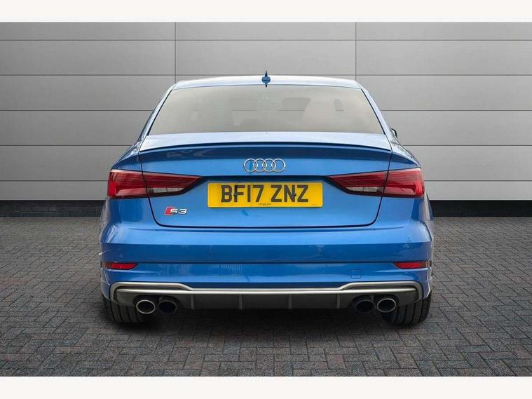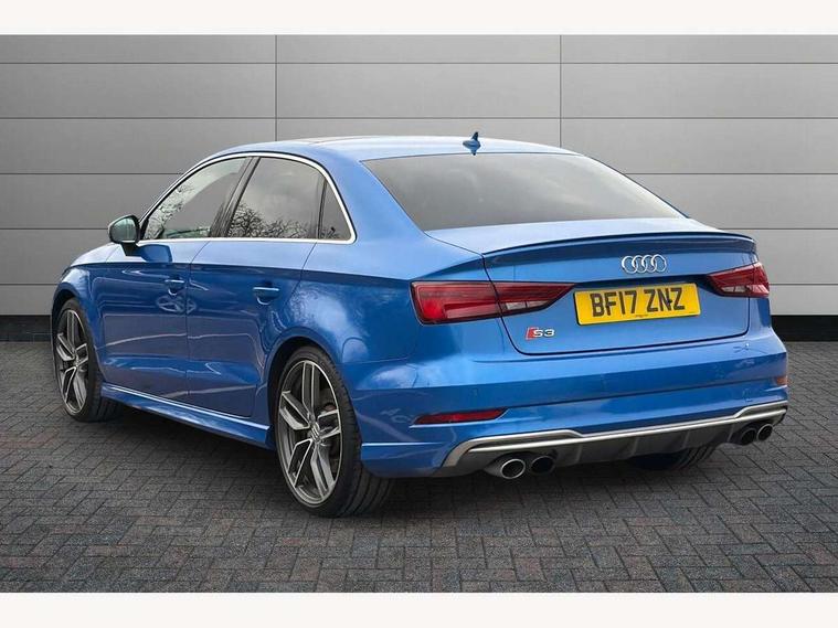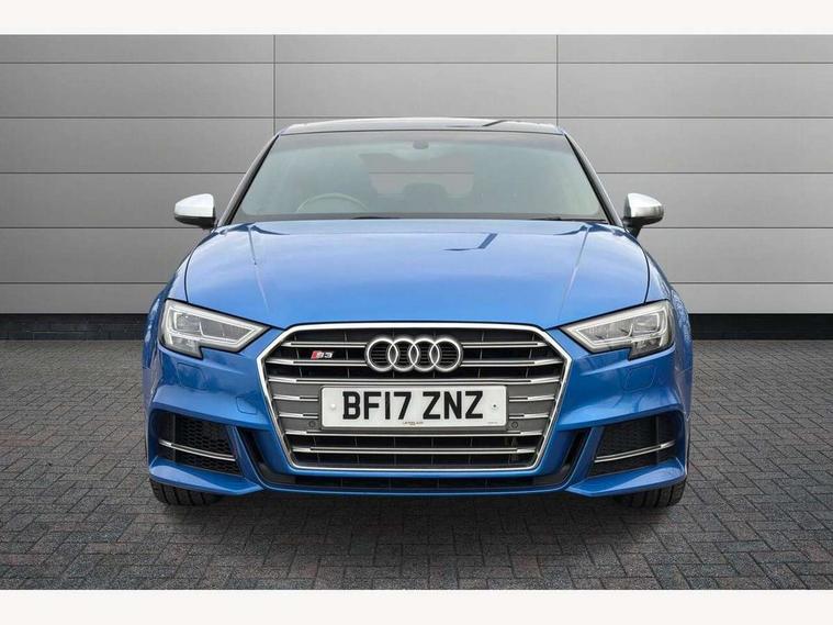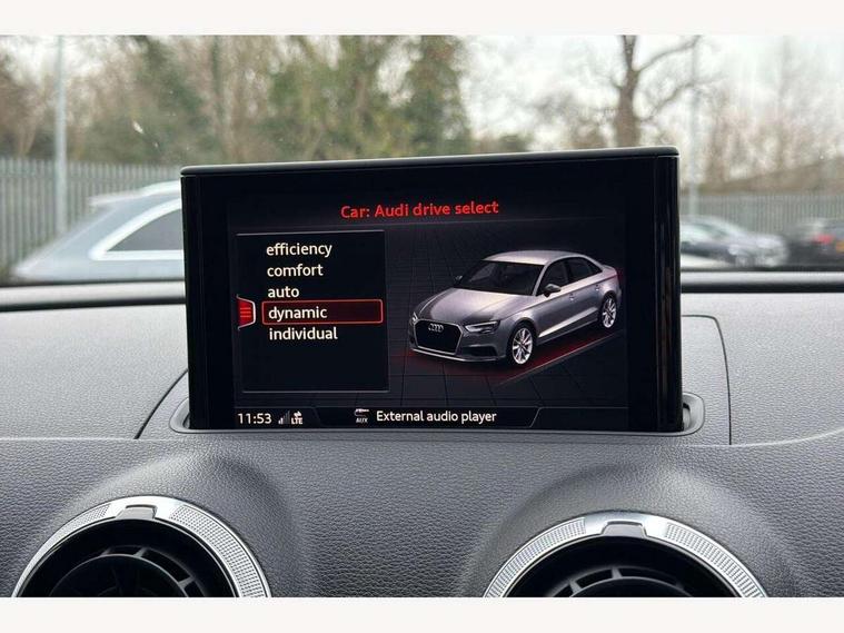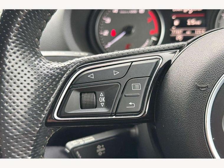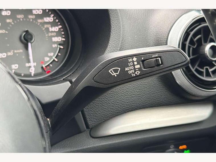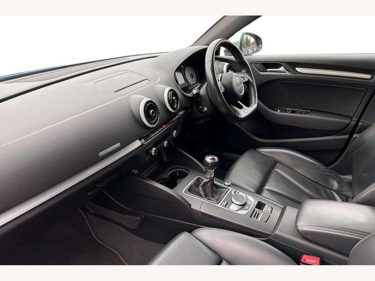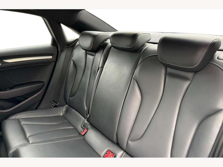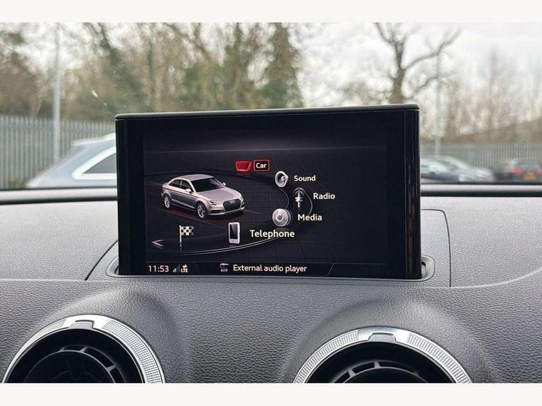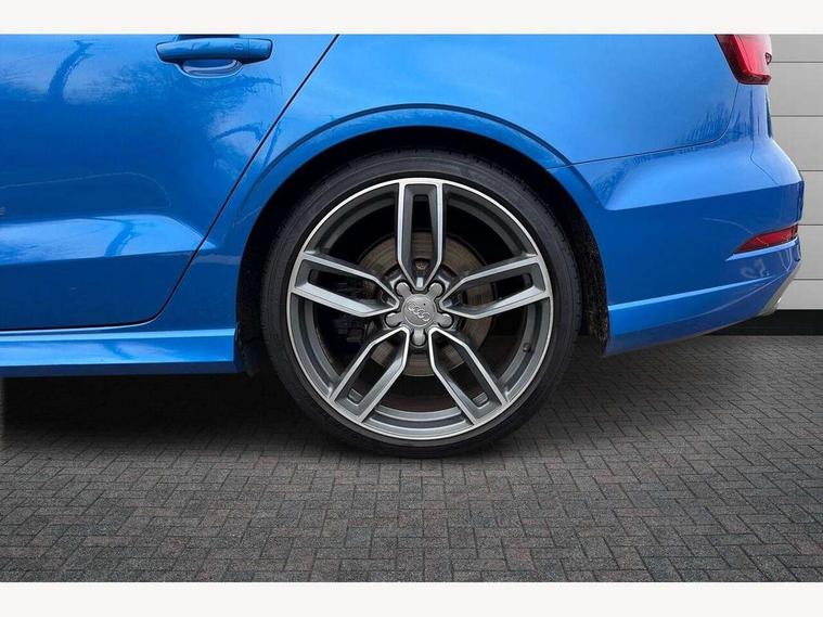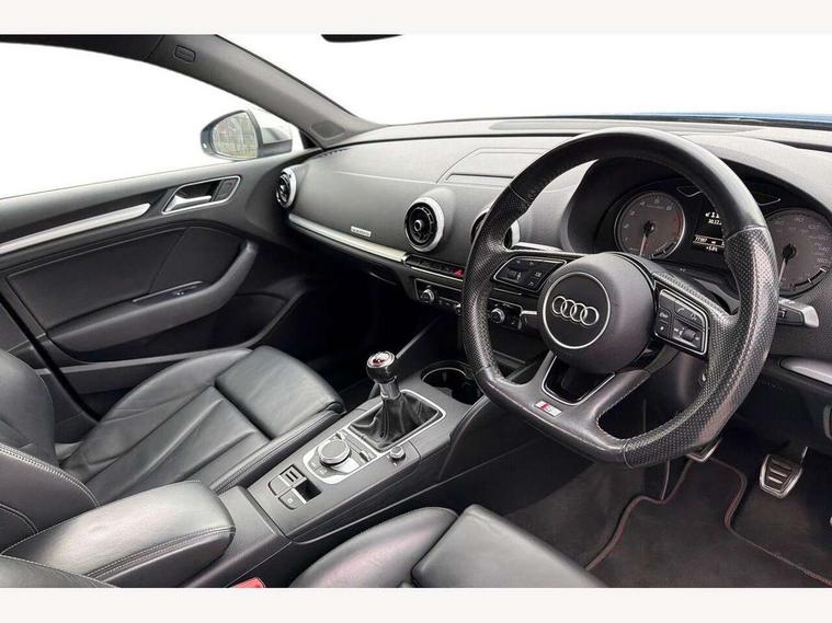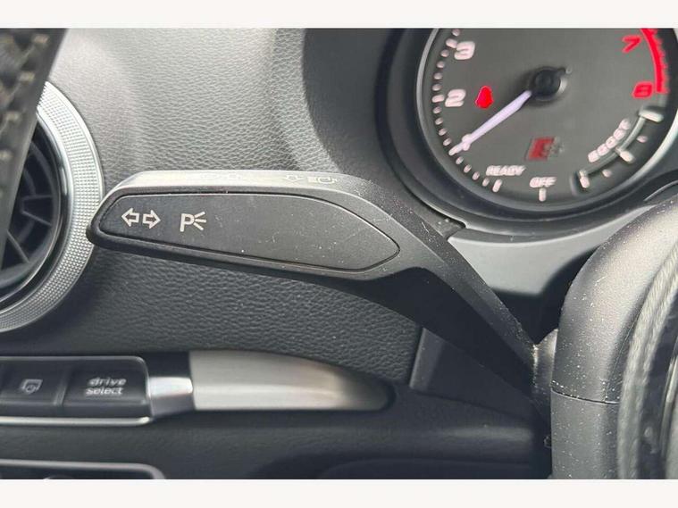 Audi connect, Audi smartphone interface, Bluetooth interface, Colour driver's information system display, Progressive power assisted steering, SD card based satellite navigation system, Service interval indicator, Voice control system, Audi magnetic ride, S sports suspension, 2 USB ports, Audi music interface, Aux-in socket, CD player, DAB Digital radio, MMI radio plus with 7" colour MMI screen and MMI controller, Aluminium door mirror housings, Aluminium side window trim, Audi Beam uses LEDs to project the Audi Sport logo, Automatic lights and wipers, Body colour bumpers, Body colour roof spoiler, Electric operated/heated door mirrors, Front and rear electric windows, Headlight washers, Heated rear window, Heated windscreen washer jets, LED daytime running lights, Platinum grey radiator grille, S body styling, Twin oval exhaust tailpipes with chrome finish, 3 adjustable rear headrests, 3 spoke flat bottomed multi-function leather steering wheel, 4 lashing points to secure luggage, Adjustable front armrest, Cloth headlining, Driver/passenger sunvisors, Dual zone electronic climate control, Front and rear interior lights with delay, Front/rear floor mats, Height/depth adjustable steering column, Illuminated door sills, Illuminated glovebox, ISOFIX child seat preparation+airbag deactivation, Jack and tool kit, Stainless steel pedals, Storage compartment in centre console, Storage compartments in doors, Storage under driver's seat, LED interior light pack - A3/RS3, Non smoking pack - A3, Storage and luggage pack - A3/RS3, 3 point seatbelts on all seats, ABS/EBD, ASR, Curtain airbags, Driver and passenger side airbags, Driver/Front Passenger airbags, Drivers knee airbag, EDL, Electromechanical parking brake, ESC - Electronic Stability Control + traction control, Front passenger airbag deactivation, Seatbelt warning, Tyre pressure warning, Warning triangle and first aid kit, Anti theft alarm, Anti-theft wheel bolts, Remote control central locking, Aluminium air vent surrounds, Aluminium trim elements,