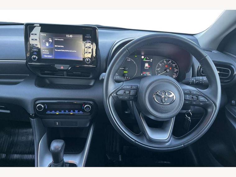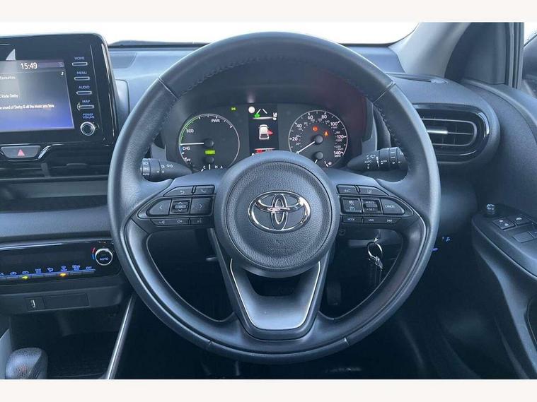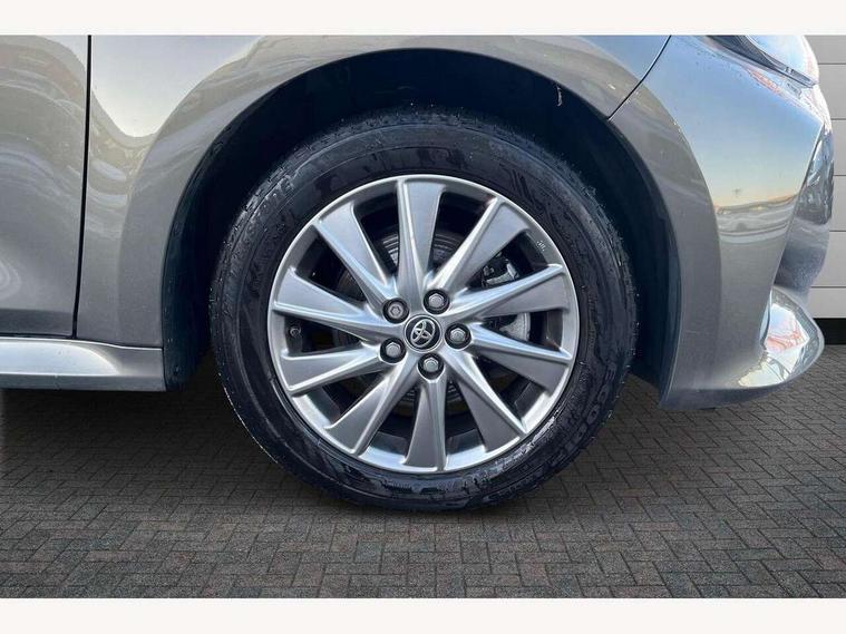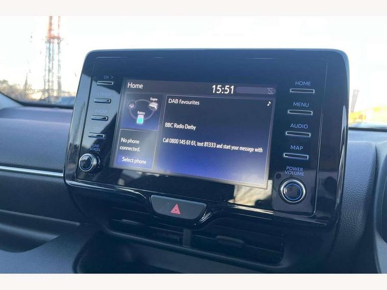 4.2" coloured TFT multi information display with analogue speedometer, Adaptive cruise control, Adjustable speed limit with speed warning, Bluetooth connectivity, E-call, Electric power steering, Hybrid energy display, Multi information display switches on steering wheel, Reversing camera, Smartphone integration with Apple CarPlay and Android auto, Tailgate, Voice recognition, Vehicle Stability Control (VSC), 4 speakers, 7" Multimedia display touch screen, Toyota Touch 2 with DAB, USB connection, Acoustic windscreen glass, Auto windscreen wipers, Automatic headlights, Body coloured door mirrors, Bulb indicators, Chequered front grille, Daytime running lights, Electric adjustable heated door mirrors, Follow me home headlights, Front auto power windows with anti jam protection, Halogen projector headlights, LED High mounted stop lamp, Manual headlight levelling, Rain sensor, Rear side wing doors, Rear spoiler, Rear wiper, Shark fin antenna, Turning signal integrated indicators in door mirrors, Variable front intermittent wipers, 3 adjustable rear headrests, 3 seat bench in 2nd row, 3 spoke leather steering wheel, 60/40 split folding rear seat, Active headrests, Adjustable boot height, Auto air conditioning, Coat hooks in rear grab handles, Cup holders (2 front & door), Data Communication Module (DCM) connected services, Fabric upholstery, Front armrest, Glovebox, Grey roof lining, Height adjustable driver's seat, Isofix seat fixing, Leather gearshift, Pollen filter, Shopping bag hooks, Single front passenger seat, Tilt/telescopic steering column, 3 point seatbelts on all rear seats, ABS+EBD+Brake assist, Electronic parking brake, Emergency brake light system (EBS), Front passenger airbag on/off switch, Front seatbelt reminder, Hill start assist control (HAC), Rear child proof door locks, Rear seat belt reminder, Supplemental Restraint System (SRS) 8 airbags: Driver & passenger's airbags, dual side curtain airbags, side impact airbags, front centre airbag, Toyota Safety Sense 2, Precollison + Night time Pedestrian & Cyclist Detection, Lane Trace Assist, Auto High Beam, Intelligent ACC & Road Sign Assist, Tyre pressure warning system, 2x Master key, Alarm/immobiliser, Remote powered central double locking doors, Soft touch instrument panel, Space saver spare wheel,